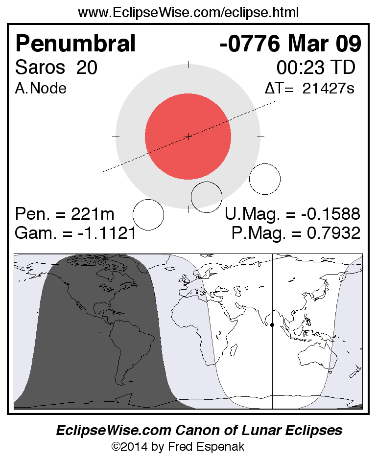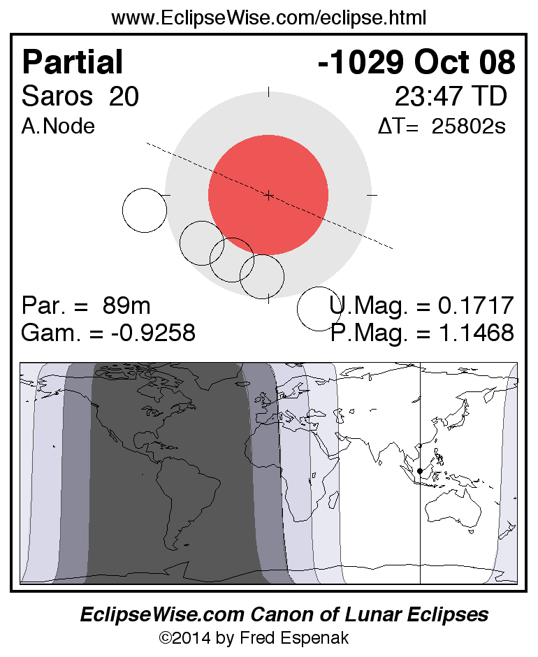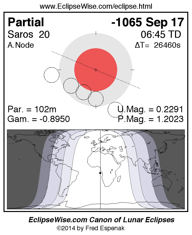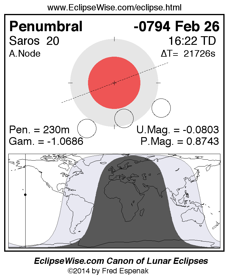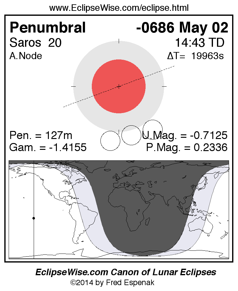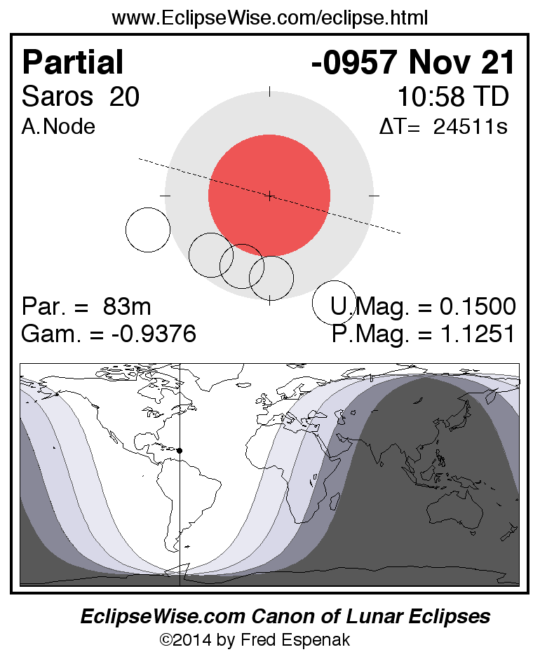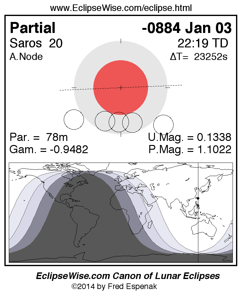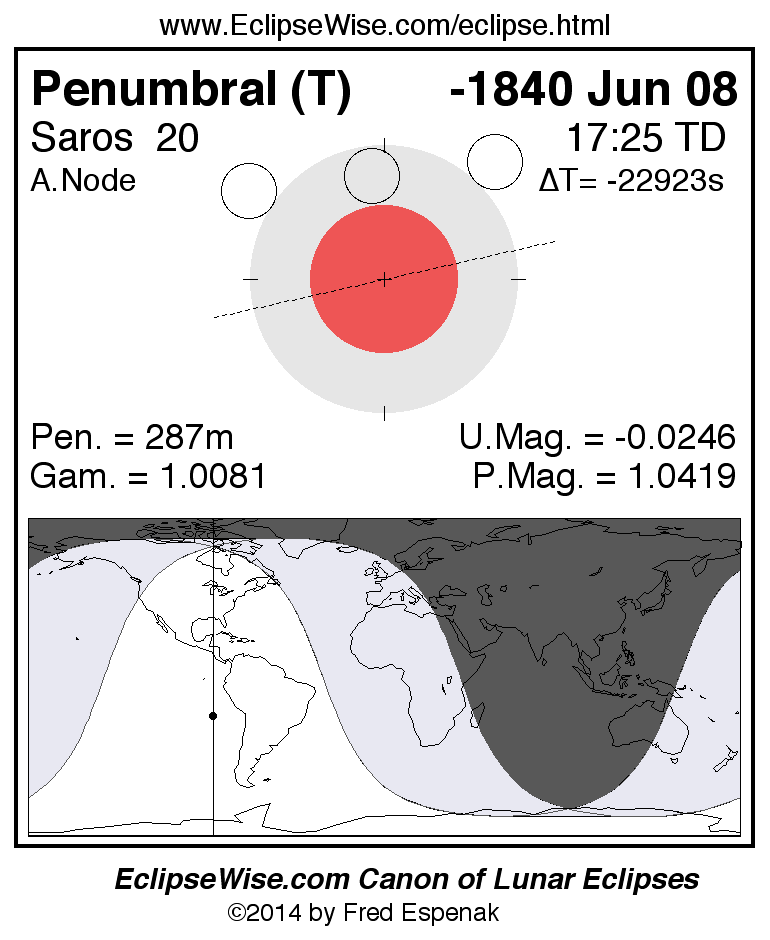 A panorama of all lunar eclipses belonging to Saros 20 is presented here. Each figure shows the Moon's path with respect to Earth's penumbral and umbral shadows. Below the path is a map depicting the geographic region of visibility for the eclipse. The date and time are given for the instant of Greatest Eclipse. Every figure serves as a hyperlink to the EclipseWise Prime page for that eclipse with a larger figure and complete details for the eclipse. Visit the Key to Lunar Eclipse Figures for a detailed explanation of these diagrams. Near the bottom of this page are a series of hyperlinks for more on lunar eclipses.