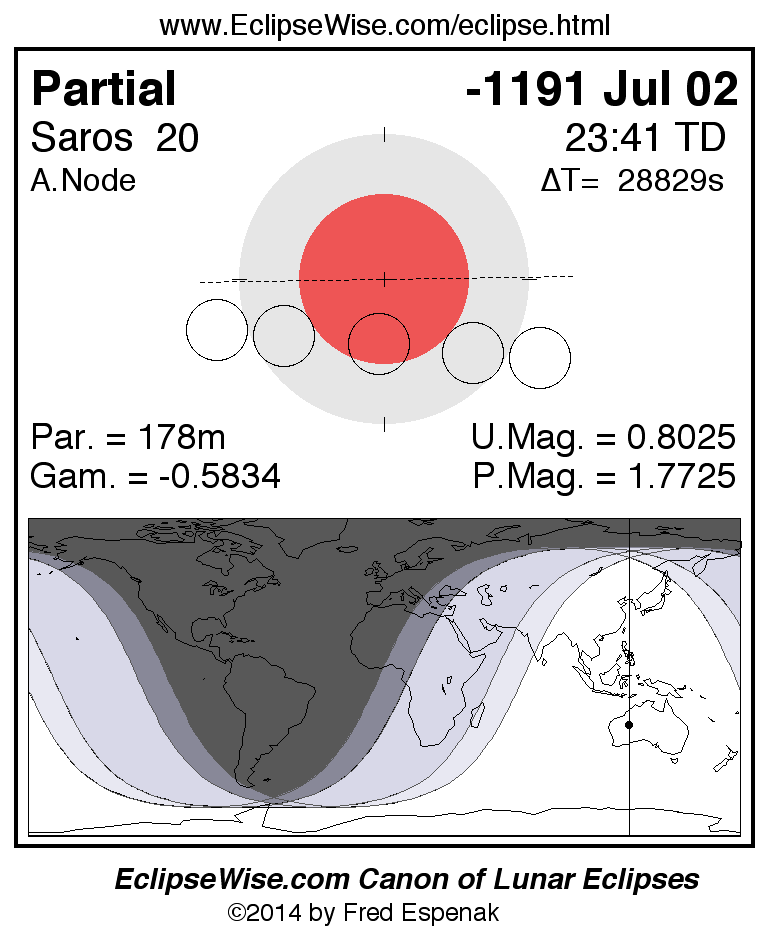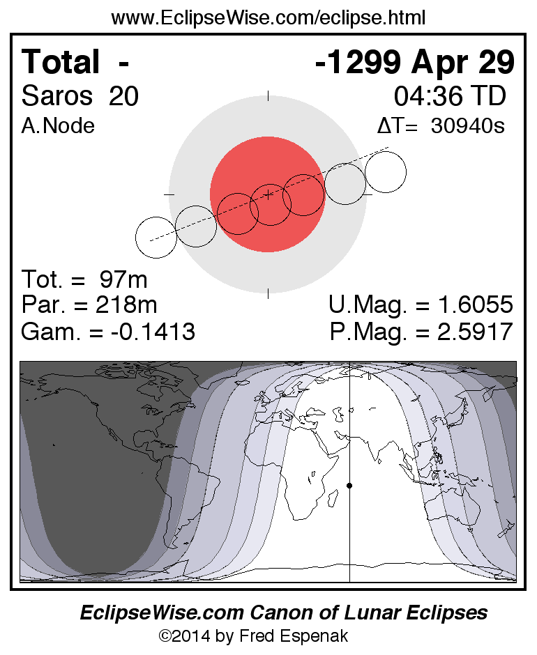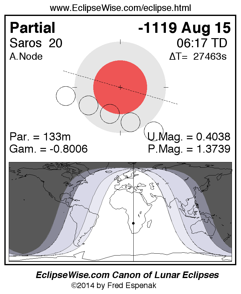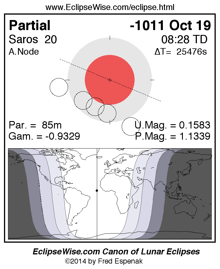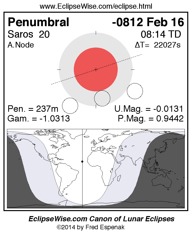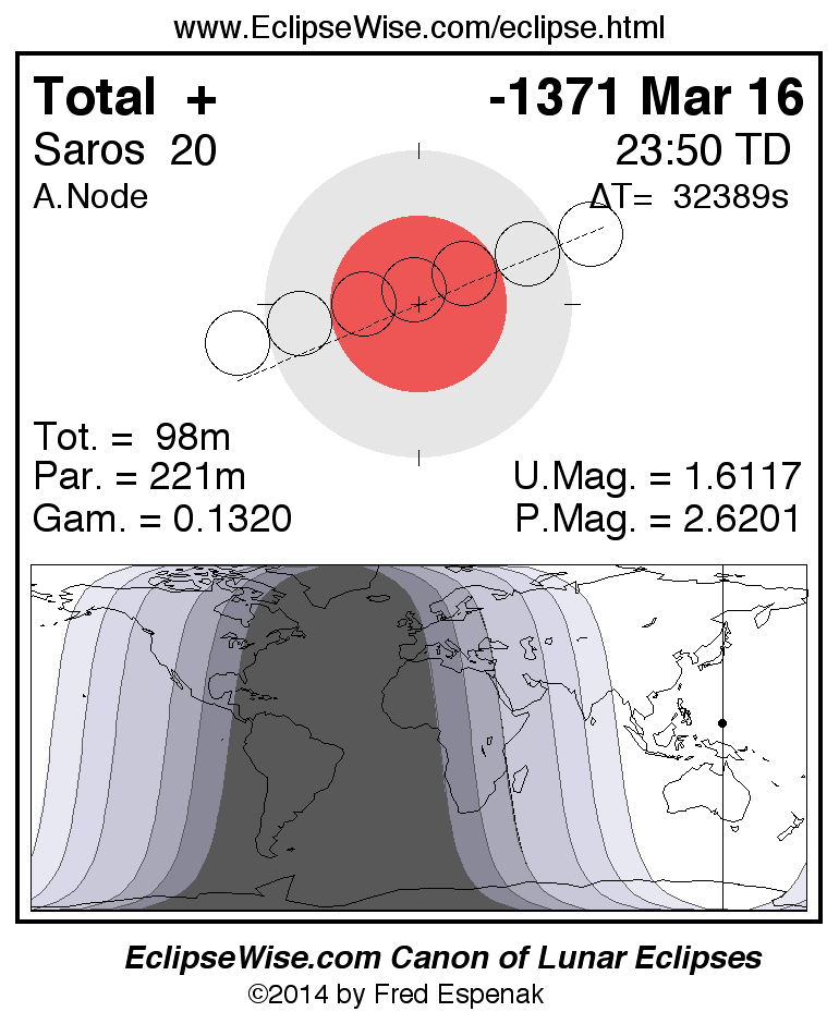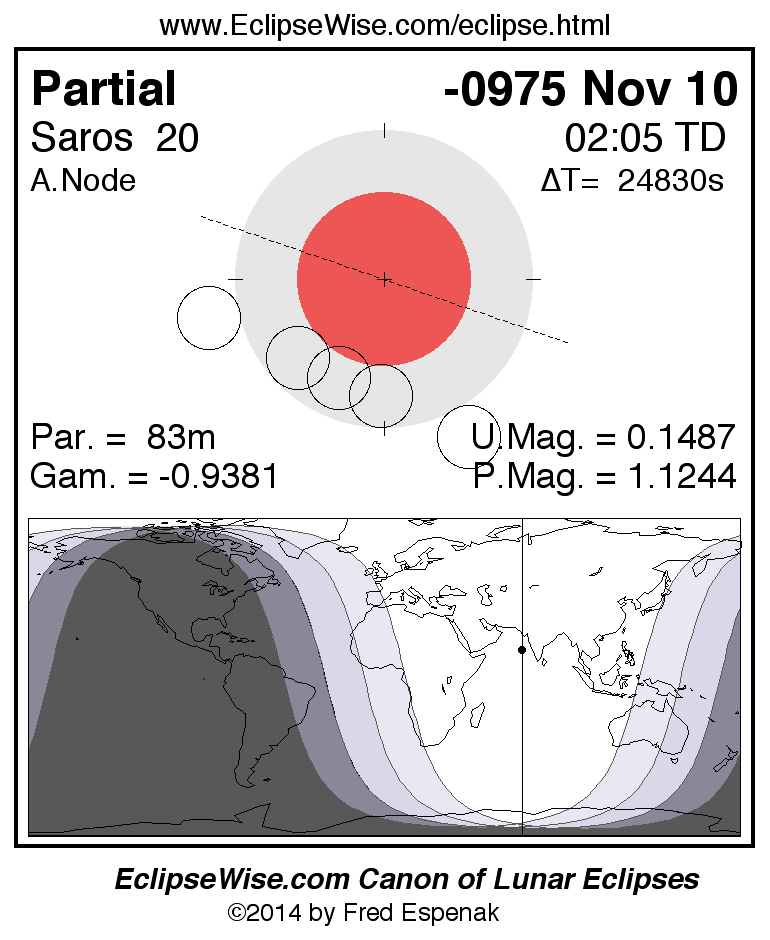 A panorama of all lunar eclipses belonging to Saros 20 is presented here. Each figure shows the Moon's path with respect to Earth's penumbral and umbral shadows. Below the path is a map depicting the geographic region of visibility for the eclipse. The date and time are given for the instant of Greatest Eclipse. Every figure serves as a hyperlink to the EclipseWise Prime page for that eclipse with a larger figure and complete details for the eclipse. Visit the Key to Lunar Eclipse Figures for a detailed explanation of these diagrams. Near the bottom of this page are a series of hyperlinks for more on lunar eclipses.