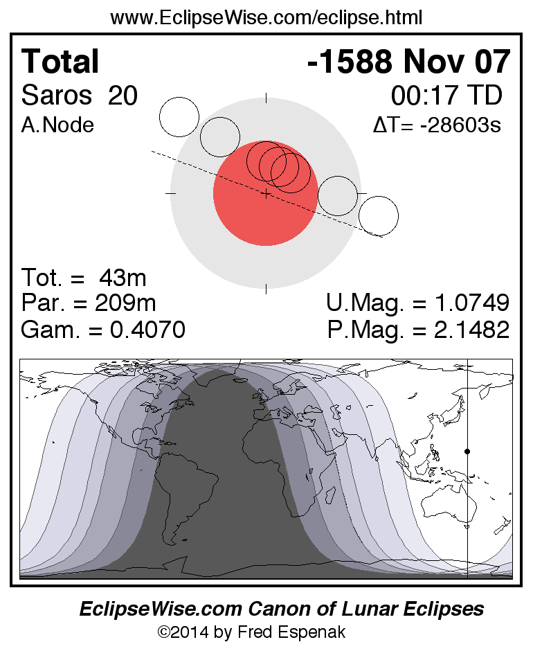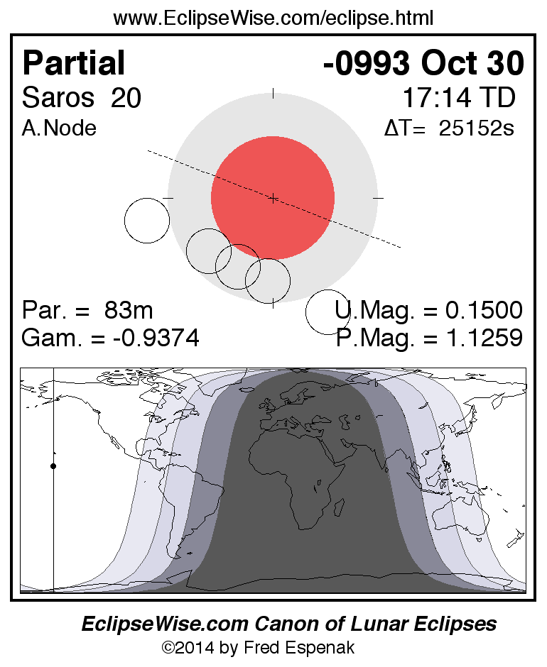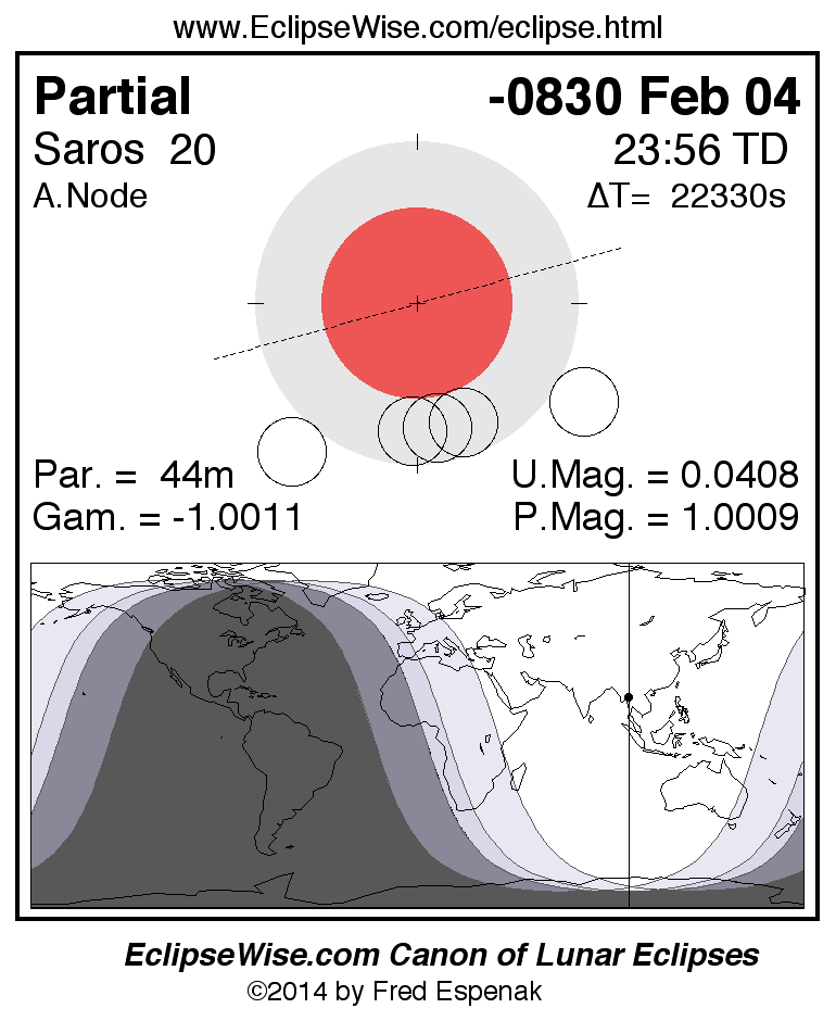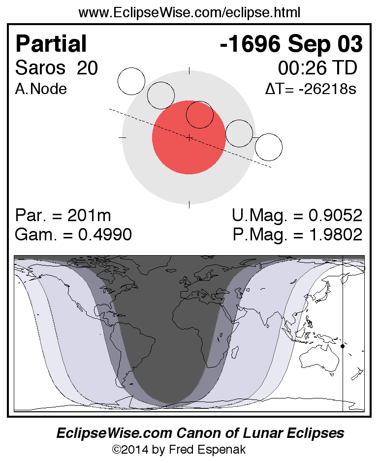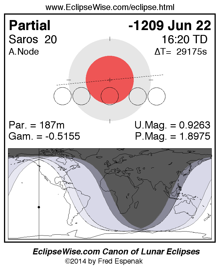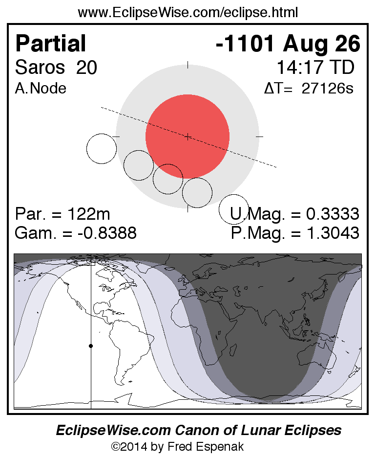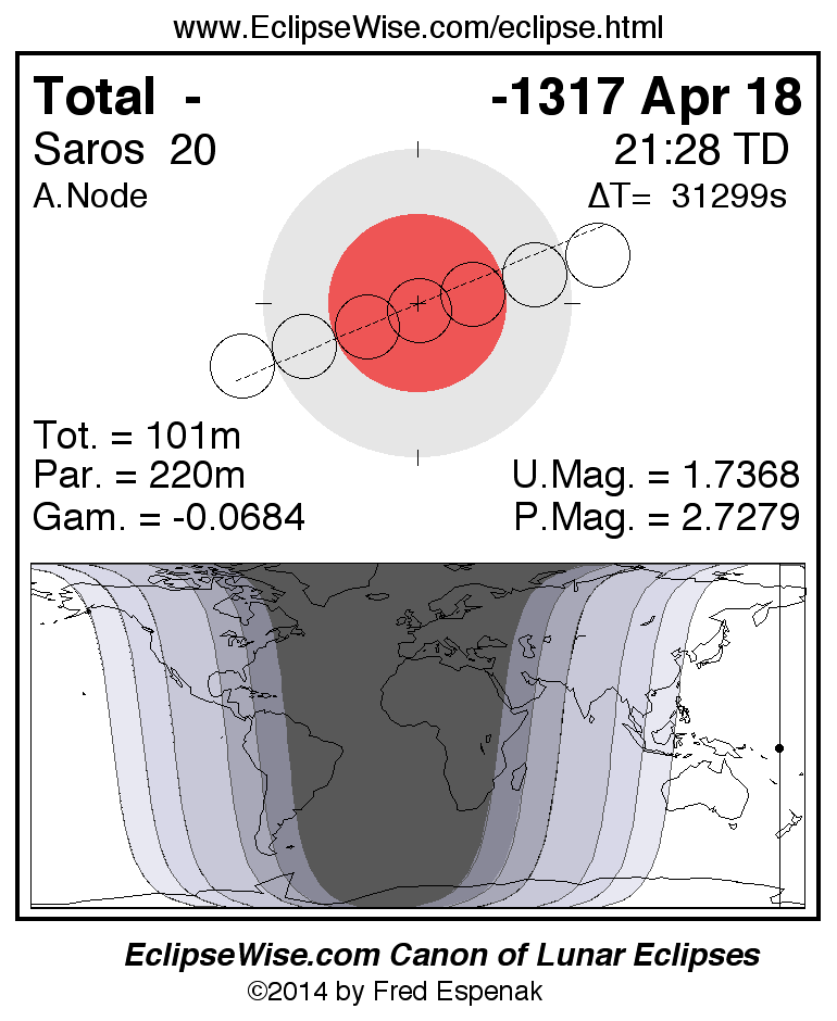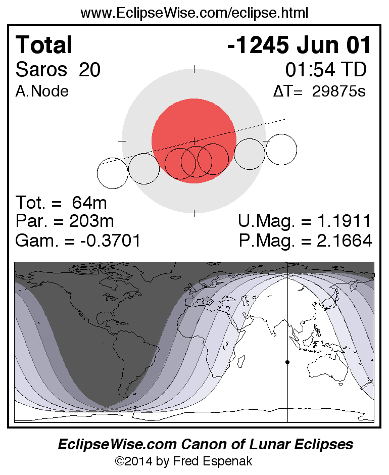 A panorama of all lunar eclipses belonging to Saros 20 is presented here. Each figure shows the Moon's path with respect to Earth's penumbral and umbral shadows. Below the path is a map depicting the geographic region of visibility for the eclipse. The date and time are given for the instant of Greatest Eclipse. Every figure serves as a hyperlink to the EclipseWise Prime page for that eclipse with a larger figure and complete details for the eclipse. Visit the Key to Lunar Eclipse Figures for a detailed explanation of these diagrams. Near the bottom of this page are a series of hyperlinks for more on lunar eclipses.