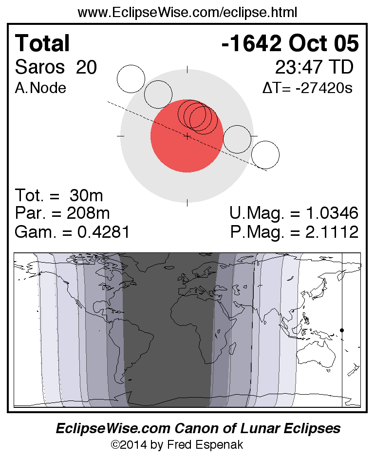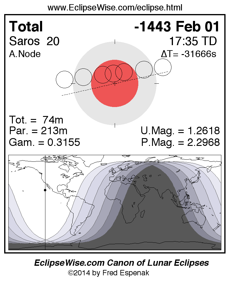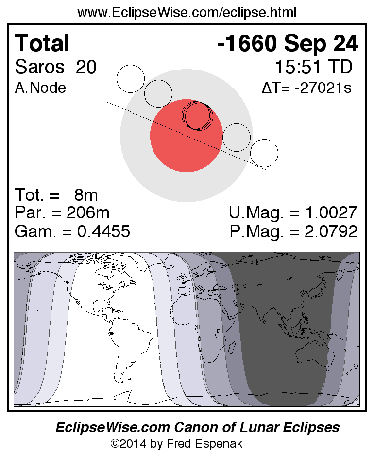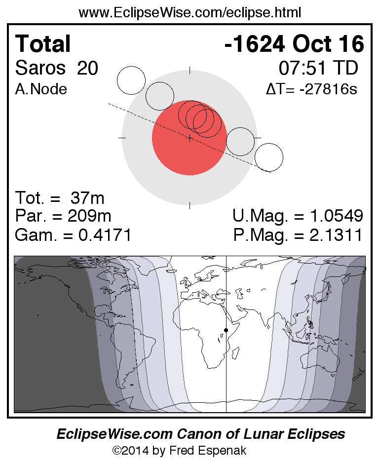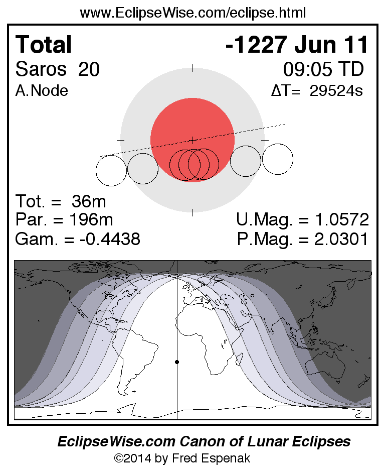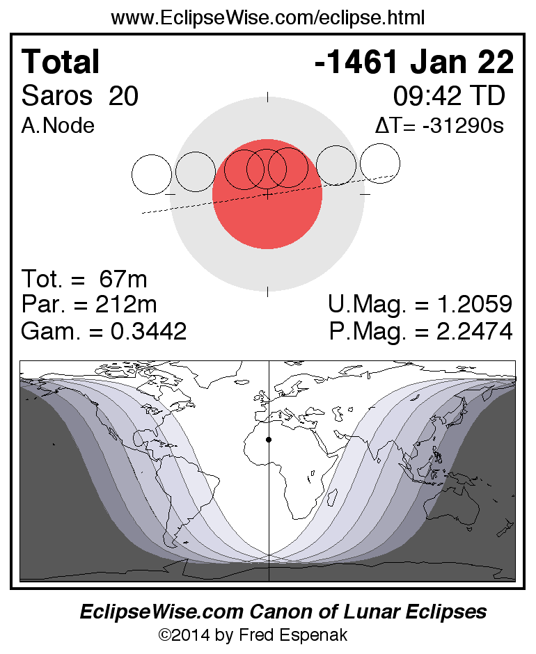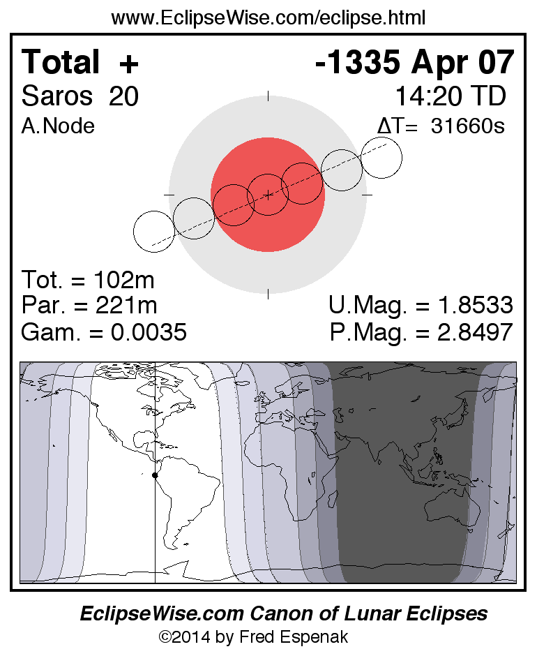 A panorama of all lunar eclipses belonging to Saros 20 is presented here. Each figure shows the Moon's path with respect to Earth's penumbral and umbral shadows. Below the path is a map depicting the geographic region of visibility for the eclipse. The date and time are given for the instant of Greatest Eclipse. Every figure serves as a hyperlink to the EclipseWise Prime page for that eclipse with a larger figure and complete details for the eclipse. Visit the Key to Lunar Eclipse Figures for a detailed explanation of these diagrams. Near the bottom of this page are a series of hyperlinks for more on lunar eclipses.