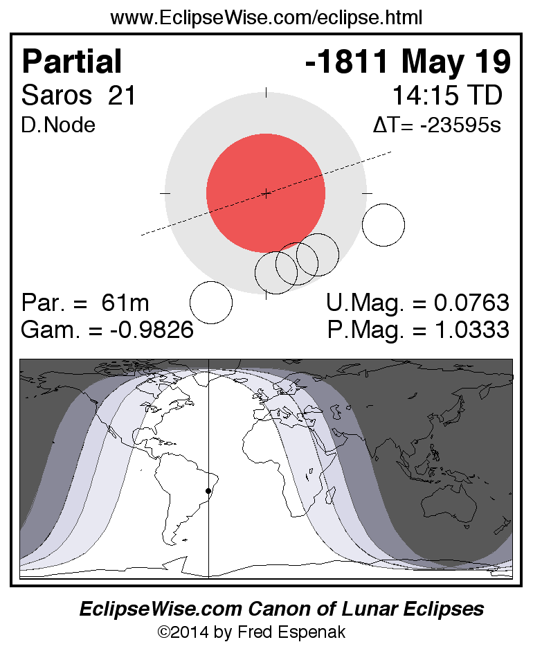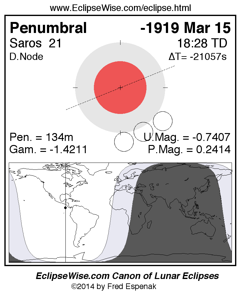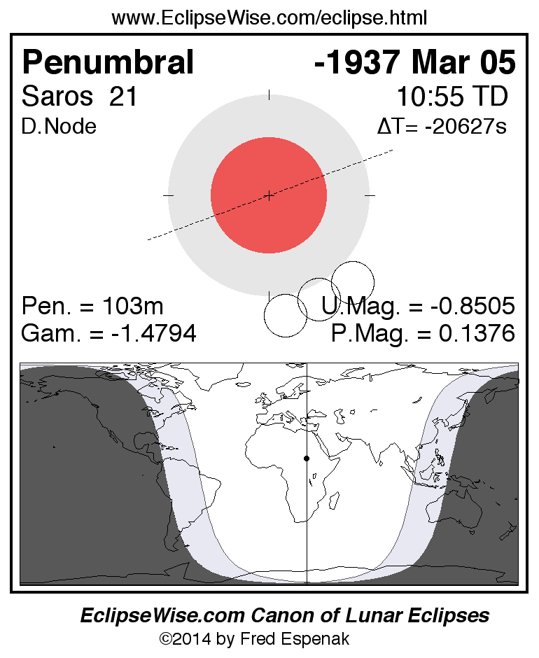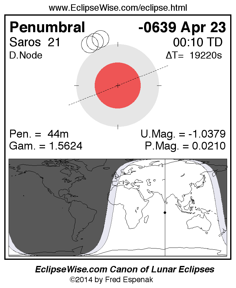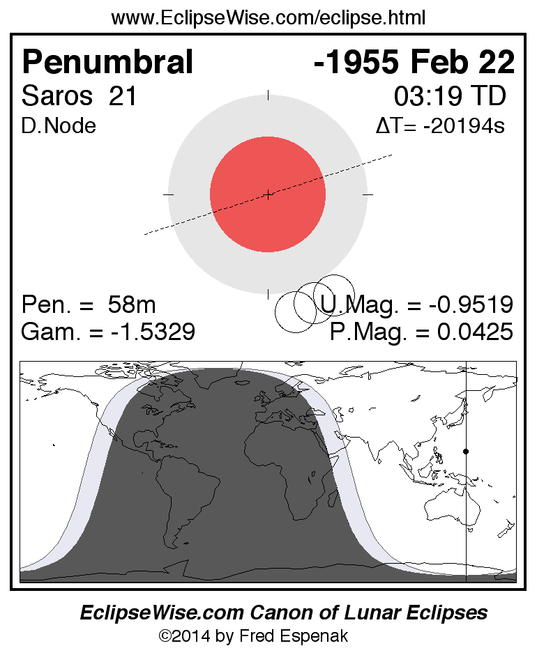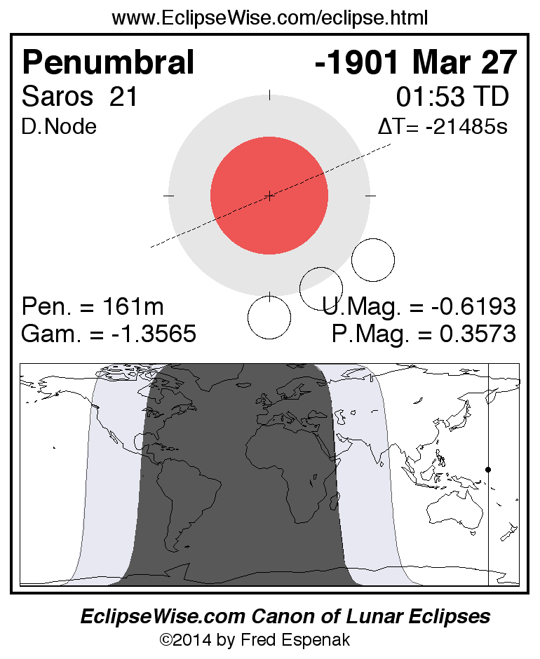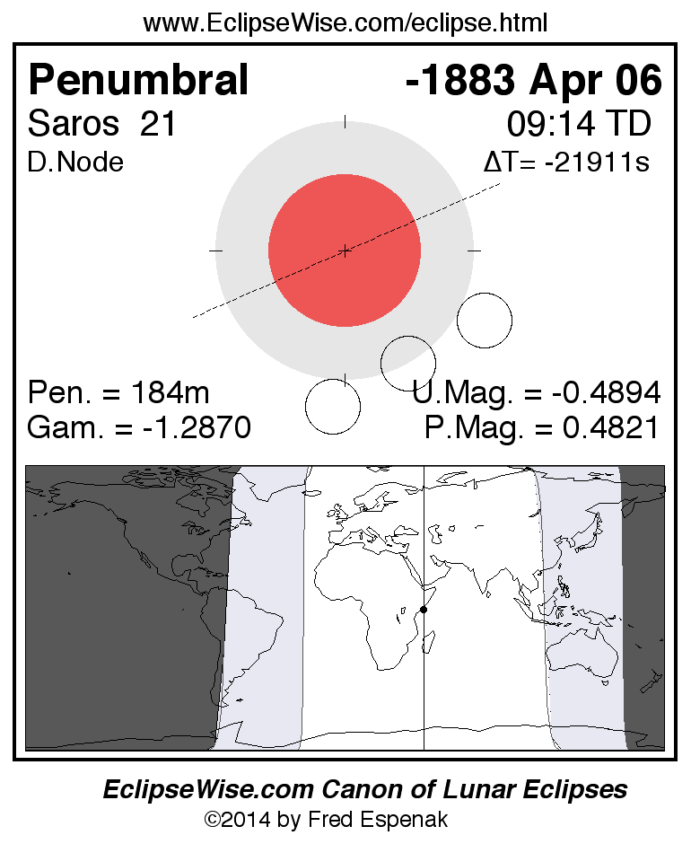 A panorama of all lunar eclipses belonging to Saros 21 is presented here. Each figure shows the Moon's path with respect to Earth's penumbral and umbral shadows. Below the path is a map depicting the geographic region of visibility for the eclipse. The date and time are given for the instant of Greatest Eclipse. Every figure serves as a hyperlink to the EclipseWise Prime page for that eclipse with a larger figure and complete details for the eclipse. Visit the Key to Lunar Eclipse Figures for a detailed explanation of these diagrams. Near the bottom of this page are a series of hyperlinks for more on lunar eclipses.