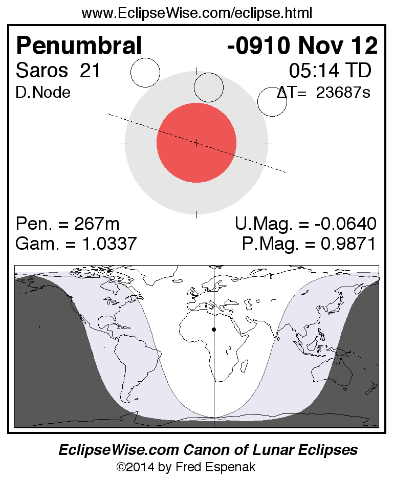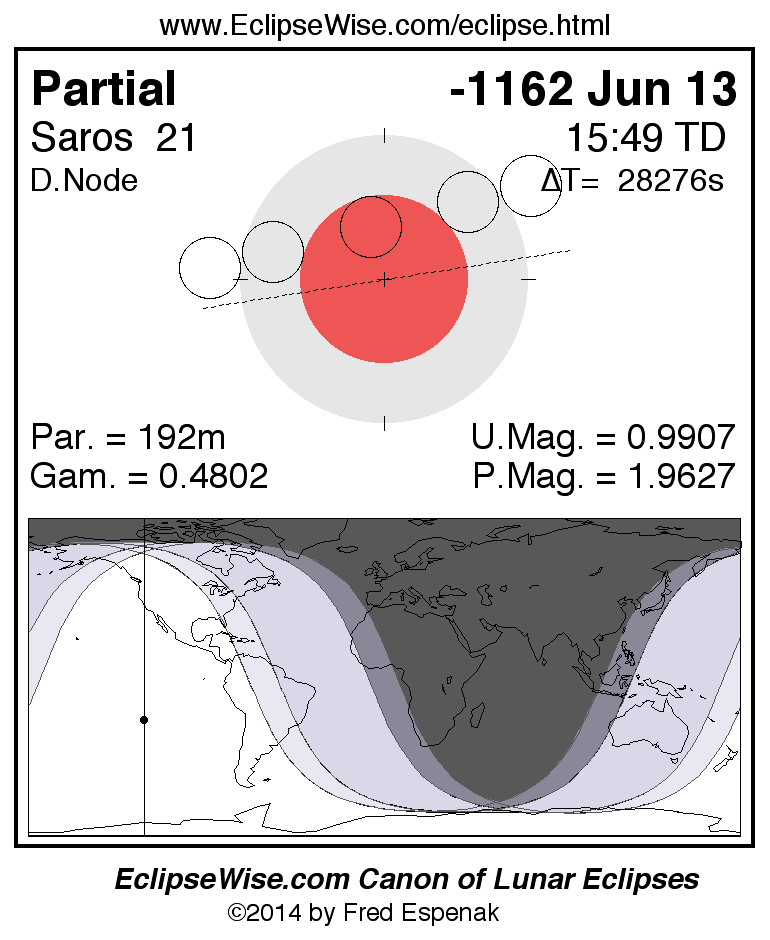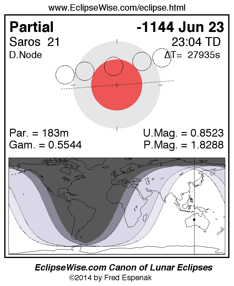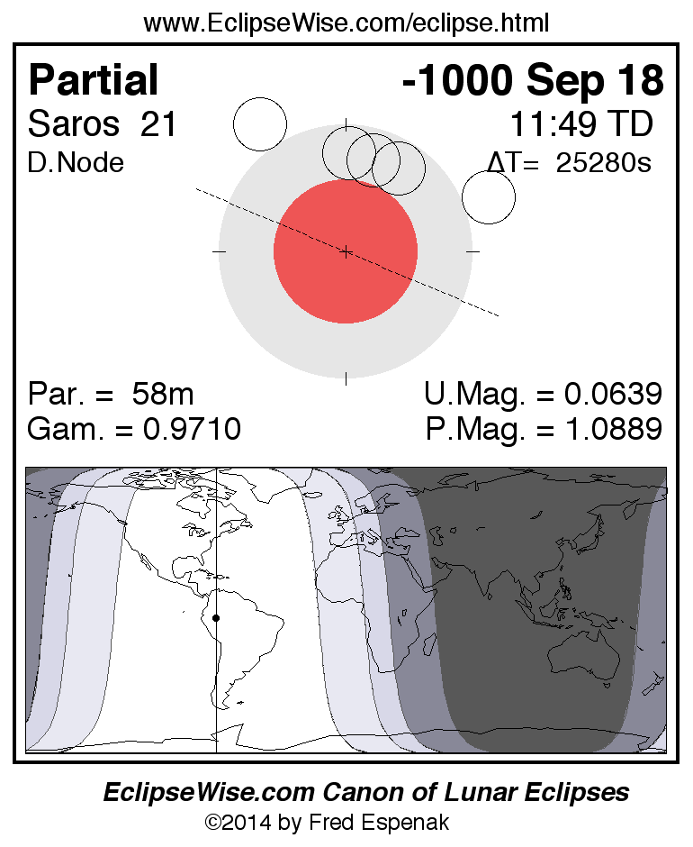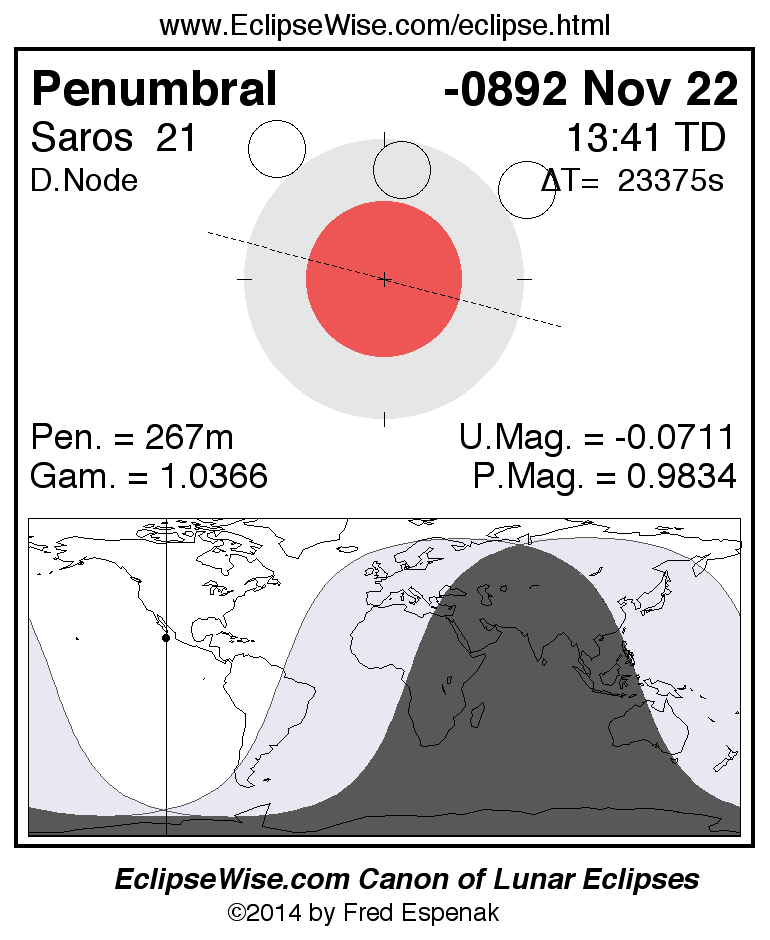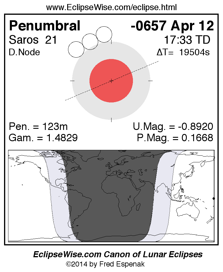 A panorama of all lunar eclipses belonging to Saros 21 is presented here. Each figure shows the Moon's path with respect to Earth's penumbral and umbral shadows. Below the path is a map depicting the geographic region of visibility for the eclipse. The date and time are given for the instant of Greatest Eclipse. Every figure serves as a hyperlink to the EclipseWise Prime page for that eclipse with a larger figure and complete details for the eclipse. Visit the Key to Lunar Eclipse Figures for a detailed explanation of these diagrams. Near the bottom of this page are a series of hyperlinks for more on lunar eclipses.