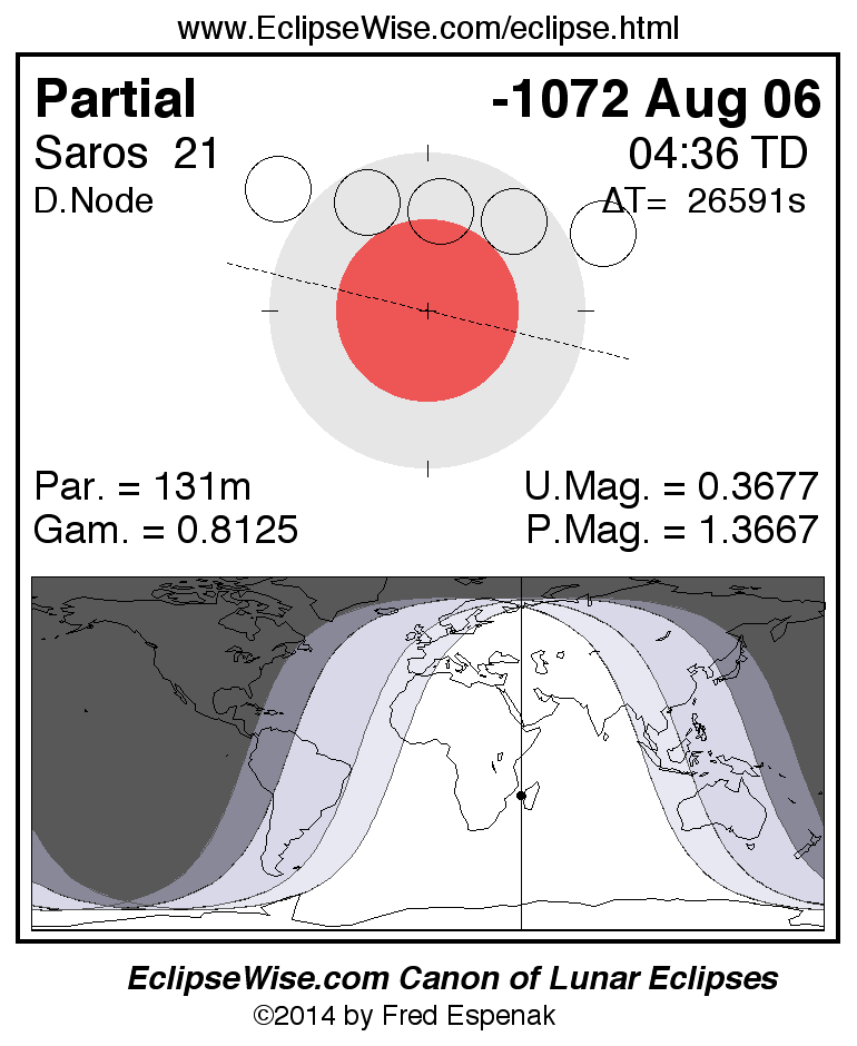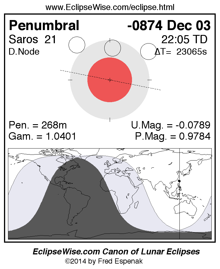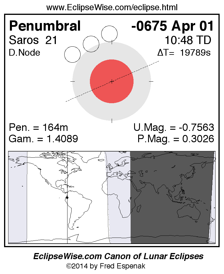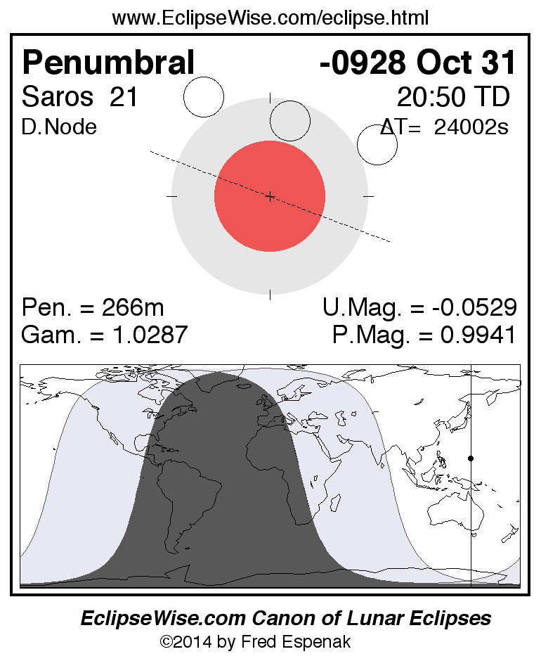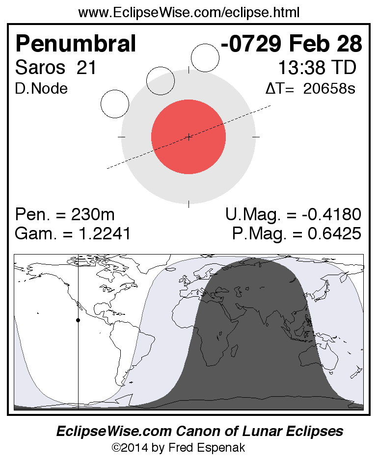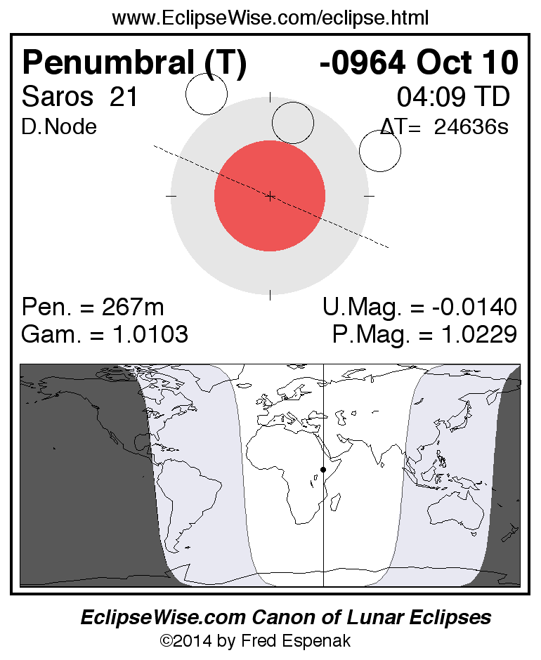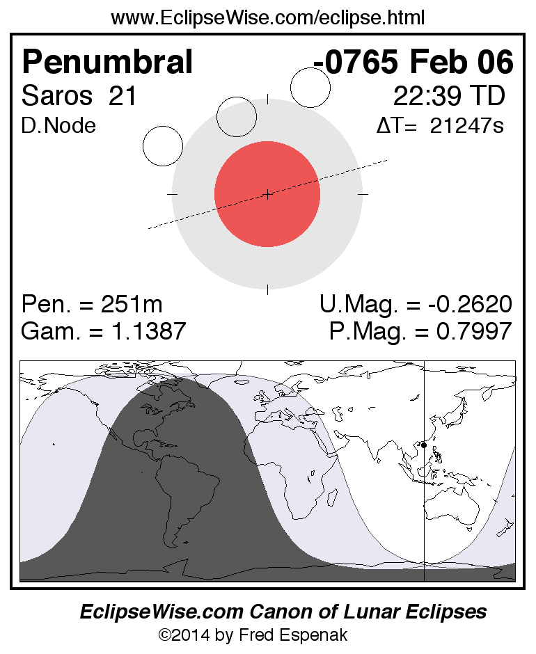 A panorama of all lunar eclipses belonging to Saros 21 is presented here. Each figure shows the Moon's path with respect to Earth's penumbral and umbral shadows. Below the path is a map depicting the geographic region of visibility for the eclipse. The date and time are given for the instant of Greatest Eclipse. Every figure serves as a hyperlink to the EclipseWise Prime page for that eclipse with a larger figure and complete details for the eclipse. Visit the Key to Lunar Eclipse Figures for a detailed explanation of these diagrams. Near the bottom of this page are a series of hyperlinks for more on lunar eclipses.