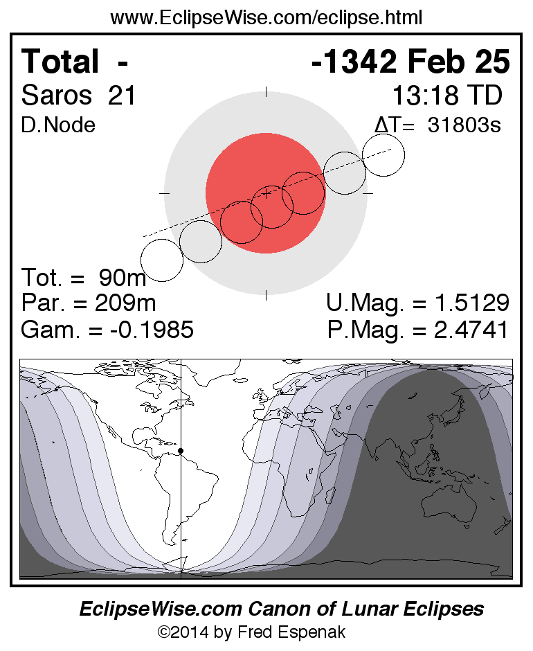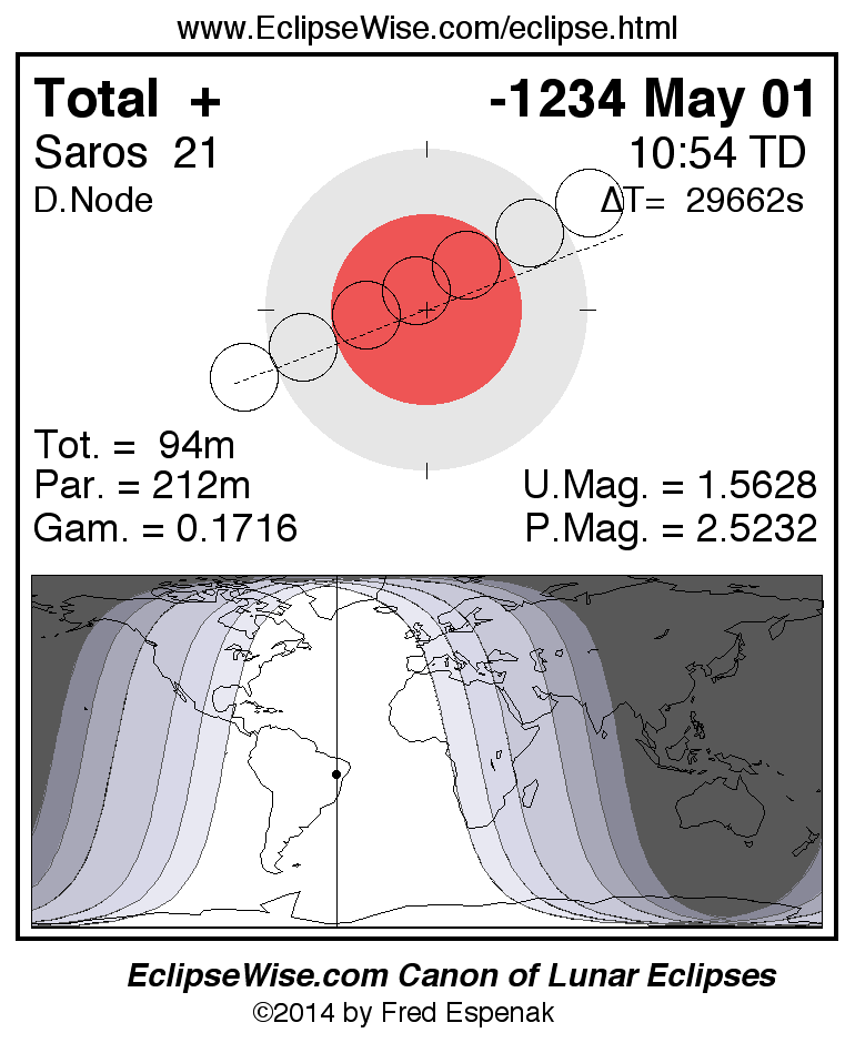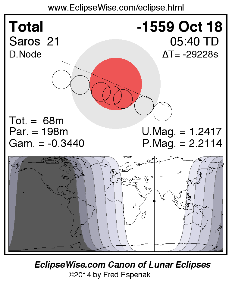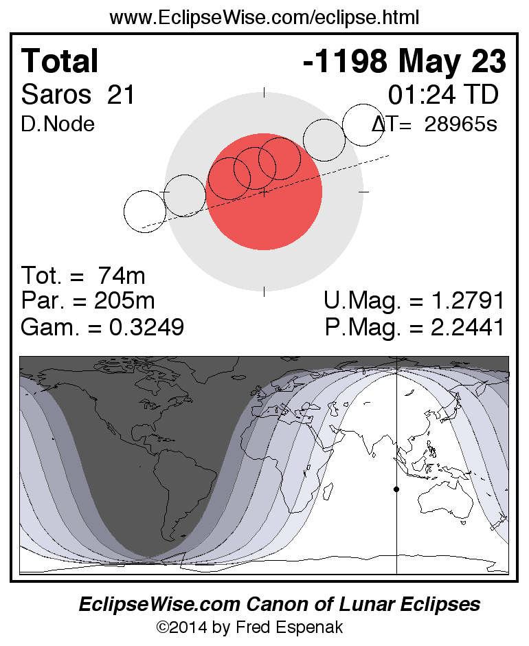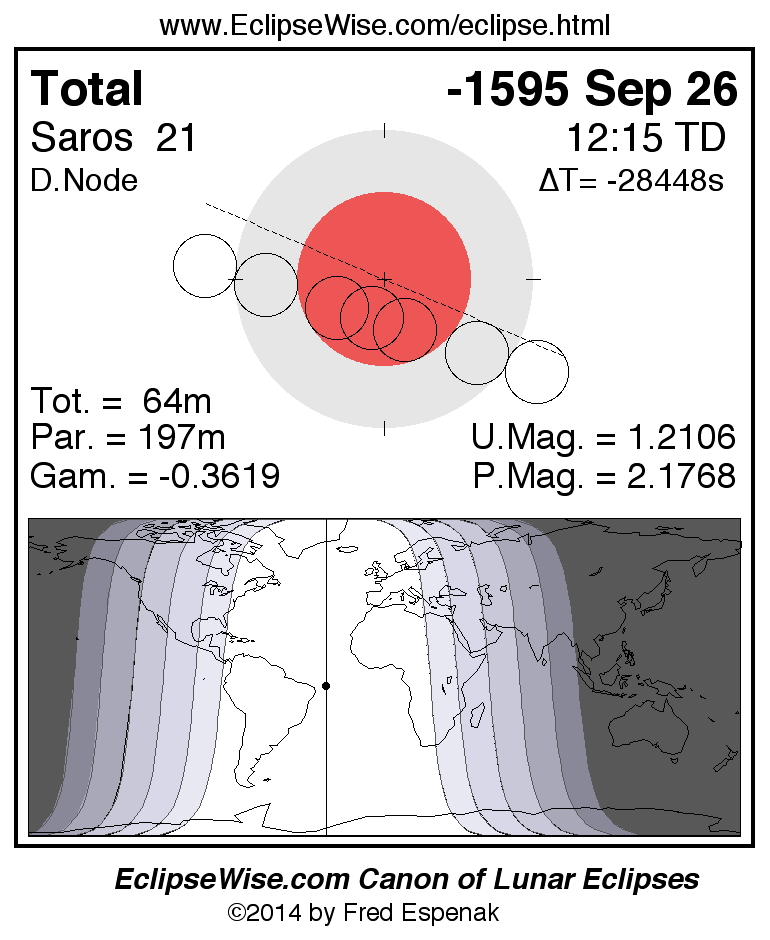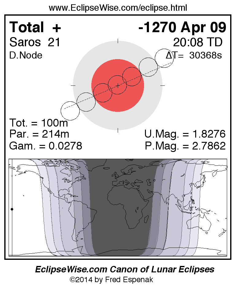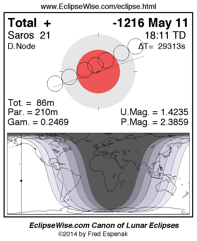 A panorama of all lunar eclipses belonging to Saros 21 is presented here. Each figure shows the Moon's path with respect to Earth's penumbral and umbral shadows. Below the path is a map depicting the geographic region of visibility for the eclipse. The date and time are given for the instant of Greatest Eclipse. Every figure serves as a hyperlink to the EclipseWise Prime page for that eclipse with a larger figure and complete details for the eclipse. Visit the Key to Lunar Eclipse Figures for a detailed explanation of these diagrams. Near the bottom of this page are a series of hyperlinks for more on lunar eclipses.
