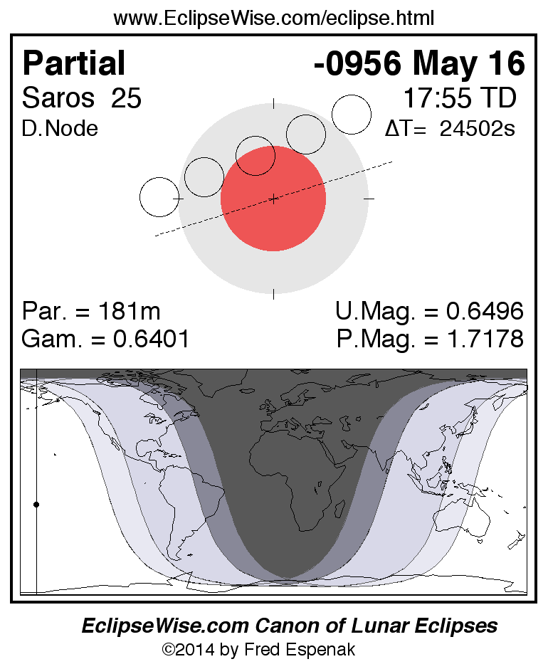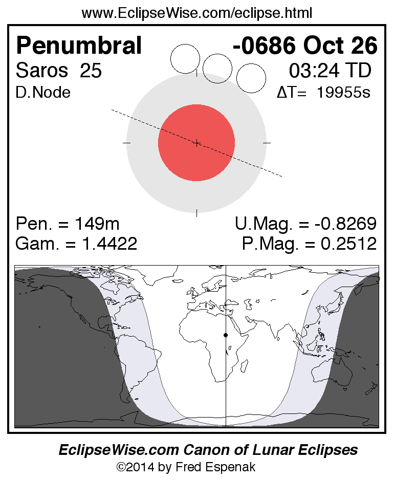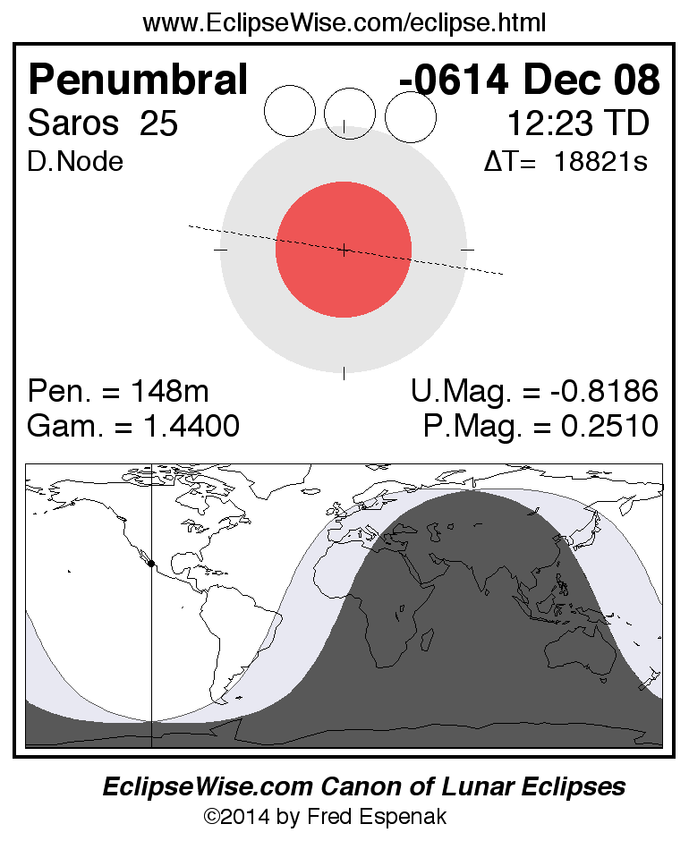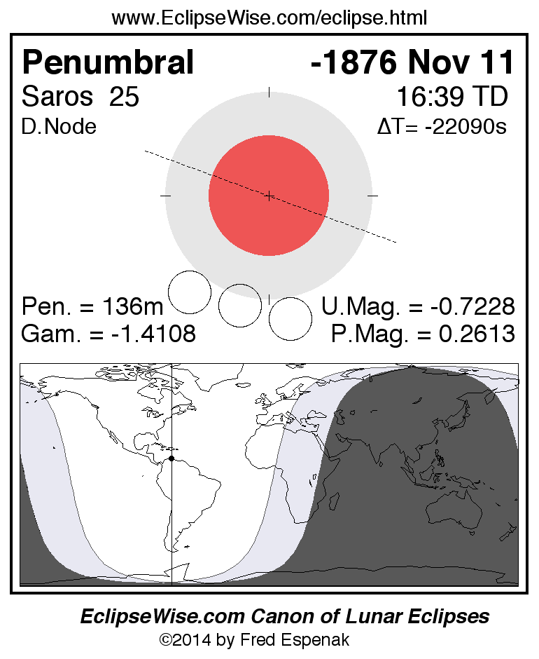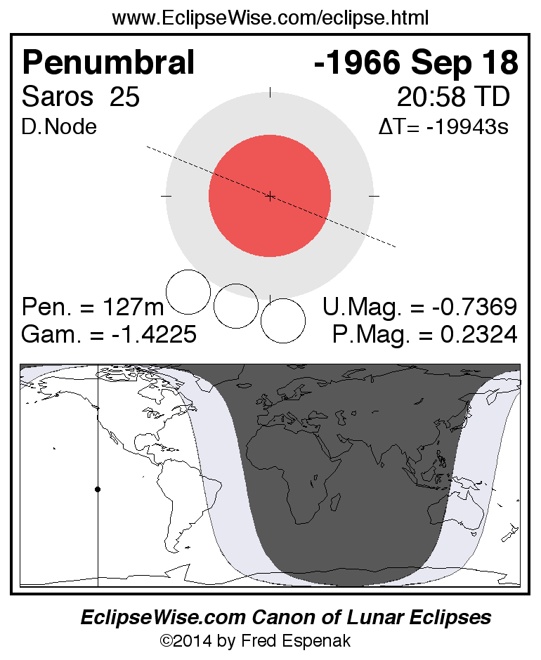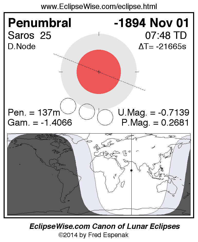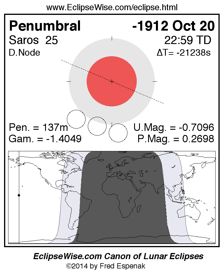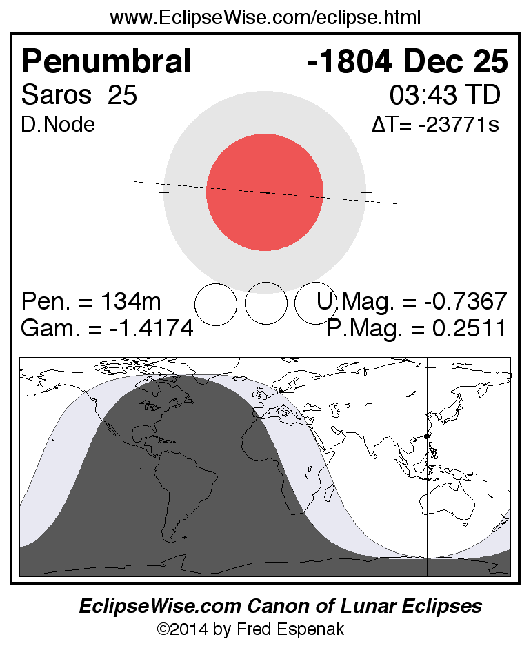 A panorama of all lunar eclipses belonging to Saros 25 is presented here. Each figure shows the Moon's path with respect to Earth's penumbral and umbral shadows. Below the path is a map depicting the geographic region of visibility for the eclipse. The date and time are given for the instant of Greatest Eclipse. Every figure serves as a hyperlink to the EclipseWise Prime page for that eclipse with a larger figure and complete details for the eclipse. Visit the Key to Lunar Eclipse Figures for a detailed explanation of these diagrams. Near the bottom of this page are a series of hyperlinks for more on lunar eclipses.