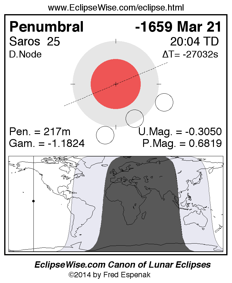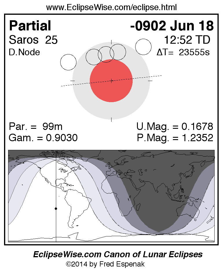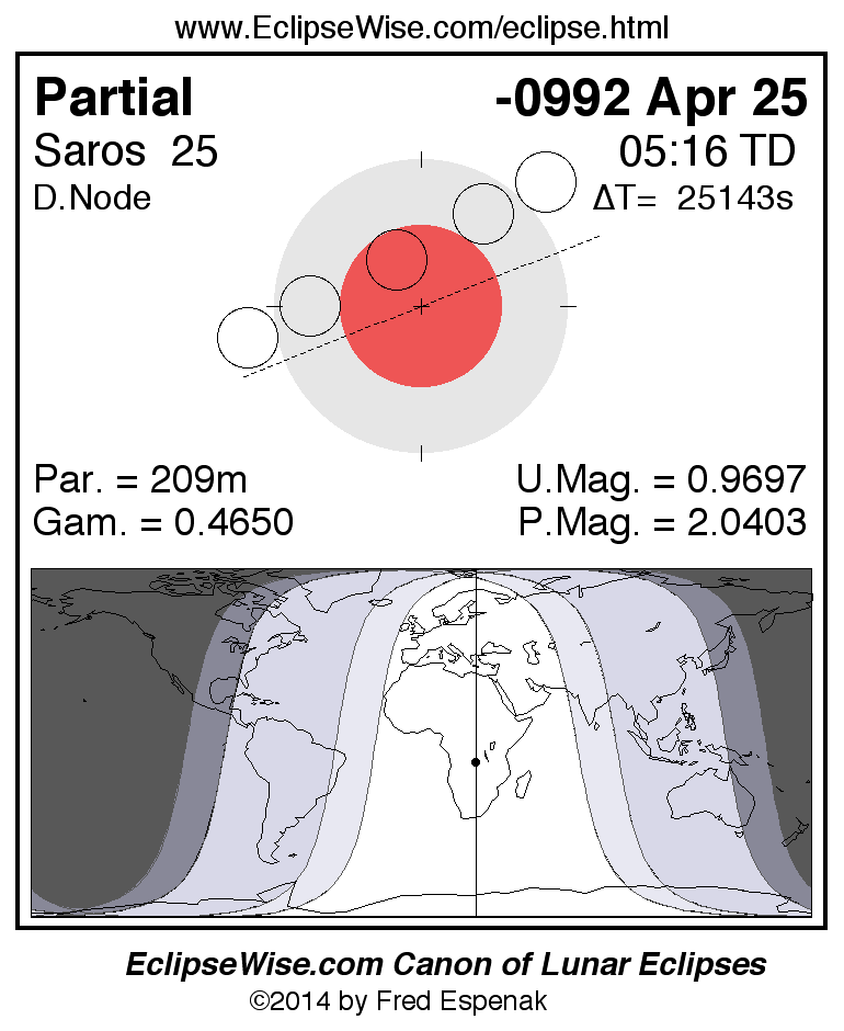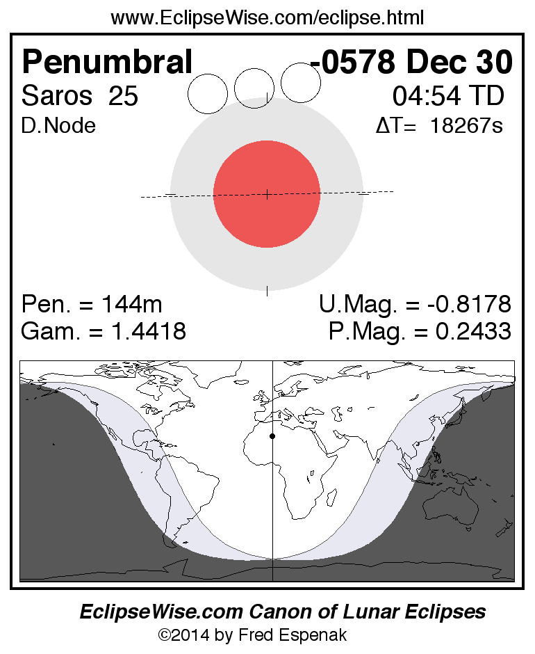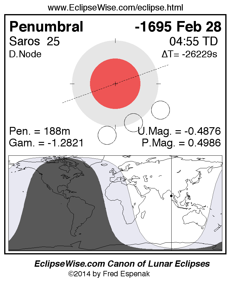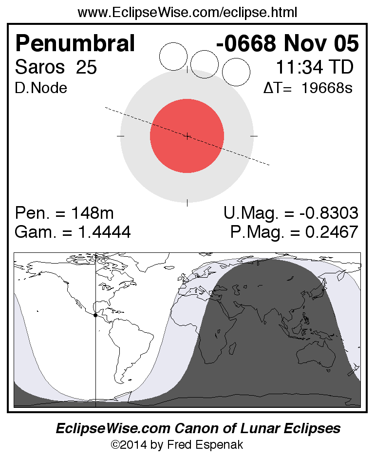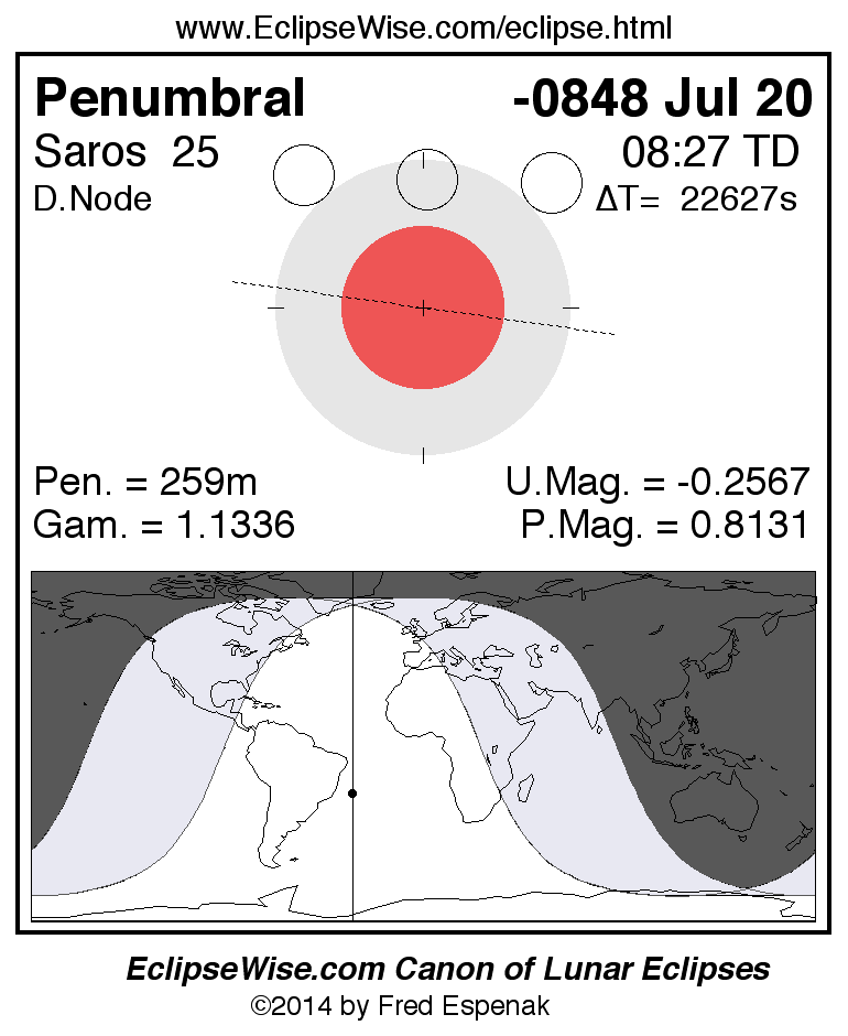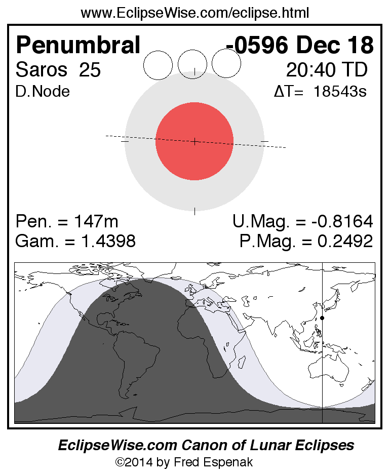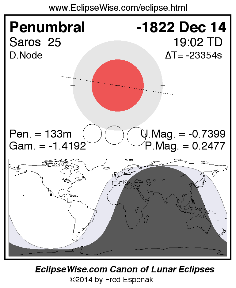 A panorama of all lunar eclipses belonging to Saros 25 is presented here. Each figure shows the Moon's path with respect to Earth's penumbral and umbral shadows. Below the path is a map depicting the geographic region of visibility for the eclipse. The date and time are given for the instant of Greatest Eclipse. Every figure serves as a hyperlink to the EclipseWise Prime page for that eclipse with a larger figure and complete details for the eclipse. Visit the Key to Lunar Eclipse Figures for a detailed explanation of these diagrams. Near the bottom of this page are a series of hyperlinks for more on lunar eclipses.