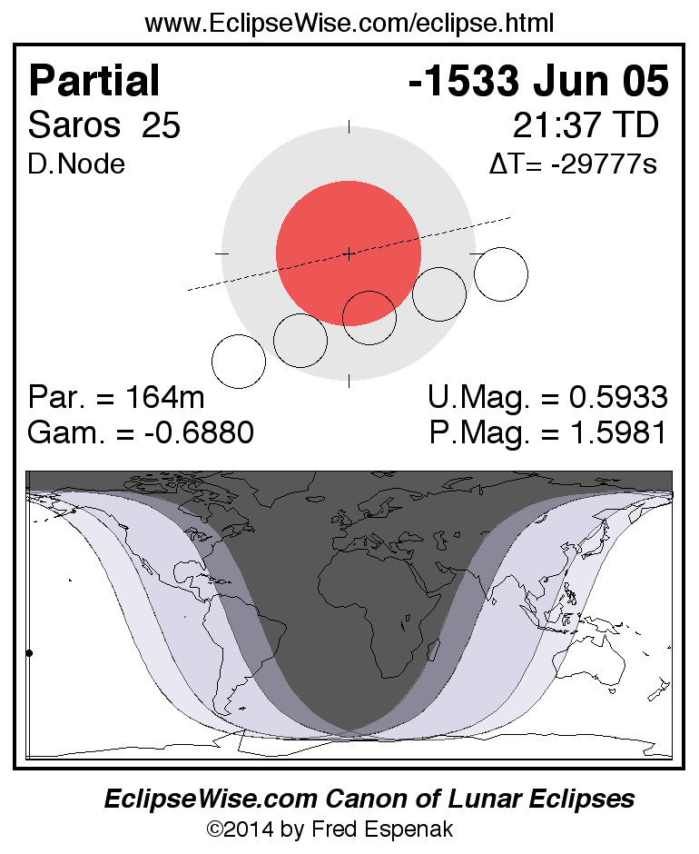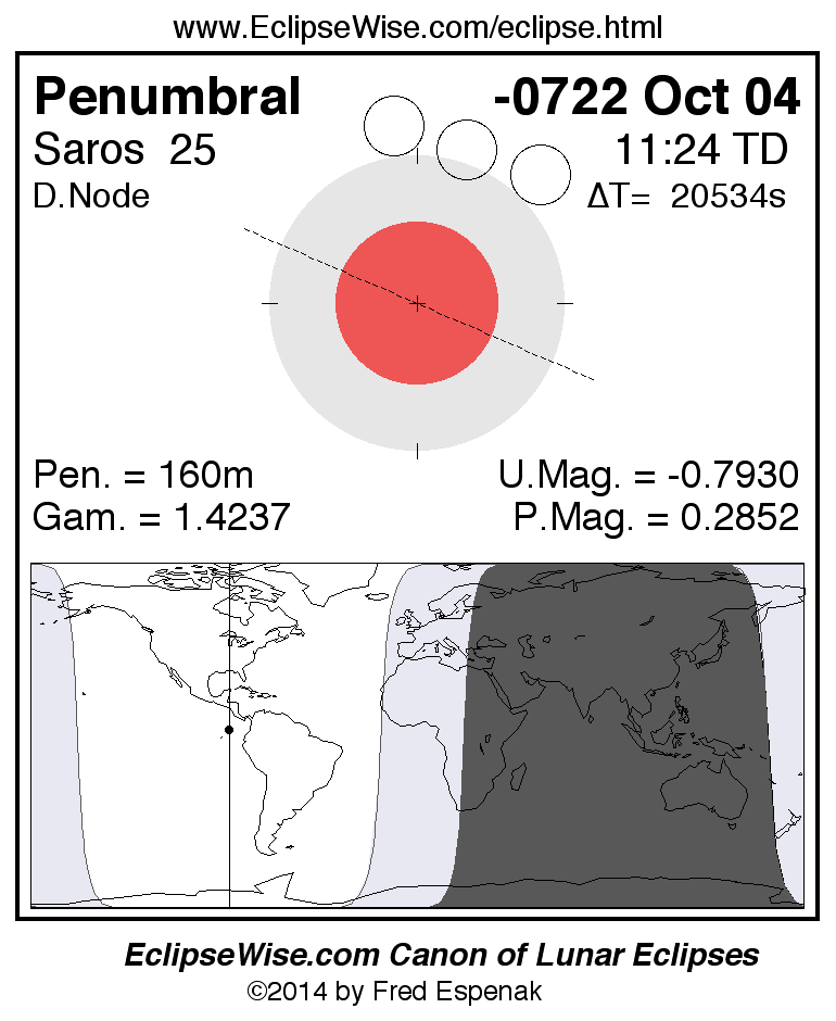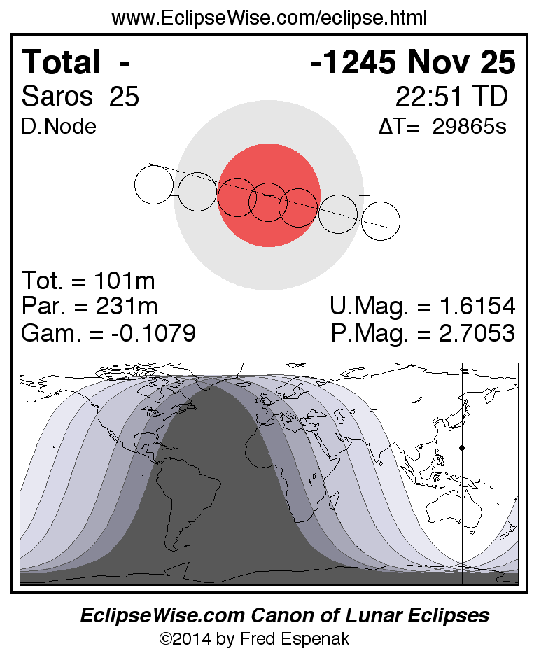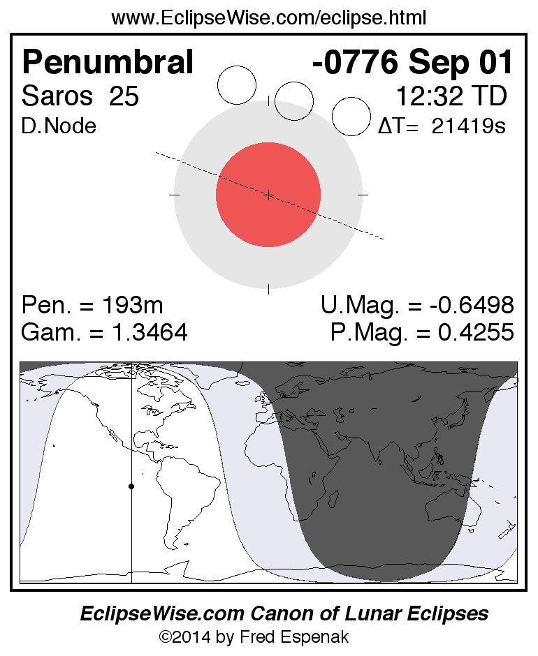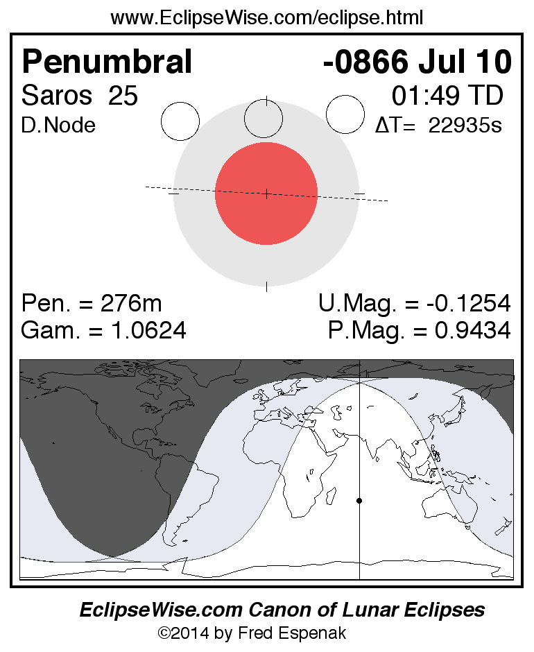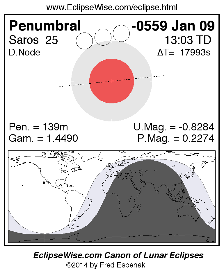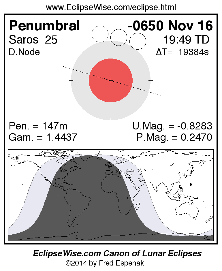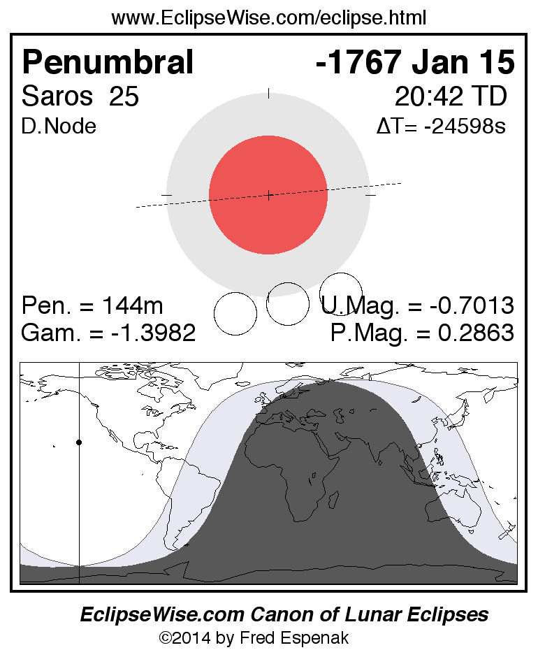 A panorama of all lunar eclipses belonging to Saros 25 is presented here. Each figure shows the Moon's path with respect to Earth's penumbral and umbral shadows. Below the path is a map depicting the geographic region of visibility for the eclipse. The date and time are given for the instant of Greatest Eclipse. Every figure serves as a hyperlink to the EclipseWise Prime page for that eclipse with a larger figure and complete details for the eclipse. Visit the Key to Lunar Eclipse Figures for a detailed explanation of these diagrams. Near the bottom of this page are a series of hyperlinks for more on lunar eclipses.