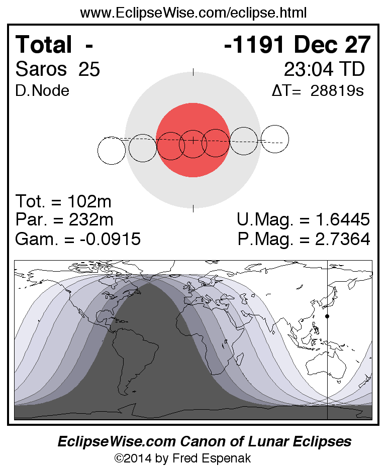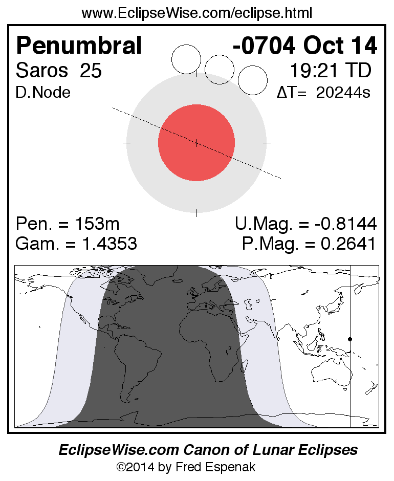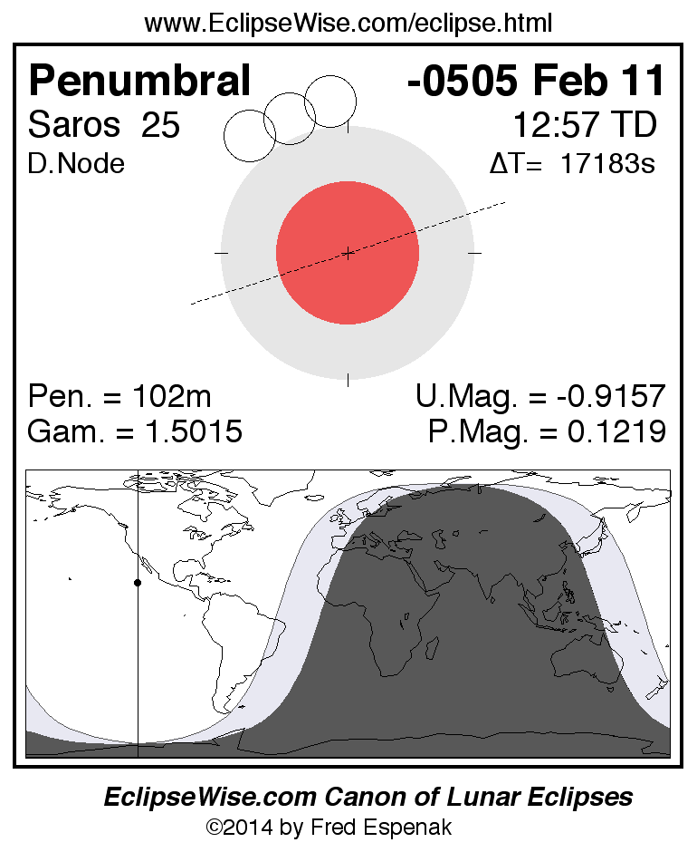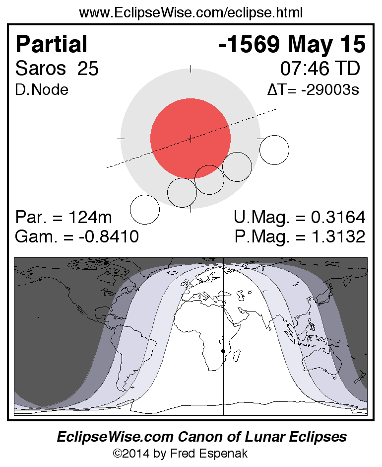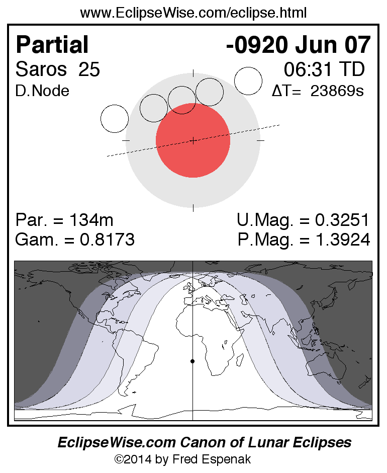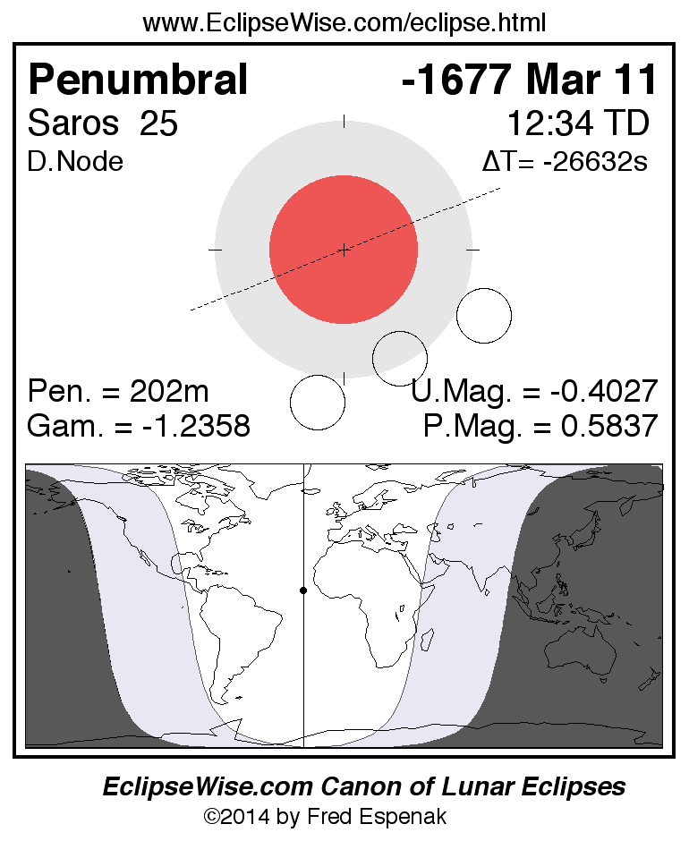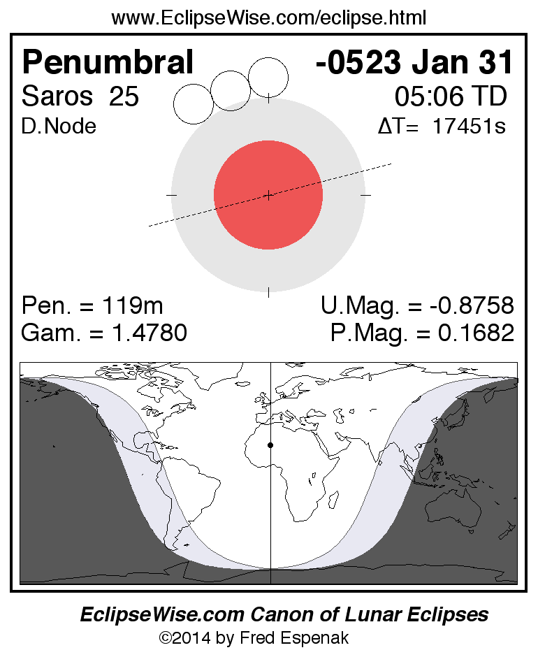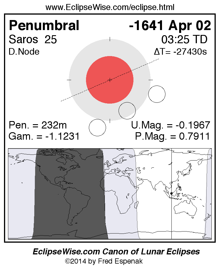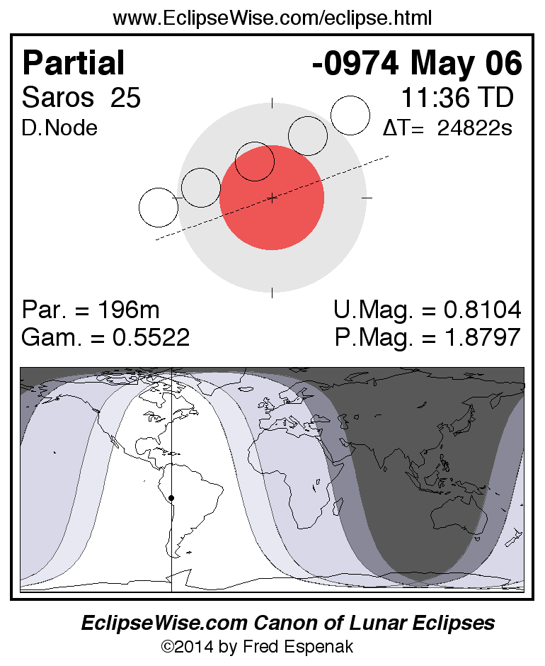 A panorama of all lunar eclipses belonging to Saros 25 is presented here. Each figure shows the Moon's path with respect to Earth's penumbral and umbral shadows. Below the path is a map depicting the geographic region of visibility for the eclipse. The date and time are given for the instant of Greatest Eclipse. Every figure serves as a hyperlink to the EclipseWise Prime page for that eclipse with a larger figure and complete details for the eclipse. Visit the Key to Lunar Eclipse Figures for a detailed explanation of these diagrams. Near the bottom of this page are a series of hyperlinks for more on lunar eclipses.
