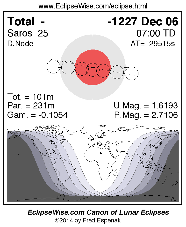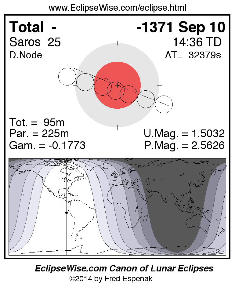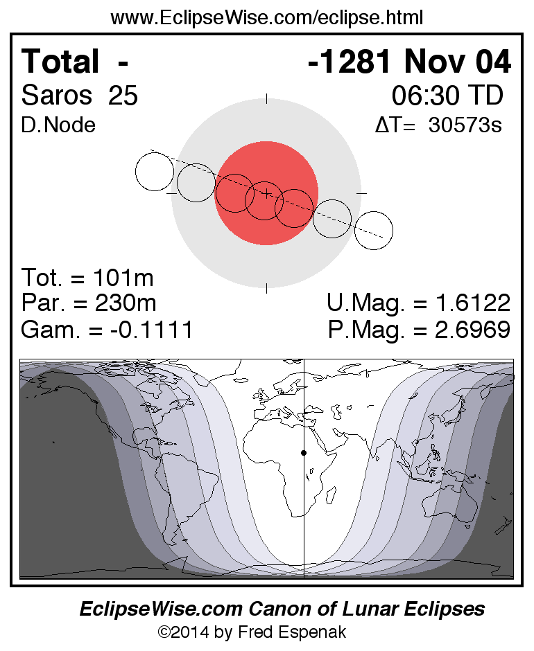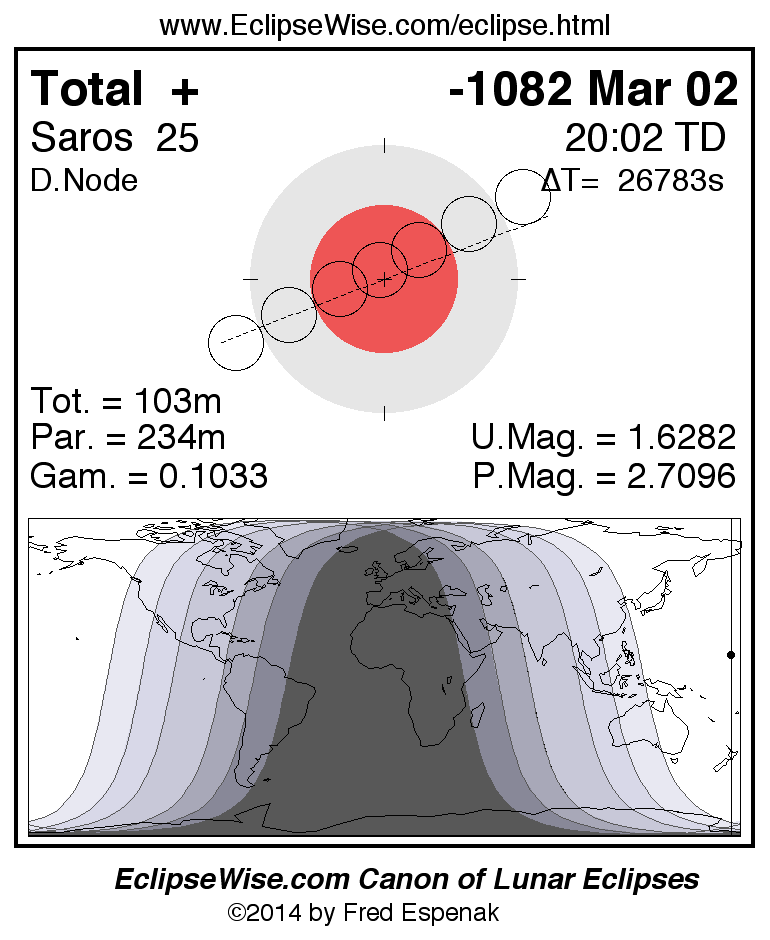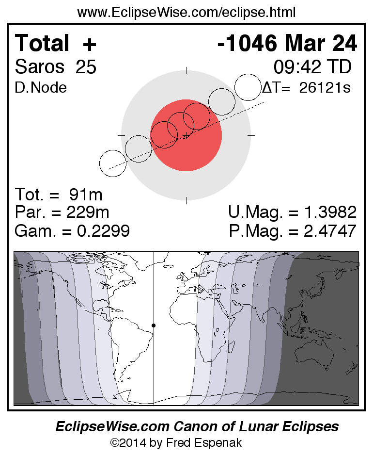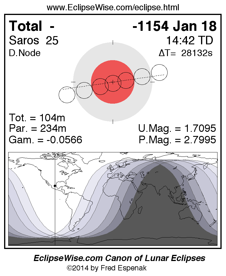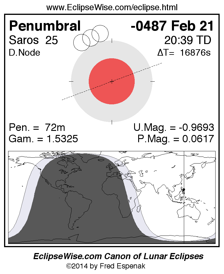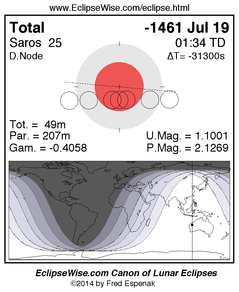 A panorama of all lunar eclipses belonging to Saros 25 is presented here. Each figure shows the Moon's path with respect to Earth's penumbral and umbral shadows. Below the path is a map depicting the geographic region of visibility for the eclipse. The date and time are given for the instant of Greatest Eclipse. Every figure serves as a hyperlink to the EclipseWise Prime page for that eclipse with a larger figure and complete details for the eclipse. Visit the Key to Lunar Eclipse Figures for a detailed explanation of these diagrams. Near the bottom of this page are a series of hyperlinks for more on lunar eclipses.