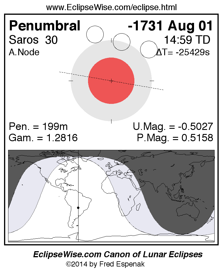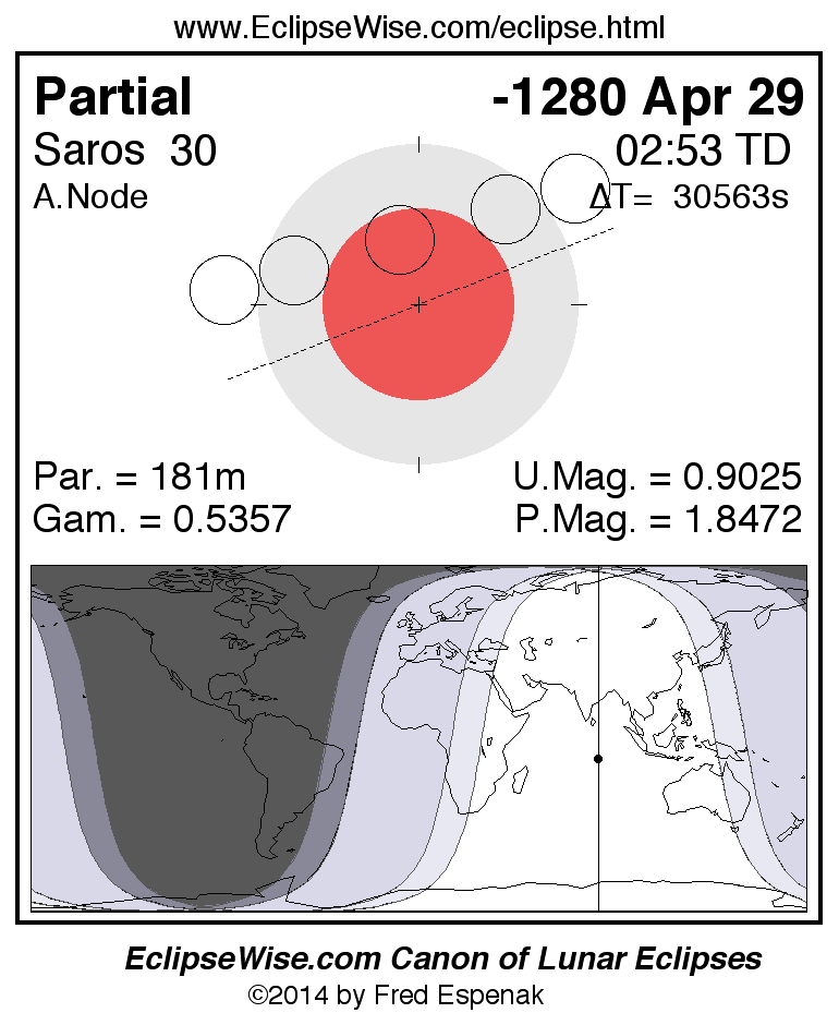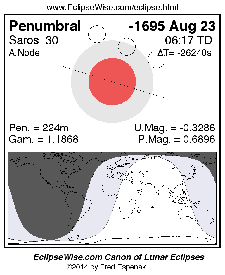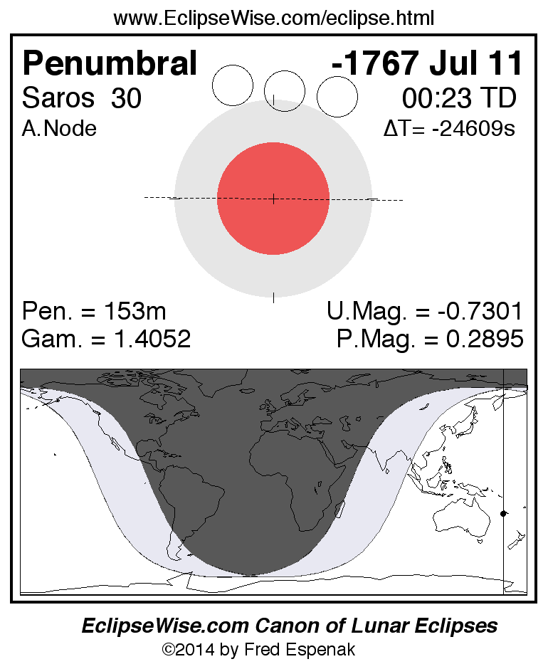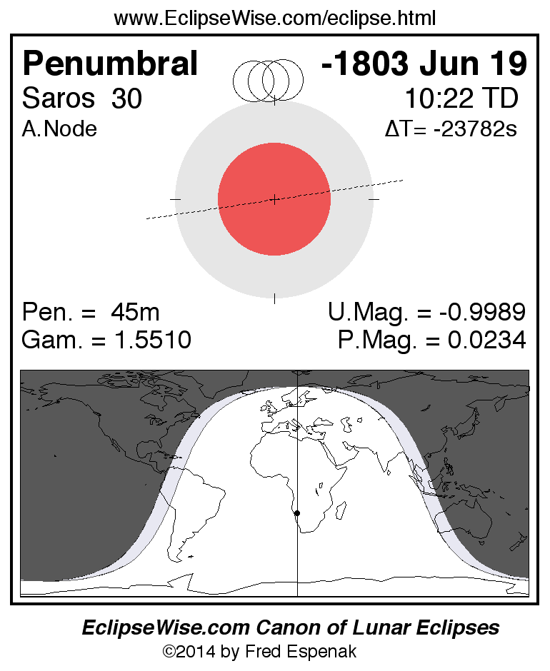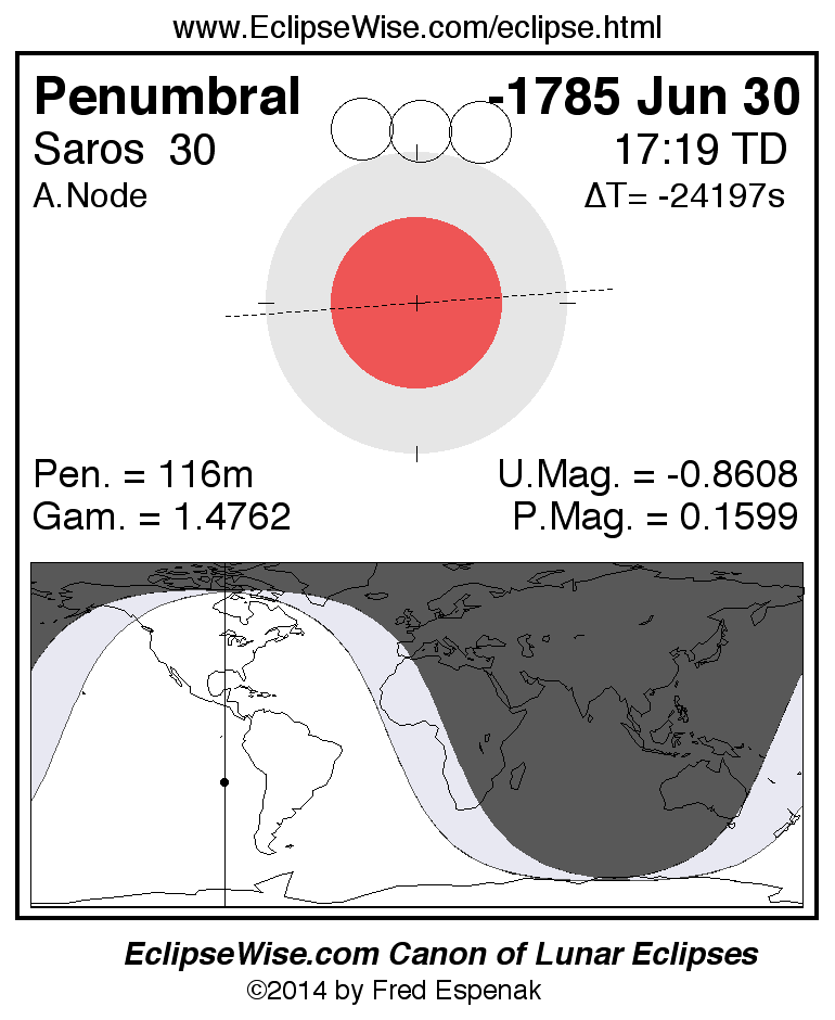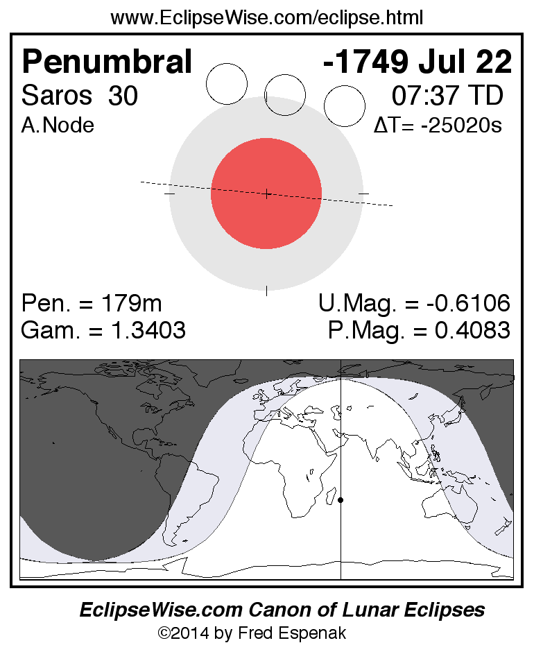 A panorama of all lunar eclipses belonging to Saros 30 is presented here. Each figure shows the Moon's path with respect to Earth's penumbral and umbral shadows. Below the path is a map depicting the geographic region of visibility for the eclipse. The date and time are given for the instant of Greatest Eclipse. Every figure serves as a hyperlink to the EclipseWise Prime page for that eclipse with a larger figure and complete details for the eclipse. Visit the Key to Lunar Eclipse Figures for a detailed explanation of these diagrams. Near the bottom of this page are a series of hyperlinks for more on lunar eclipses.