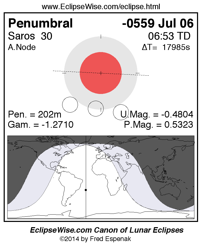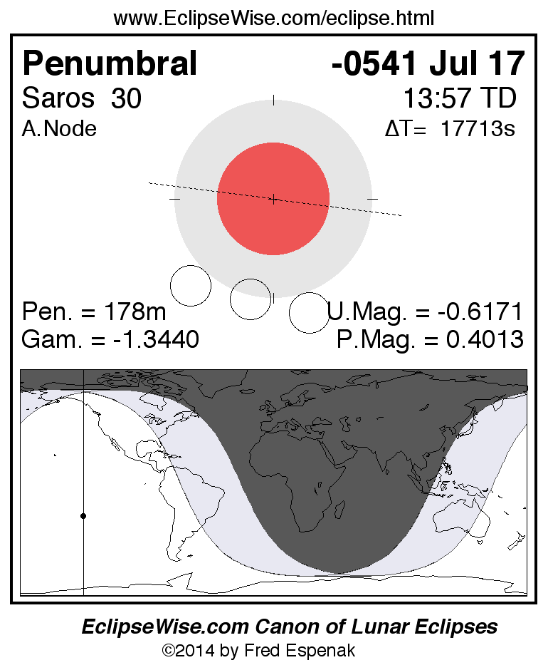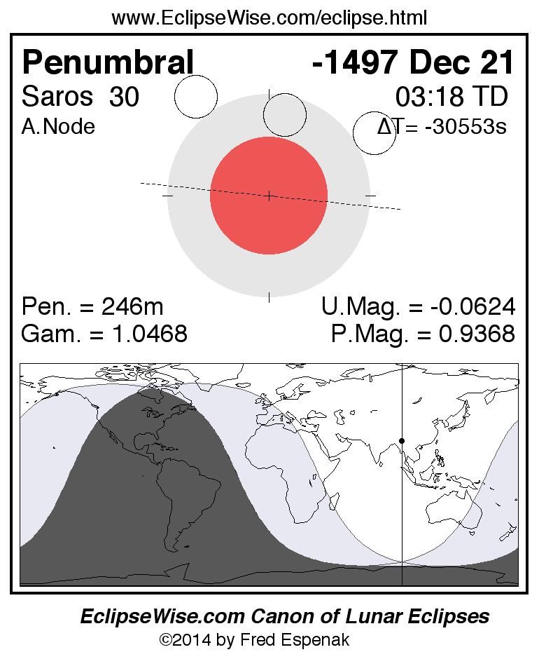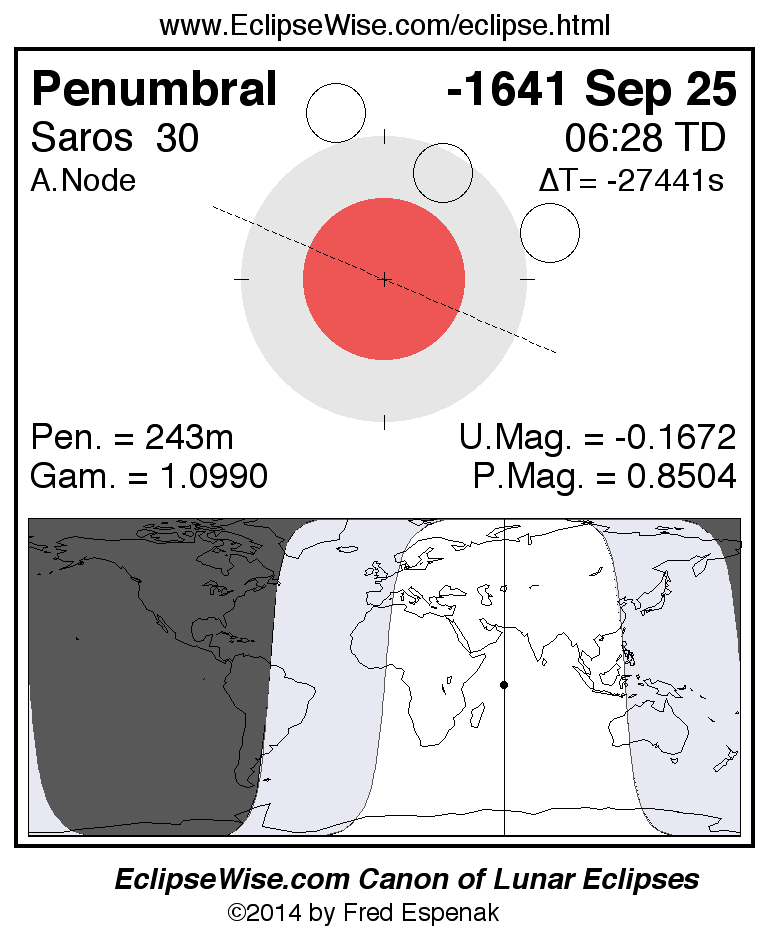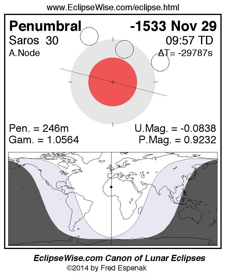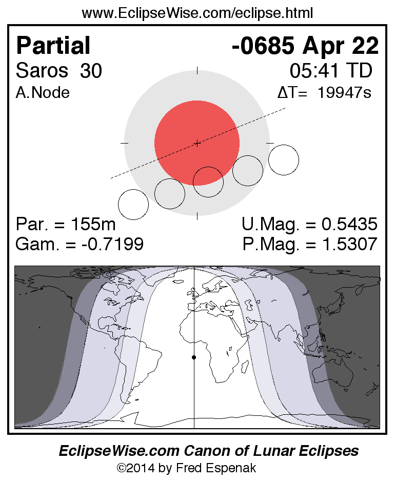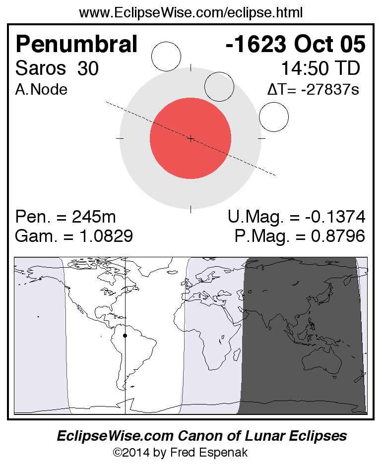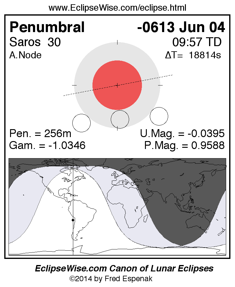 A panorama of all lunar eclipses belonging to Saros 30 is presented here. Each figure shows the Moon's path with respect to Earth's penumbral and umbral shadows. Below the path is a map depicting the geographic region of visibility for the eclipse. The date and time are given for the instant of Greatest Eclipse. Every figure serves as a hyperlink to the EclipseWise Prime page for that eclipse with a larger figure and complete details for the eclipse. Visit the Key to Lunar Eclipse Figures for a detailed explanation of these diagrams. Near the bottom of this page are a series of hyperlinks for more on lunar eclipses.