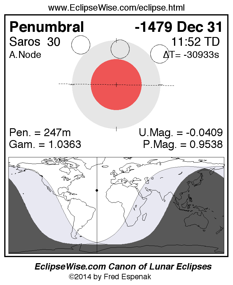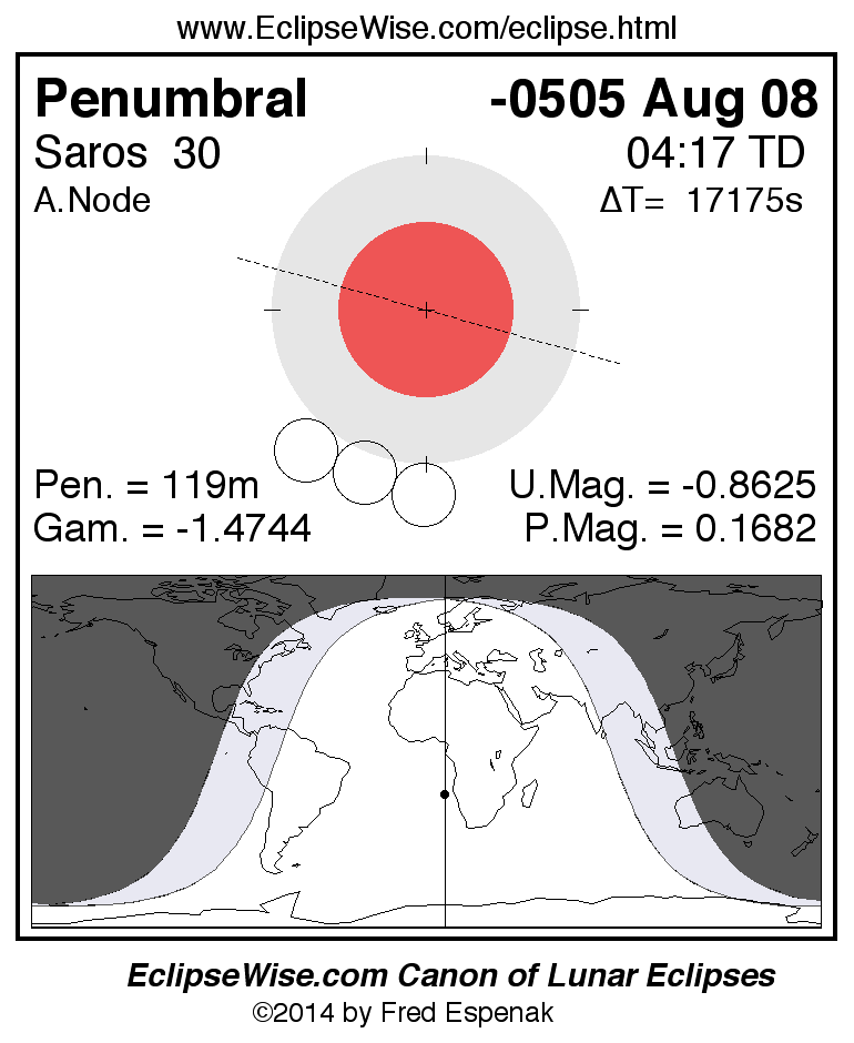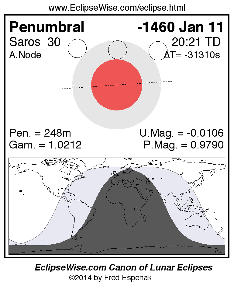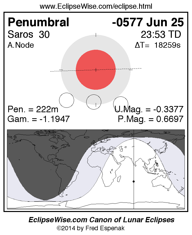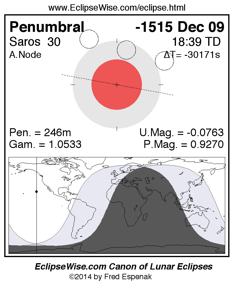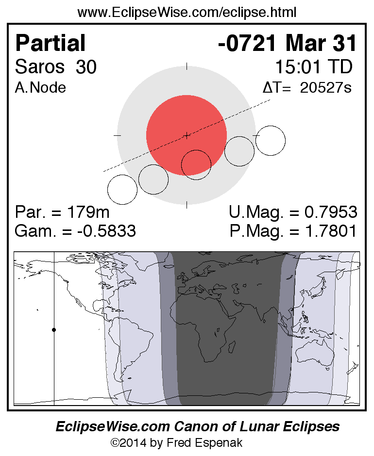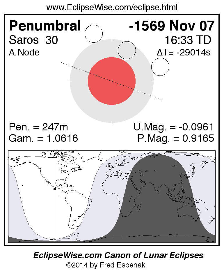 A panorama of all lunar eclipses belonging to Saros 30 is presented here. Each figure shows the Moon's path with respect to Earth's penumbral and umbral shadows. Below the path is a map depicting the geographic region of visibility for the eclipse. The date and time are given for the instant of Greatest Eclipse. Every figure serves as a hyperlink to the EclipseWise Prime page for that eclipse with a larger figure and complete details for the eclipse. Visit the Key to Lunar Eclipse Figures for a detailed explanation of these diagrams. Near the bottom of this page are a series of hyperlinks for more on lunar eclipses.