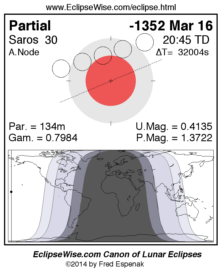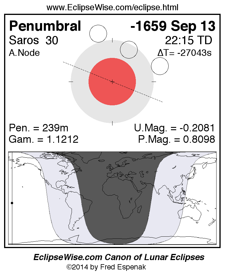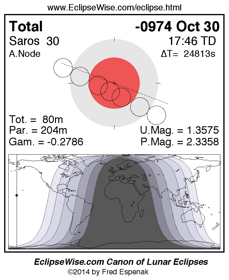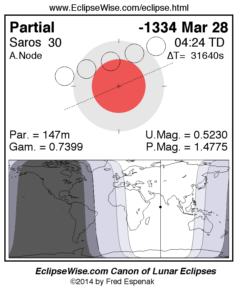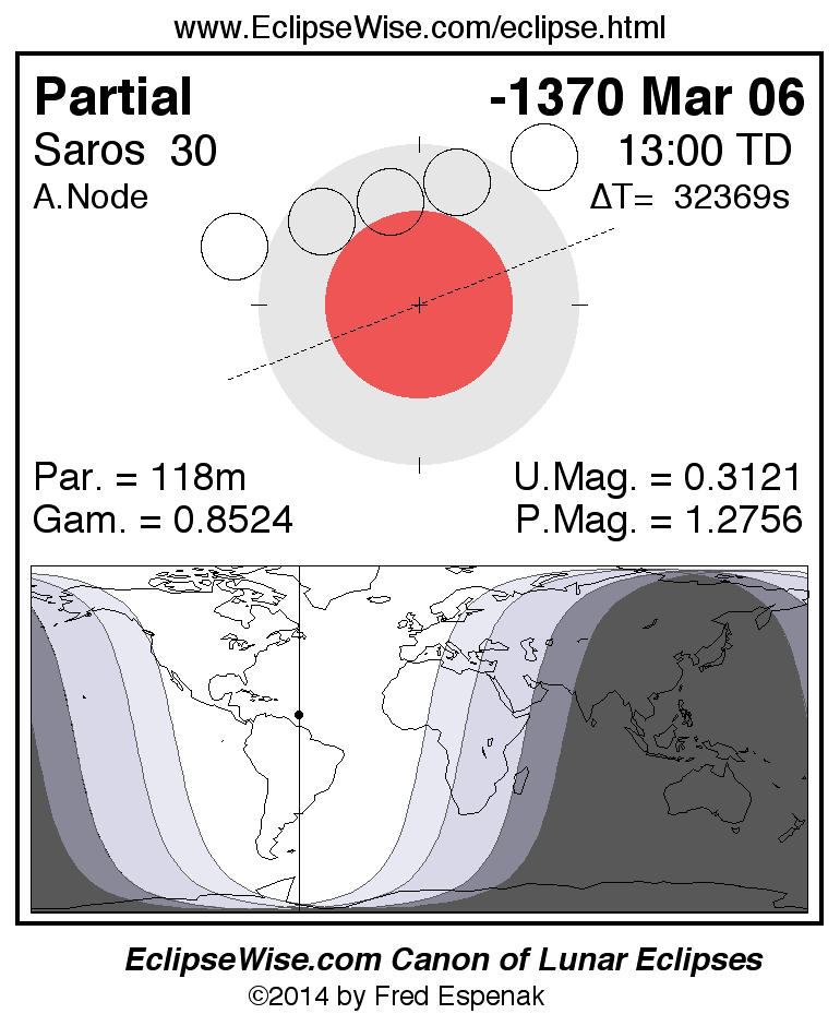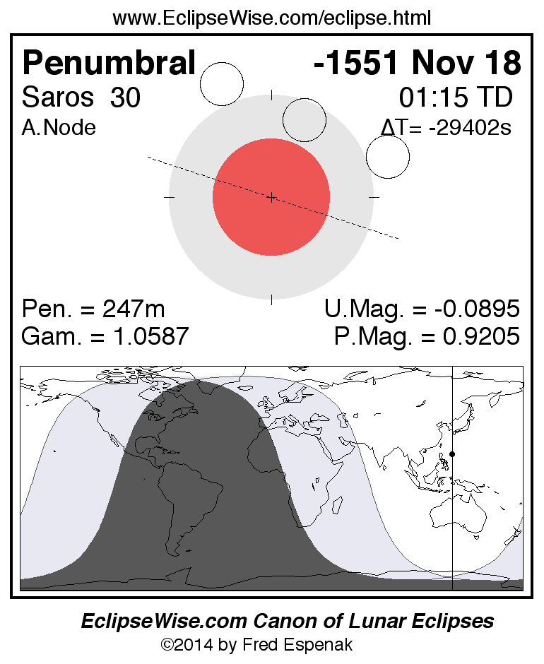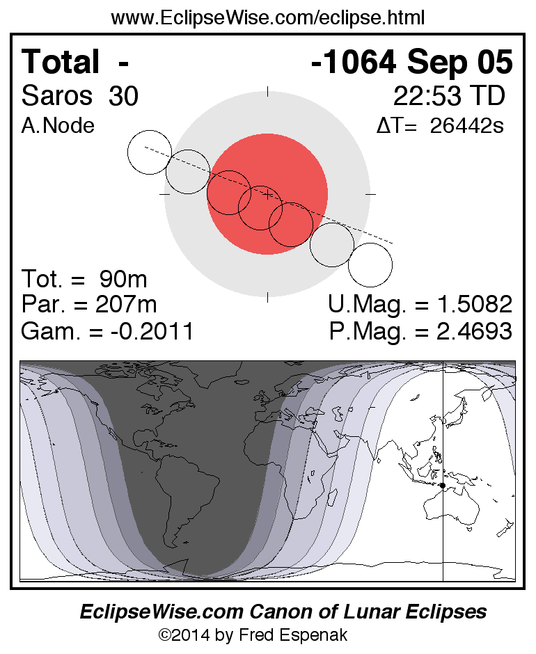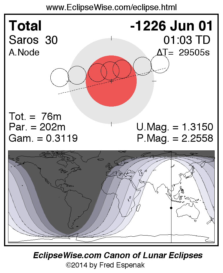A panorama of all lunar eclipses belonging to Saros 30 is presented here. Each figure shows the Moon's path with respect to Earth's penumbral and umbral shadows. Below the path is a map depicting the geographic region of visibility for the eclipse. The date and time are given for the instant of Greatest Eclipse. Every figure serves as a hyperlink to the EclipseWise Prime page for that eclipse with a larger figure and complete details for the eclipse. Visit the Key to Lunar Eclipse Figures for a detailed explanation of these diagrams. Near the bottom of this page are a series of hyperlinks for more on lunar eclipses.