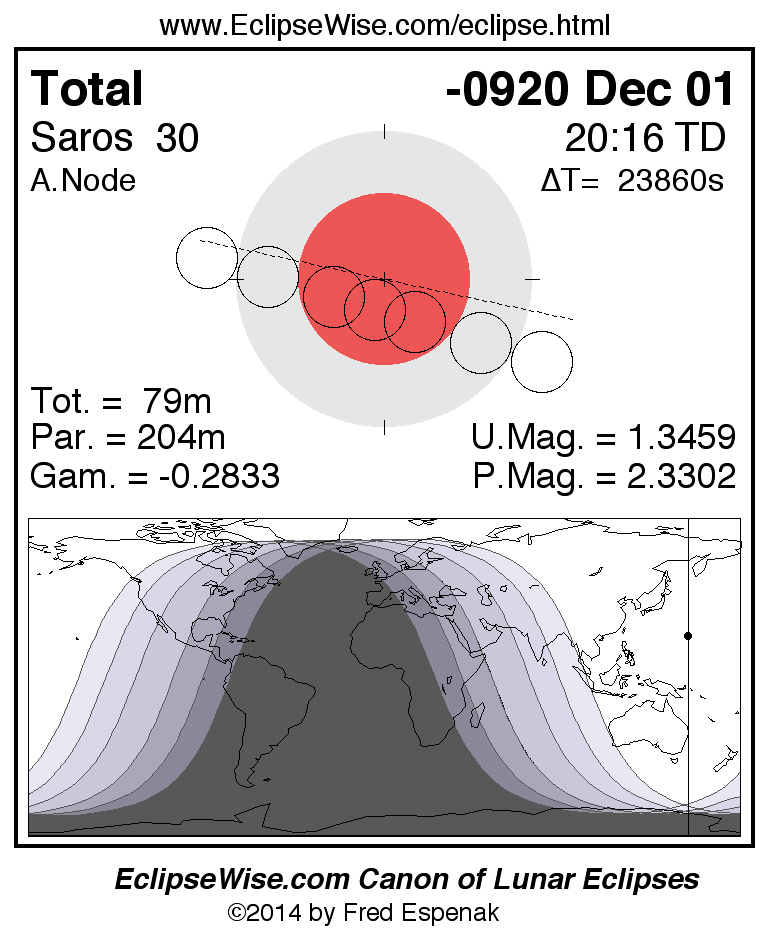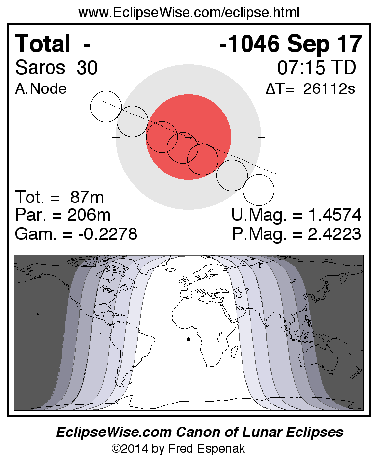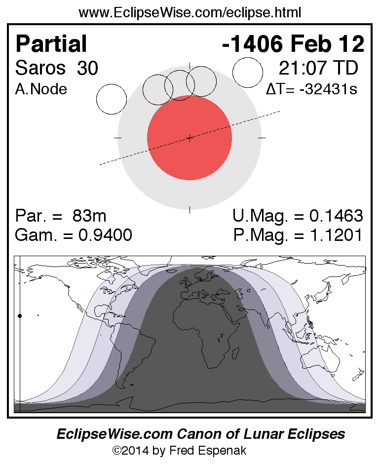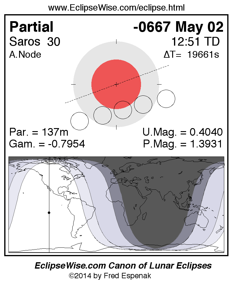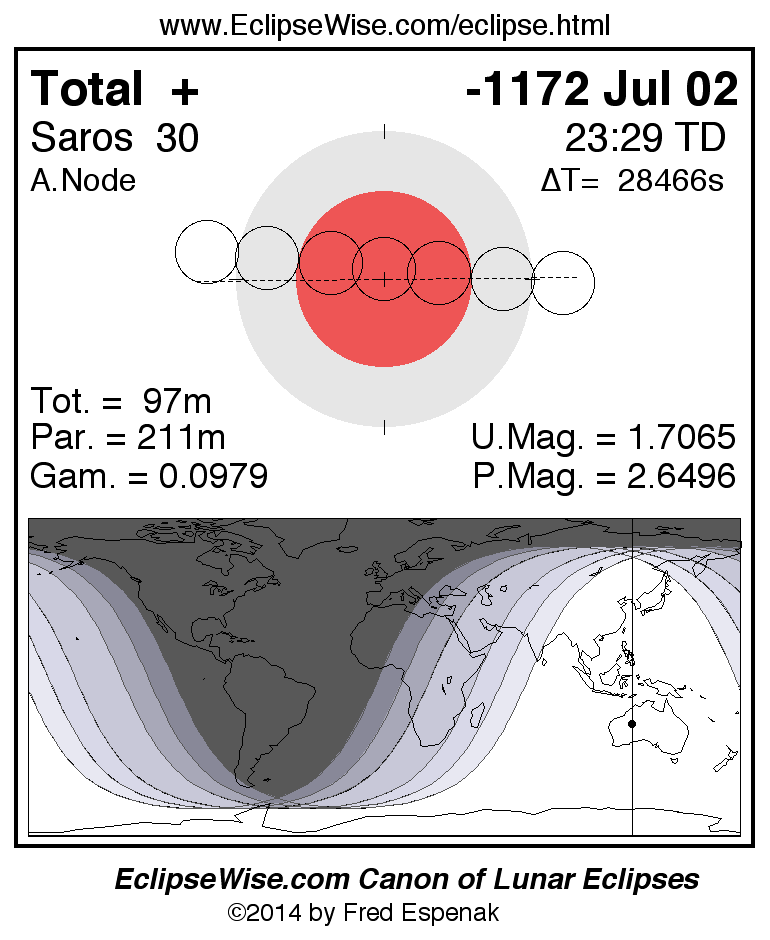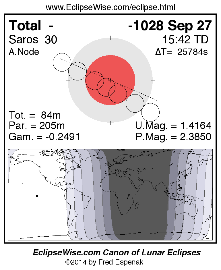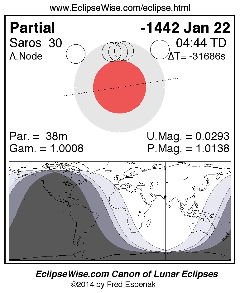 A panorama of all lunar eclipses belonging to Saros 30 is presented here. Each figure shows the Moon's path with respect to Earth's penumbral and umbral shadows. Below the path is a map depicting the geographic region of visibility for the eclipse. The date and time are given for the instant of Greatest Eclipse. Every figure serves as a hyperlink to the EclipseWise Prime page for that eclipse with a larger figure and complete details for the eclipse. Visit the Key to Lunar Eclipse Figures for a detailed explanation of these diagrams. Near the bottom of this page are a series of hyperlinks for more on lunar eclipses.