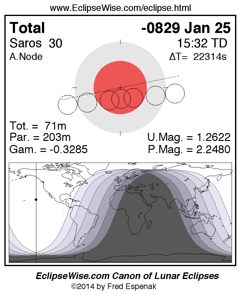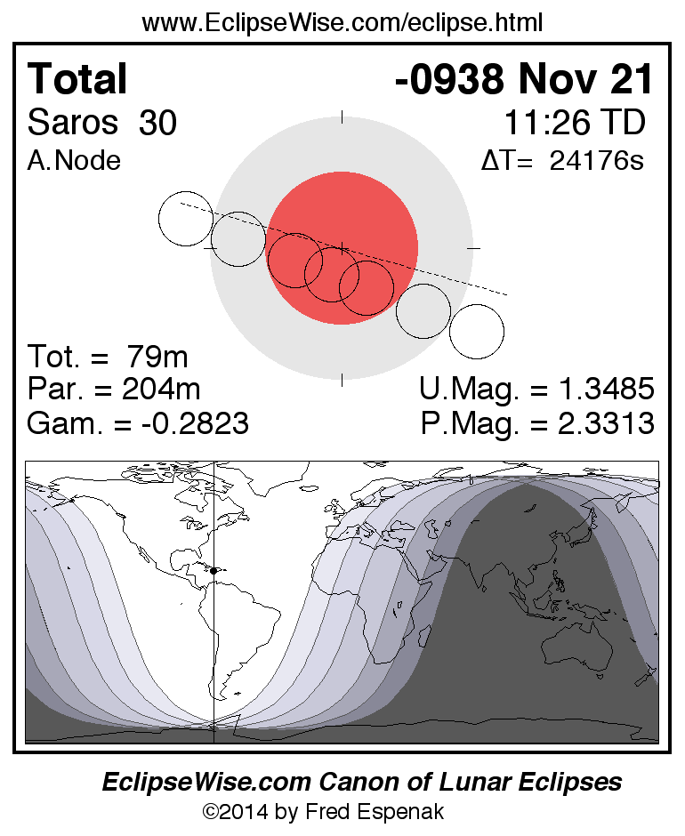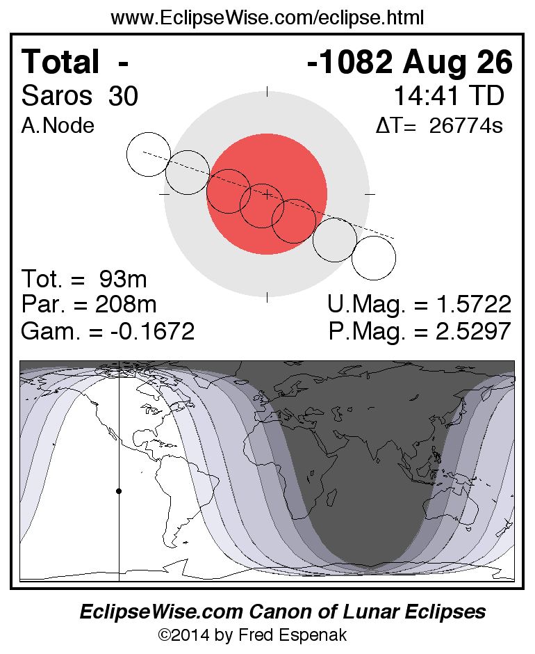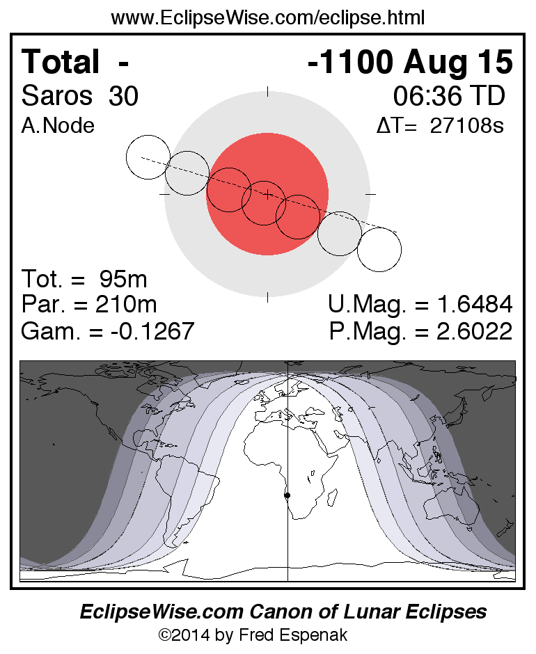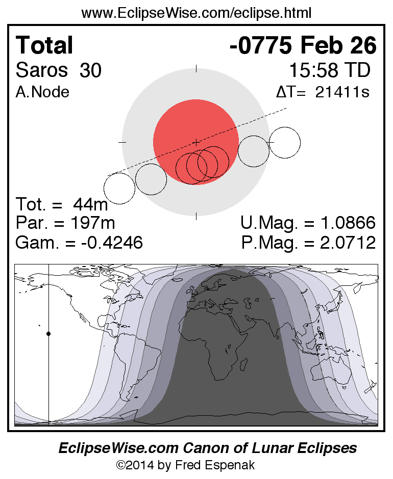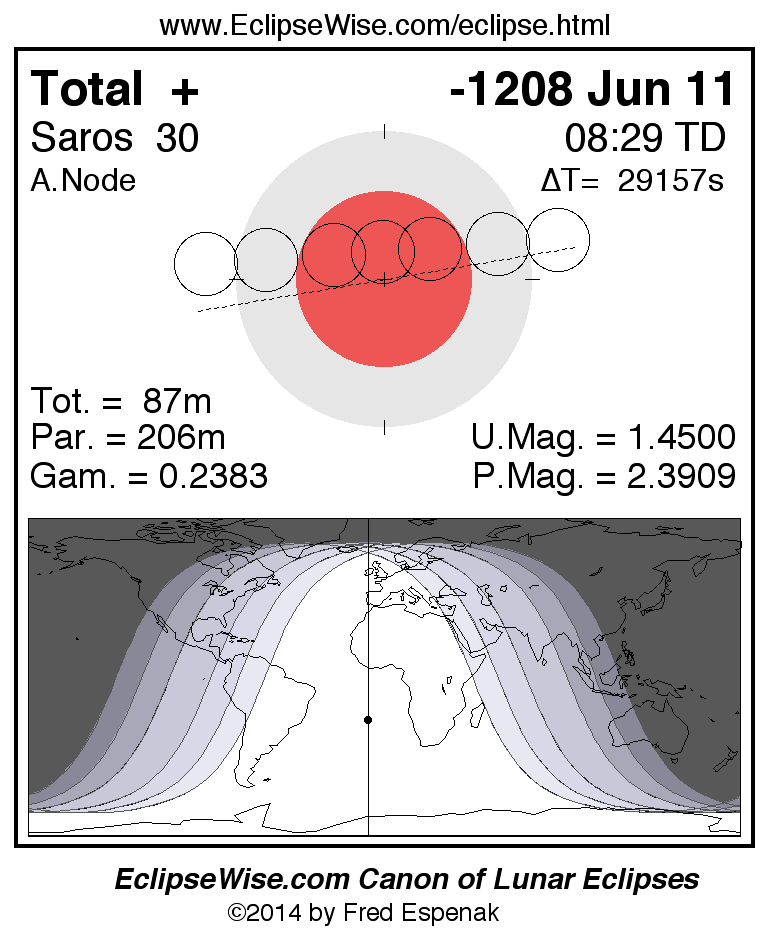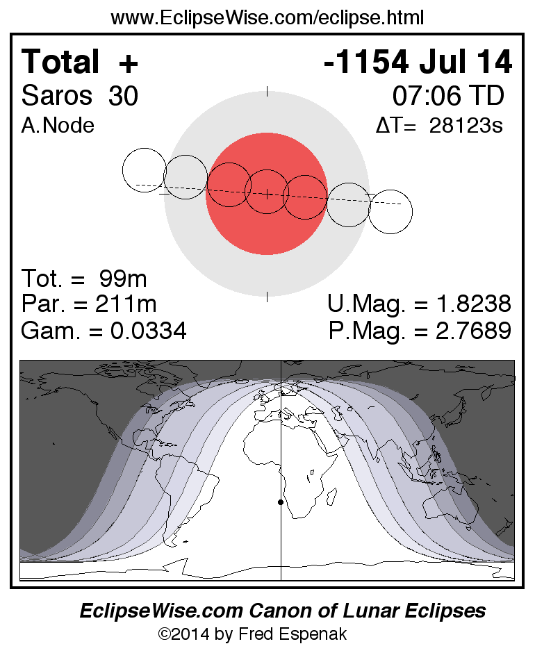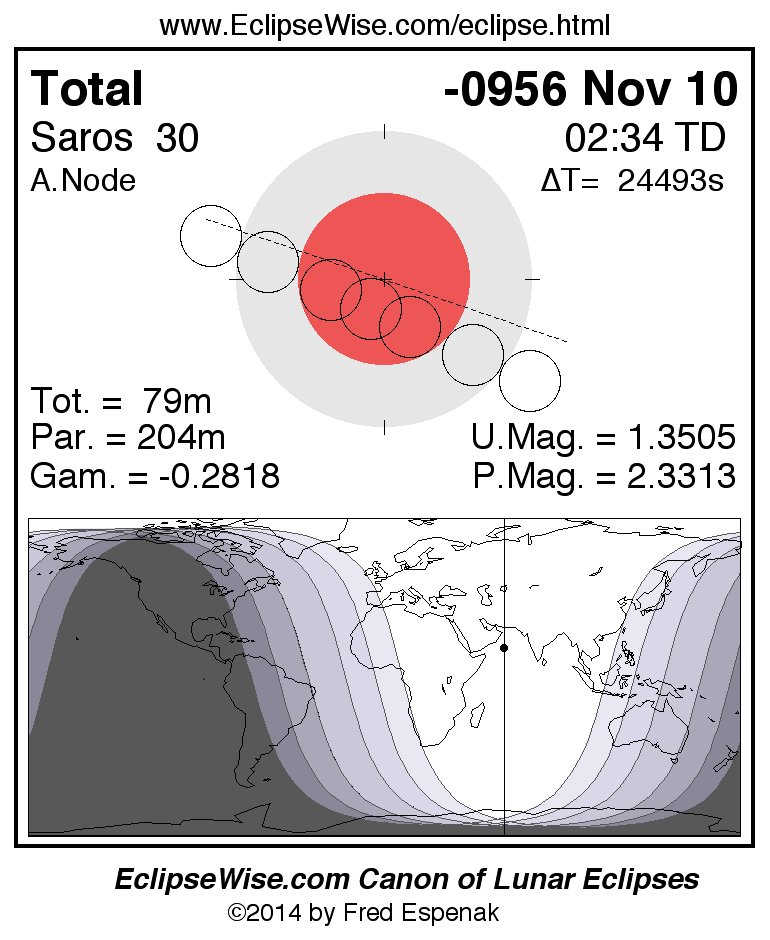 A panorama of all lunar eclipses belonging to Saros 30 is presented here. Each figure shows the Moon's path with respect to Earth's penumbral and umbral shadows. Below the path is a map depicting the geographic region of visibility for the eclipse. The date and time are given for the instant of Greatest Eclipse. Every figure serves as a hyperlink to the EclipseWise Prime page for that eclipse with a larger figure and complete details for the eclipse. Visit the Key to Lunar Eclipse Figures for a detailed explanation of these diagrams. Near the bottom of this page are a series of hyperlinks for more on lunar eclipses.