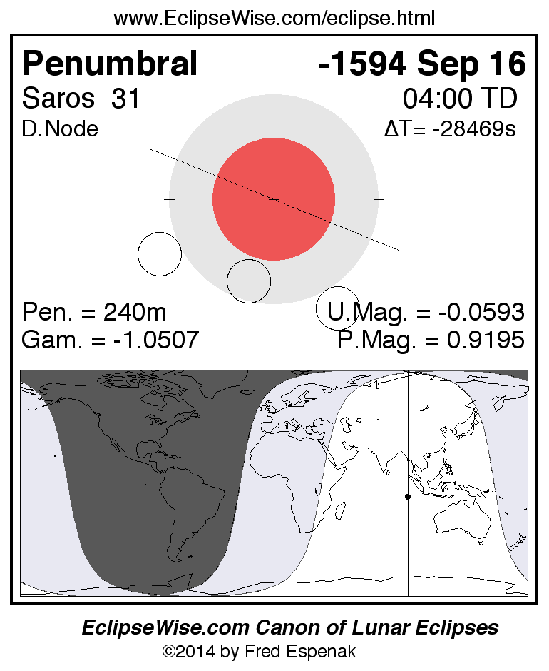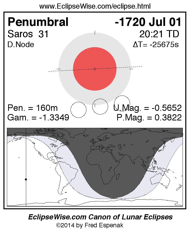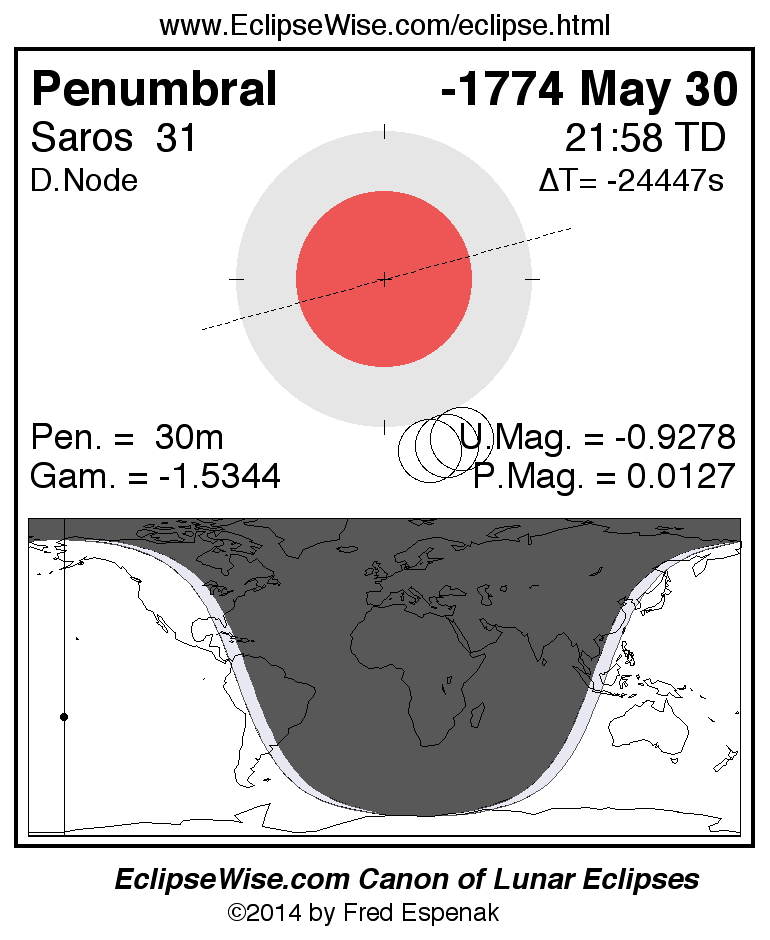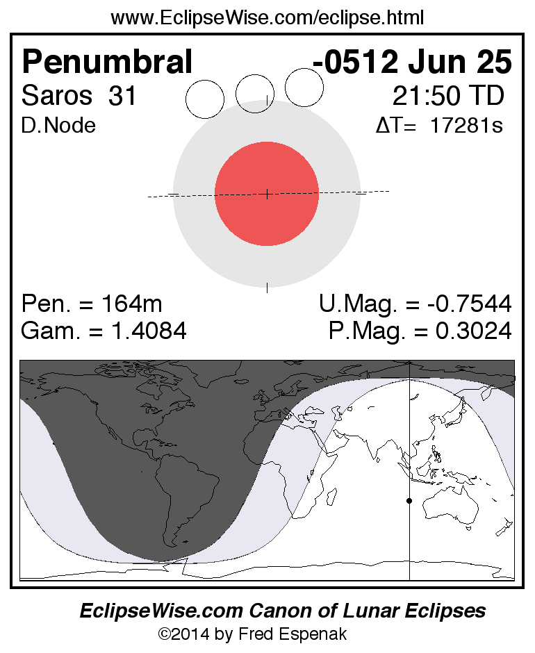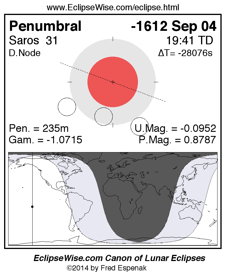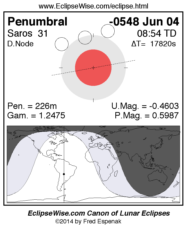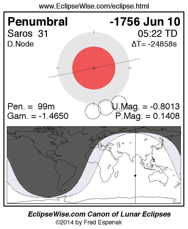 A panorama of all lunar eclipses belonging to Saros 31 is presented here. Each figure shows the Moon's path with respect to Earth's penumbral and umbral shadows. Below the path is a map depicting the geographic region of visibility for the eclipse. The date and time are given for the instant of Greatest Eclipse. Every figure serves as a hyperlink to the EclipseWise Prime page for that eclipse with a larger figure and complete details for the eclipse. Visit the Key to Lunar Eclipse Figures for a detailed explanation of these diagrams. Near the bottom of this page are a series of hyperlinks for more on lunar eclipses.