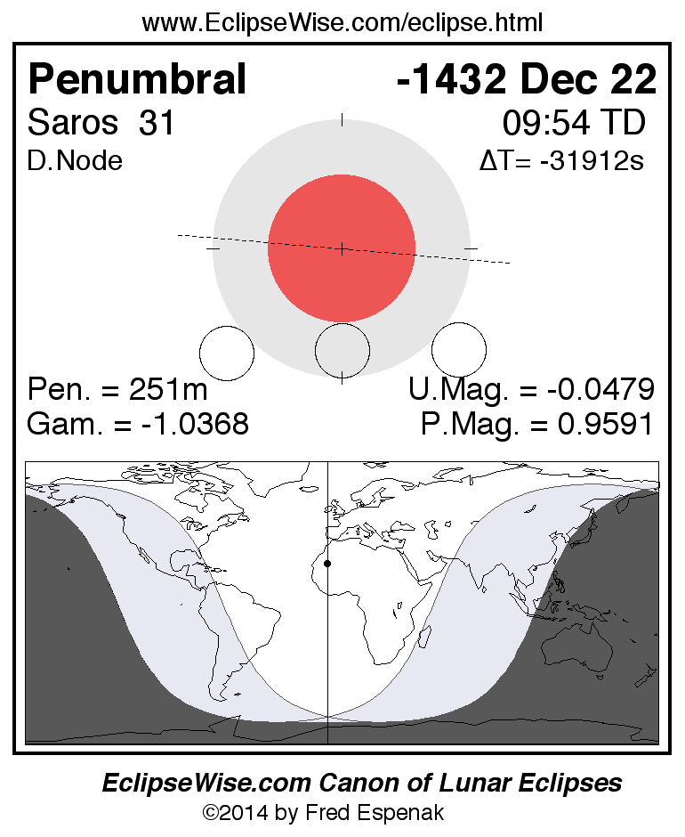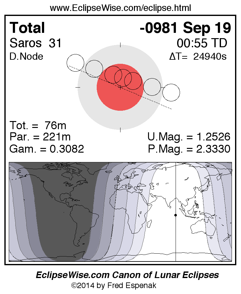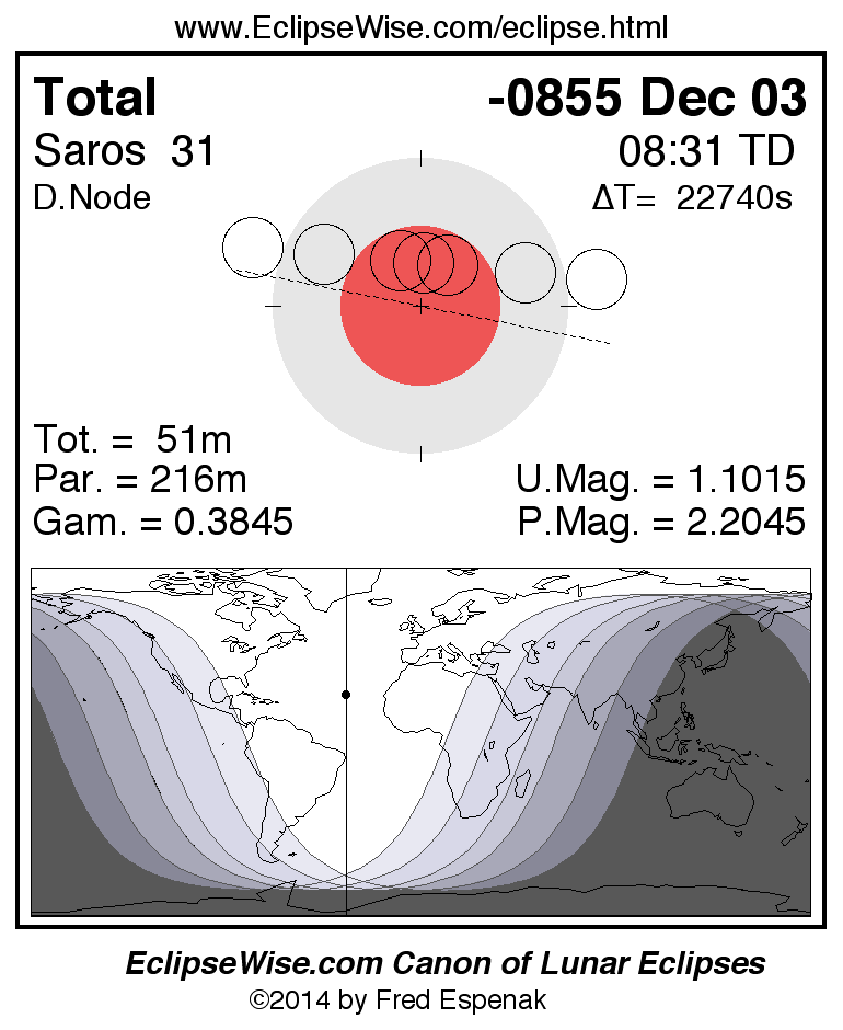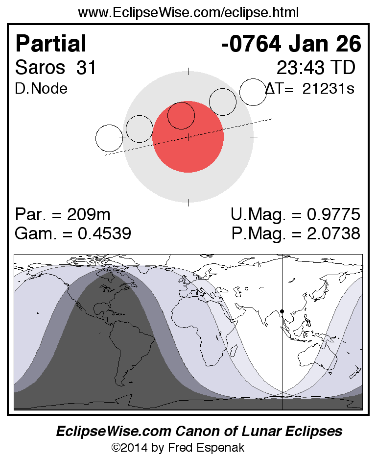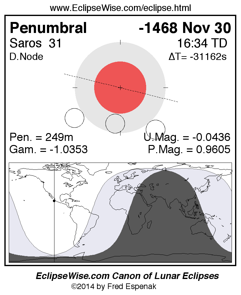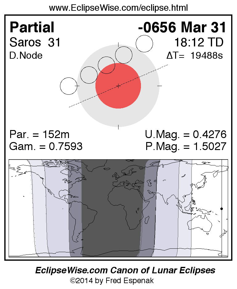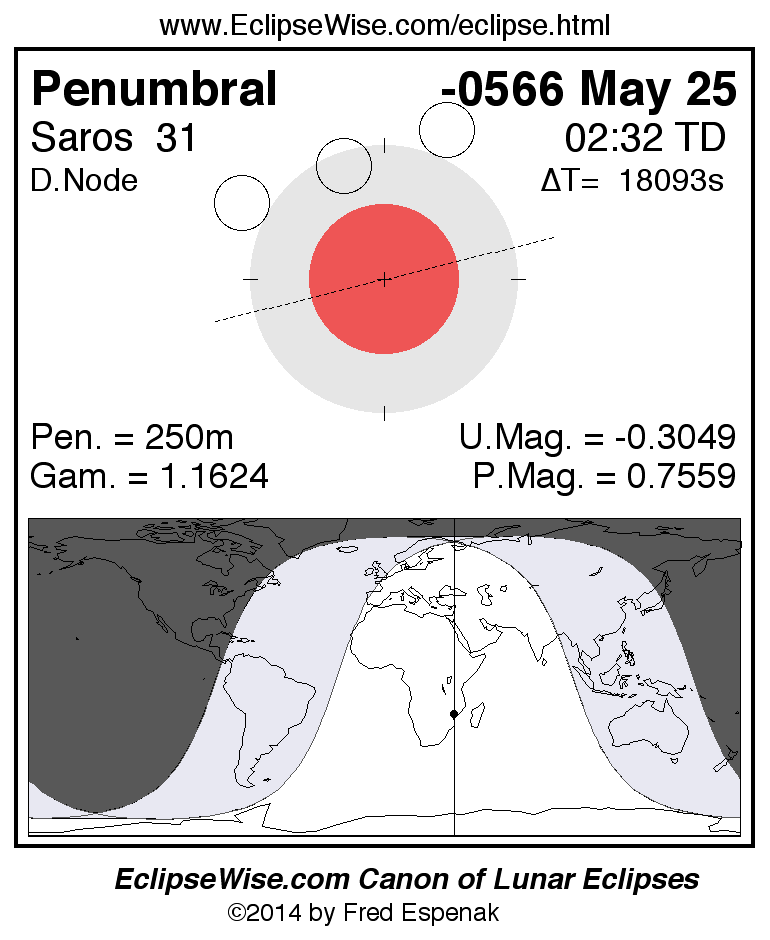A panorama of all lunar eclipses belonging to Saros 31 is presented here. Each figure shows the Moon's path with respect to Earth's penumbral and umbral shadows. Below the path is a map depicting the geographic region of visibility for the eclipse. The date and time are given for the instant of Greatest Eclipse. Every figure serves as a hyperlink to the EclipseWise Prime page for that eclipse with a larger figure and complete details for the eclipse. Visit the Key to Lunar Eclipse Figures for a detailed explanation of these diagrams. Near the bottom of this page are a series of hyperlinks for more on lunar eclipses.