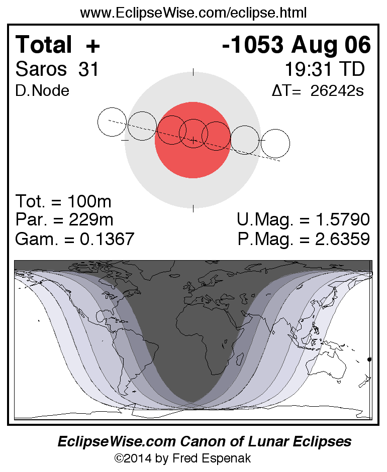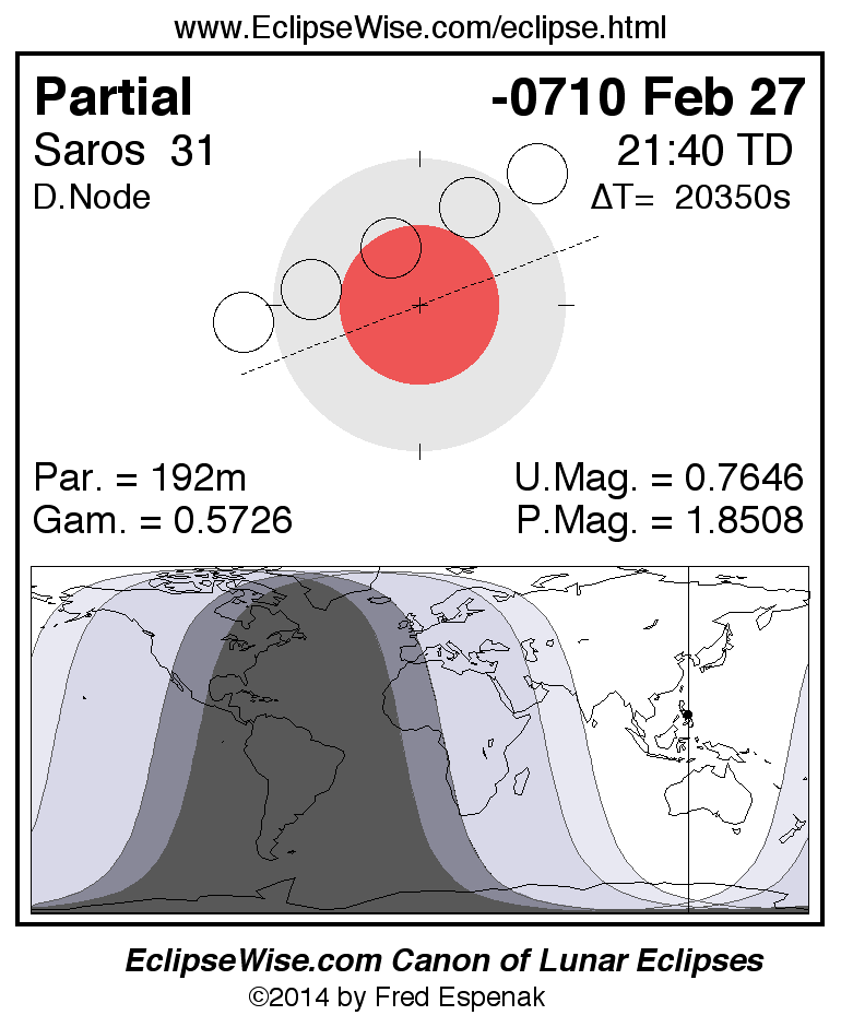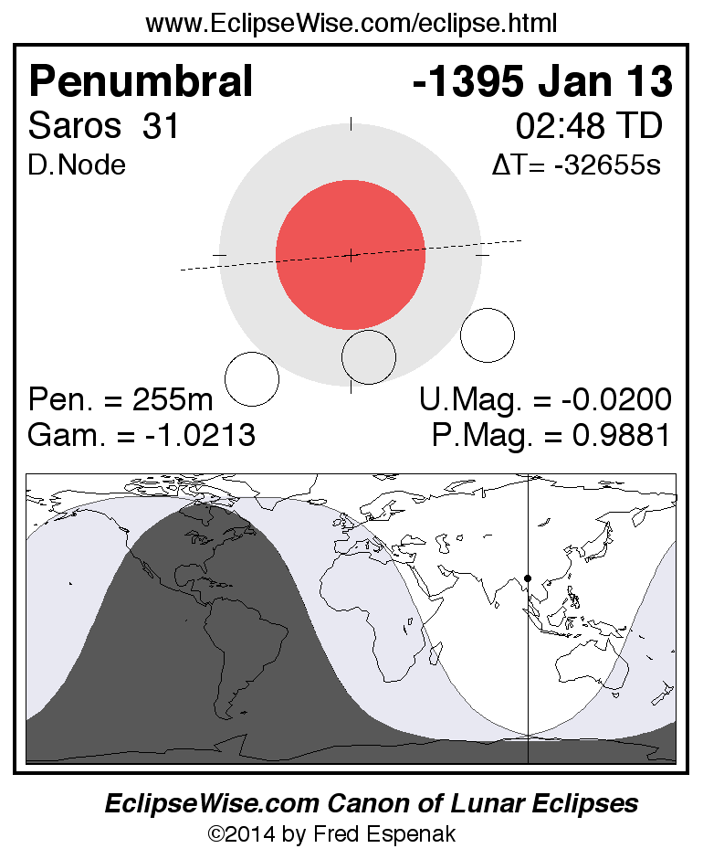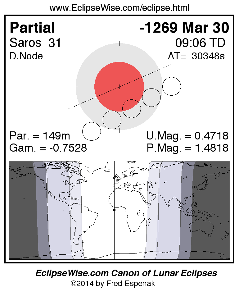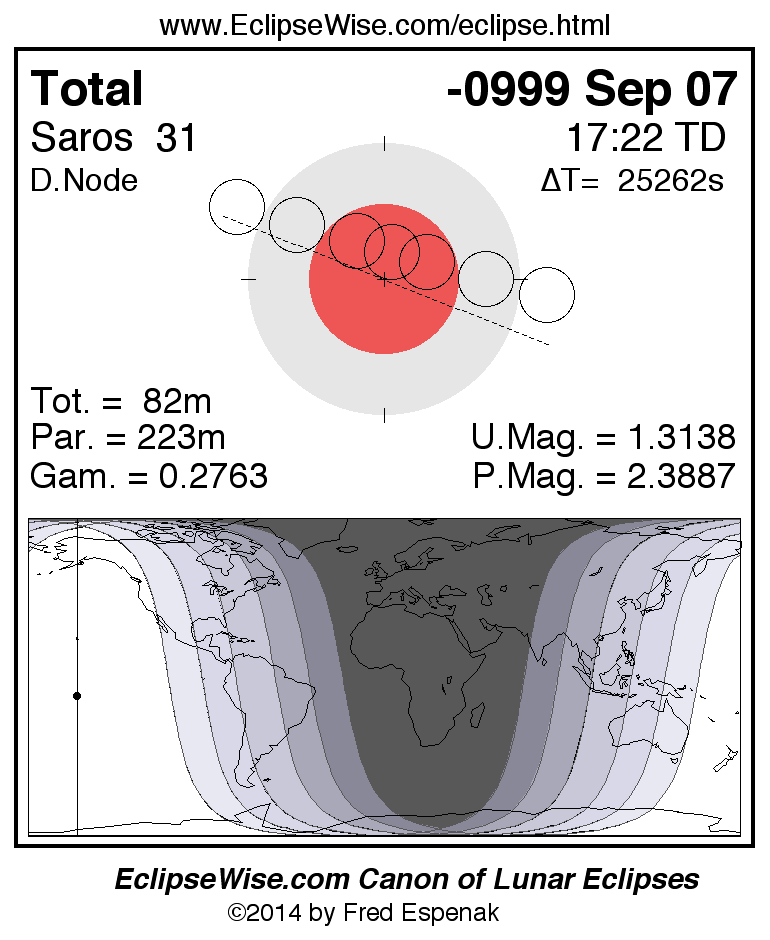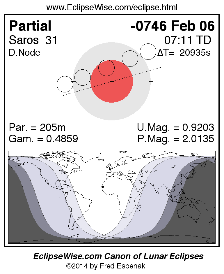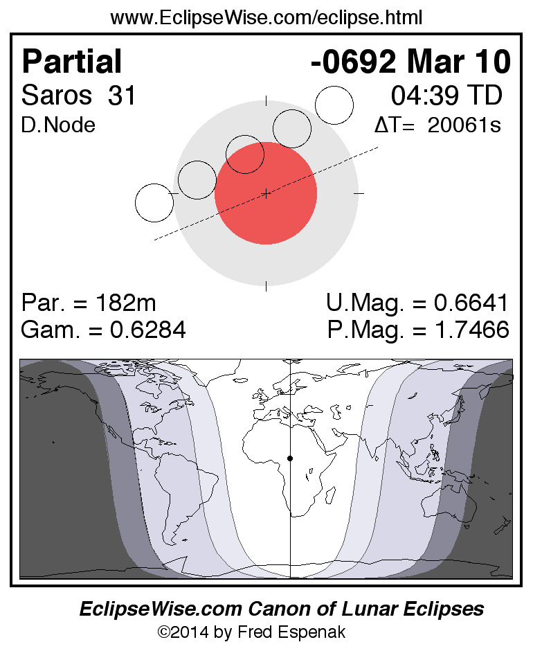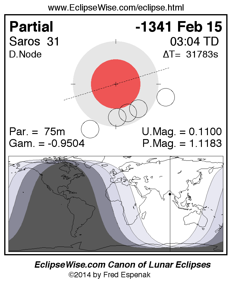 A panorama of all lunar eclipses belonging to Saros 31 is presented here. Each figure shows the Moon's path with respect to Earth's penumbral and umbral shadows. Below the path is a map depicting the geographic region of visibility for the eclipse. The date and time are given for the instant of Greatest Eclipse. Every figure serves as a hyperlink to the EclipseWise Prime page for that eclipse with a larger figure and complete details for the eclipse. Visit the Key to Lunar Eclipse Figures for a detailed explanation of these diagrams. Near the bottom of this page are a series of hyperlinks for more on lunar eclipses.