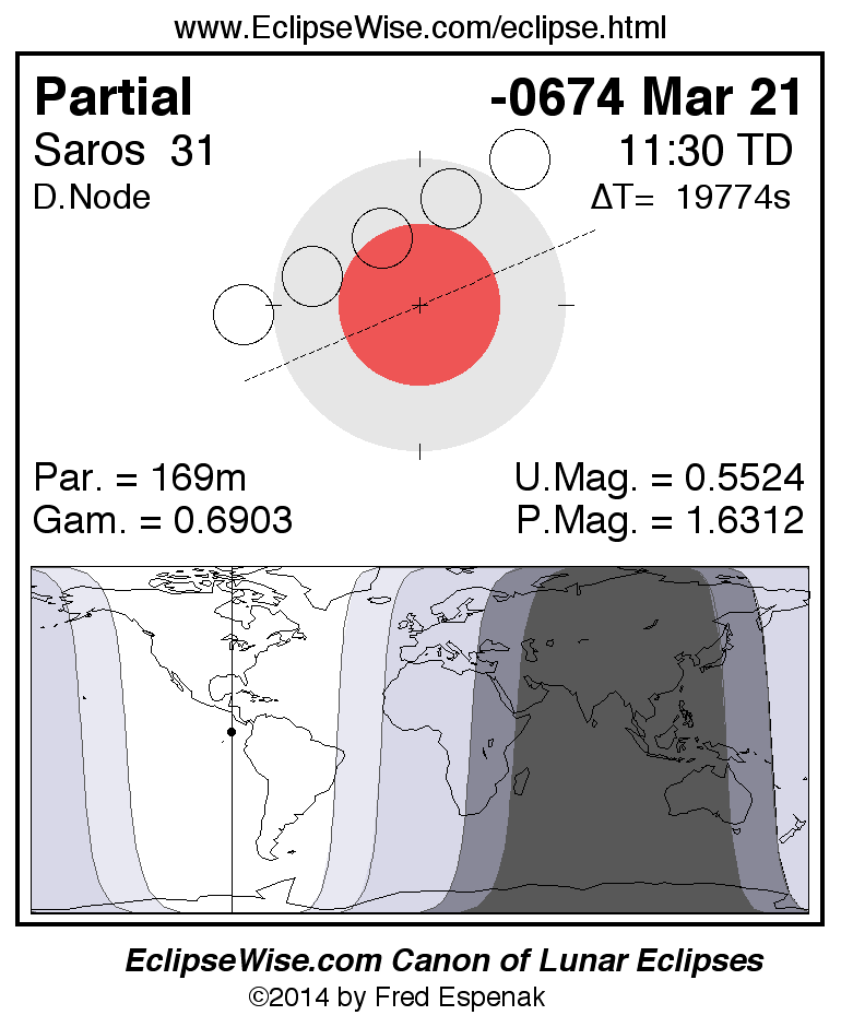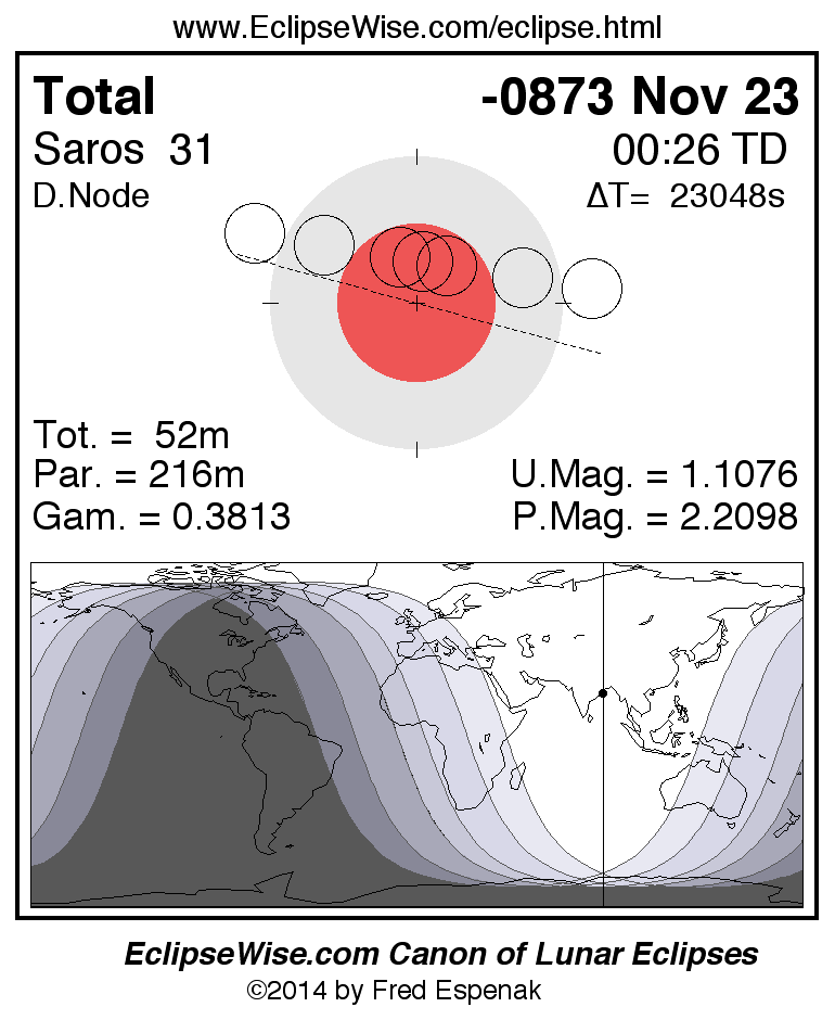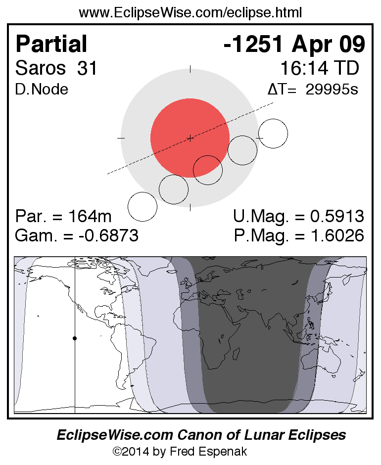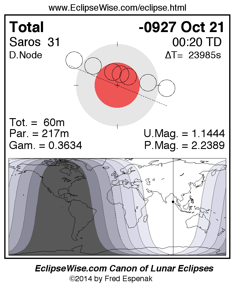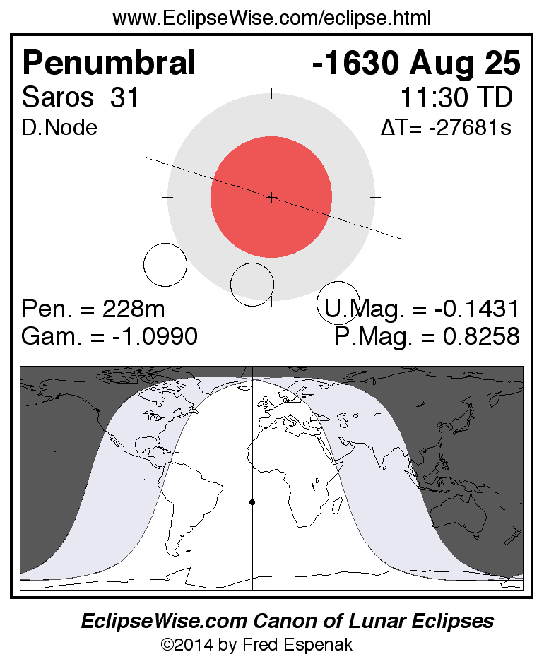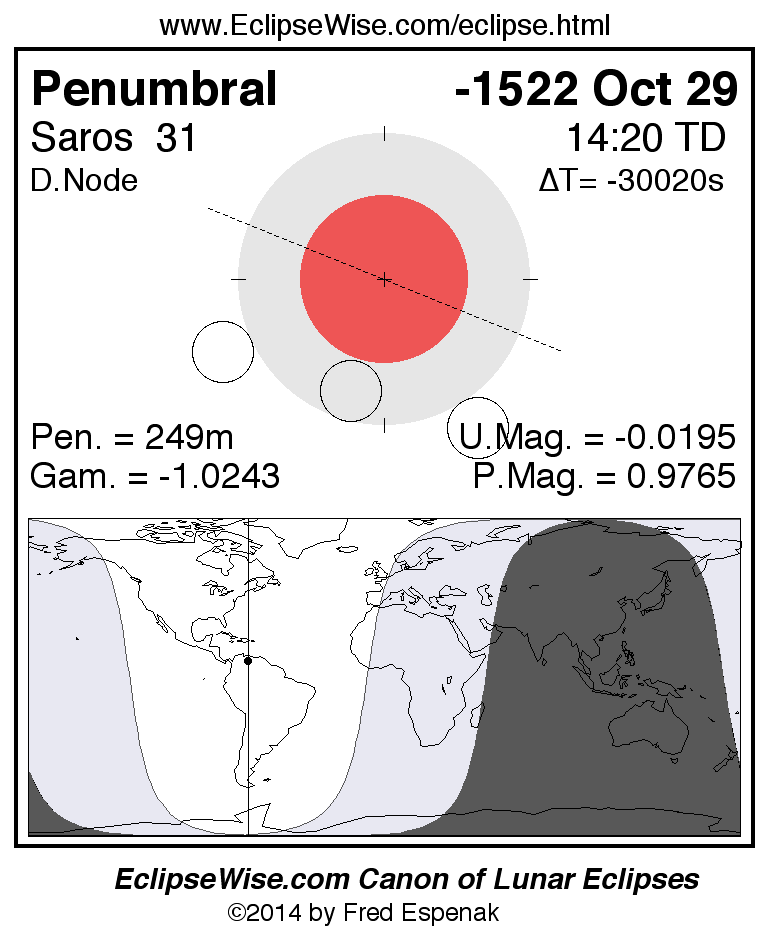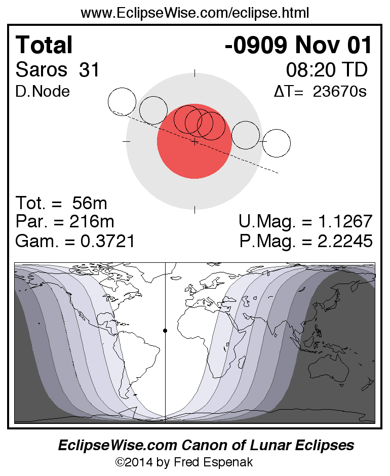 A panorama of all lunar eclipses belonging to Saros 31 is presented here. Each figure shows the Moon's path with respect to Earth's penumbral and umbral shadows. Below the path is a map depicting the geographic region of visibility for the eclipse. The date and time are given for the instant of Greatest Eclipse. Every figure serves as a hyperlink to the EclipseWise Prime page for that eclipse with a larger figure and complete details for the eclipse. Visit the Key to Lunar Eclipse Figures for a detailed explanation of these diagrams. Near the bottom of this page are a series of hyperlinks for more on lunar eclipses.