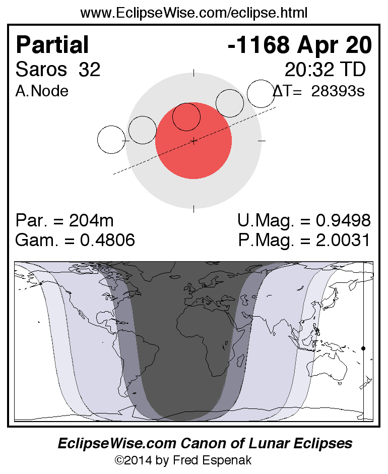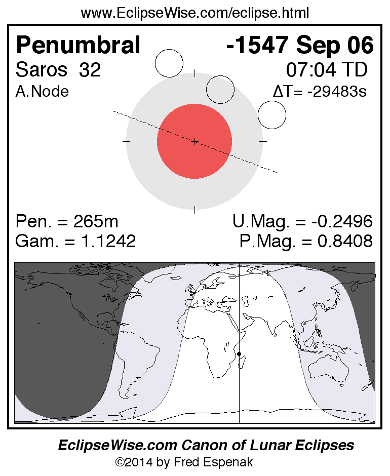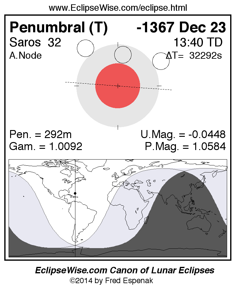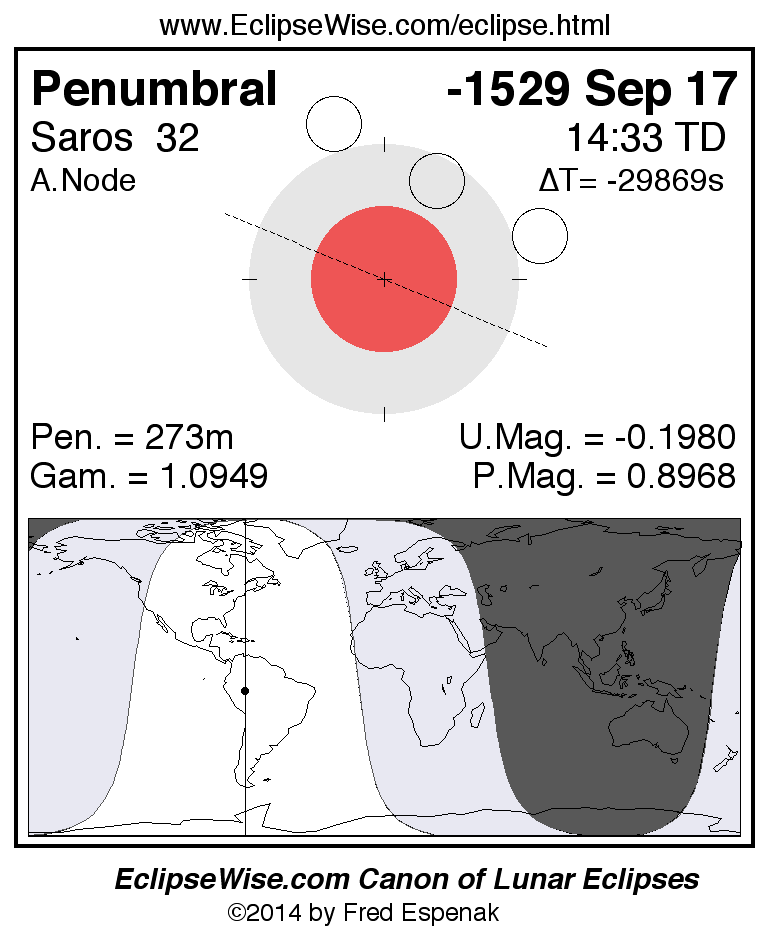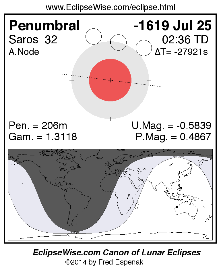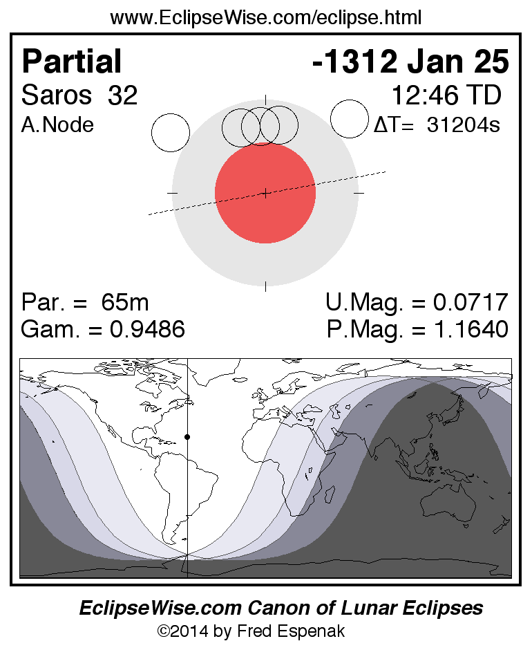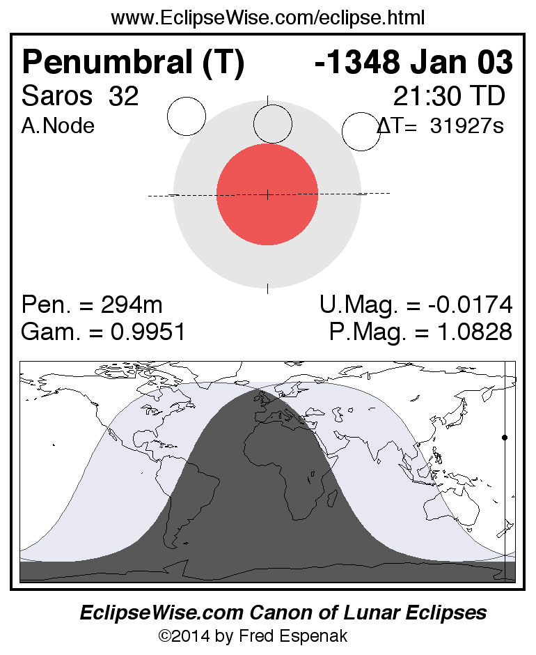A panorama of all lunar eclipses belonging to Saros 32 is presented here. Each figure shows the Moon's path with respect to Earth's penumbral and umbral shadows. Below the path is a map depicting the geographic region of visibility for the eclipse. The date and time are given for the instant of Greatest Eclipse. Every figure serves as a hyperlink to the EclipseWise Prime page for that eclipse with a larger figure and complete details for the eclipse. Visit the Key to Lunar Eclipse Figures for a detailed explanation of these diagrams. Near the bottom of this page are a series of hyperlinks for more on lunar eclipses.