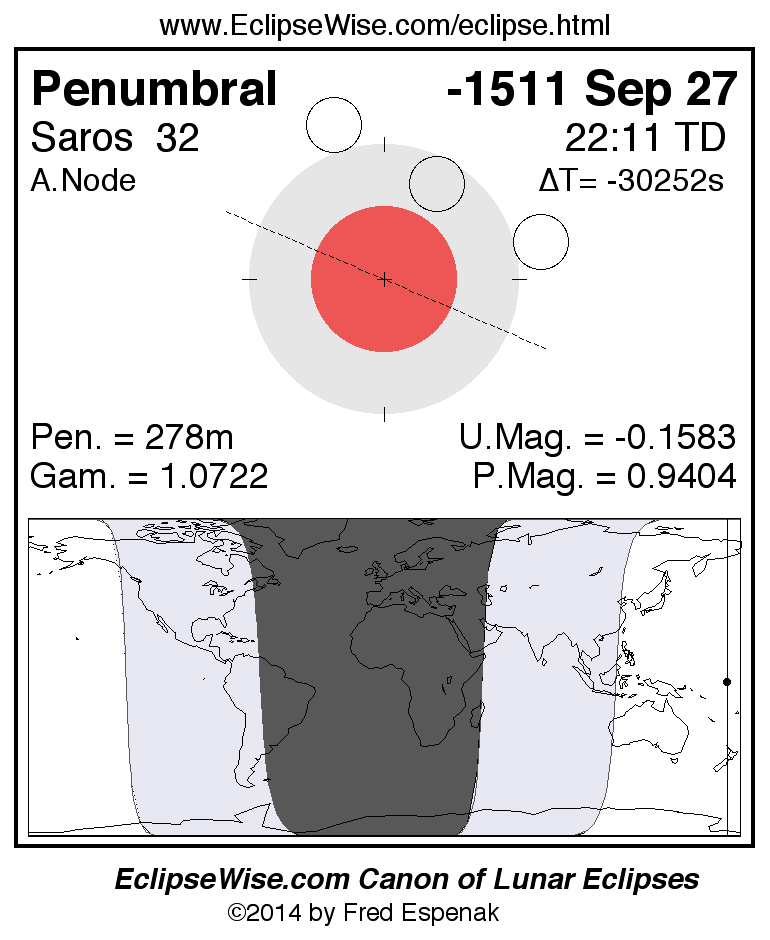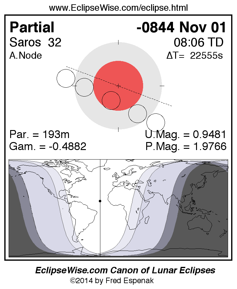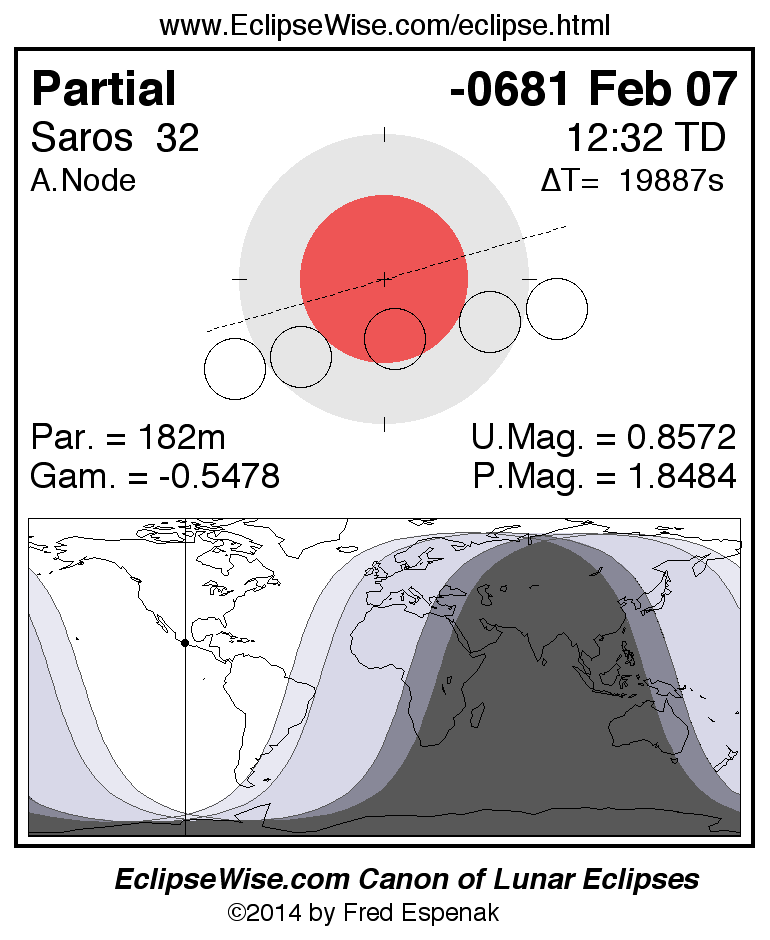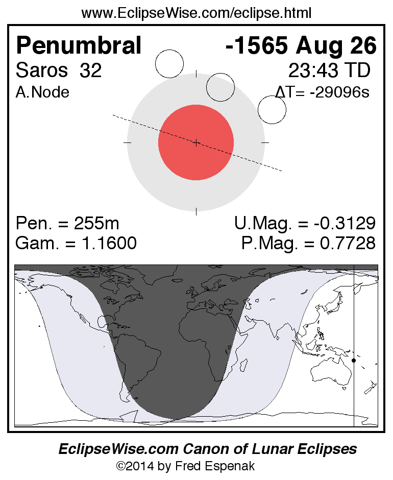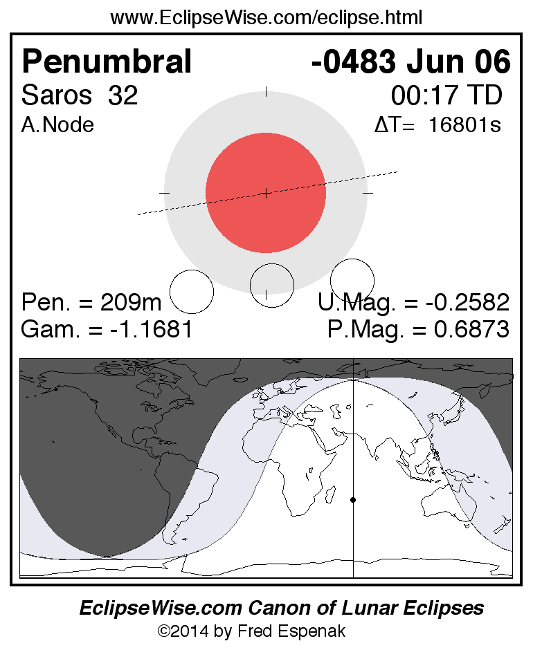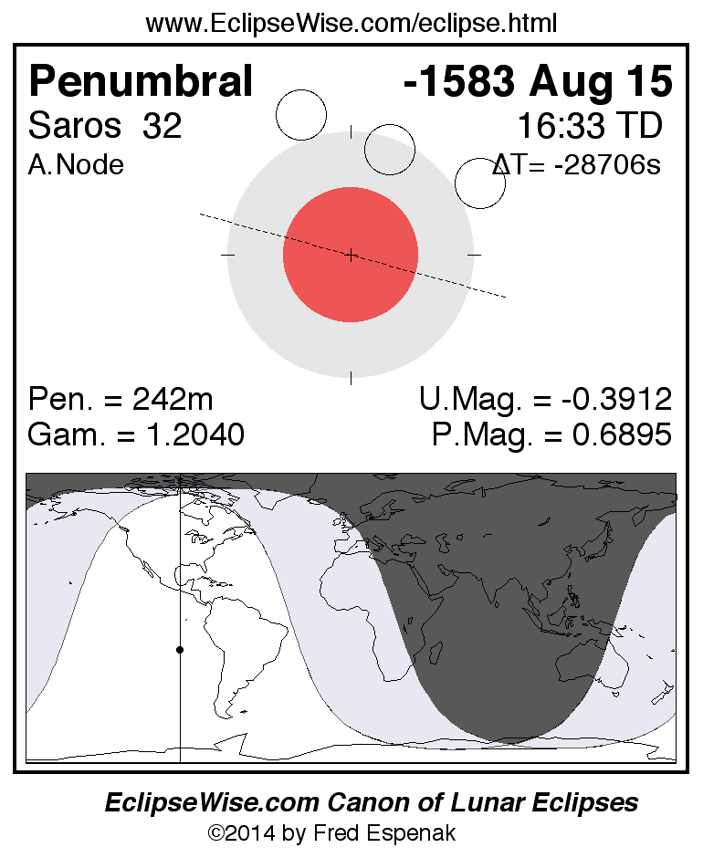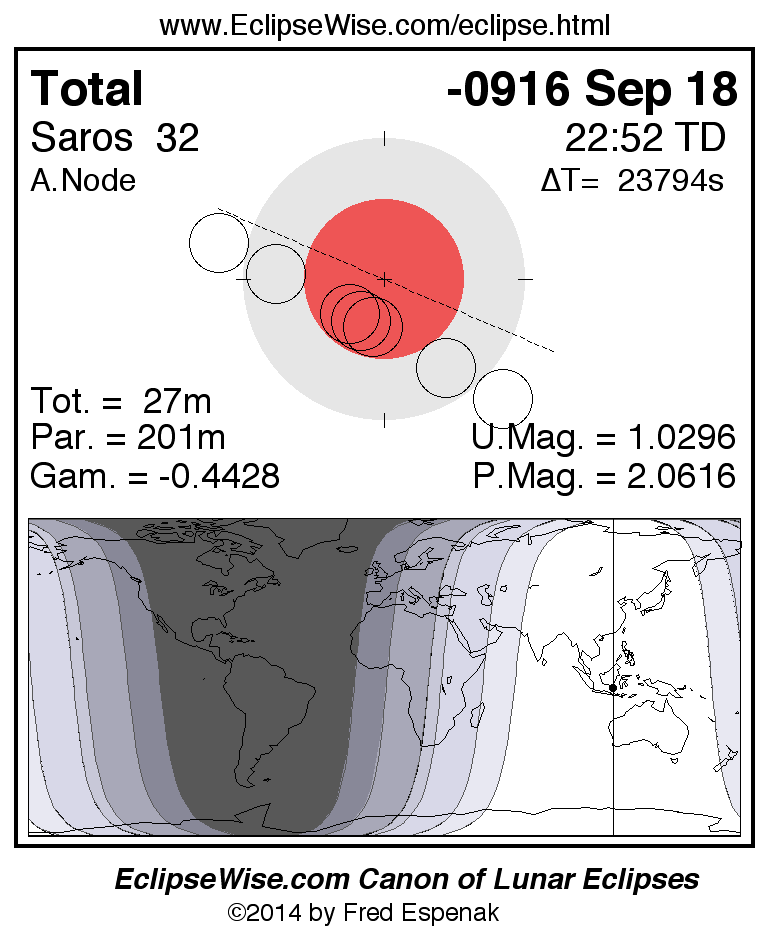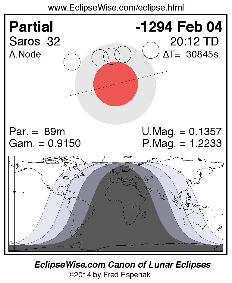 A panorama of all lunar eclipses belonging to Saros 32 is presented here. Each figure shows the Moon's path with respect to Earth's penumbral and umbral shadows. Below the path is a map depicting the geographic region of visibility for the eclipse. The date and time are given for the instant of Greatest Eclipse. Every figure serves as a hyperlink to the EclipseWise Prime page for that eclipse with a larger figure and complete details for the eclipse. Visit the Key to Lunar Eclipse Figures for a detailed explanation of these diagrams. Near the bottom of this page are a series of hyperlinks for more on lunar eclipses.