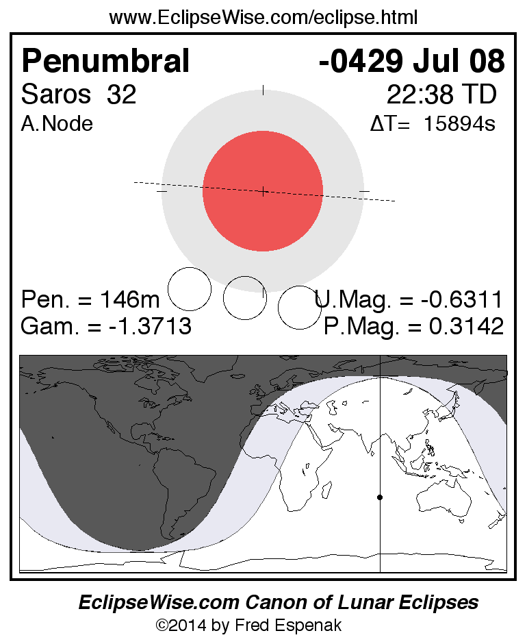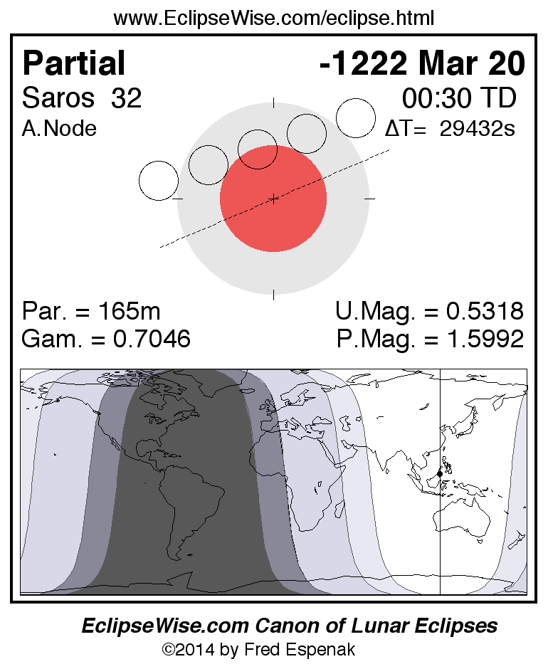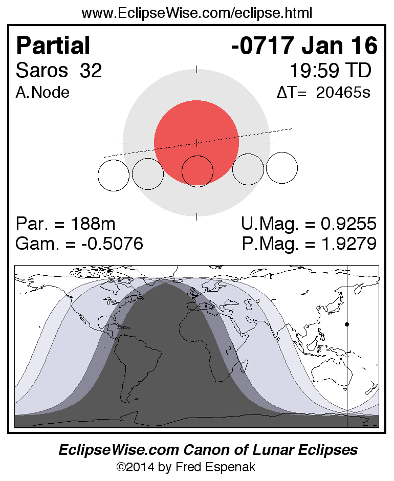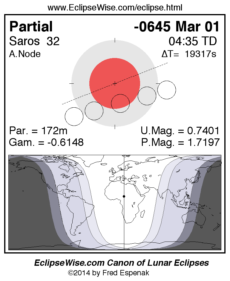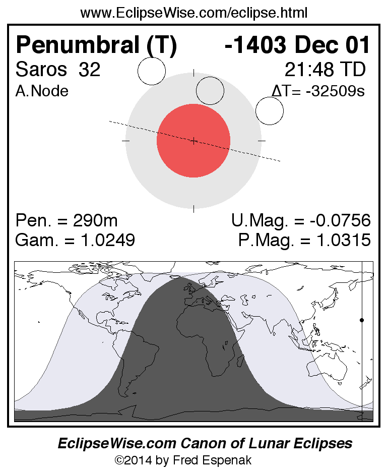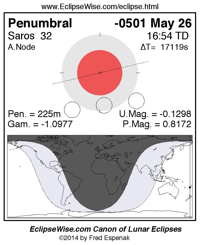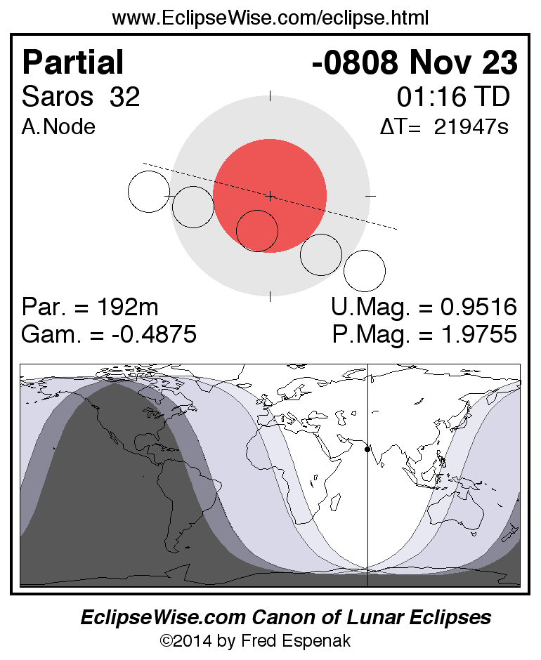 A panorama of all lunar eclipses belonging to Saros 32 is presented here. Each figure shows the Moon's path with respect to Earth's penumbral and umbral shadows. Below the path is a map depicting the geographic region of visibility for the eclipse. The date and time are given for the instant of Greatest Eclipse. Every figure serves as a hyperlink to the EclipseWise Prime page for that eclipse with a larger figure and complete details for the eclipse. Visit the Key to Lunar Eclipse Figures for a detailed explanation of these diagrams. Near the bottom of this page are a series of hyperlinks for more on lunar eclipses.