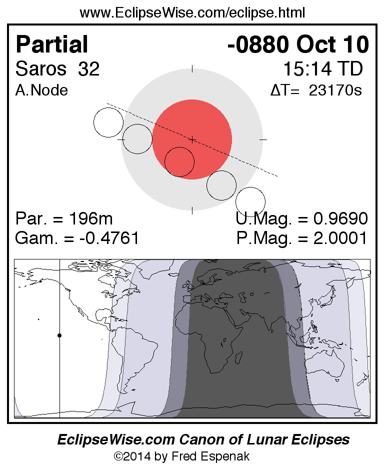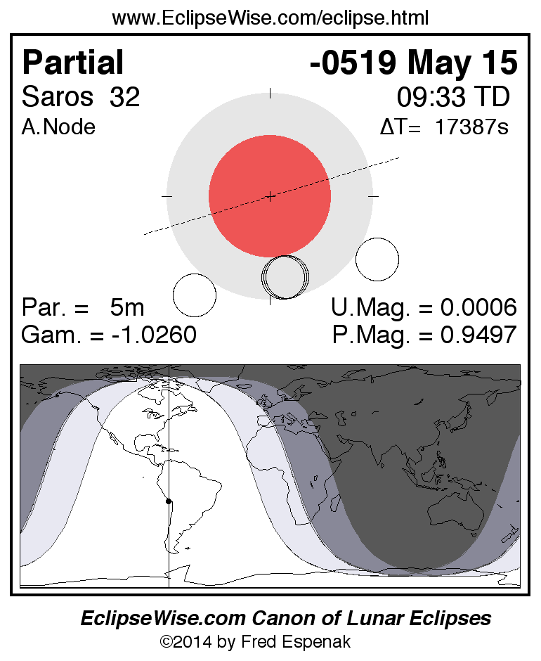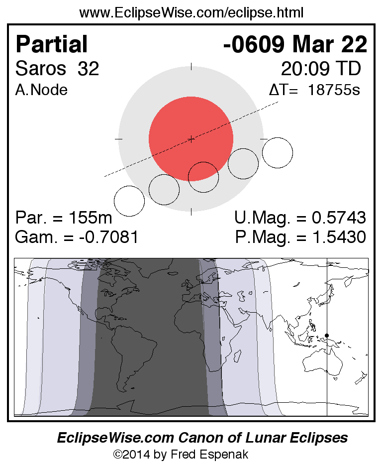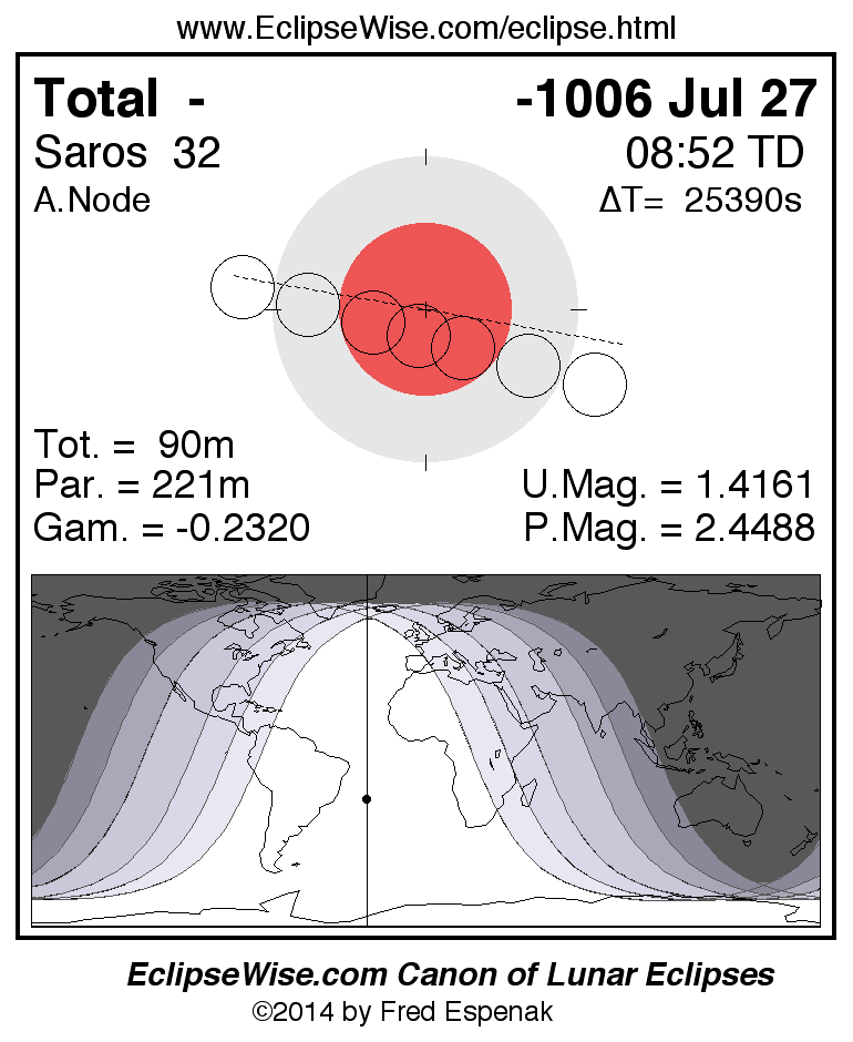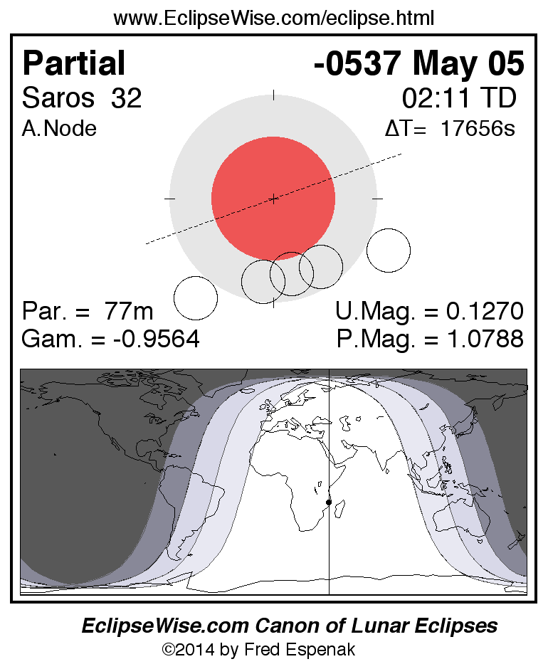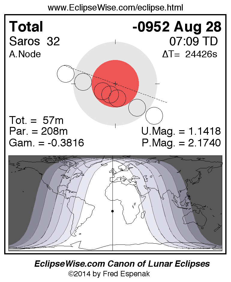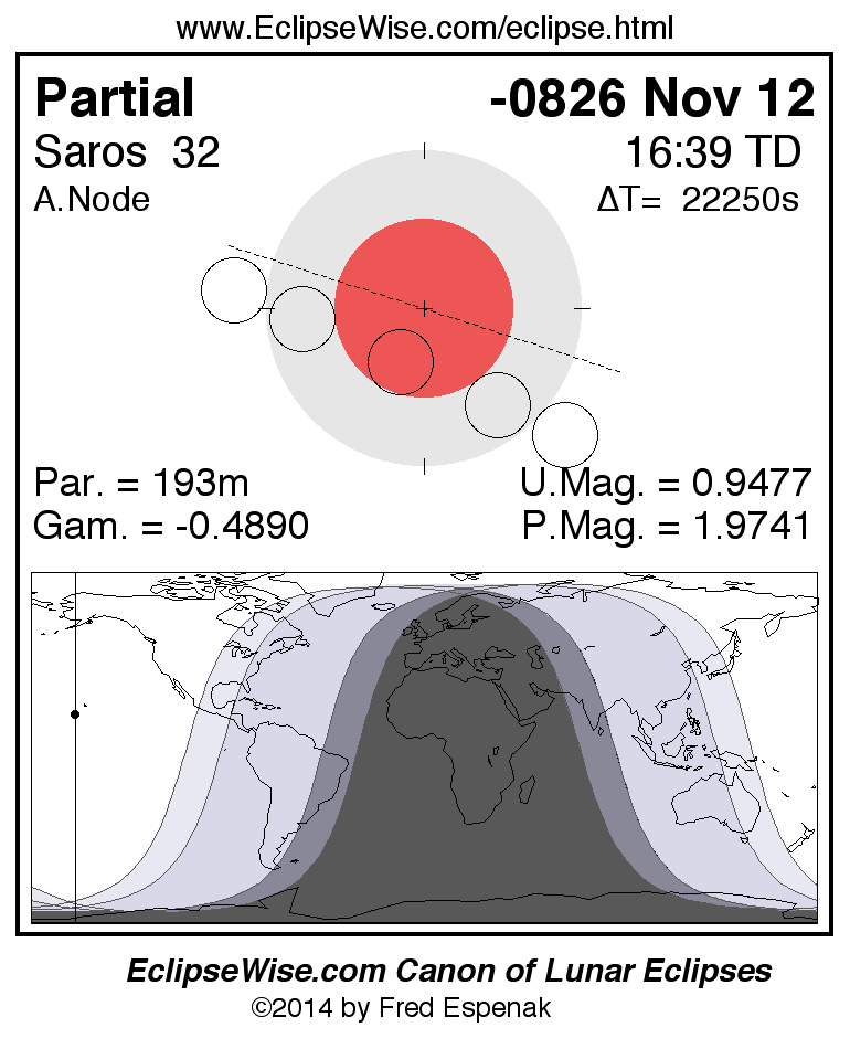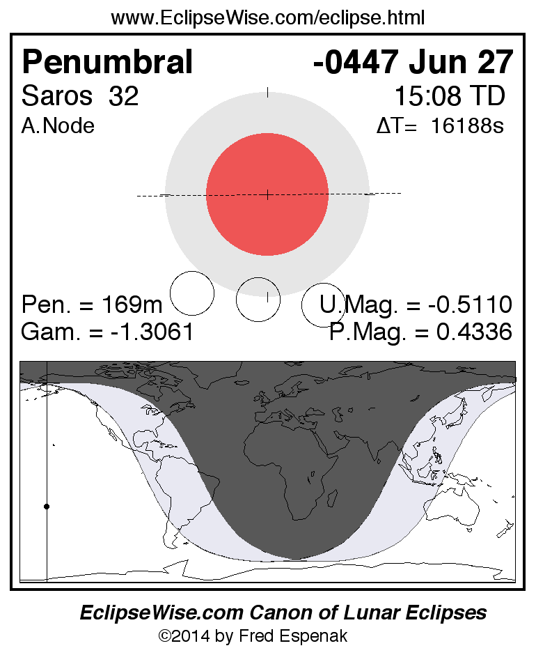 A panorama of all lunar eclipses belonging to Saros 32 is presented here. Each figure shows the Moon's path with respect to Earth's penumbral and umbral shadows. Below the path is a map depicting the geographic region of visibility for the eclipse. The date and time are given for the instant of Greatest Eclipse. Every figure serves as a hyperlink to the EclipseWise Prime page for that eclipse with a larger figure and complete details for the eclipse. Visit the Key to Lunar Eclipse Figures for a detailed explanation of these diagrams. Near the bottom of this page are a series of hyperlinks for more on lunar eclipses.