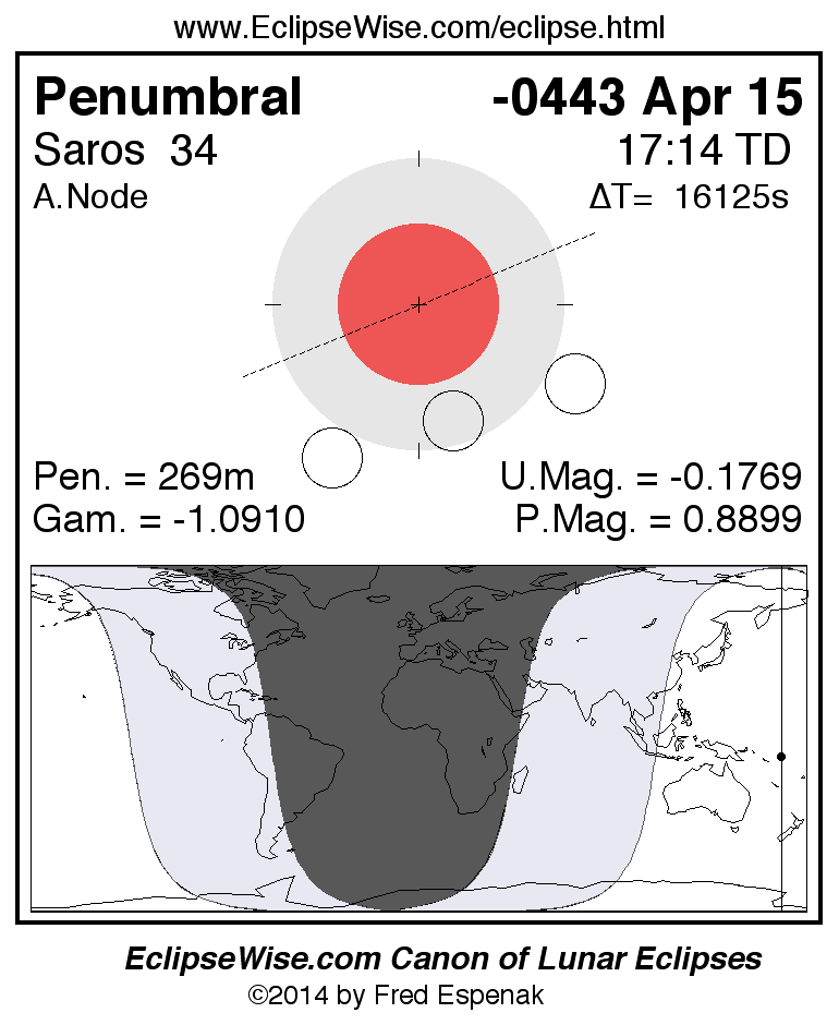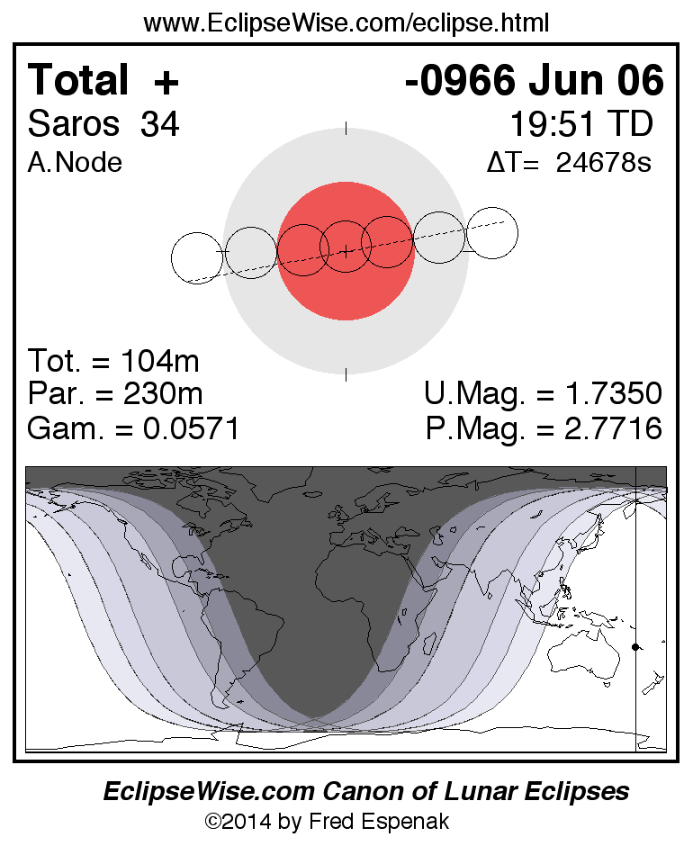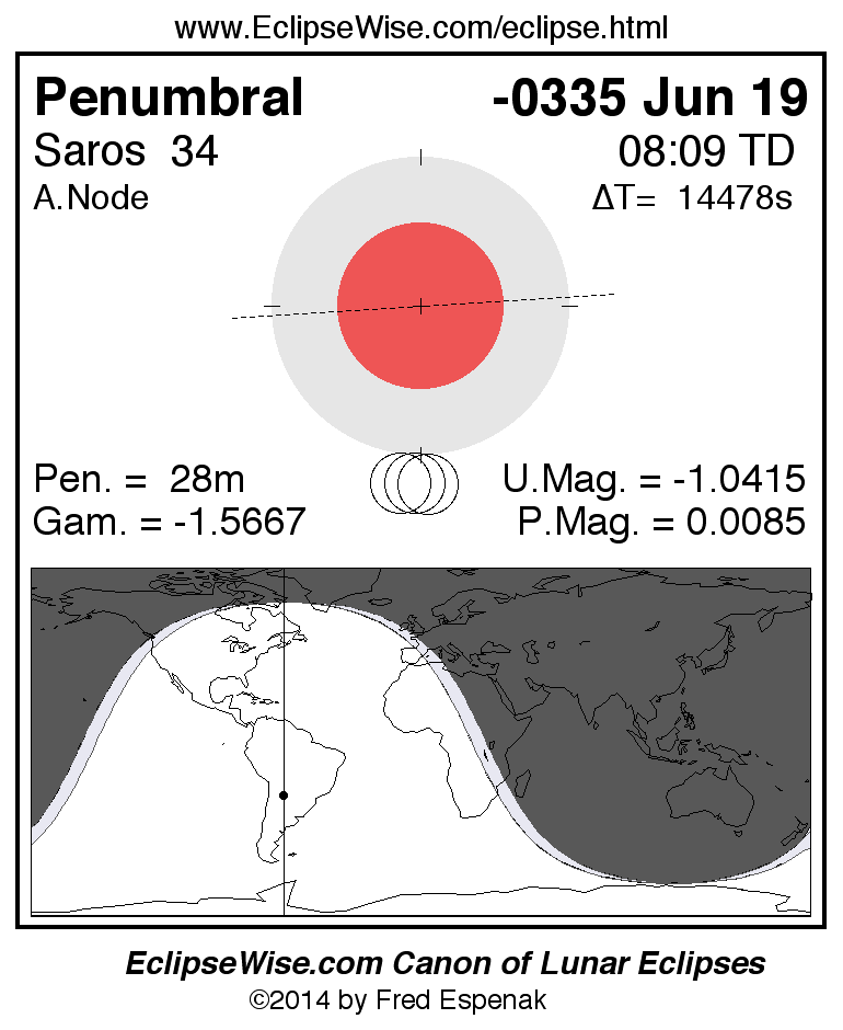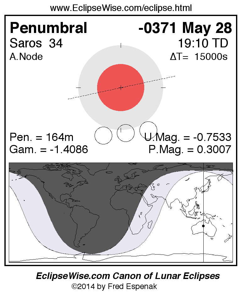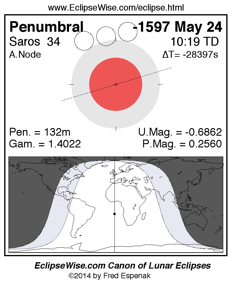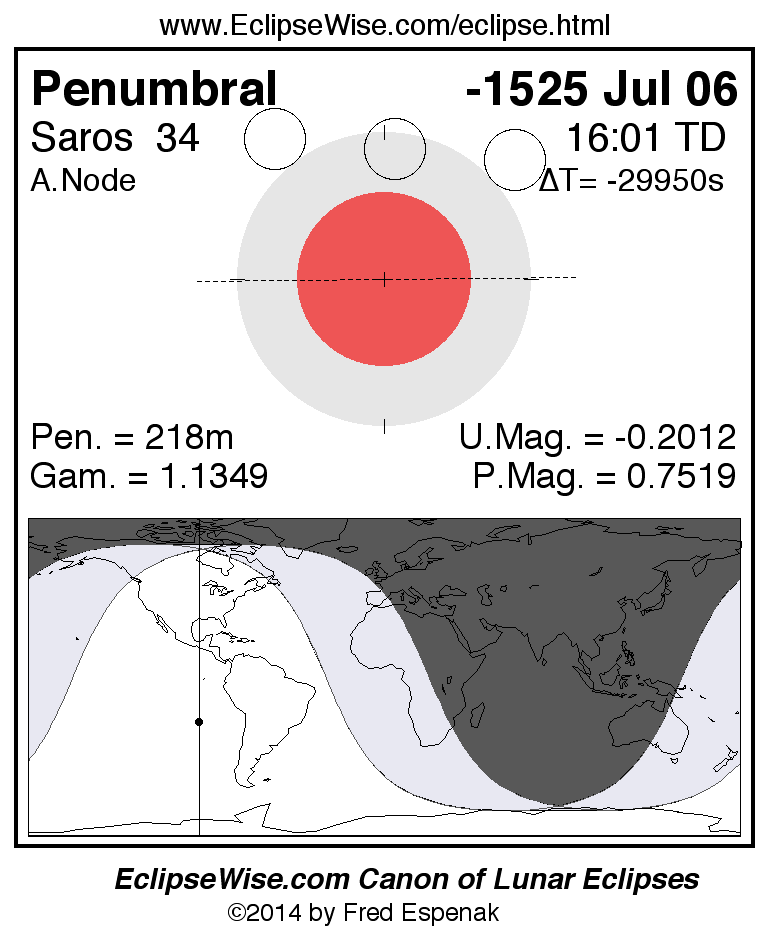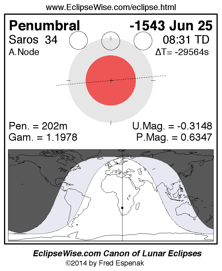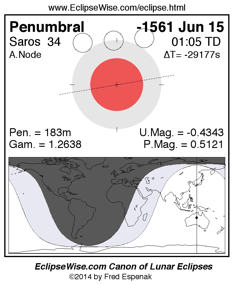 A panorama of all lunar eclipses belonging to Saros 34 is presented here. Each figure shows the Moon's path with respect to Earth's penumbral and umbral shadows. Below the path is a map depicting the geographic region of visibility for the eclipse. The date and time are given for the instant of Greatest Eclipse. Every figure serves as a hyperlink to the EclipseWise Prime page for that eclipse with a larger figure and complete details for the eclipse. Visit the Key to Lunar Eclipse Figures for a detailed explanation of these diagrams. Near the bottom of this page are a series of hyperlinks for more on lunar eclipses.