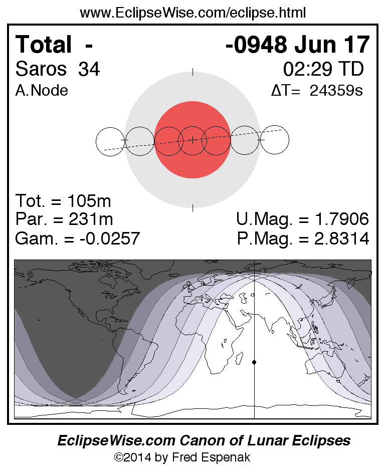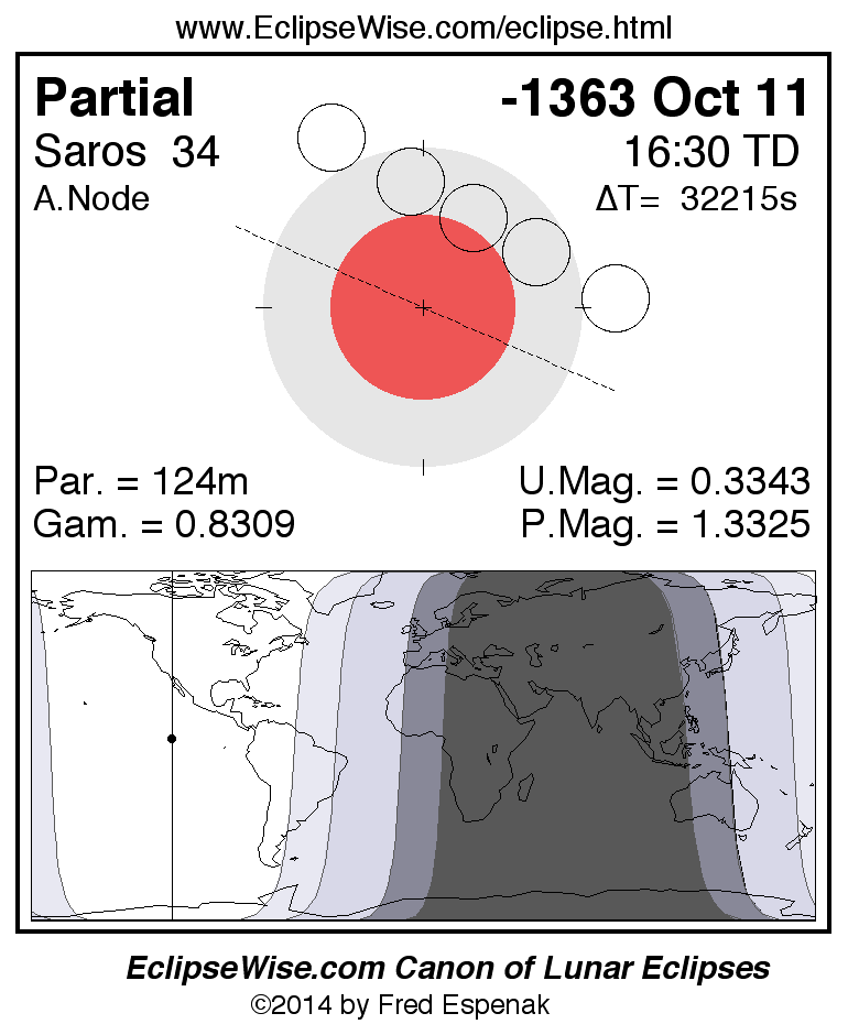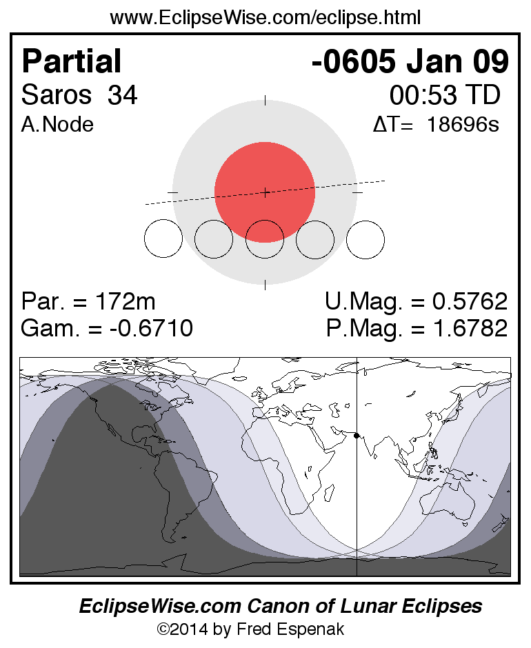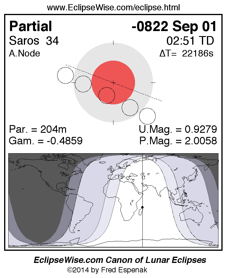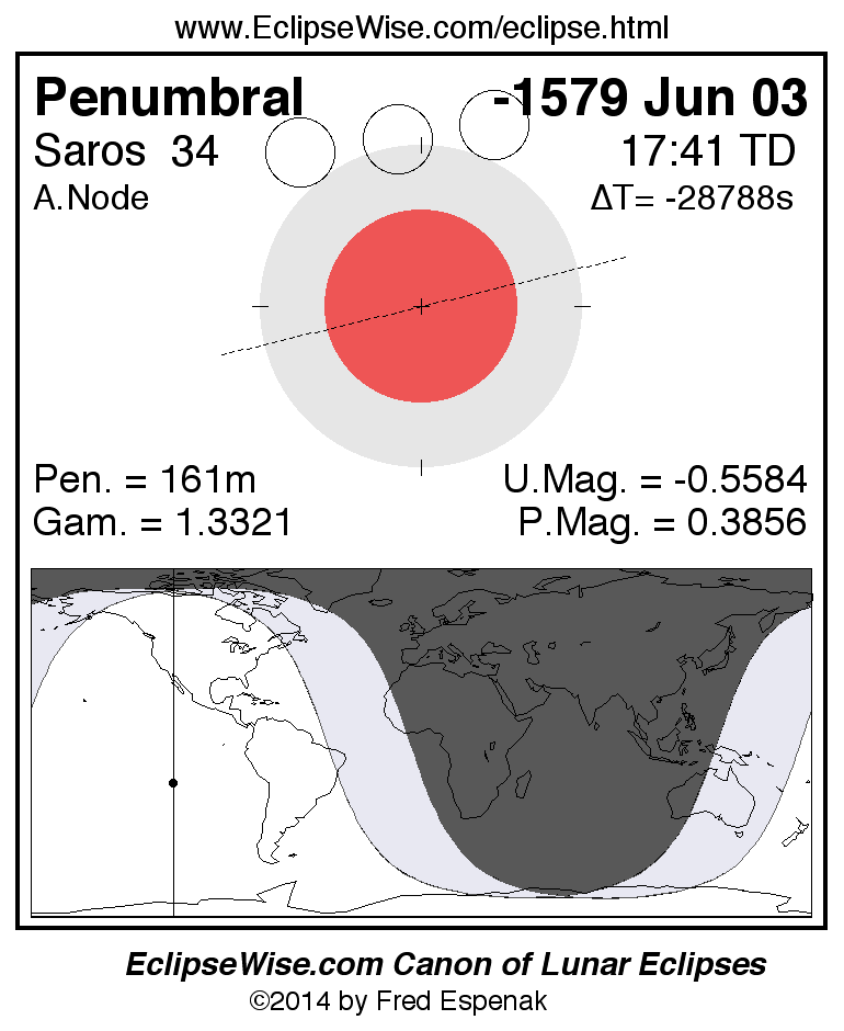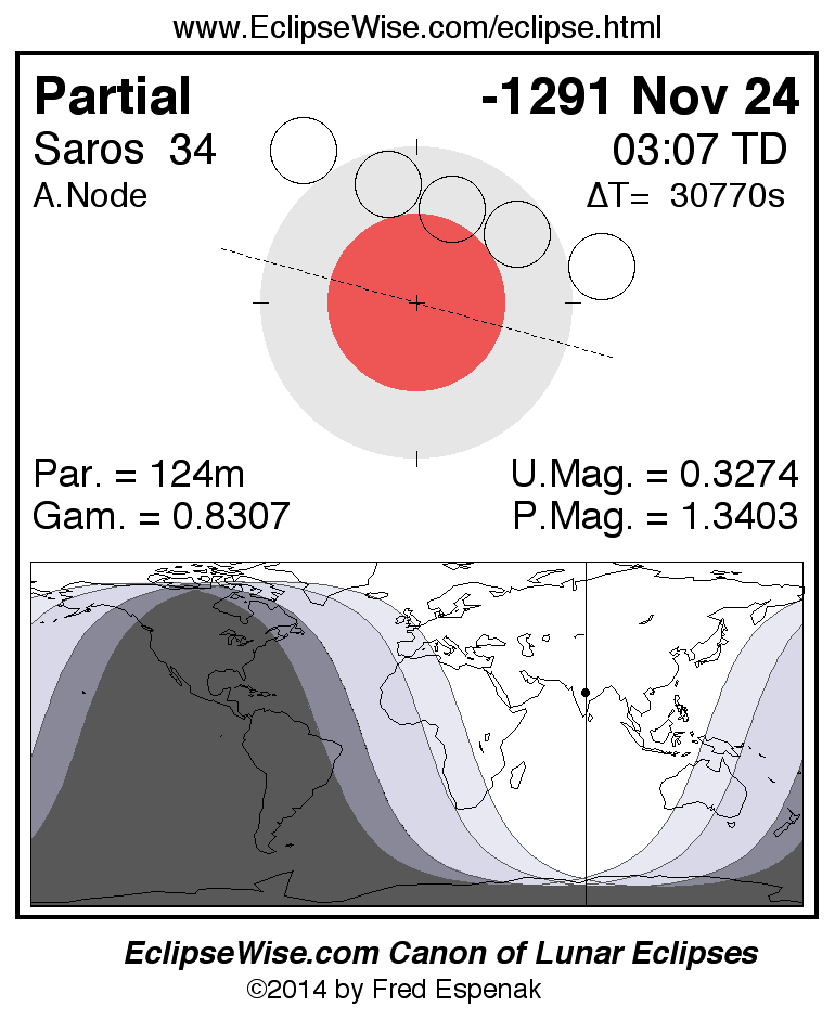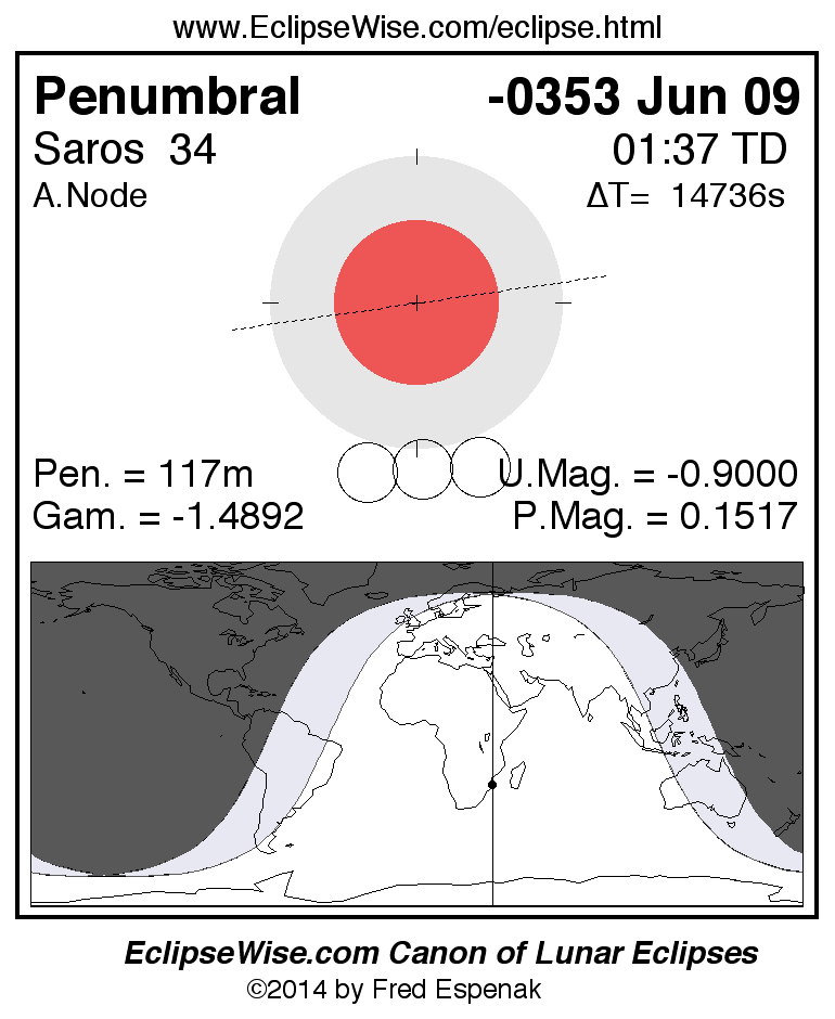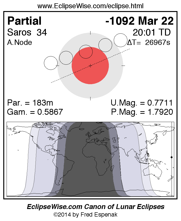 A panorama of all lunar eclipses belonging to Saros 34 is presented here. Each figure shows the Moon's path with respect to Earth's penumbral and umbral shadows. Below the path is a map depicting the geographic region of visibility for the eclipse. The date and time are given for the instant of Greatest Eclipse. Every figure serves as a hyperlink to the EclipseWise Prime page for that eclipse with a larger figure and complete details for the eclipse. Visit the Key to Lunar Eclipse Figures for a detailed explanation of these diagrams. Near the bottom of this page are a series of hyperlinks for more on lunar eclipses.