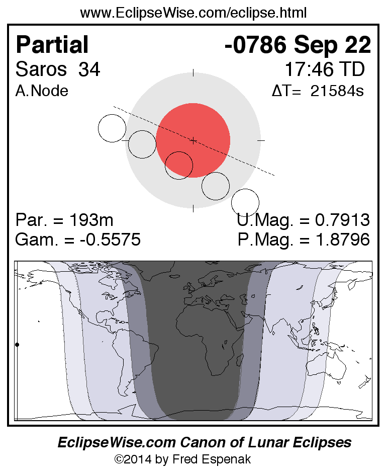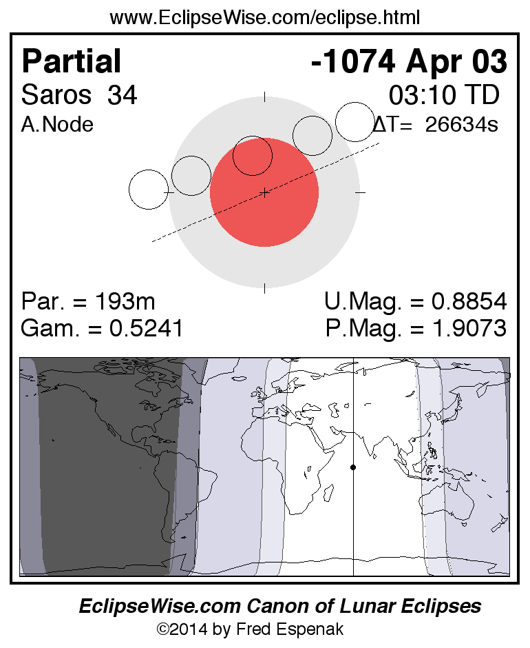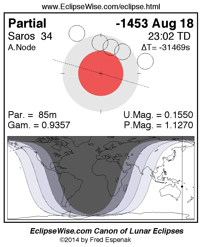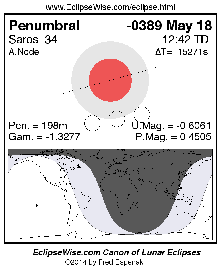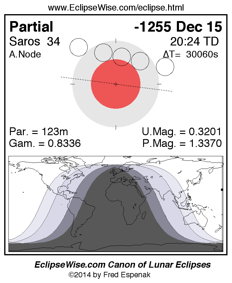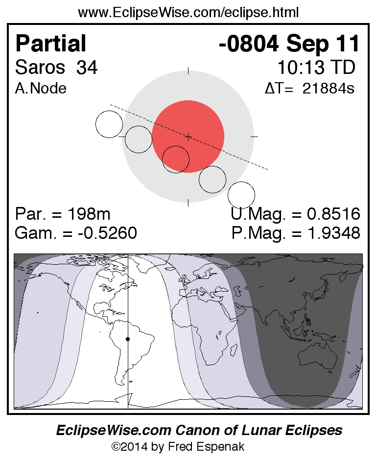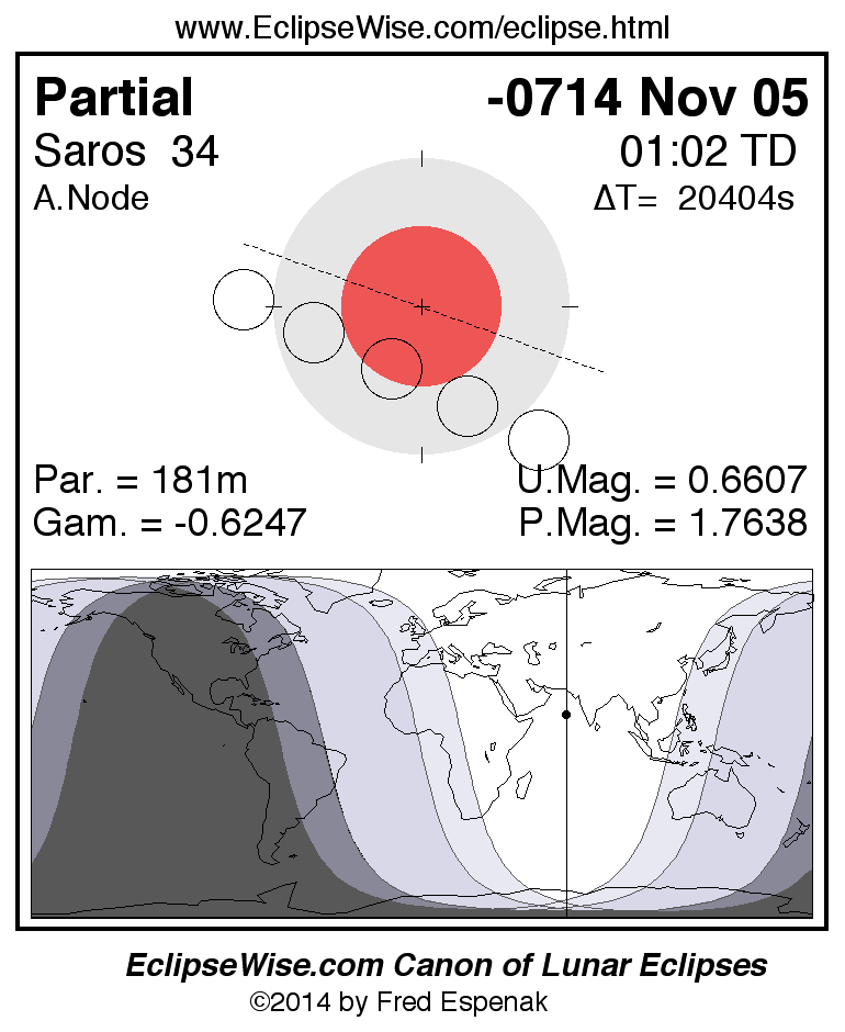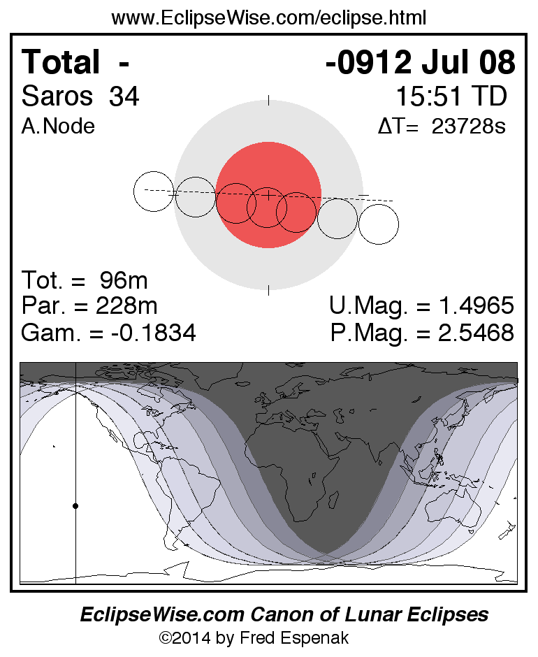 A panorama of all lunar eclipses belonging to Saros 34 is presented here. Each figure shows the Moon's path with respect to Earth's penumbral and umbral shadows. Below the path is a map depicting the geographic region of visibility for the eclipse. The date and time are given for the instant of Greatest Eclipse. Every figure serves as a hyperlink to the EclipseWise Prime page for that eclipse with a larger figure and complete details for the eclipse. Visit the Key to Lunar Eclipse Figures for a detailed explanation of these diagrams. Near the bottom of this page are a series of hyperlinks for more on lunar eclipses.