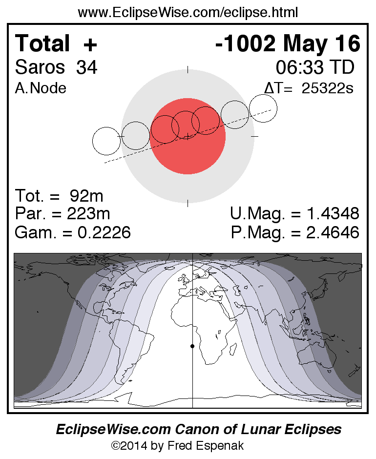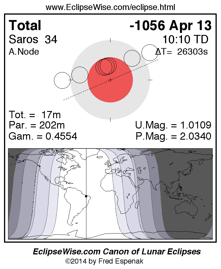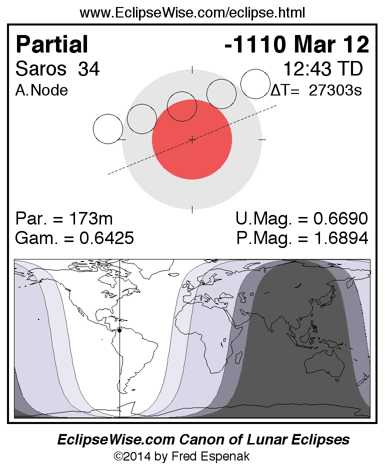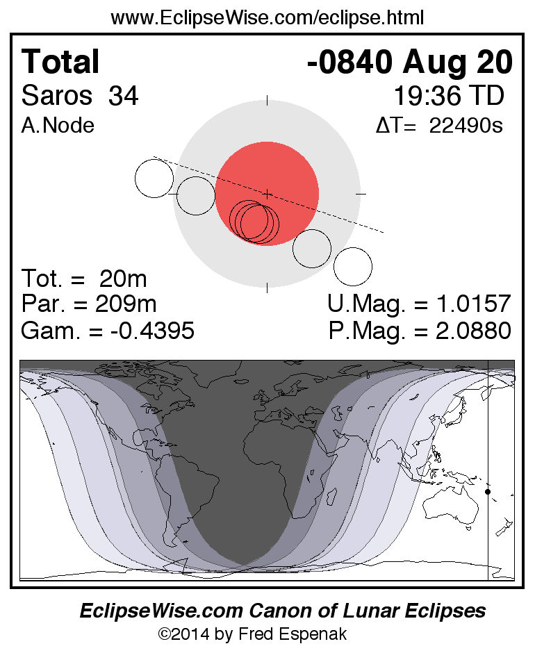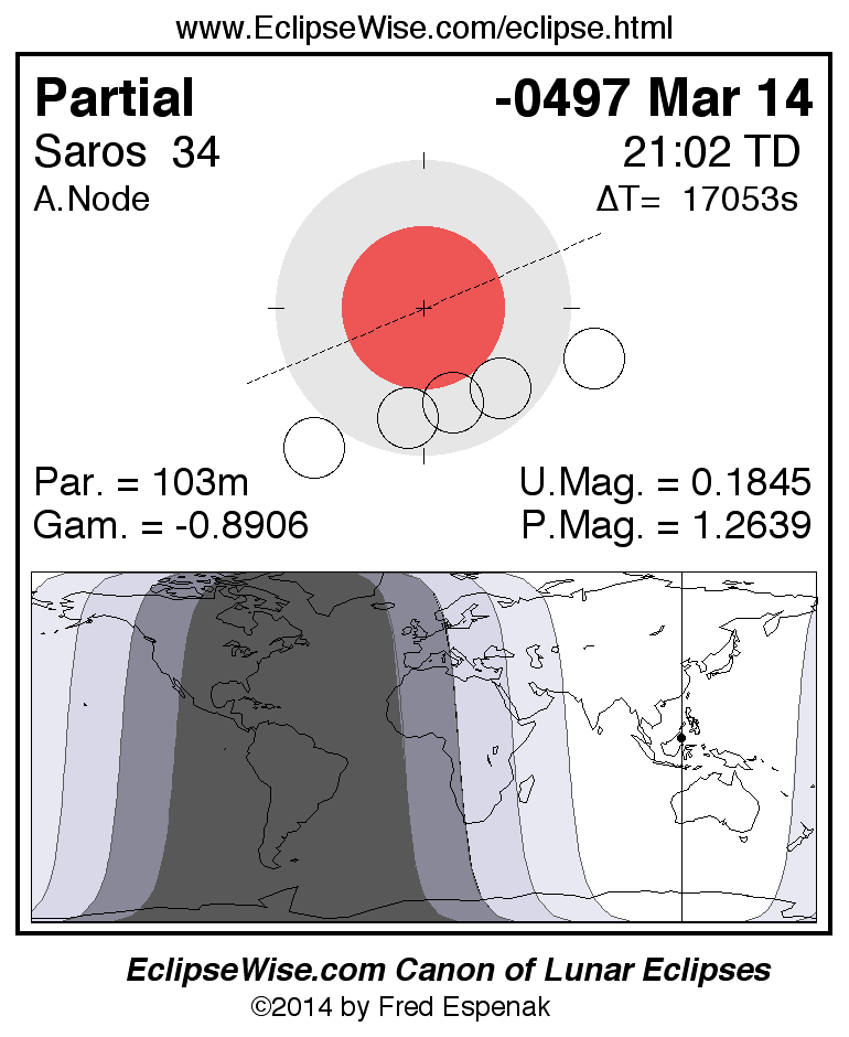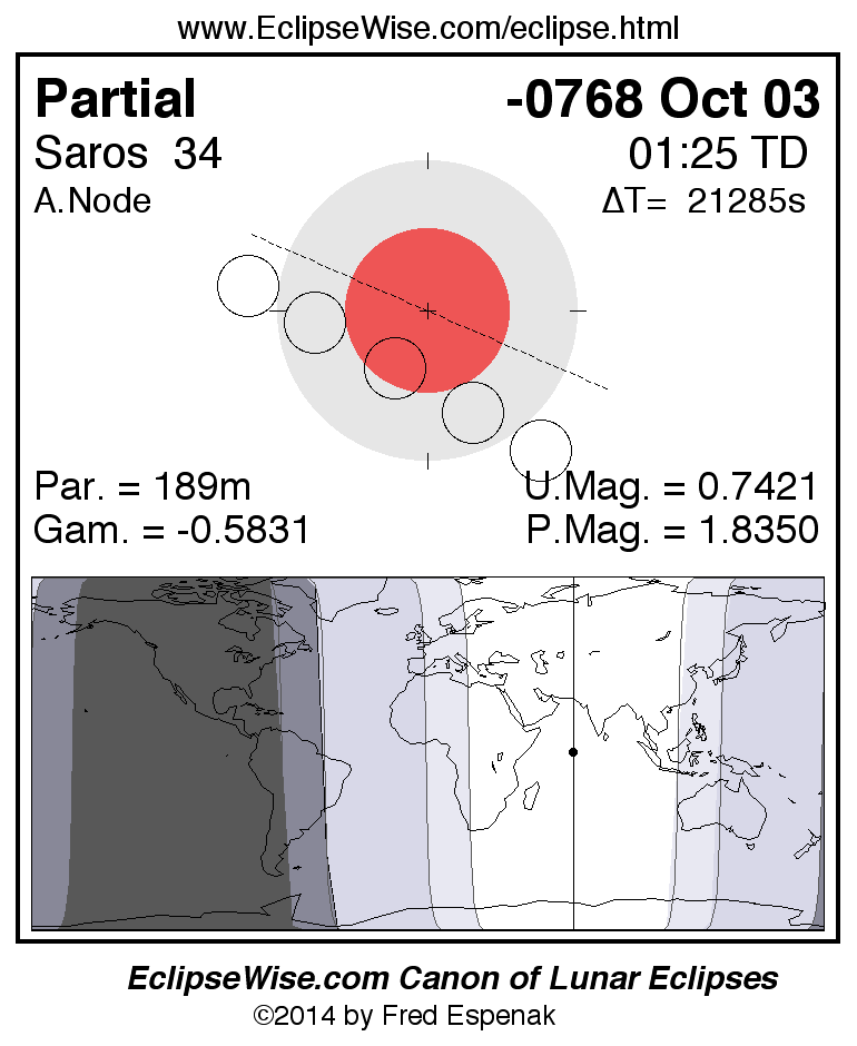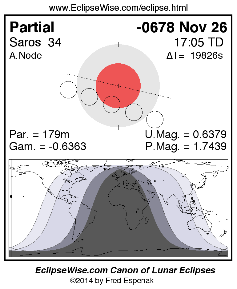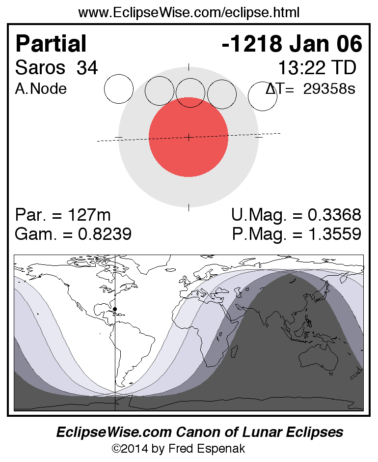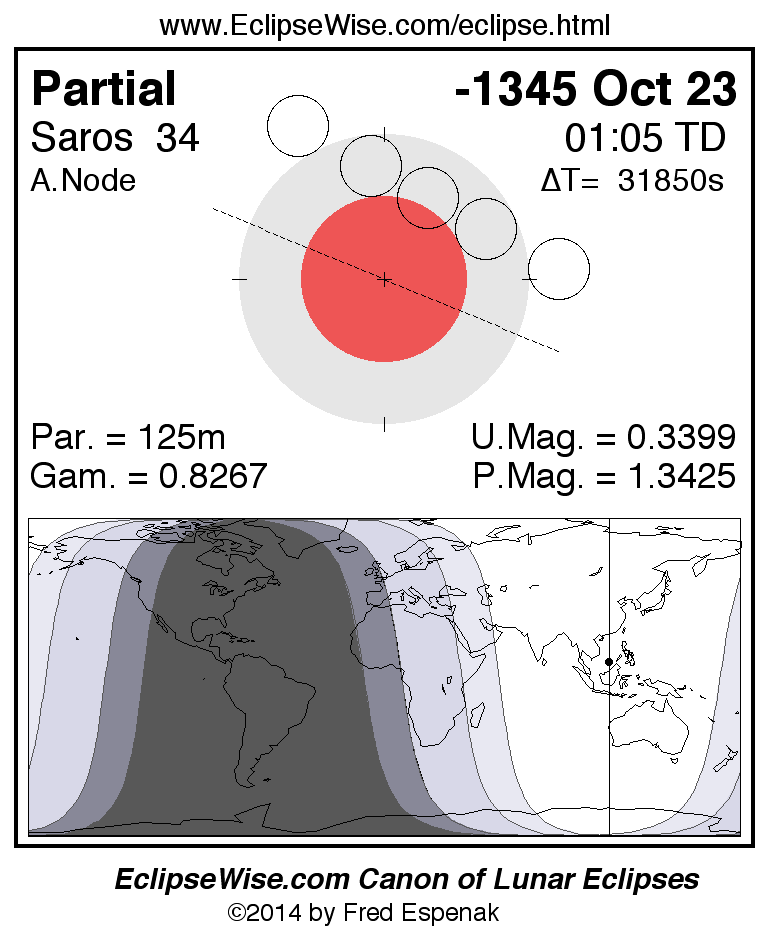 A panorama of all lunar eclipses belonging to Saros 34 is presented here. Each figure shows the Moon's path with respect to Earth's penumbral and umbral shadows. Below the path is a map depicting the geographic region of visibility for the eclipse. The date and time are given for the instant of Greatest Eclipse. Every figure serves as a hyperlink to the EclipseWise Prime page for that eclipse with a larger figure and complete details for the eclipse. Visit the Key to Lunar Eclipse Figures for a detailed explanation of these diagrams. Near the bottom of this page are a series of hyperlinks for more on lunar eclipses.