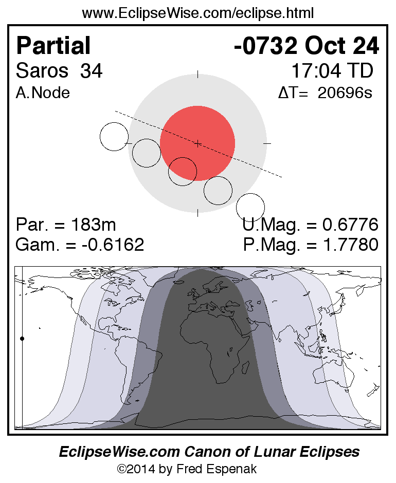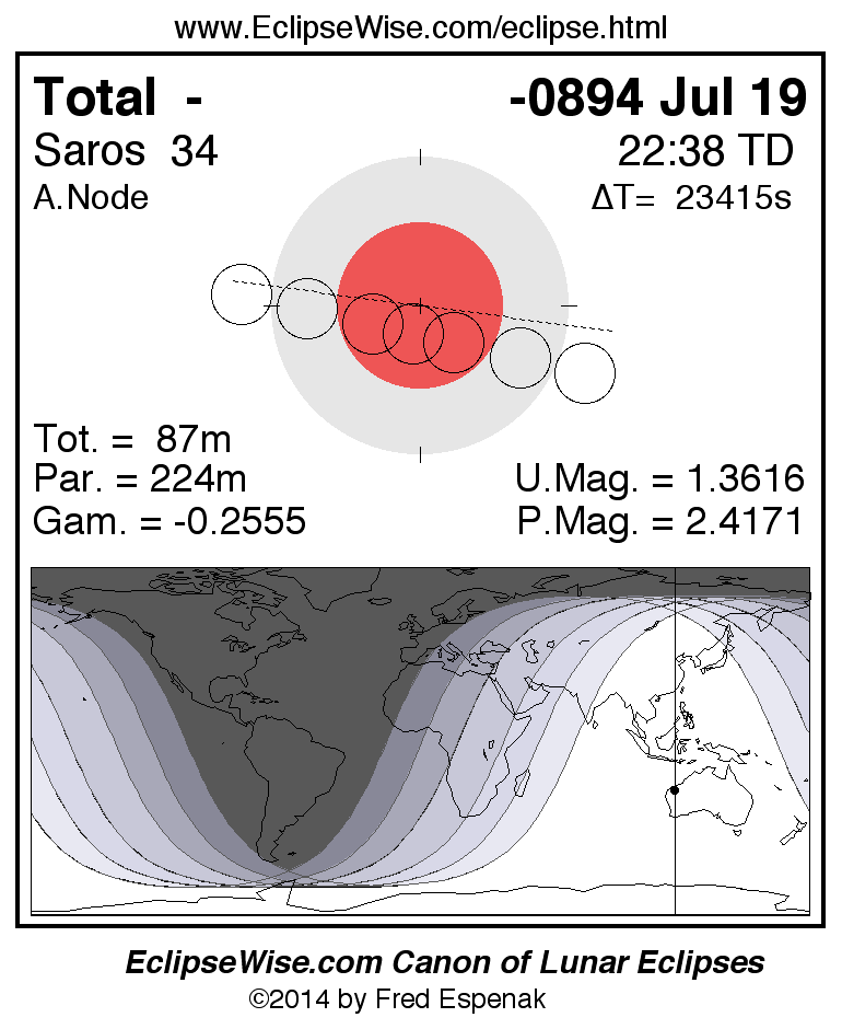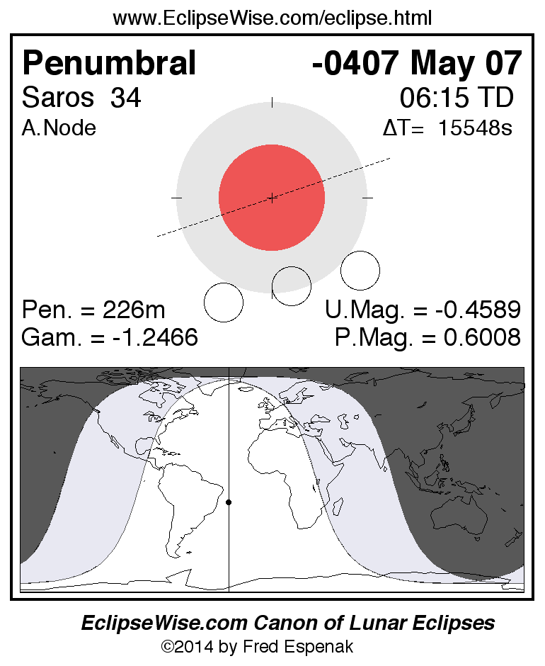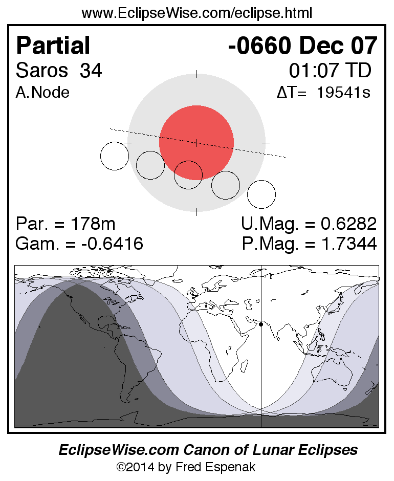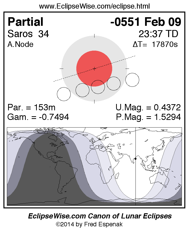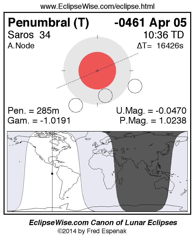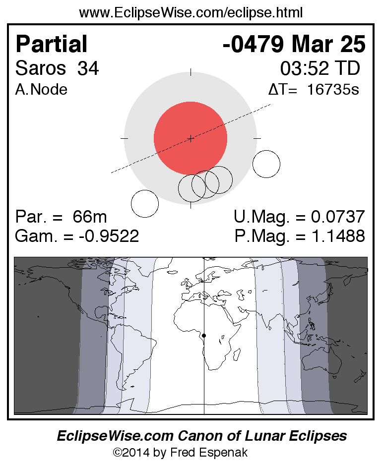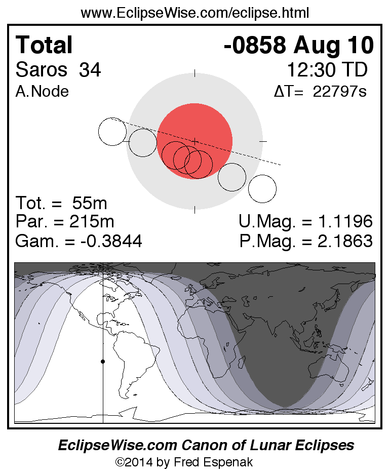 A panorama of all lunar eclipses belonging to Saros 34 is presented here. Each figure shows the Moon's path with respect to Earth's penumbral and umbral shadows. Below the path is a map depicting the geographic region of visibility for the eclipse. The date and time are given for the instant of Greatest Eclipse. Every figure serves as a hyperlink to the EclipseWise Prime page for that eclipse with a larger figure and complete details for the eclipse. Visit the Key to Lunar Eclipse Figures for a detailed explanation of these diagrams. Near the bottom of this page are a series of hyperlinks for more on lunar eclipses.