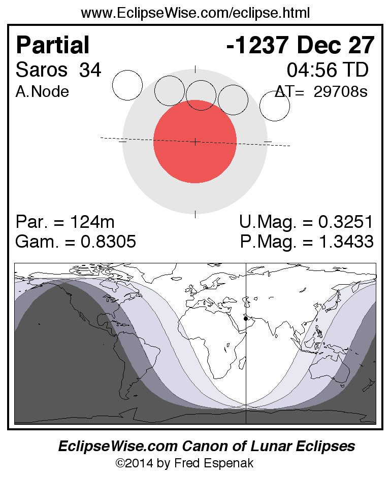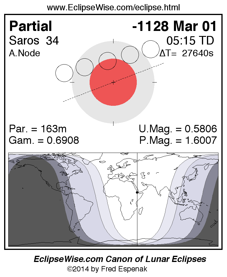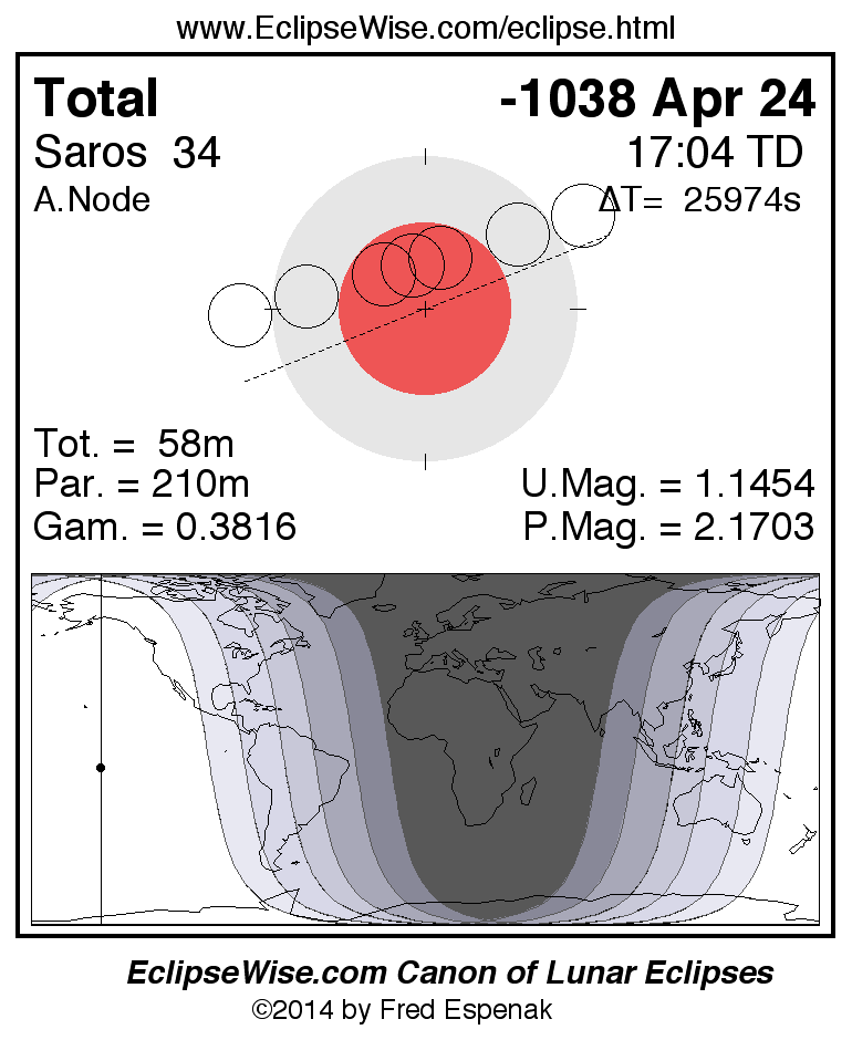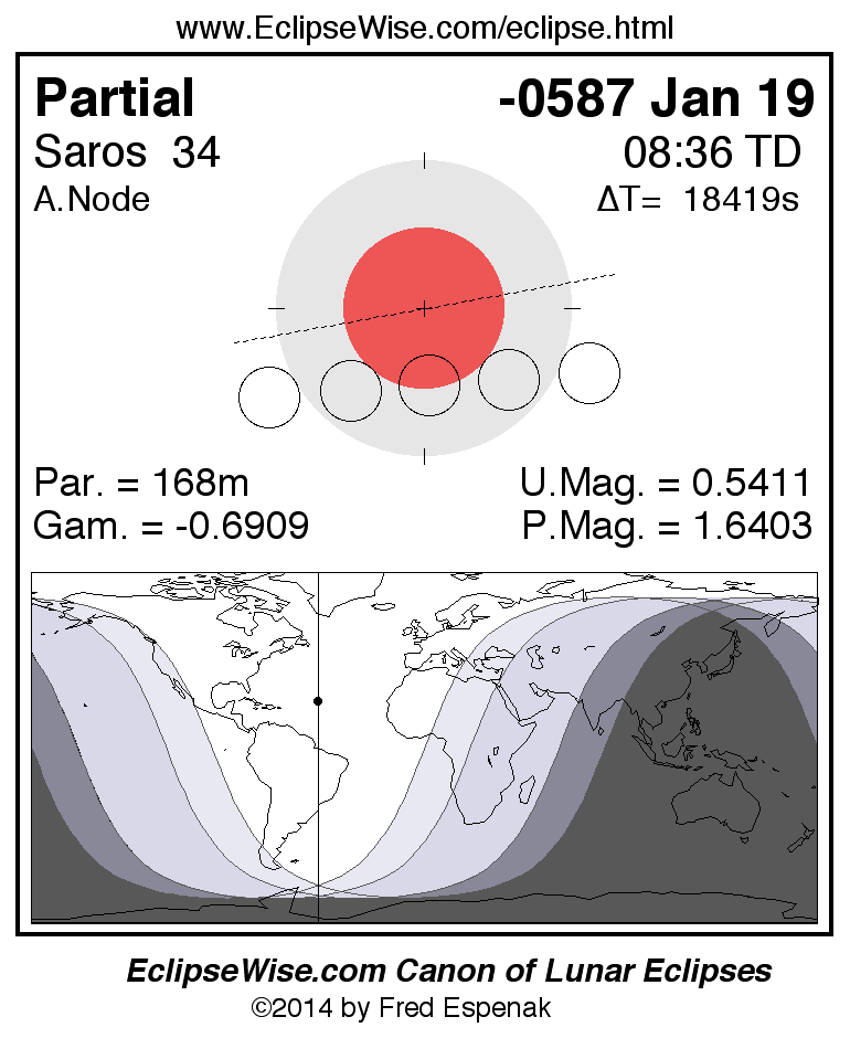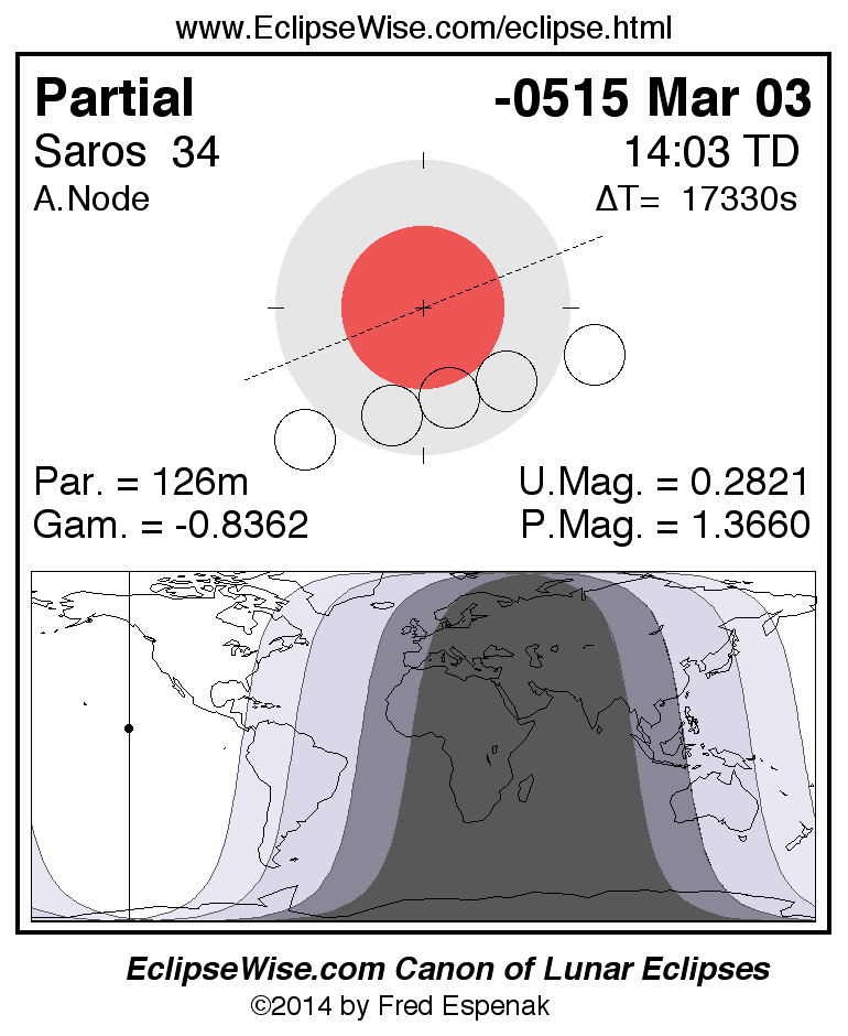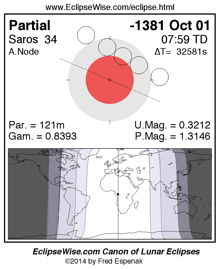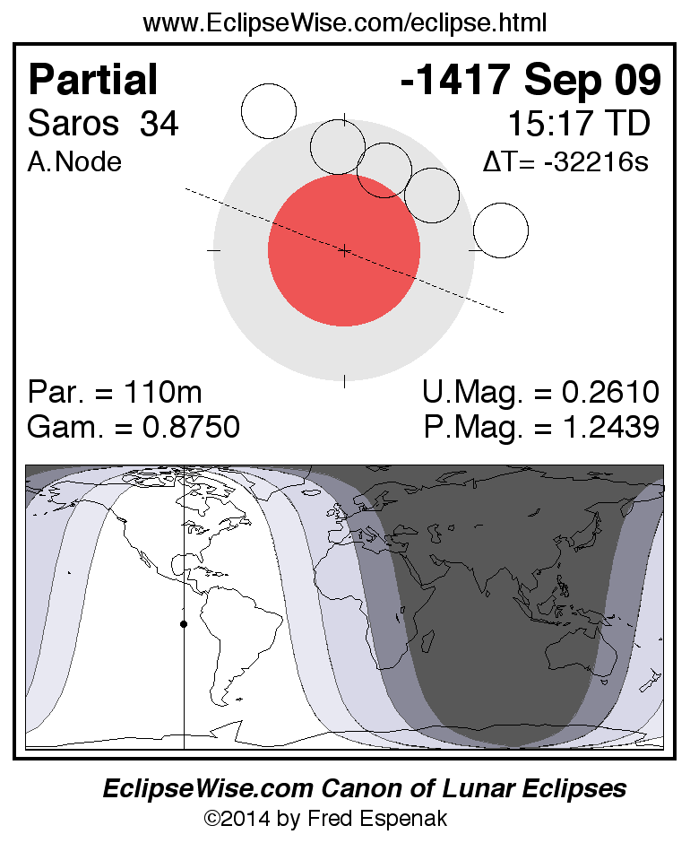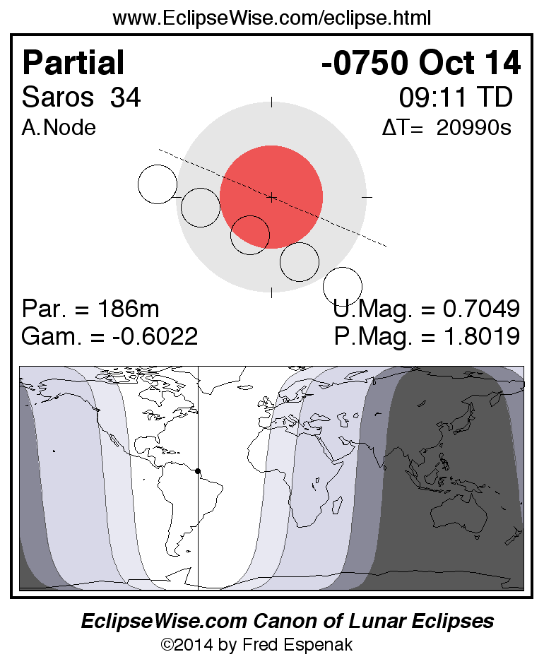 A panorama of all lunar eclipses belonging to Saros 34 is presented here. Each figure shows the Moon's path with respect to Earth's penumbral and umbral shadows. Below the path is a map depicting the geographic region of visibility for the eclipse. The date and time are given for the instant of Greatest Eclipse. Every figure serves as a hyperlink to the EclipseWise Prime page for that eclipse with a larger figure and complete details for the eclipse. Visit the Key to Lunar Eclipse Figures for a detailed explanation of these diagrams. Near the bottom of this page are a series of hyperlinks for more on lunar eclipses.