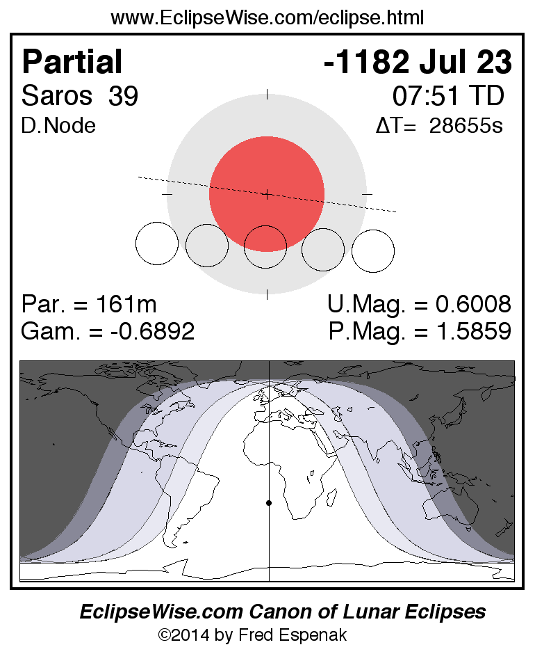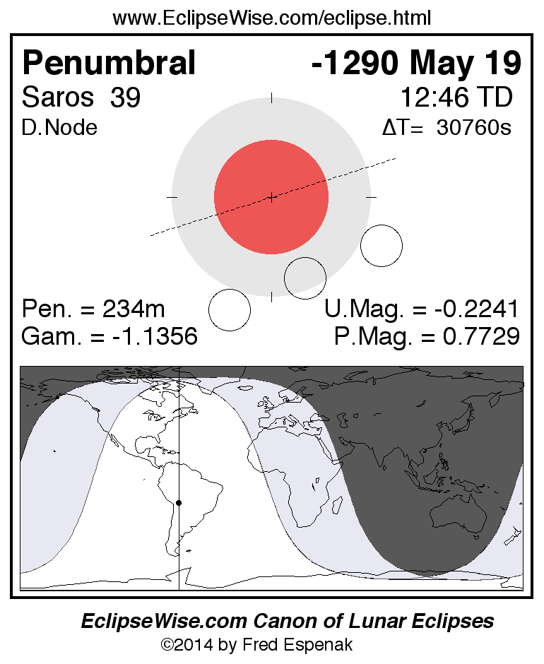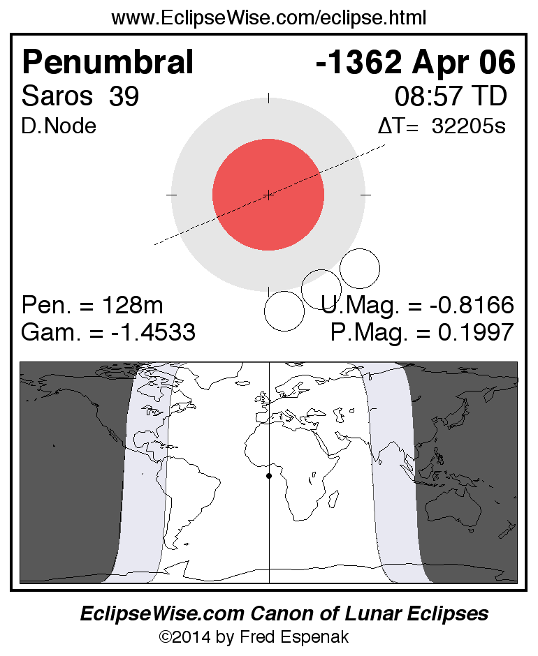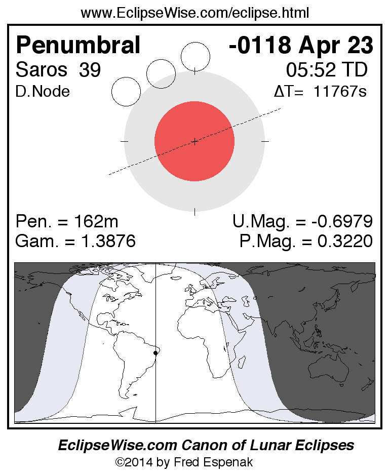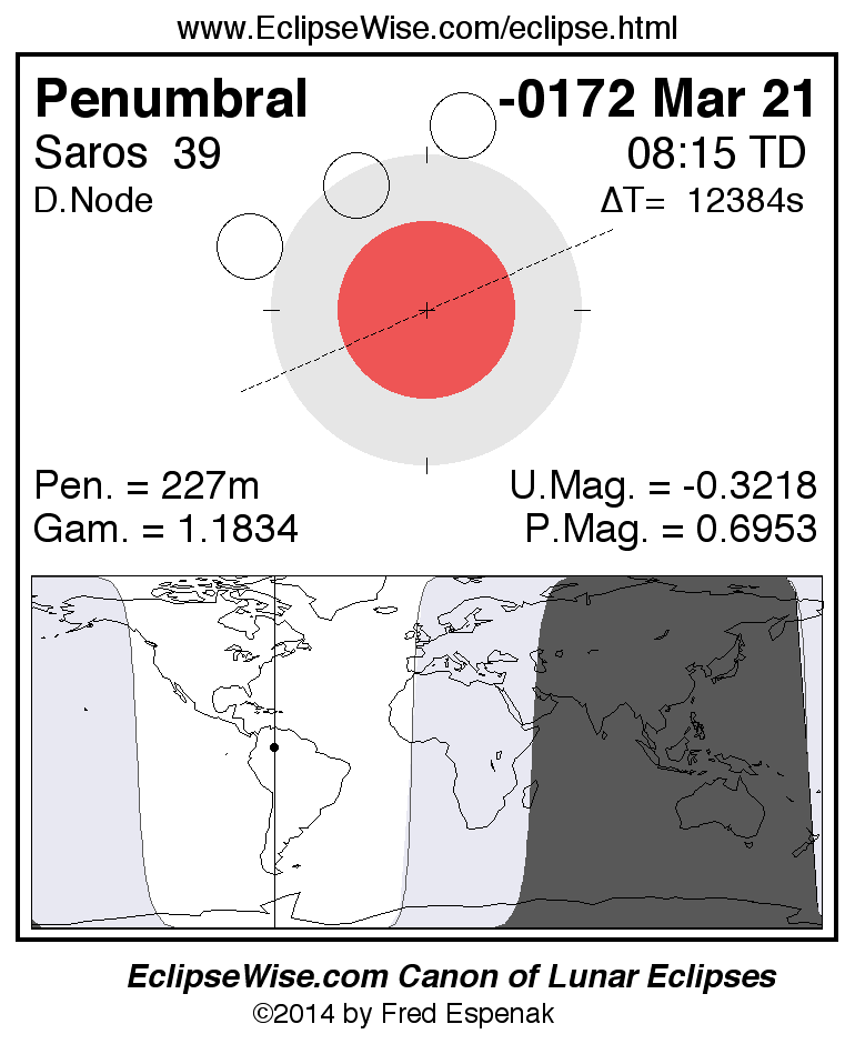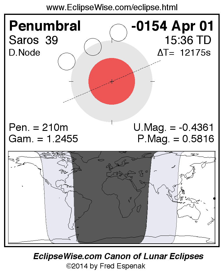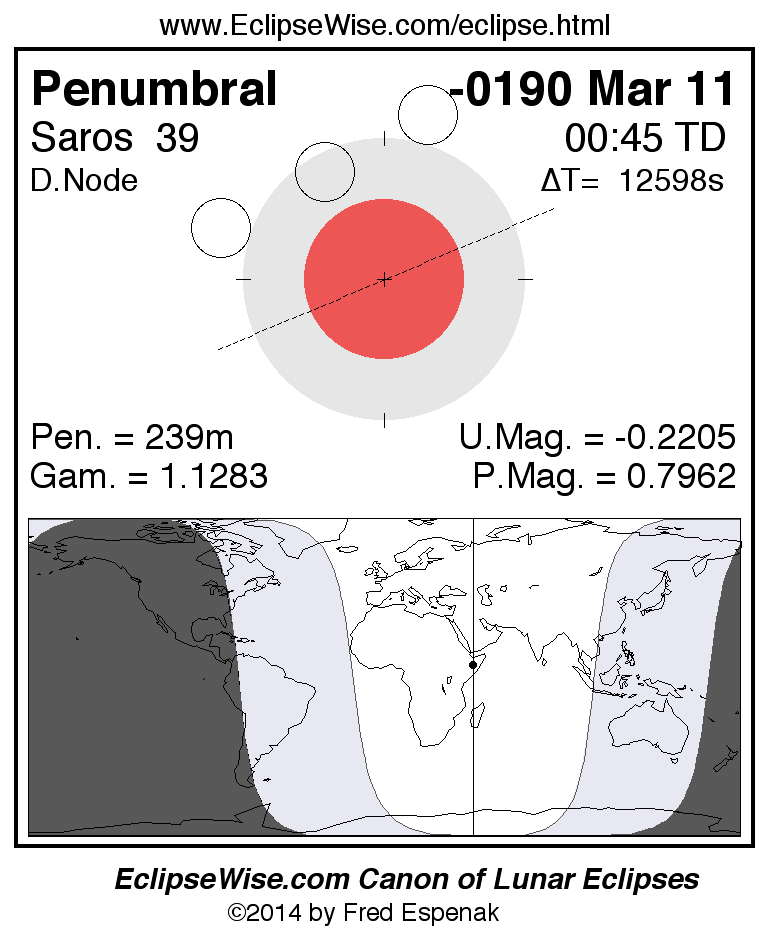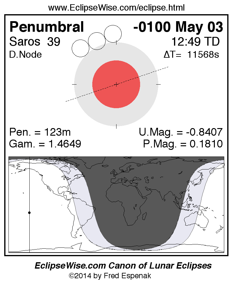 A panorama of all lunar eclipses belonging to Saros 39 is presented here. Each figure shows the Moon's path with respect to Earth's penumbral and umbral shadows. Below the path is a map depicting the geographic region of visibility for the eclipse. The date and time are given for the instant of Greatest Eclipse. Every figure serves as a hyperlink to the EclipseWise Prime page for that eclipse with a larger figure and complete details for the eclipse. Visit the Key to Lunar Eclipse Figures for a detailed explanation of these diagrams. Near the bottom of this page are a series of hyperlinks for more on lunar eclipses.