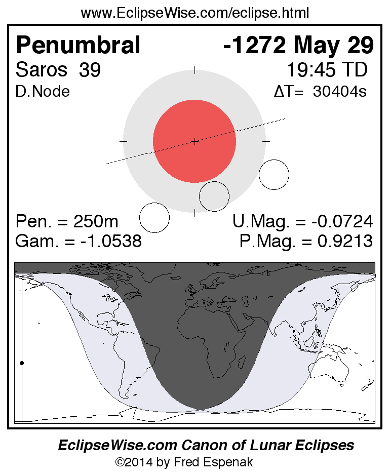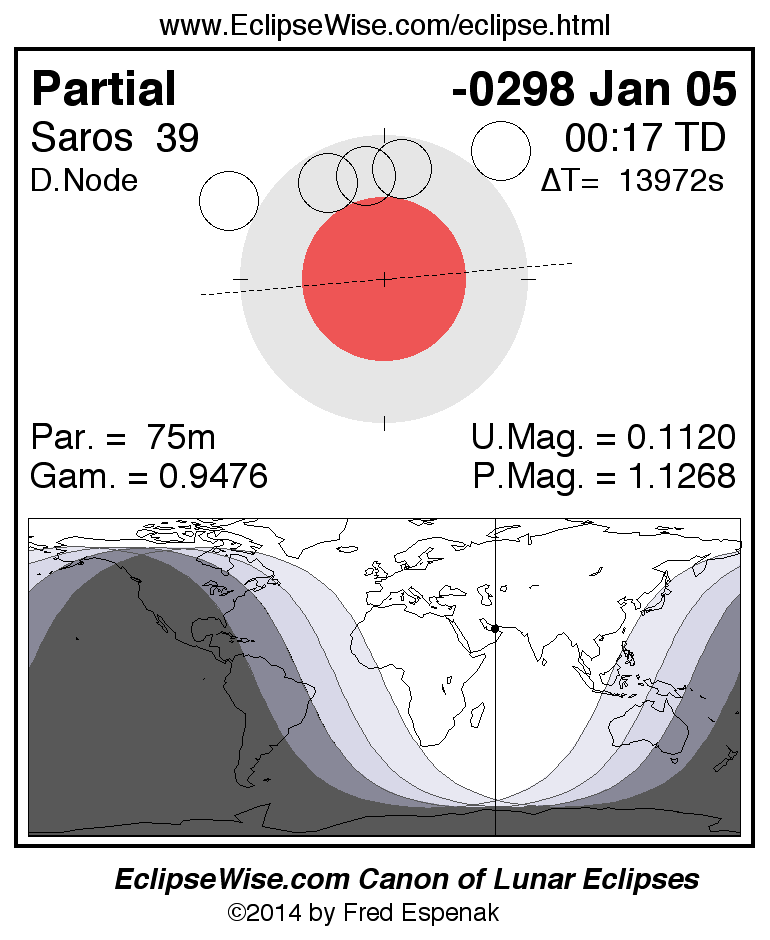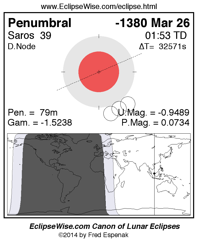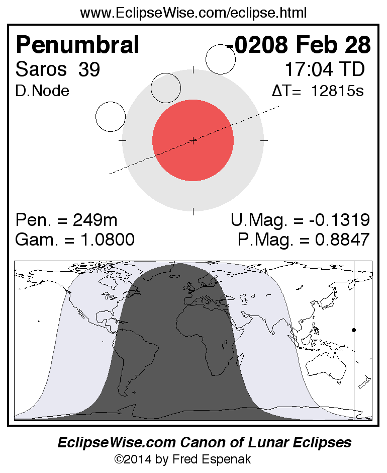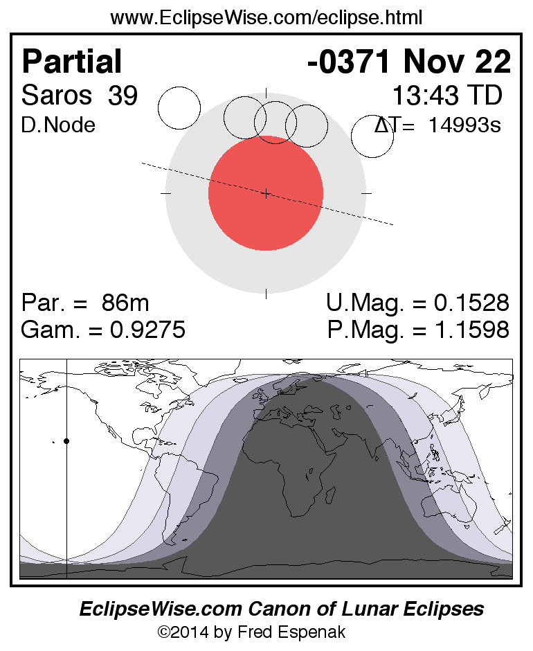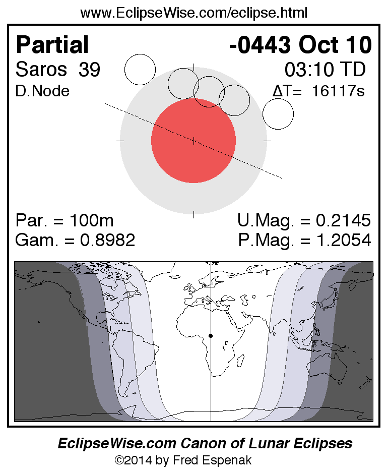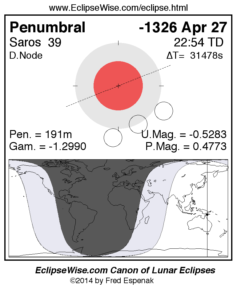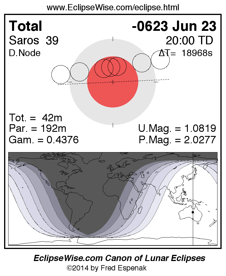 A panorama of all lunar eclipses belonging to Saros 39 is presented here. Each figure shows the Moon's path with respect to Earth's penumbral and umbral shadows. Below the path is a map depicting the geographic region of visibility for the eclipse. The date and time are given for the instant of Greatest Eclipse. Every figure serves as a hyperlink to the EclipseWise Prime page for that eclipse with a larger figure and complete details for the eclipse. Visit the Key to Lunar Eclipse Figures for a detailed explanation of these diagrams. Near the bottom of this page are a series of hyperlinks for more on lunar eclipses.