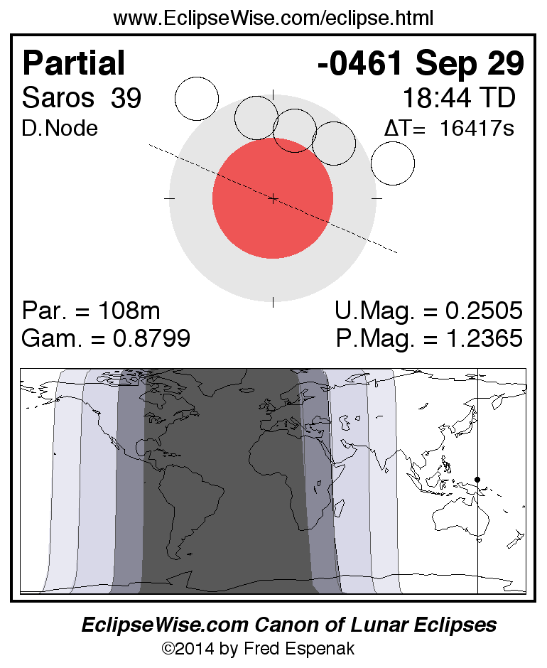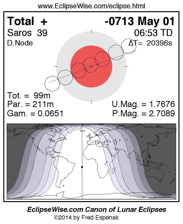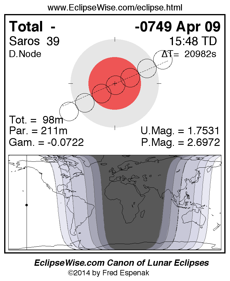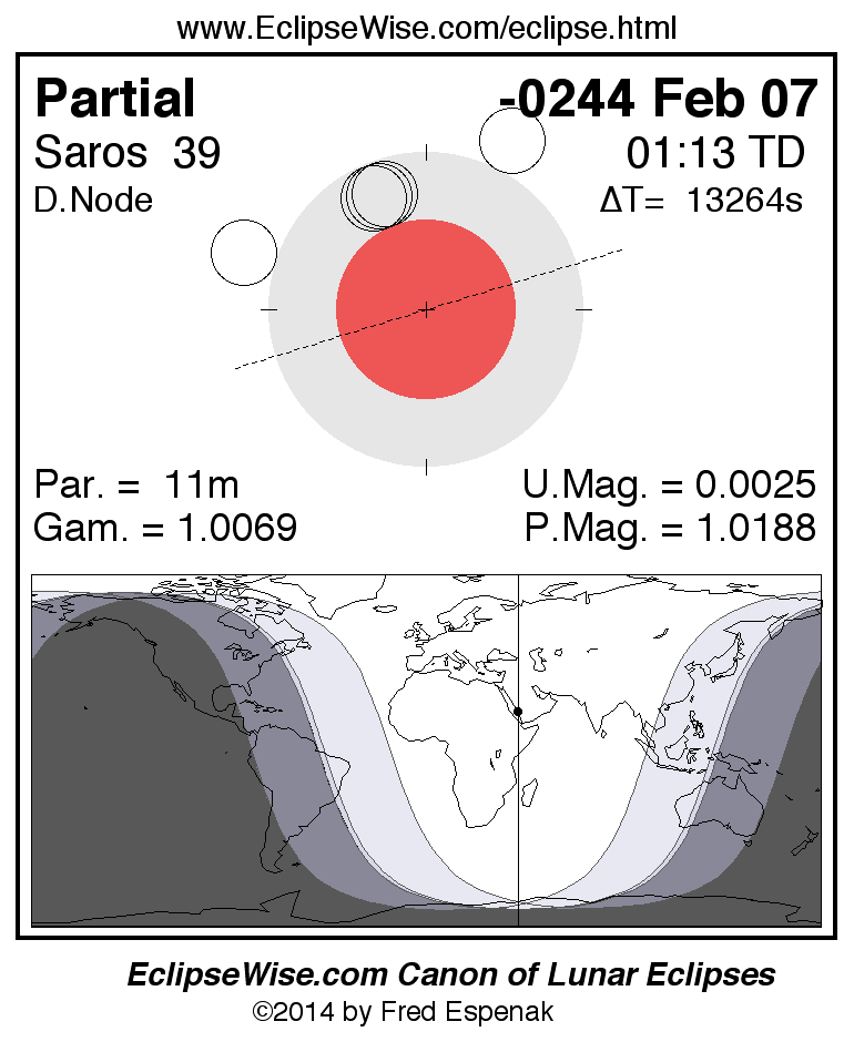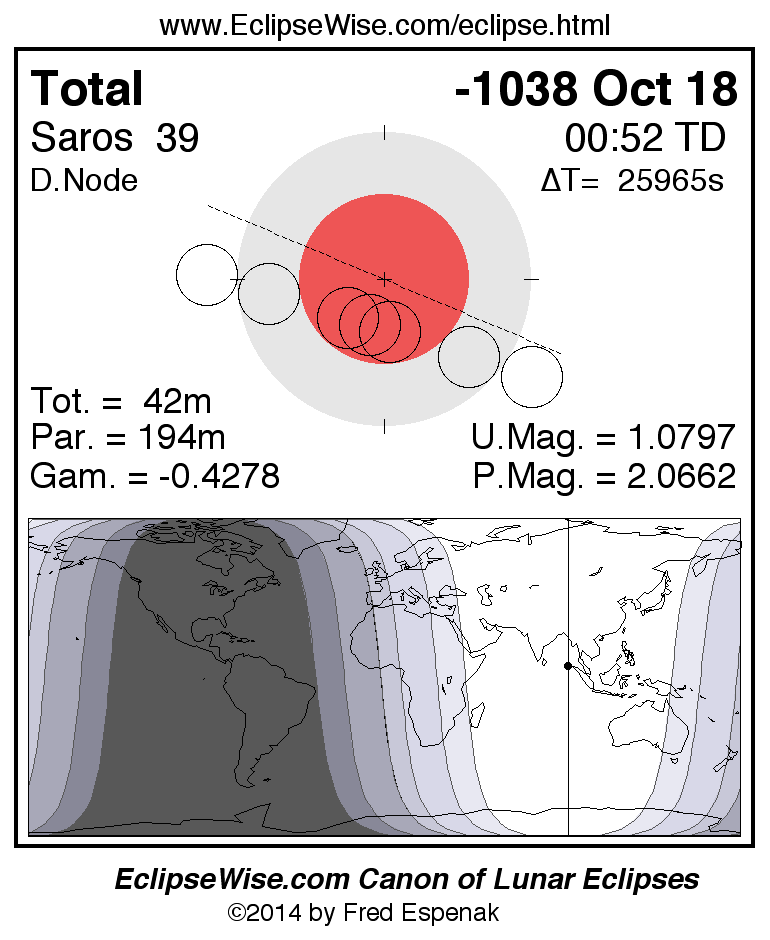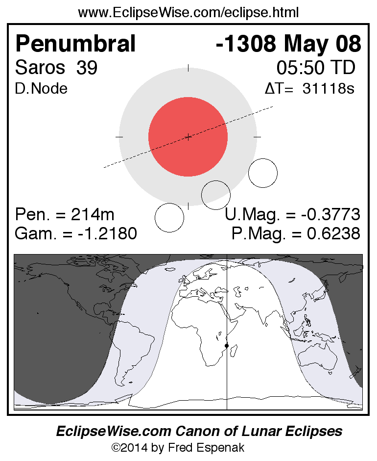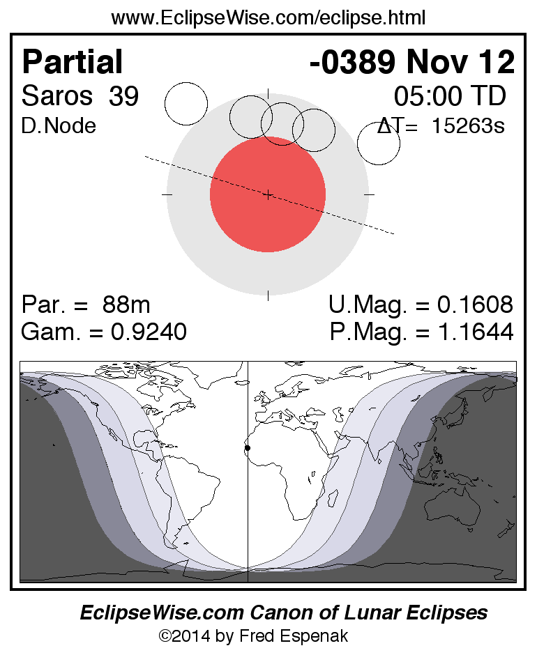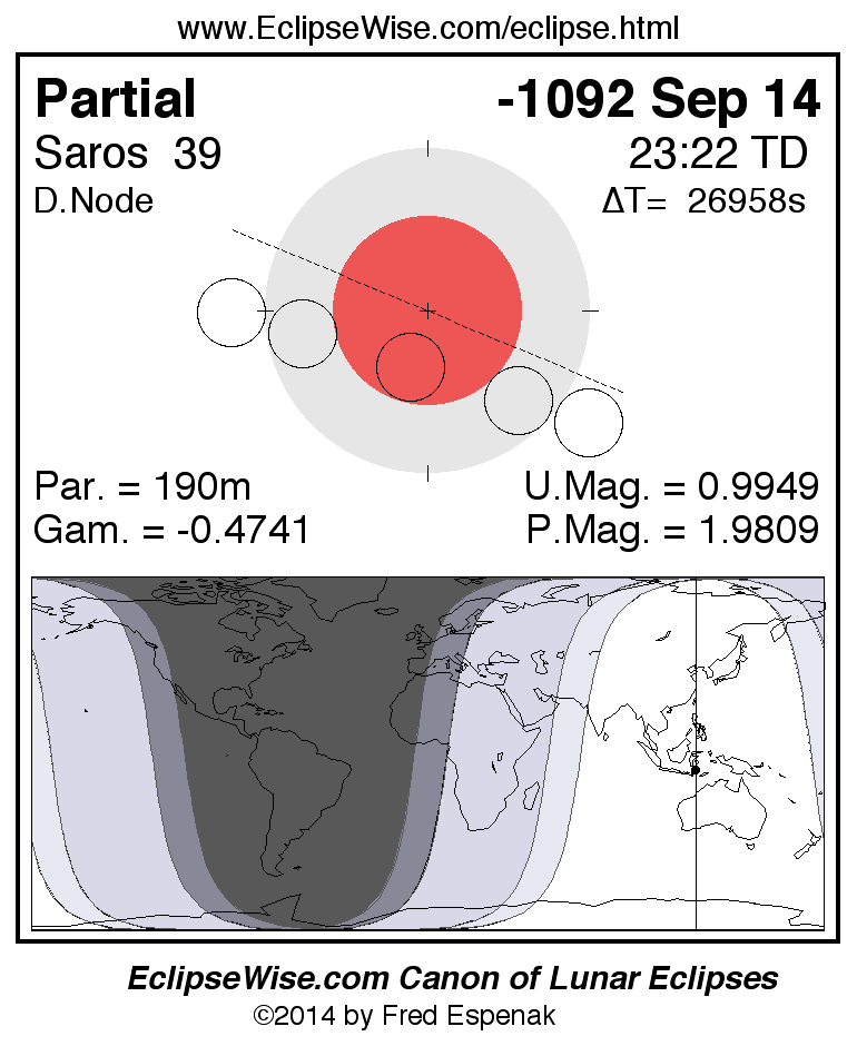 A panorama of all lunar eclipses belonging to Saros 39 is presented here. Each figure shows the Moon's path with respect to Earth's penumbral and umbral shadows. Below the path is a map depicting the geographic region of visibility for the eclipse. The date and time are given for the instant of Greatest Eclipse. Every figure serves as a hyperlink to the EclipseWise Prime page for that eclipse with a larger figure and complete details for the eclipse. Visit the Key to Lunar Eclipse Figures for a detailed explanation of these diagrams. Near the bottom of this page are a series of hyperlinks for more on lunar eclipses.