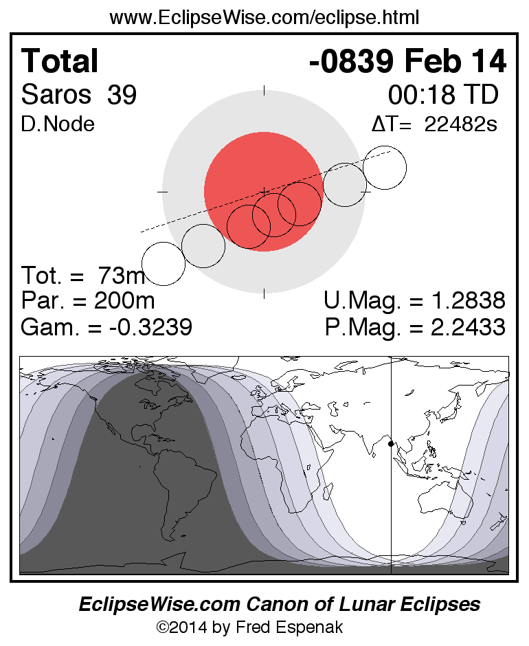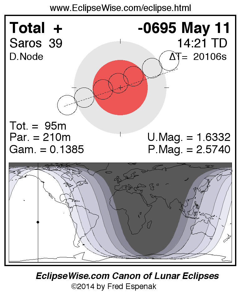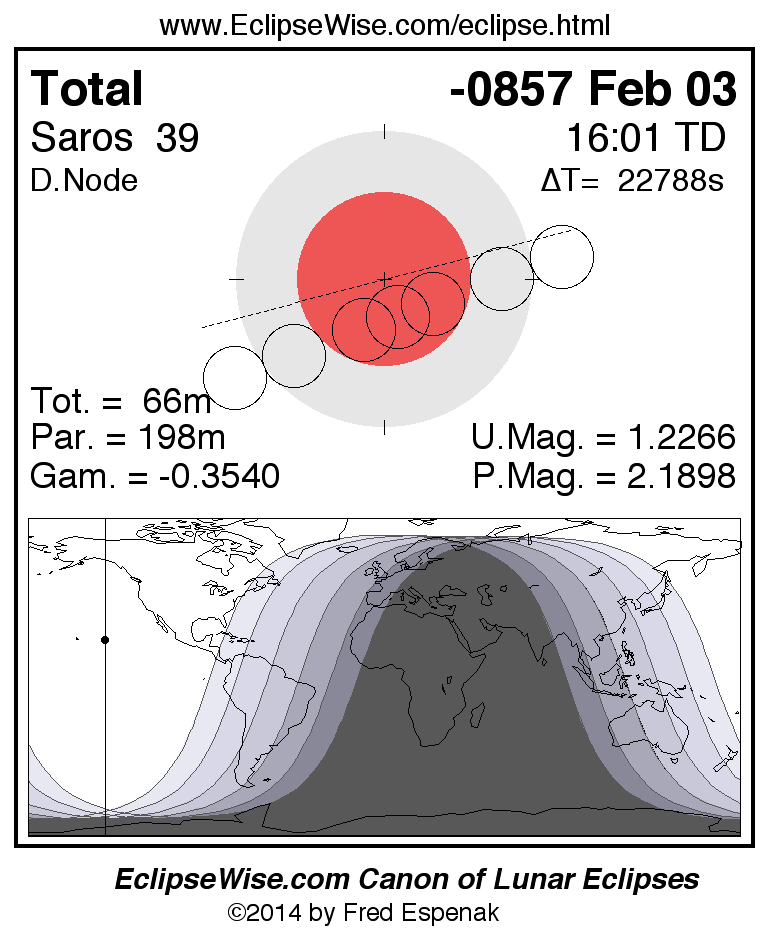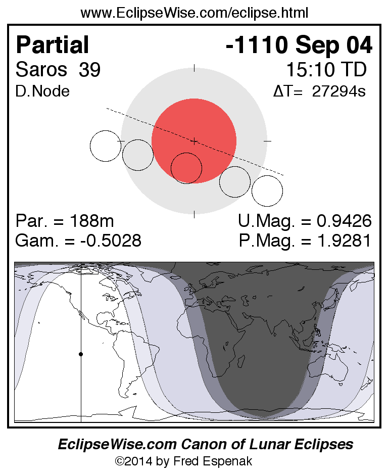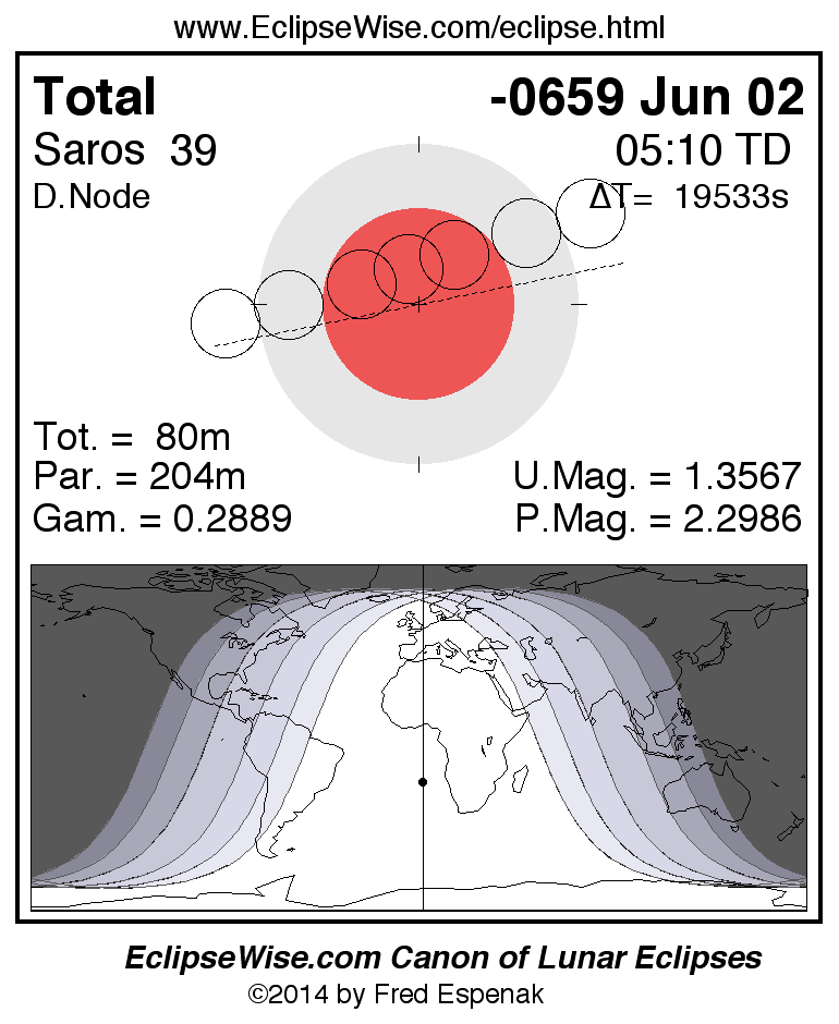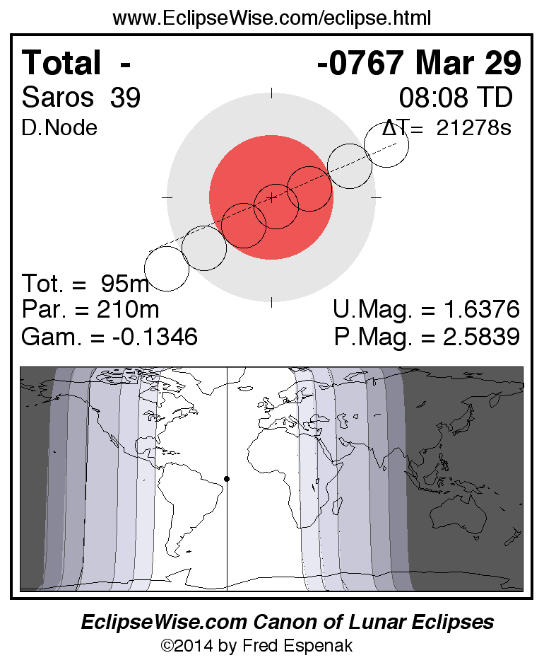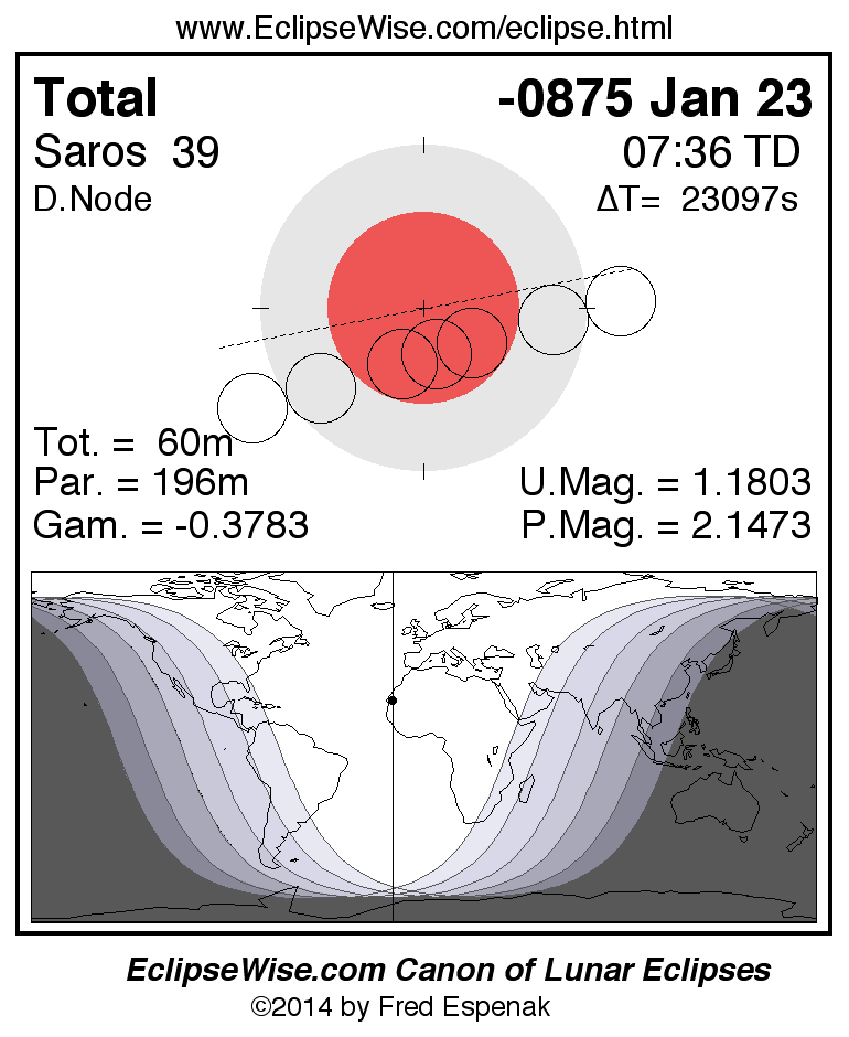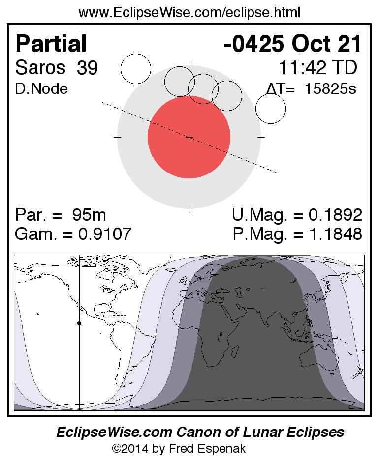 A panorama of all lunar eclipses belonging to Saros 39 is presented here. Each figure shows the Moon's path with respect to Earth's penumbral and umbral shadows. Below the path is a map depicting the geographic region of visibility for the eclipse. The date and time are given for the instant of Greatest Eclipse. Every figure serves as a hyperlink to the EclipseWise Prime page for that eclipse with a larger figure and complete details for the eclipse. Visit the Key to Lunar Eclipse Figures for a detailed explanation of these diagrams. Near the bottom of this page are a series of hyperlinks for more on lunar eclipses.
