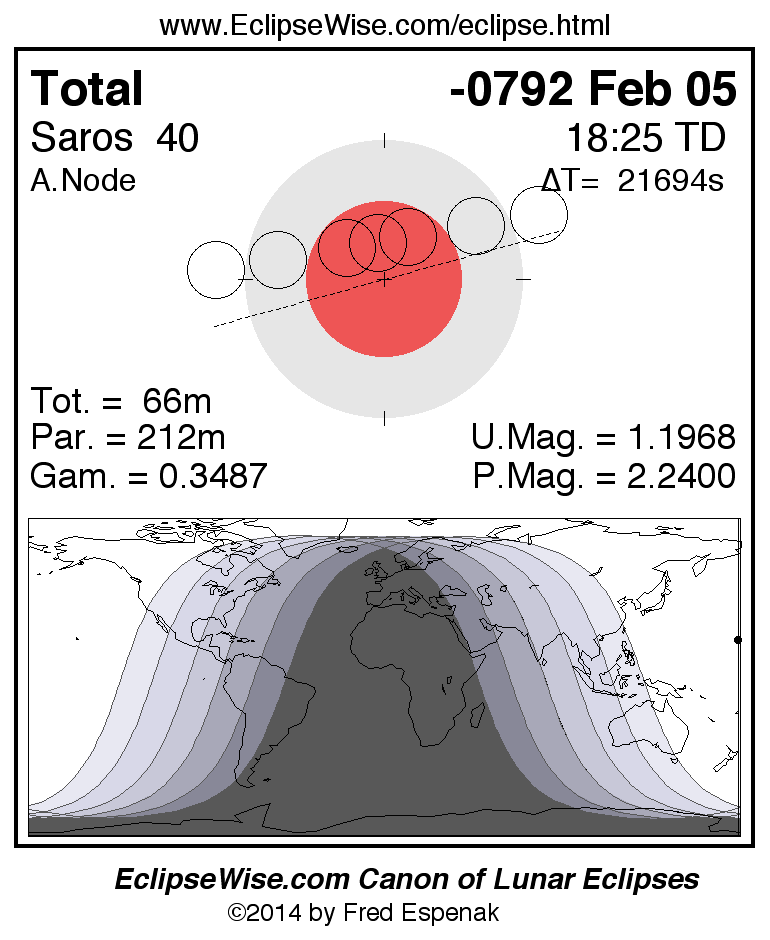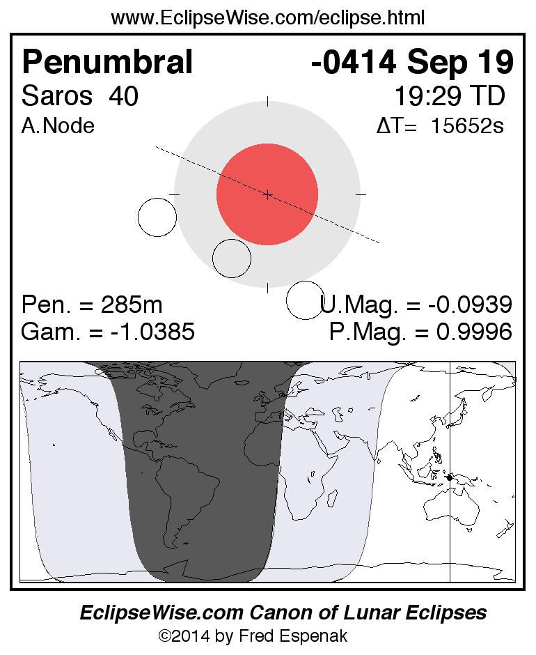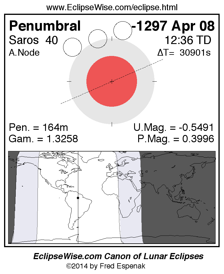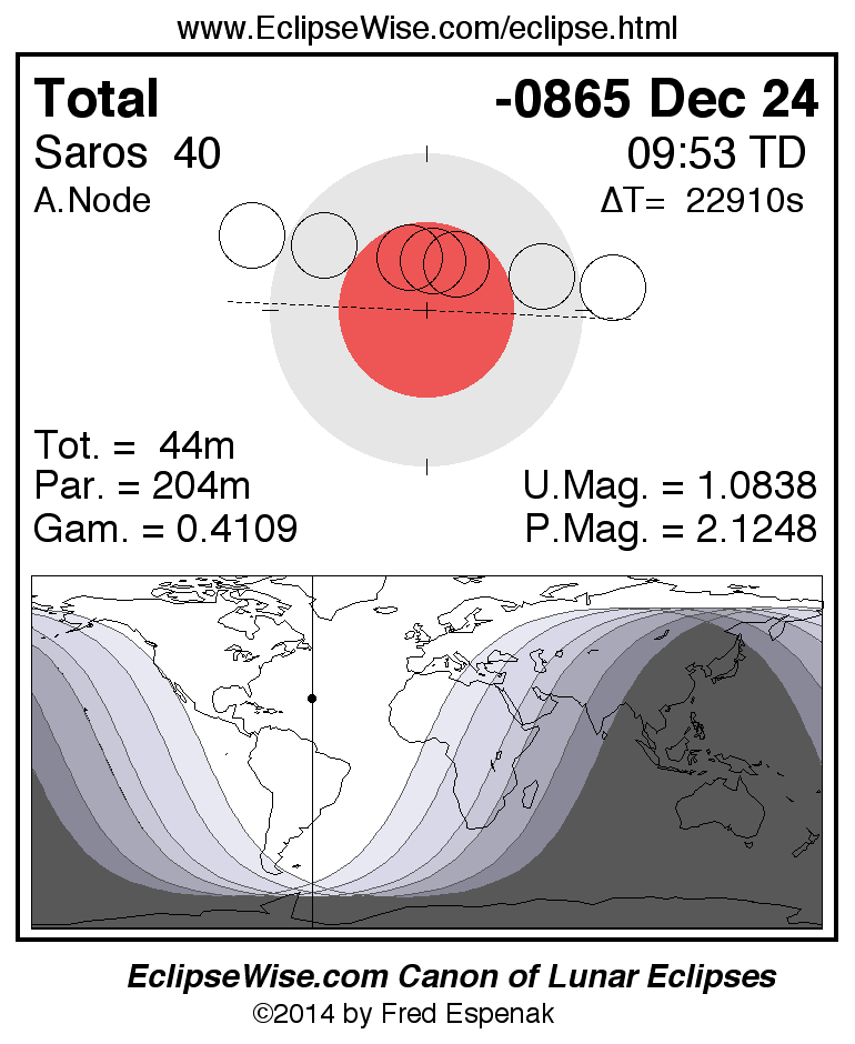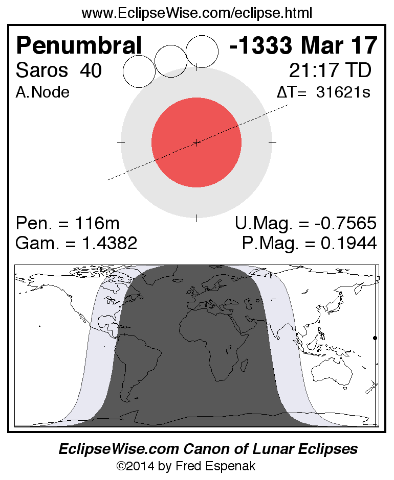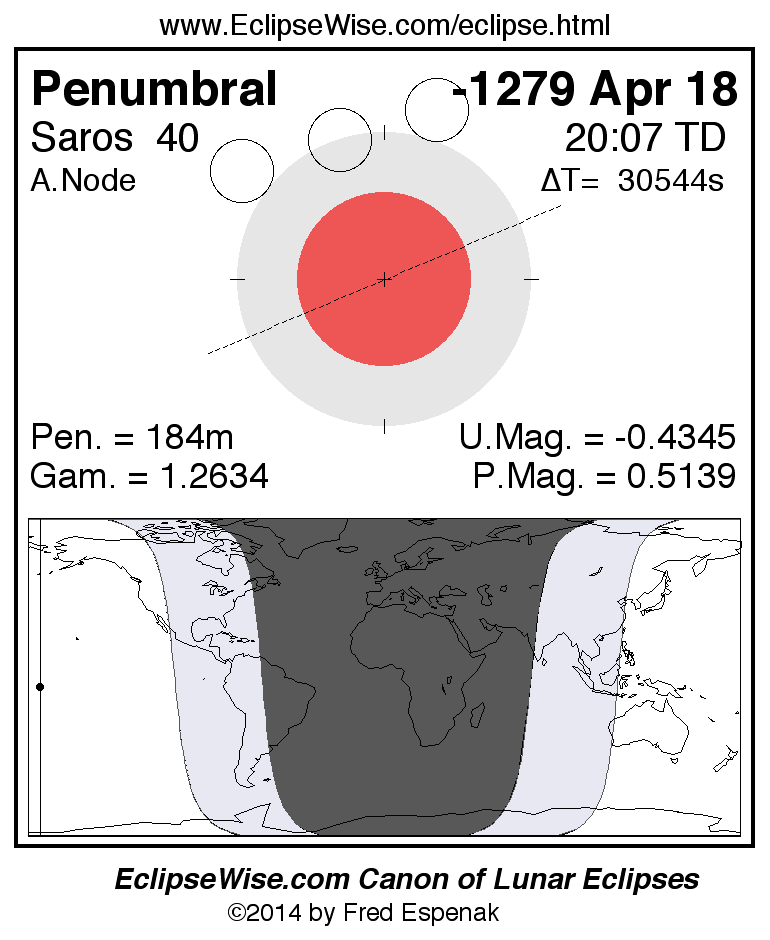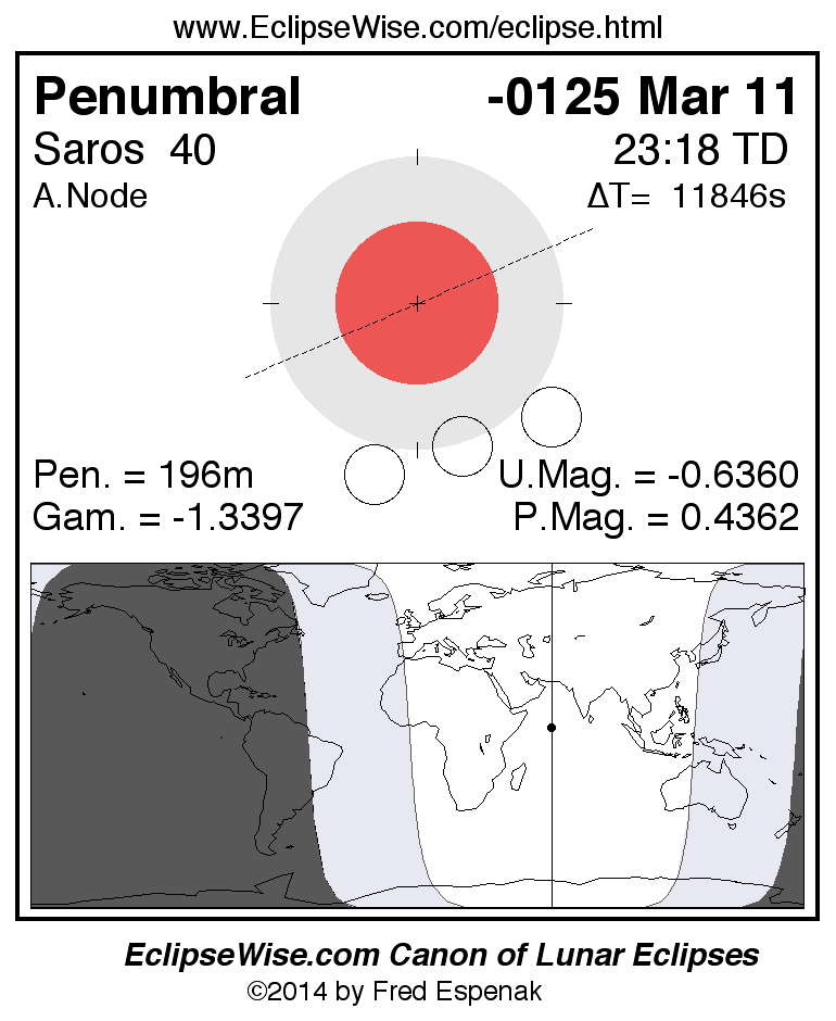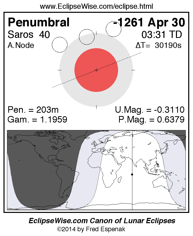 A panorama of all lunar eclipses belonging to Saros 40 is presented here. Each figure shows the Moon's path with respect to Earth's penumbral and umbral shadows. Below the path is a map depicting the geographic region of visibility for the eclipse. The date and time are given for the instant of Greatest Eclipse. Every figure serves as a hyperlink to the EclipseWise Prime page for that eclipse with a larger figure and complete details for the eclipse. Visit the Key to Lunar Eclipse Figures for a detailed explanation of these diagrams. Near the bottom of this page are a series of hyperlinks for more on lunar eclipses.