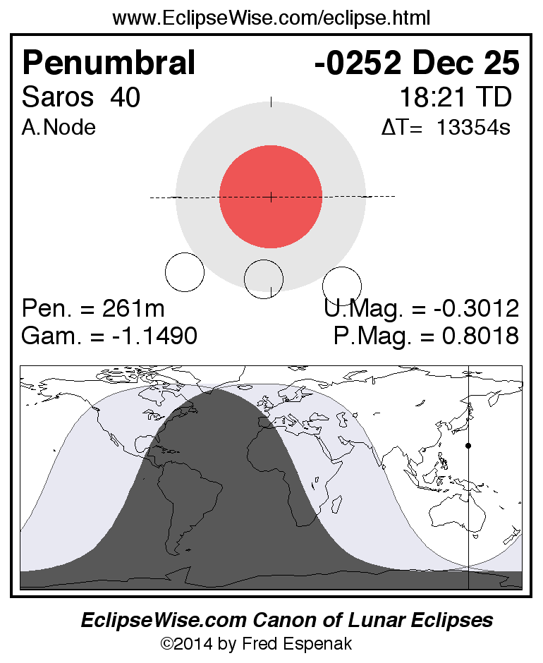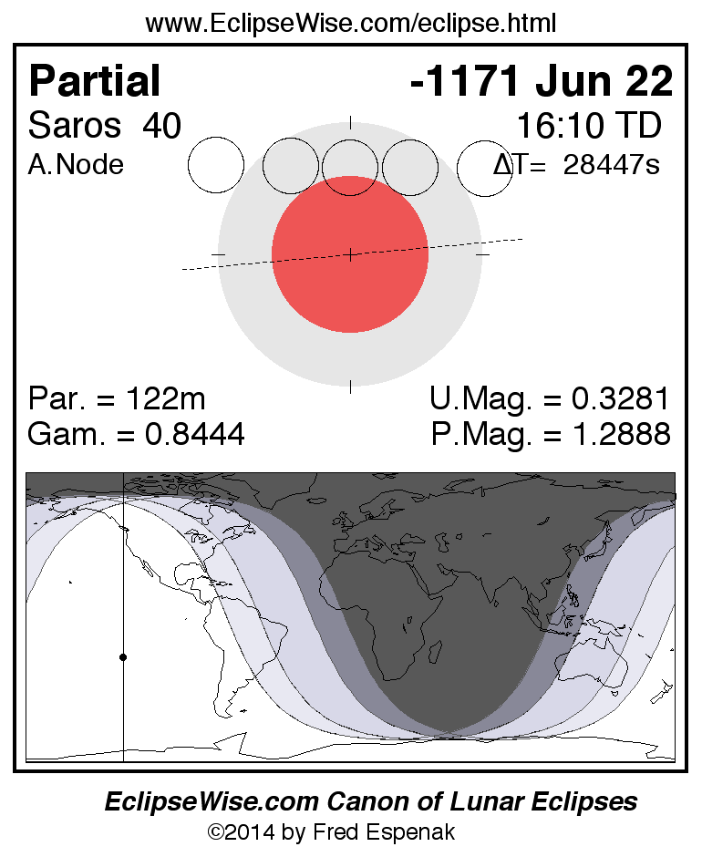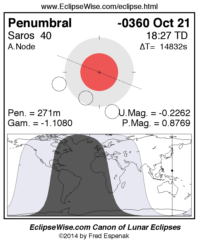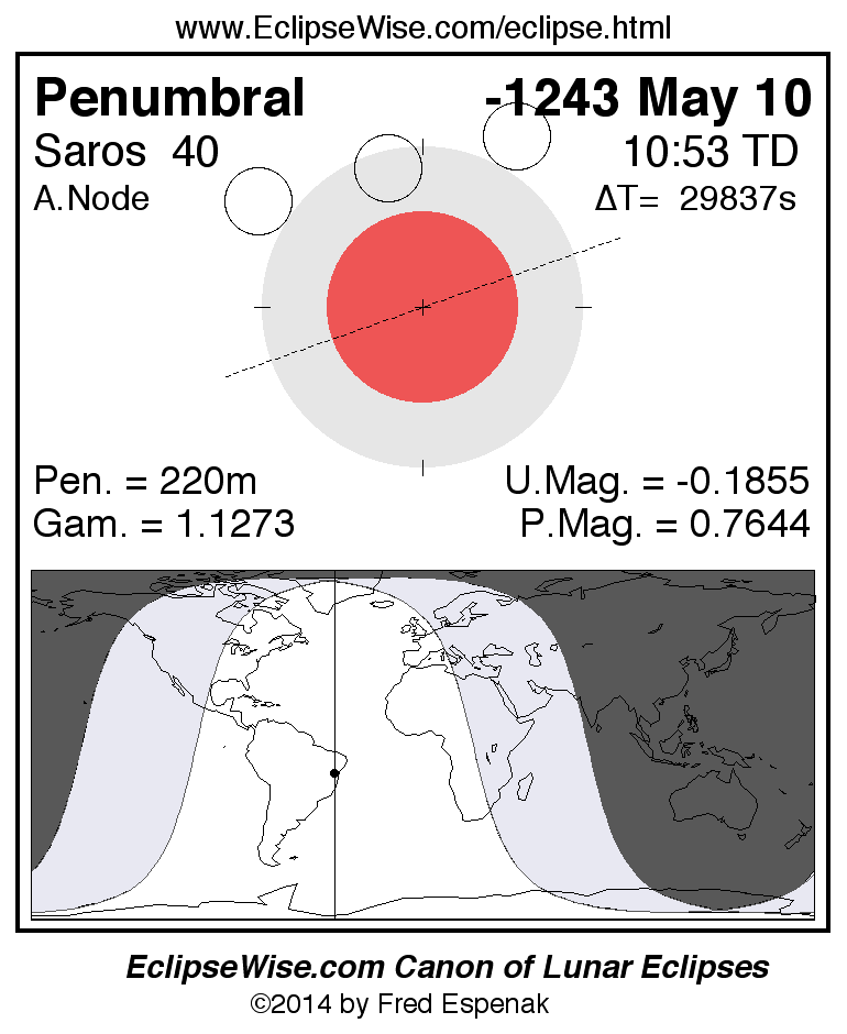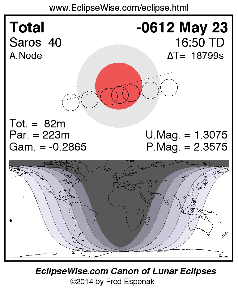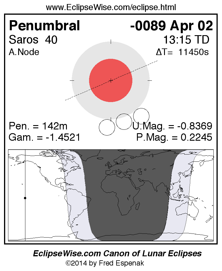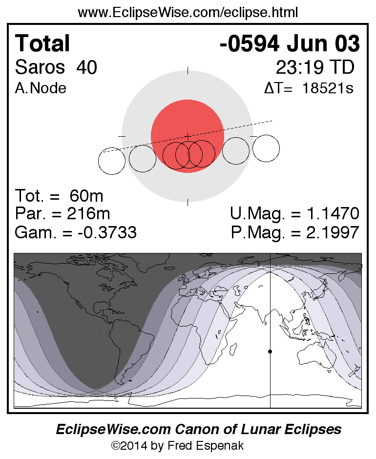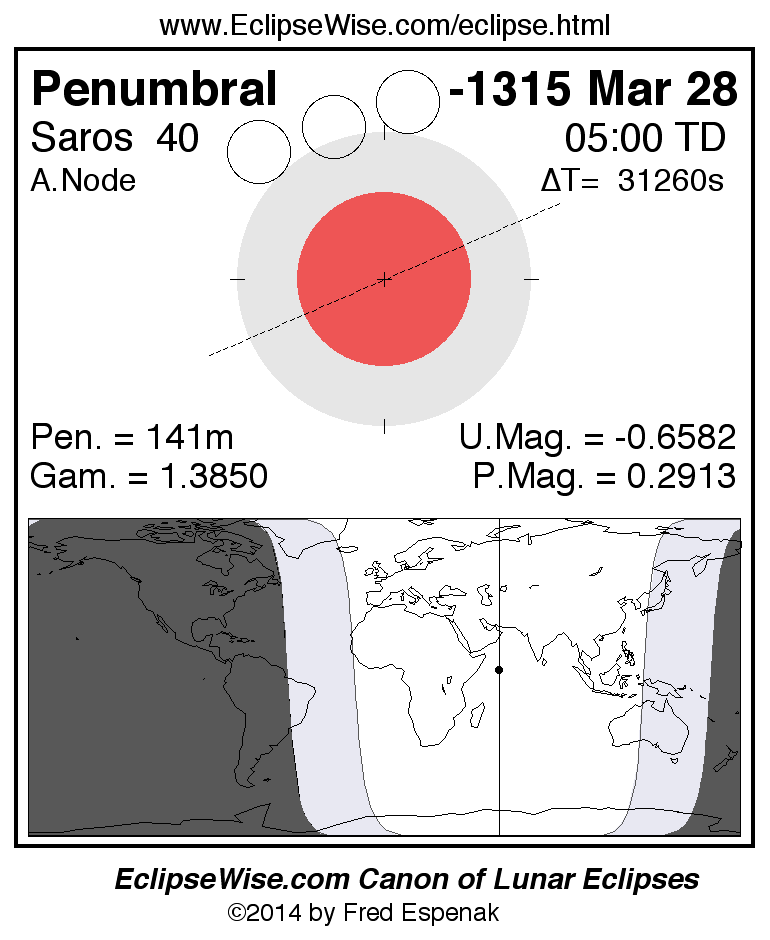 A panorama of all lunar eclipses belonging to Saros 40 is presented here. Each figure shows the Moon's path with respect to Earth's penumbral and umbral shadows. Below the path is a map depicting the geographic region of visibility for the eclipse. The date and time are given for the instant of Greatest Eclipse. Every figure serves as a hyperlink to the EclipseWise Prime page for that eclipse with a larger figure and complete details for the eclipse. Visit the Key to Lunar Eclipse Figures for a detailed explanation of these diagrams. Near the bottom of this page are a series of hyperlinks for more on lunar eclipses.