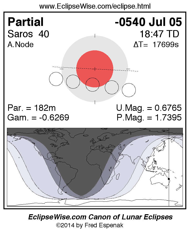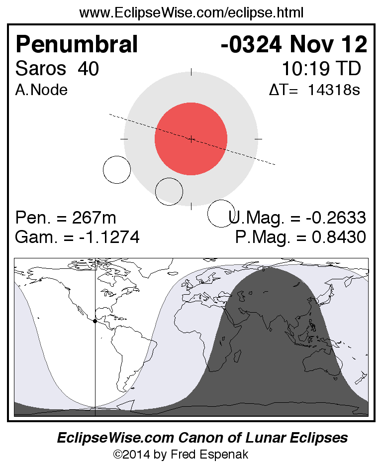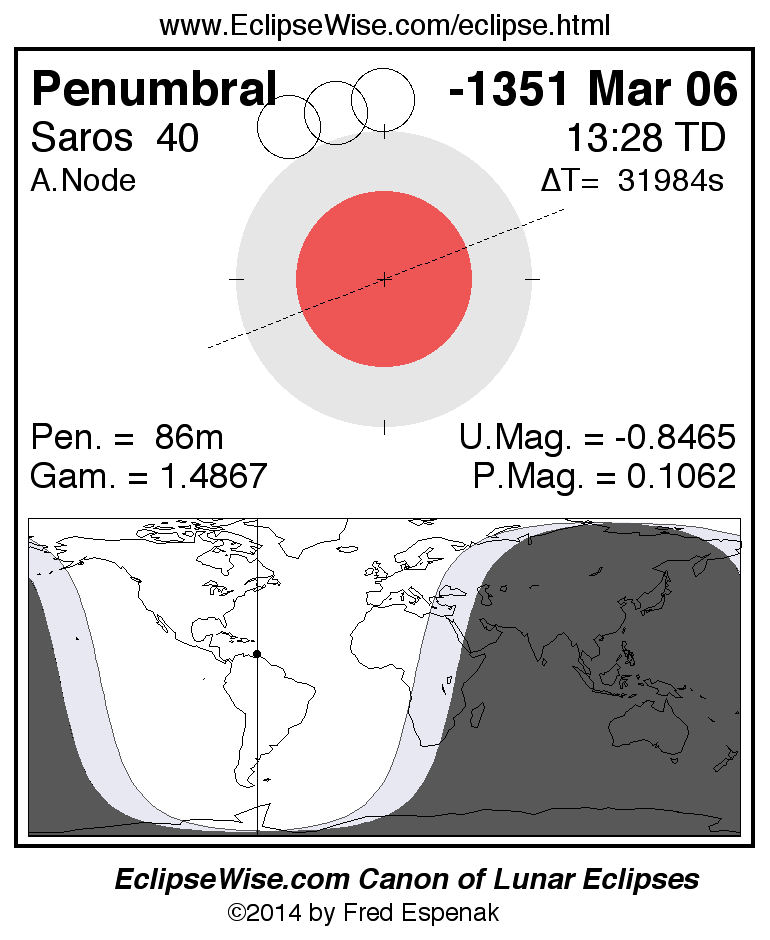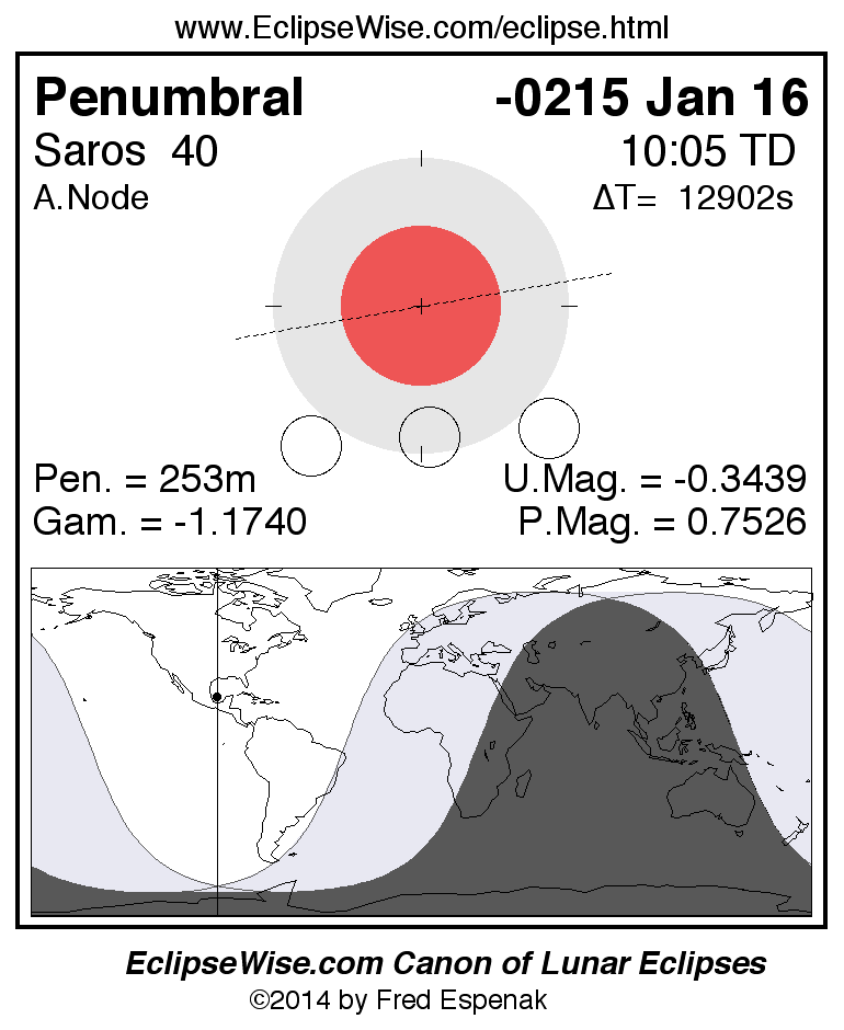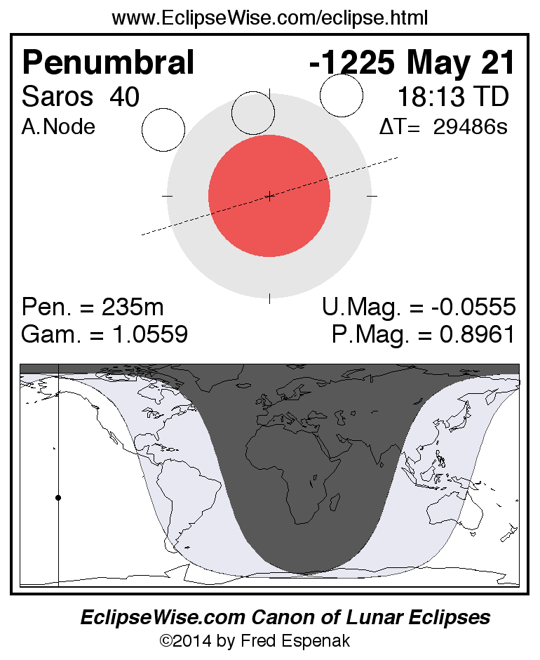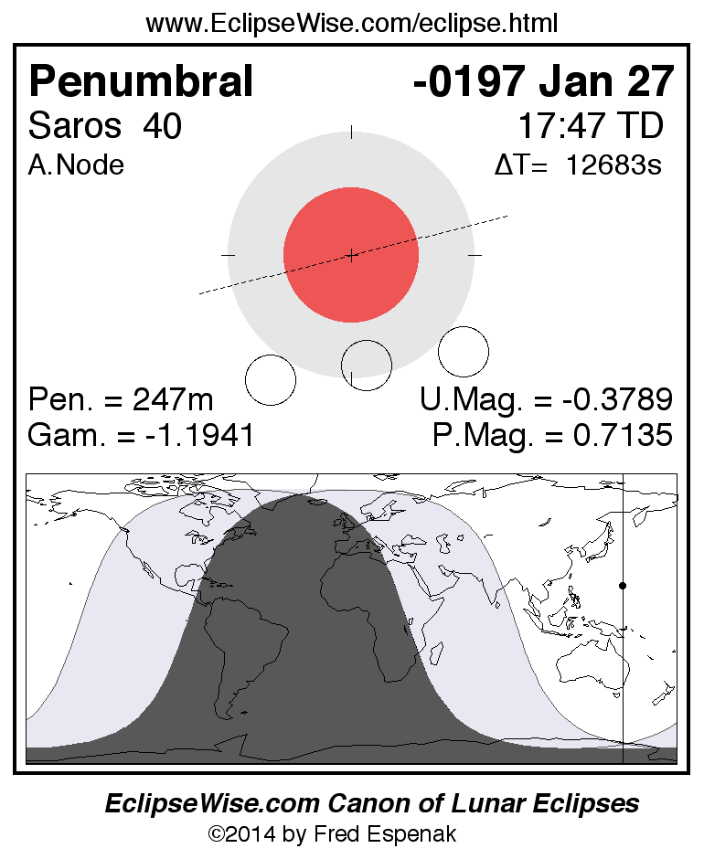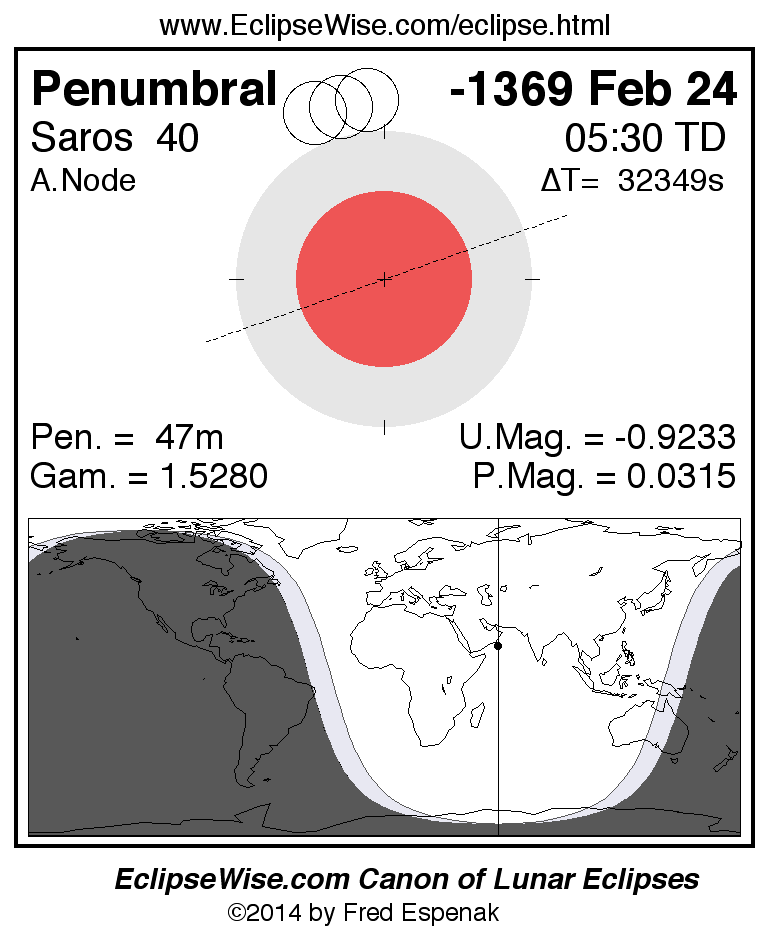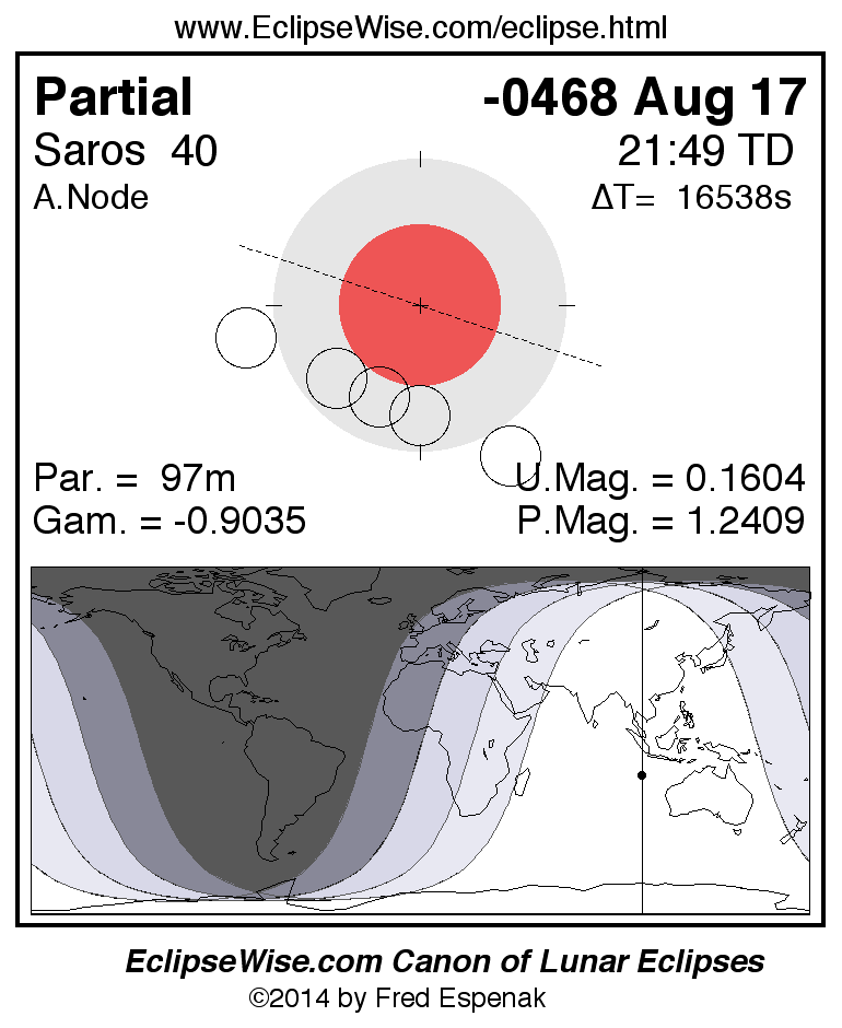 A panorama of all lunar eclipses belonging to Saros 40 is presented here. Each figure shows the Moon's path with respect to Earth's penumbral and umbral shadows. Below the path is a map depicting the geographic region of visibility for the eclipse. The date and time are given for the instant of Greatest Eclipse. Every figure serves as a hyperlink to the EclipseWise Prime page for that eclipse with a larger figure and complete details for the eclipse. Visit the Key to Lunar Eclipse Figures for a detailed explanation of these diagrams. Near the bottom of this page are a series of hyperlinks for more on lunar eclipses.