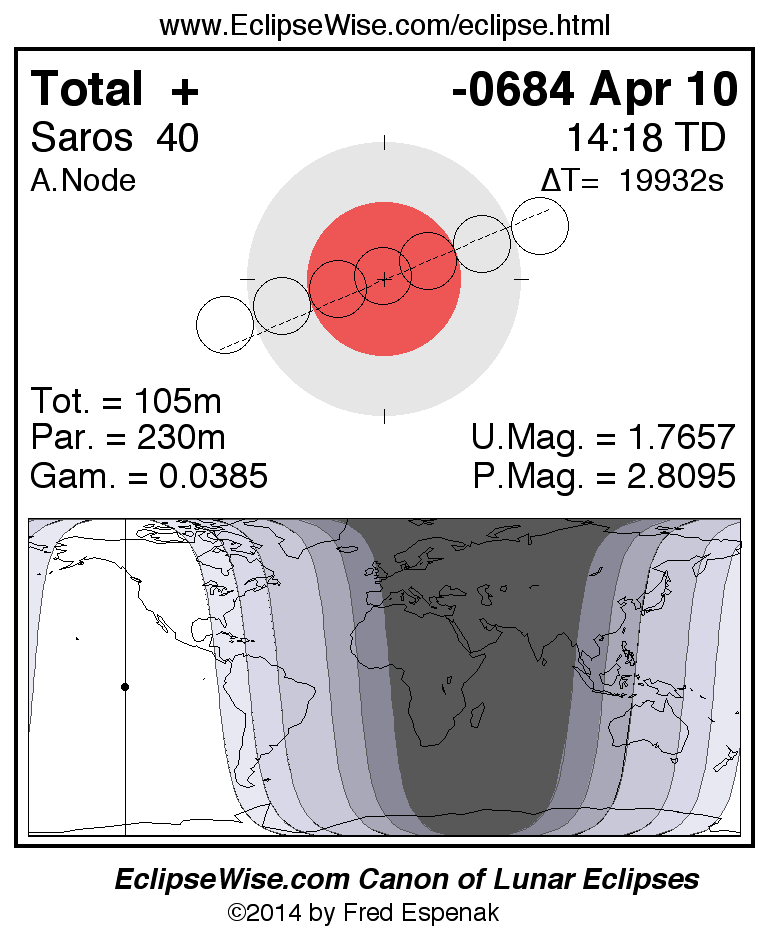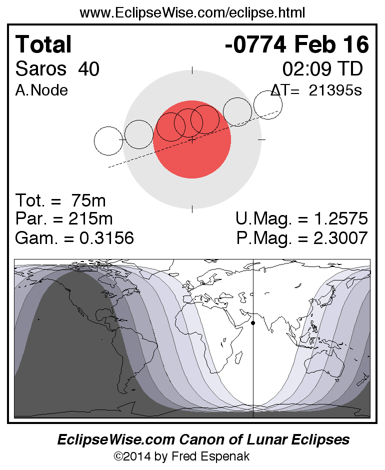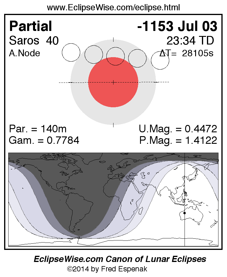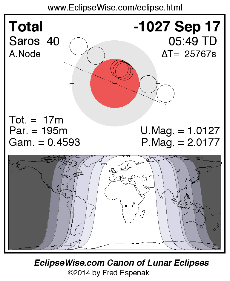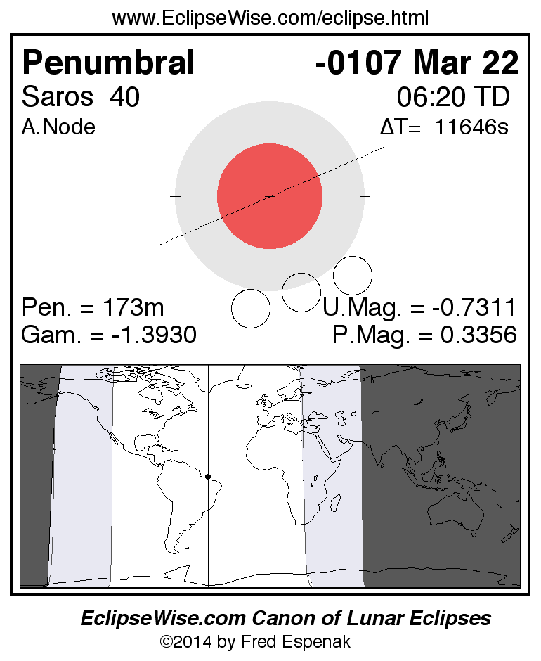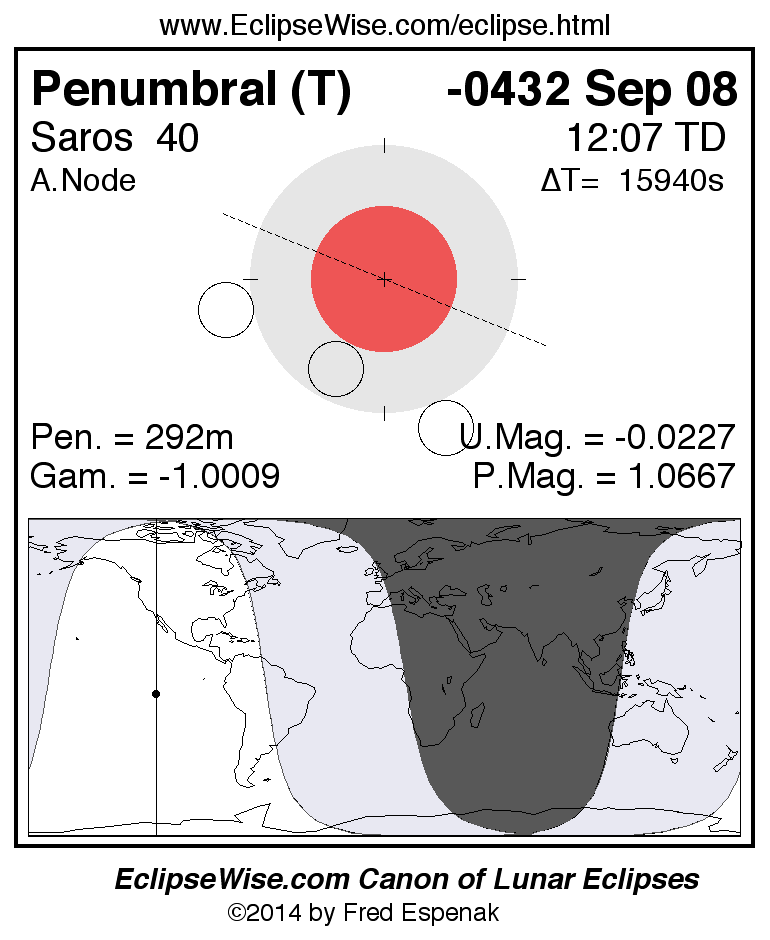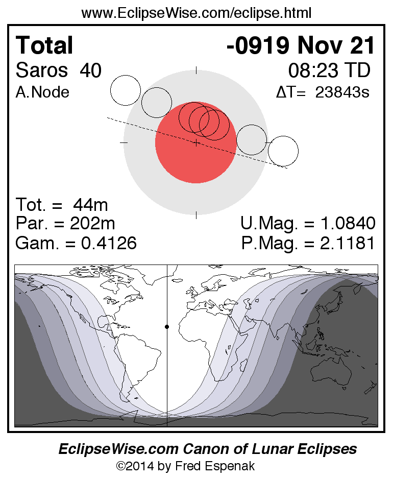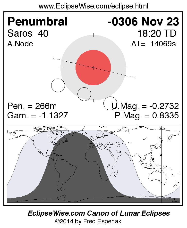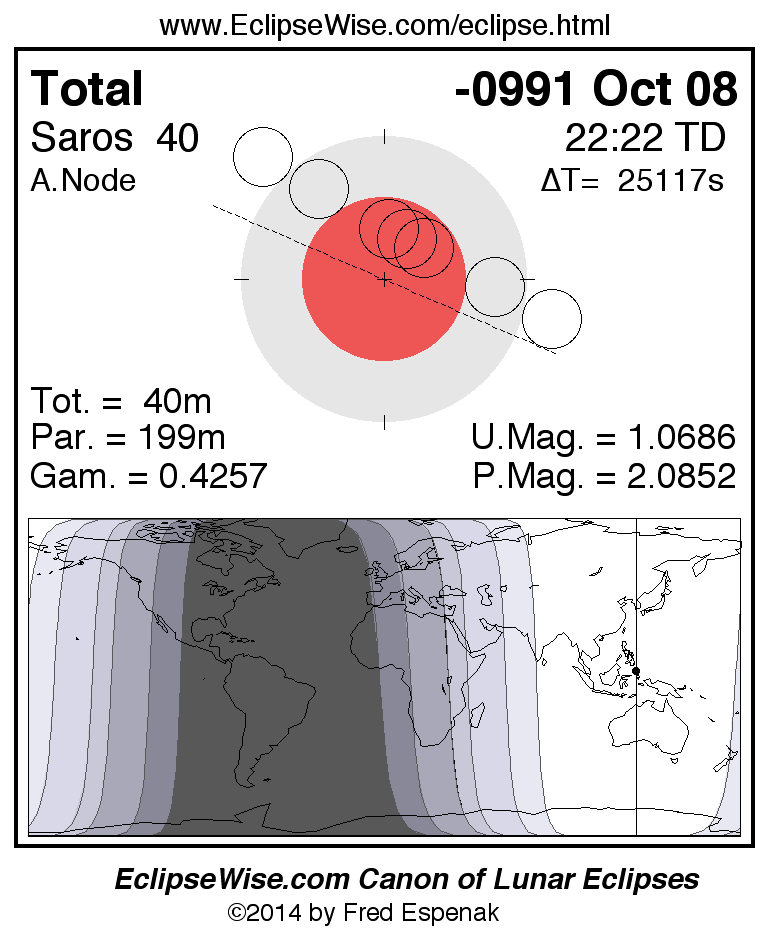A panorama of all lunar eclipses belonging to Saros 40 is presented here. Each figure shows the Moon's path with respect to Earth's penumbral and umbral shadows. Below the path is a map depicting the geographic region of visibility for the eclipse. The date and time are given for the instant of Greatest Eclipse. Every figure serves as a hyperlink to the EclipseWise Prime page for that eclipse with a larger figure and complete details for the eclipse. Visit the Key to Lunar Eclipse Figures for a detailed explanation of these diagrams. Near the bottom of this page are a series of hyperlinks for more on lunar eclipses.