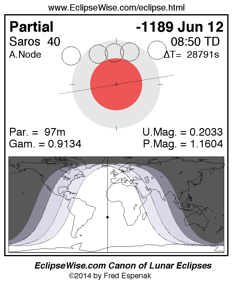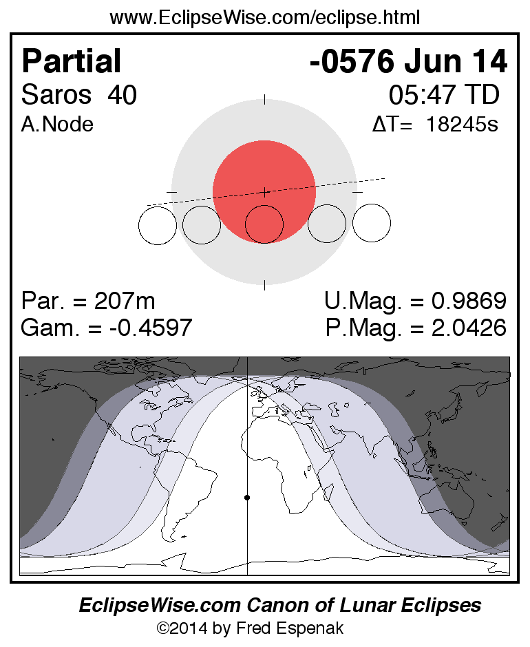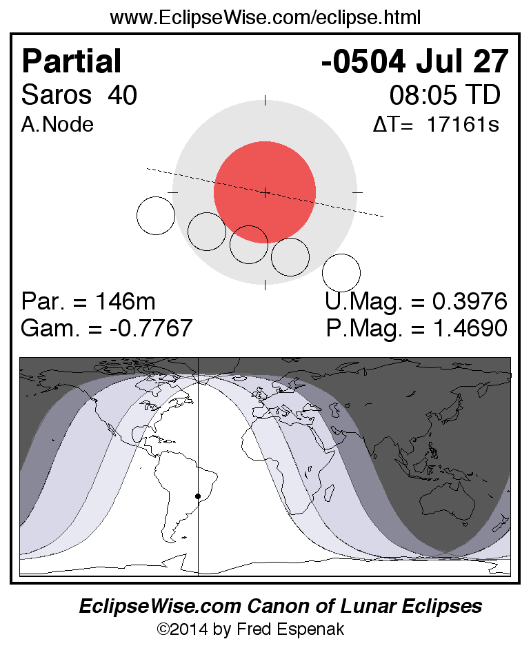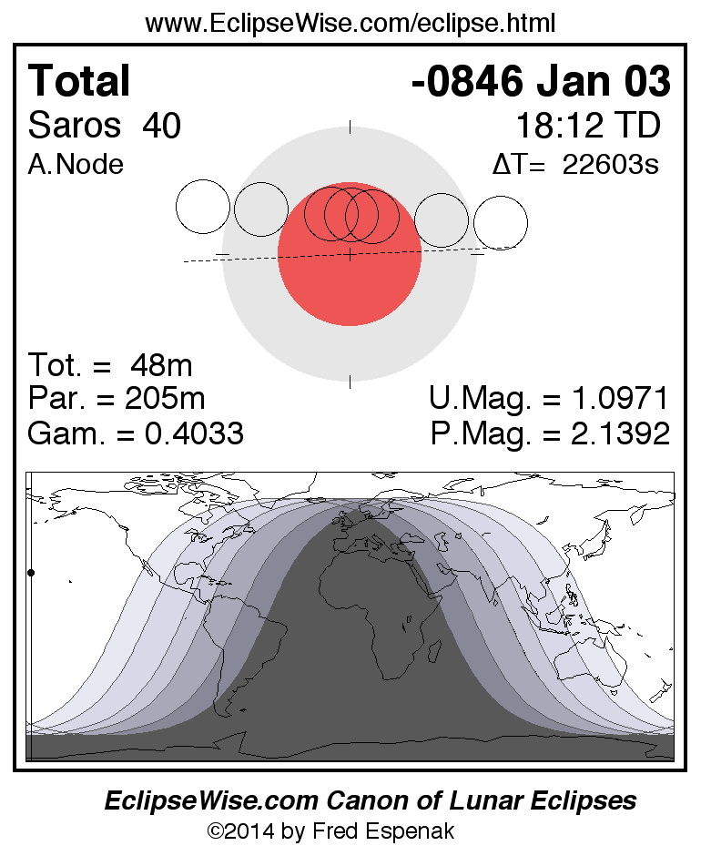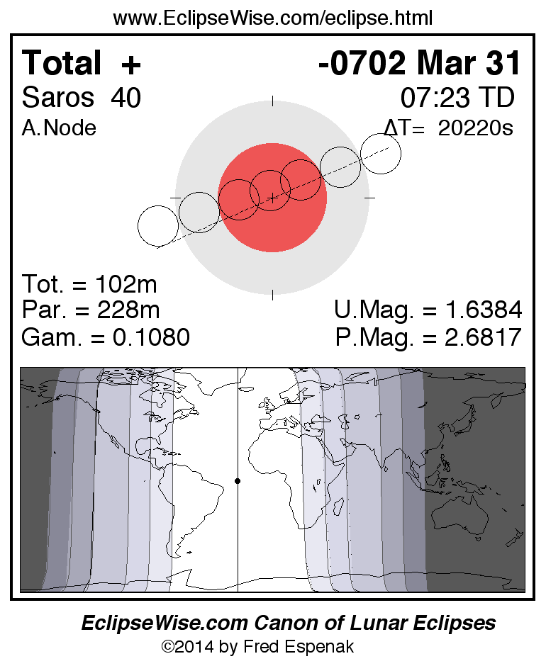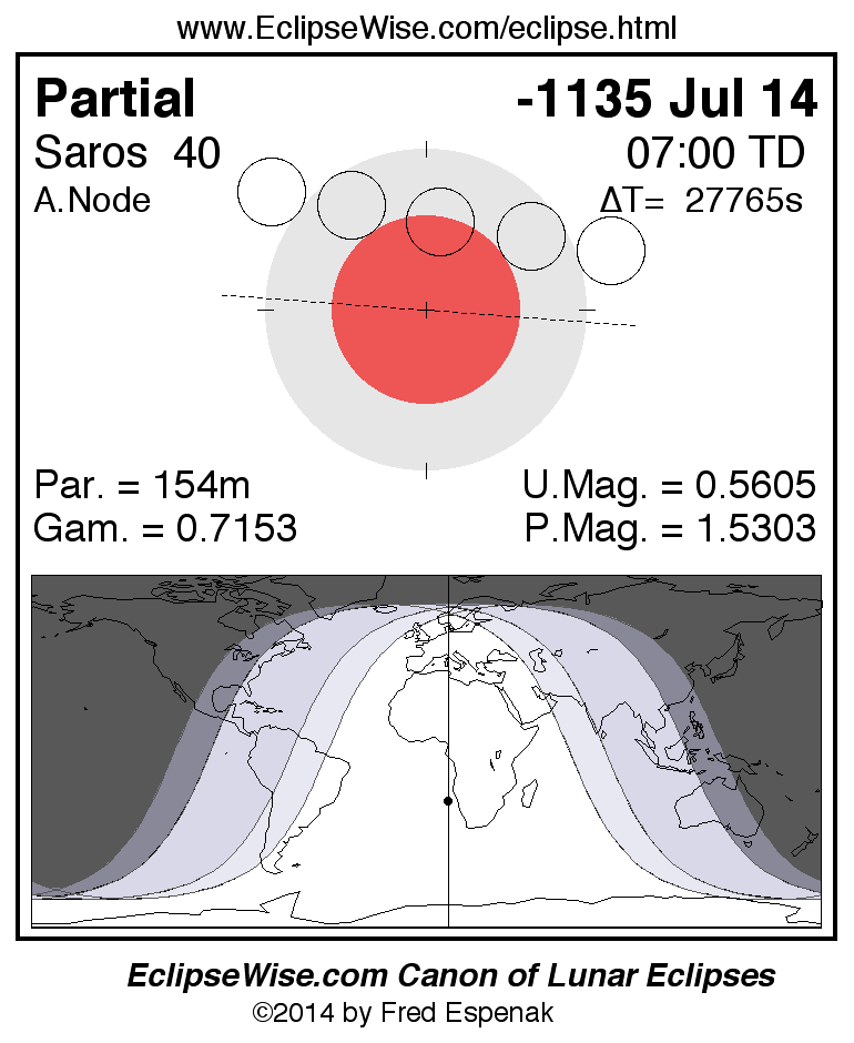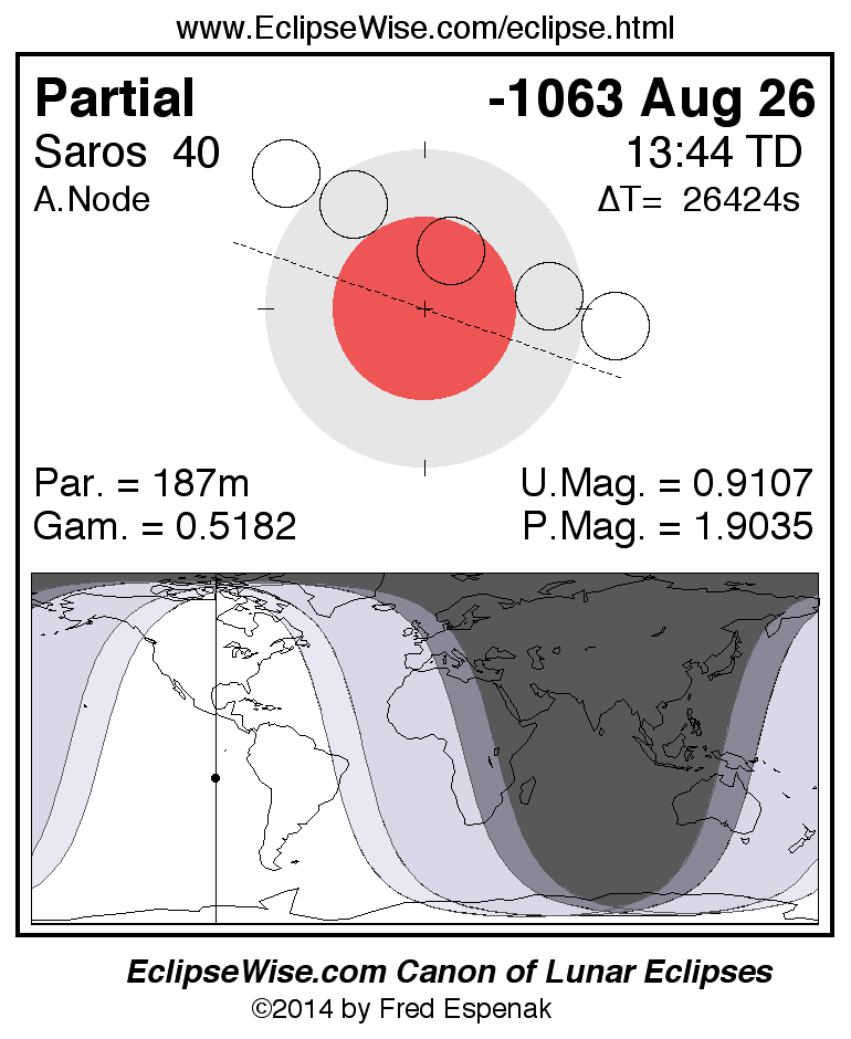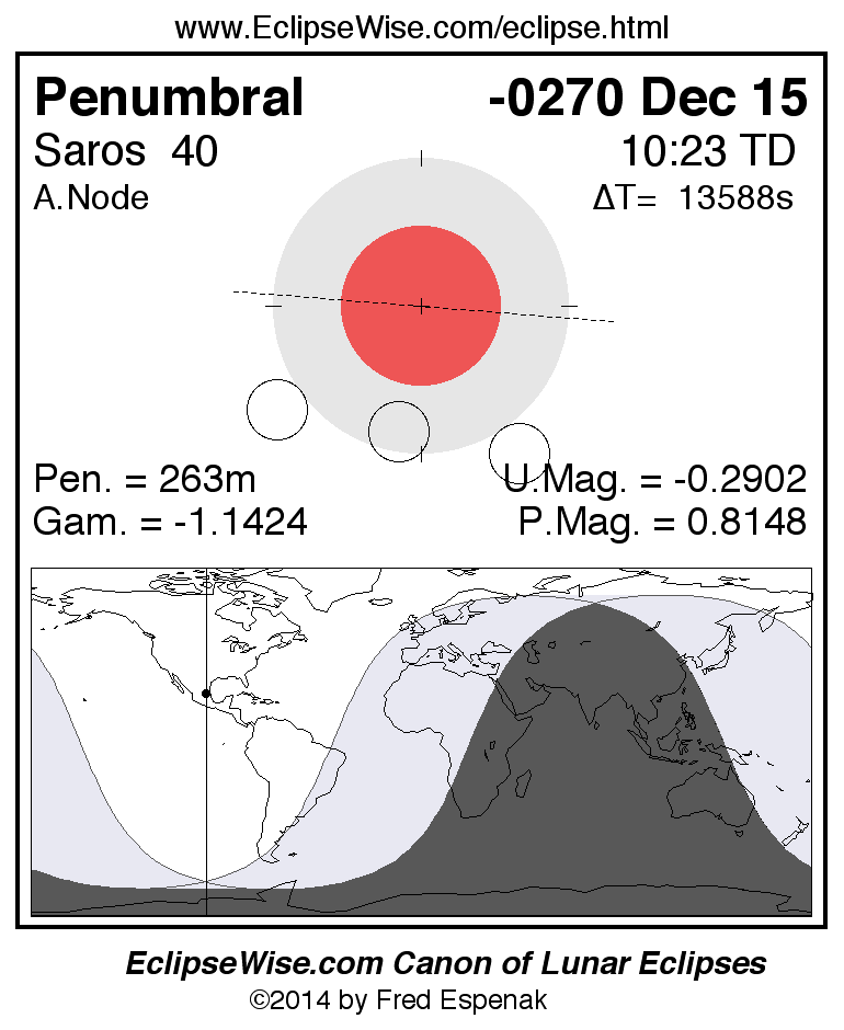 A panorama of all lunar eclipses belonging to Saros 40 is presented here. Each figure shows the Moon's path with respect to Earth's penumbral and umbral shadows. Below the path is a map depicting the geographic region of visibility for the eclipse. The date and time are given for the instant of Greatest Eclipse. Every figure serves as a hyperlink to the EclipseWise Prime page for that eclipse with a larger figure and complete details for the eclipse. Visit the Key to Lunar Eclipse Figures for a detailed explanation of these diagrams. Near the bottom of this page are a series of hyperlinks for more on lunar eclipses.