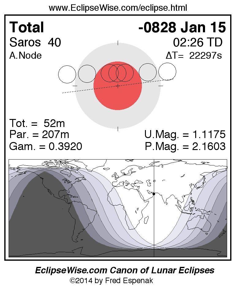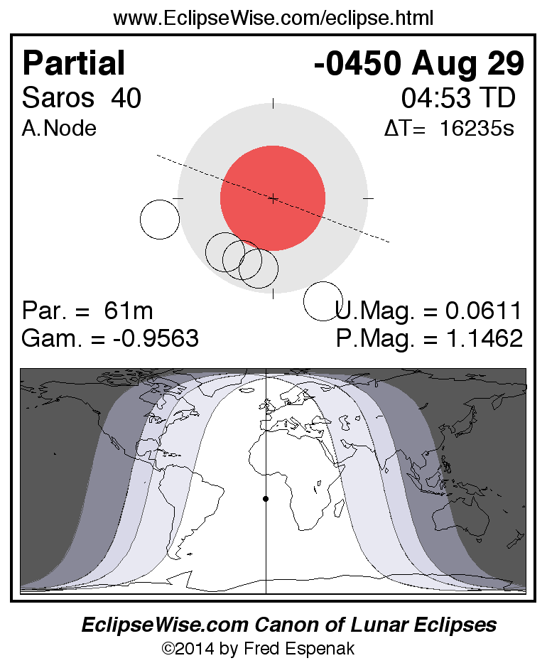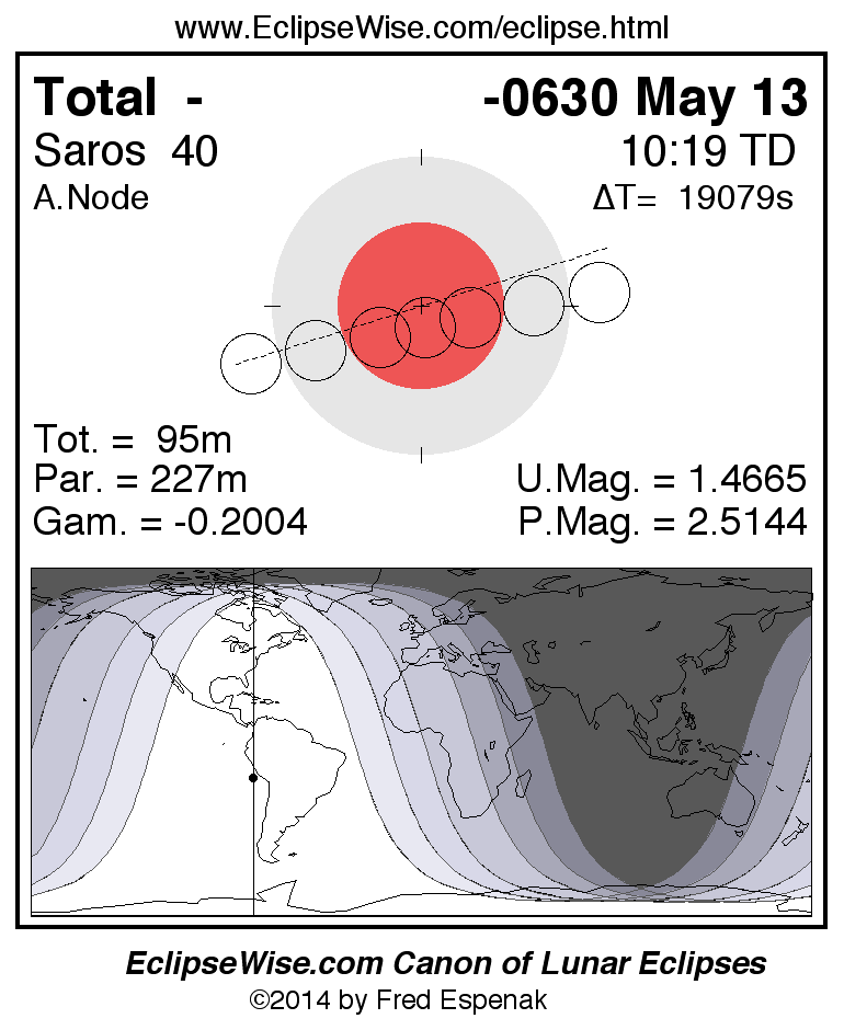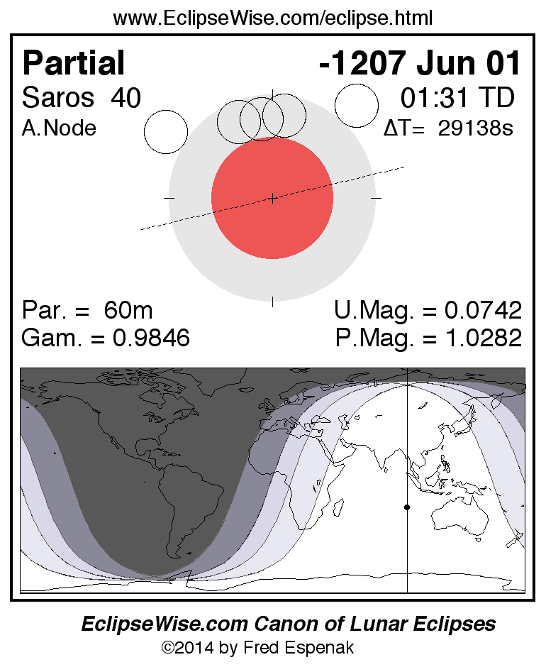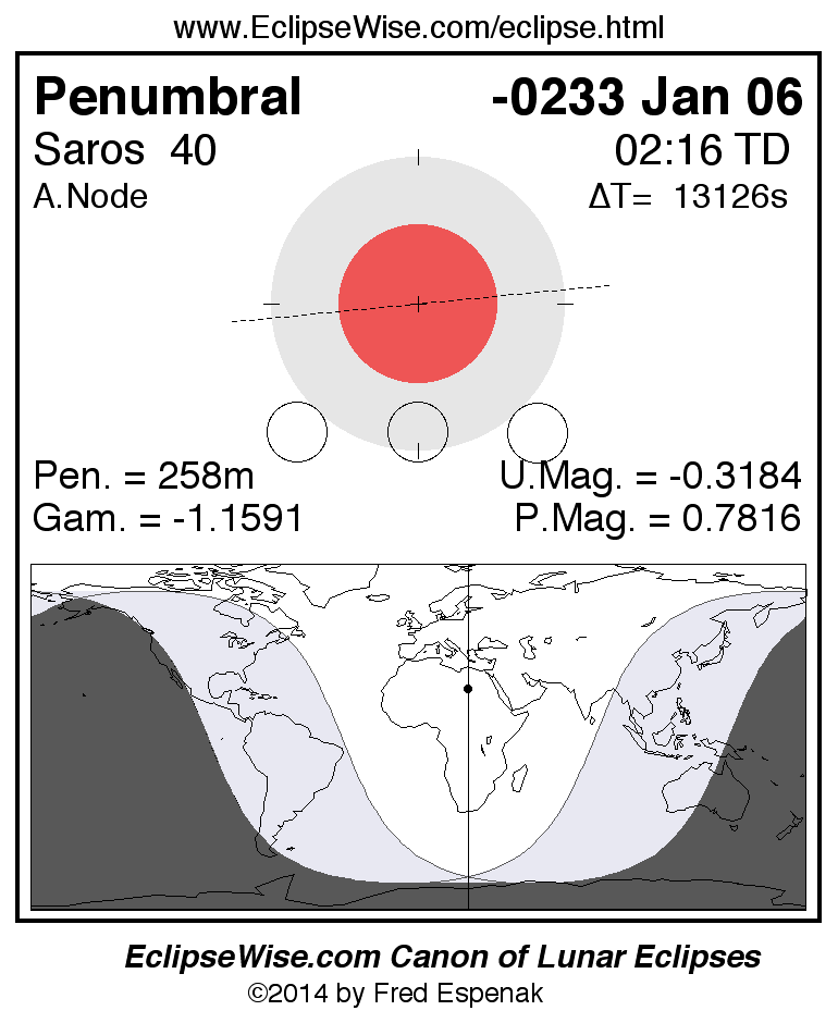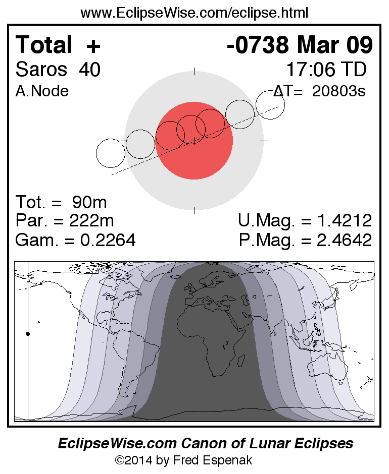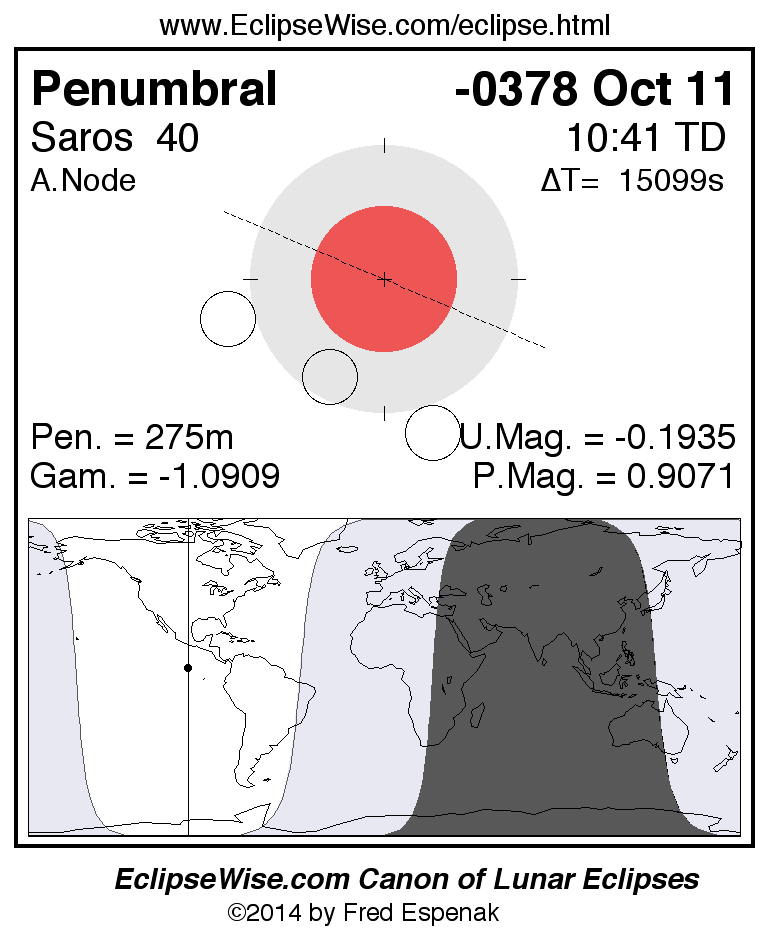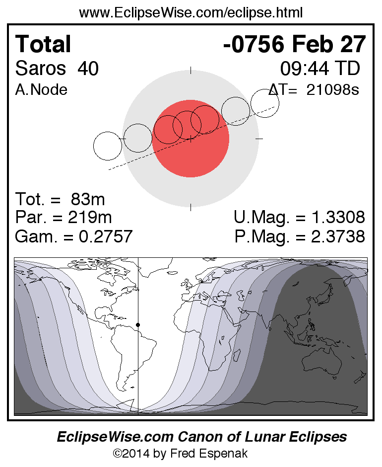 A panorama of all lunar eclipses belonging to Saros 40 is presented here. Each figure shows the Moon's path with respect to Earth's penumbral and umbral shadows. Below the path is a map depicting the geographic region of visibility for the eclipse. The date and time are given for the instant of Greatest Eclipse. Every figure serves as a hyperlink to the EclipseWise Prime page for that eclipse with a larger figure and complete details for the eclipse. Visit the Key to Lunar Eclipse Figures for a detailed explanation of these diagrams. Near the bottom of this page are a series of hyperlinks for more on lunar eclipses.