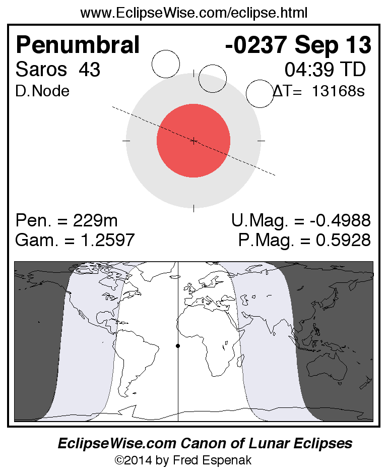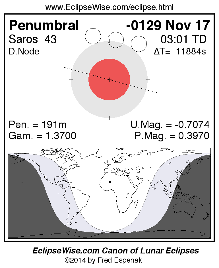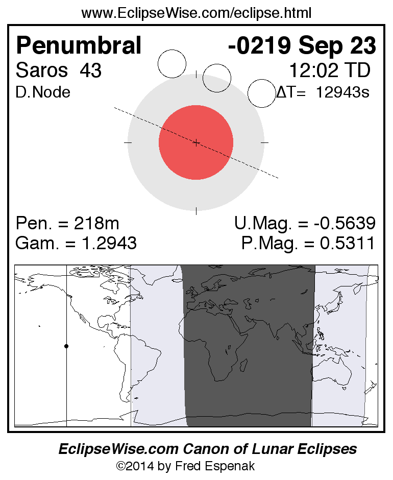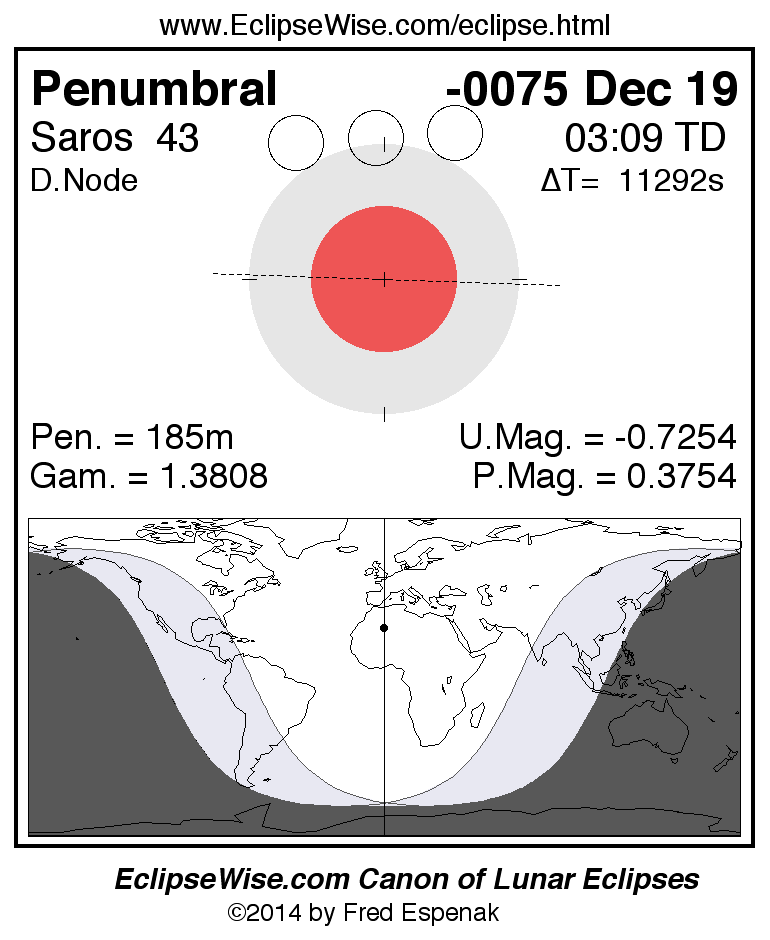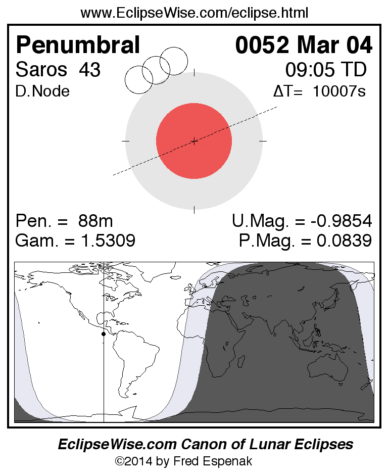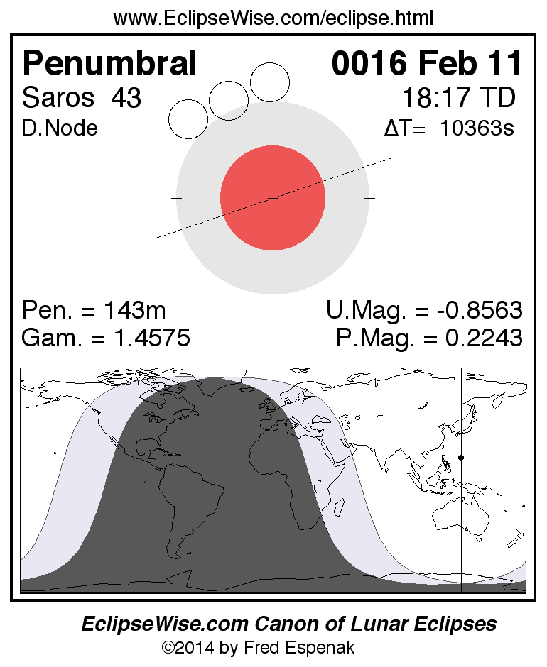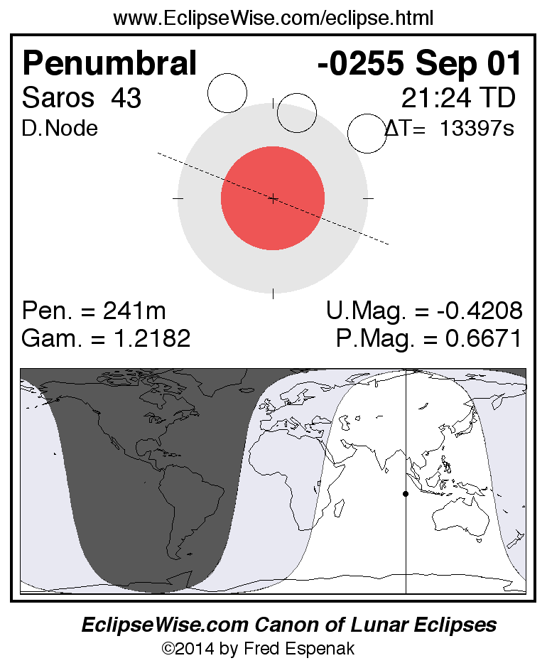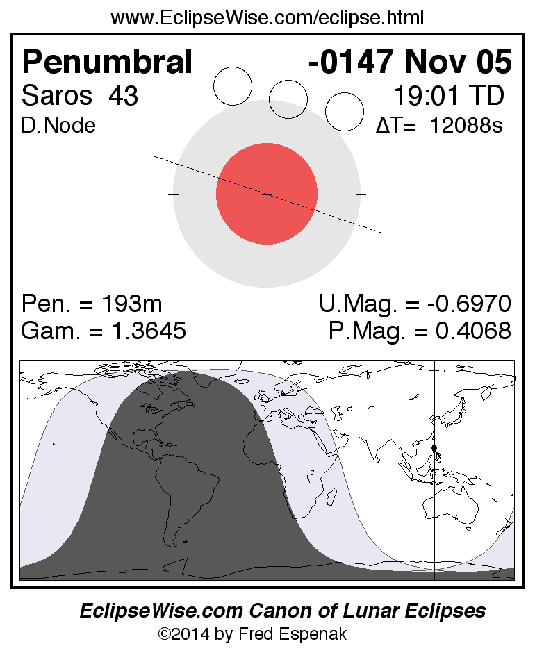 A panorama of all lunar eclipses belonging to Saros 43 is presented here. Each figure shows the Moon's path with respect to Earth's penumbral and umbral shadows. Below the path is a map depicting the geographic region of visibility for the eclipse. The date and time are given for the instant of Greatest Eclipse. Every figure serves as a hyperlink to the EclipseWise Prime page for that eclipse with a larger figure and complete details for the eclipse. Visit the Key to Lunar Eclipse Figures for a detailed explanation of these diagrams. Near the bottom of this page are a series of hyperlinks for more on lunar eclipses.