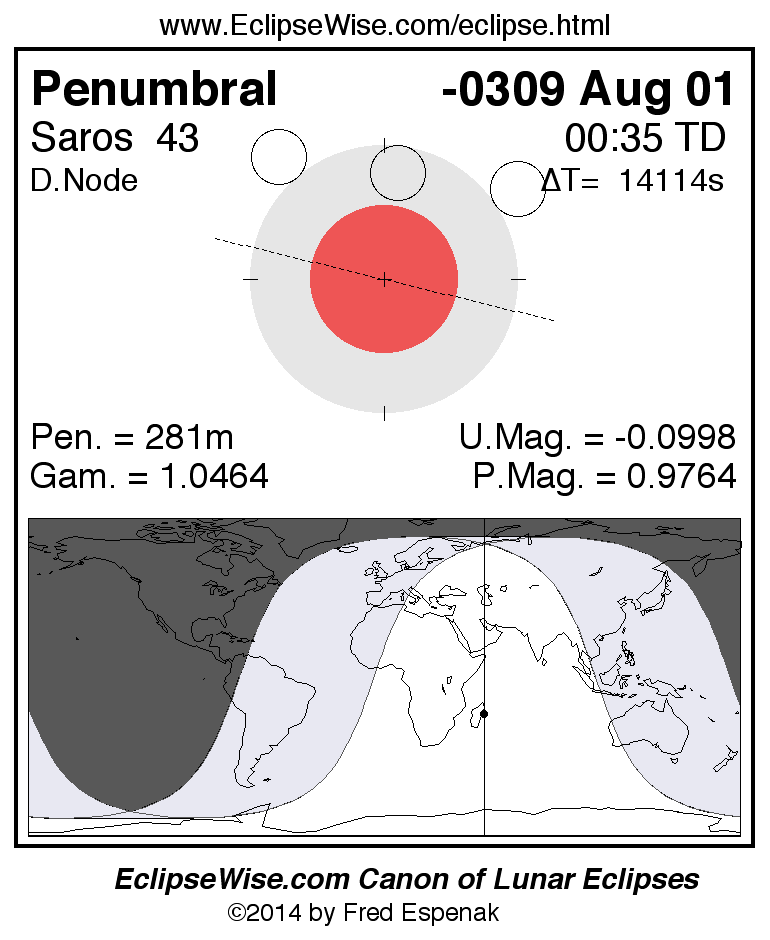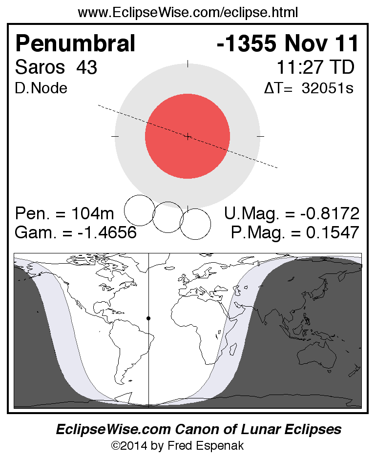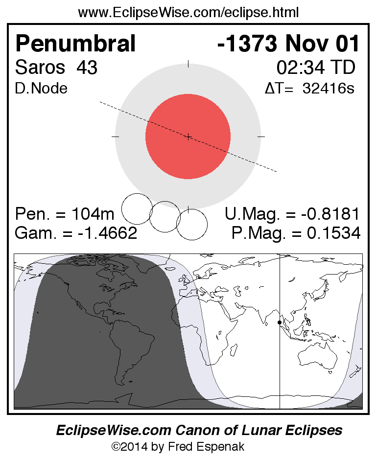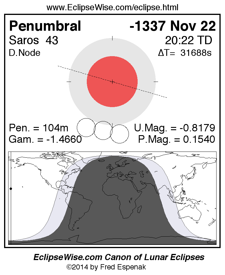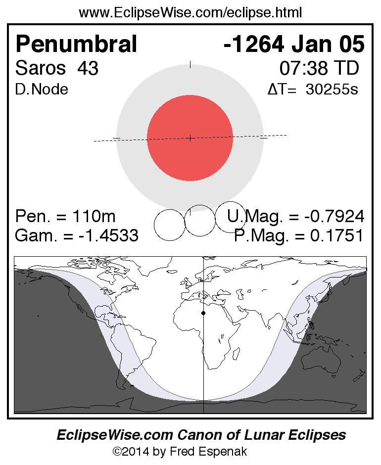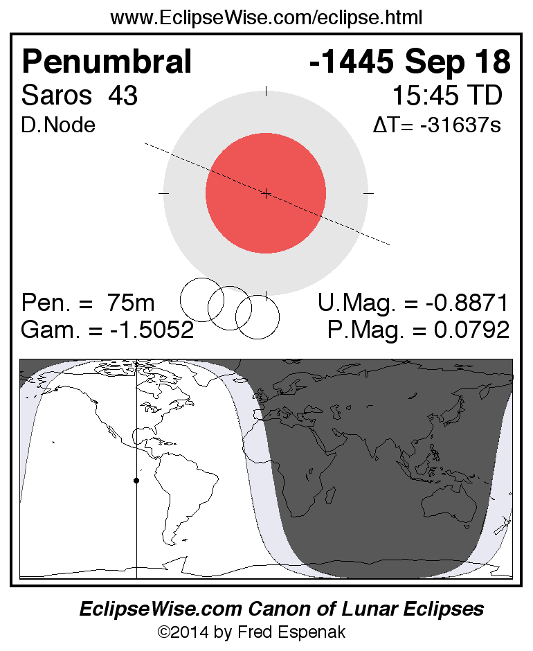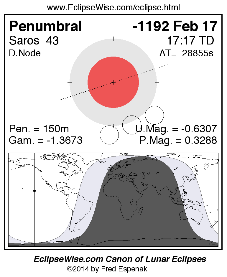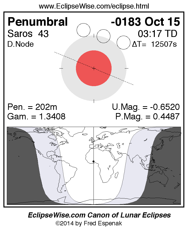 A panorama of all lunar eclipses belonging to Saros 43 is presented here. Each figure shows the Moon's path with respect to Earth's penumbral and umbral shadows. Below the path is a map depicting the geographic region of visibility for the eclipse. The date and time are given for the instant of Greatest Eclipse. Every figure serves as a hyperlink to the EclipseWise Prime page for that eclipse with a larger figure and complete details for the eclipse. Visit the Key to Lunar Eclipse Figures for a detailed explanation of these diagrams. Near the bottom of this page are a series of hyperlinks for more on lunar eclipses.