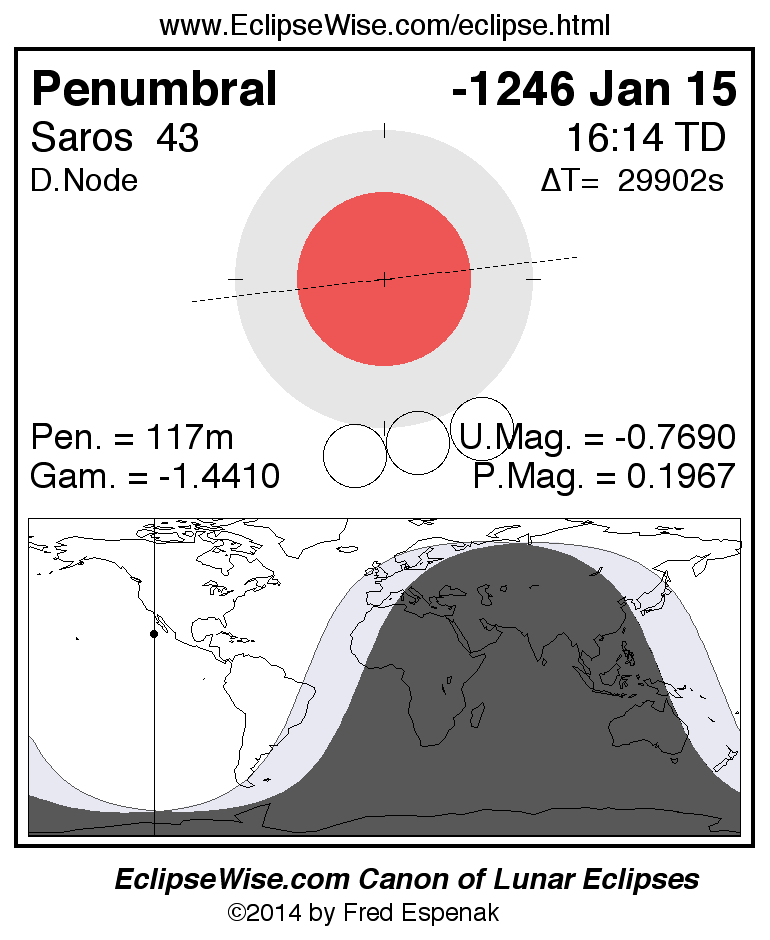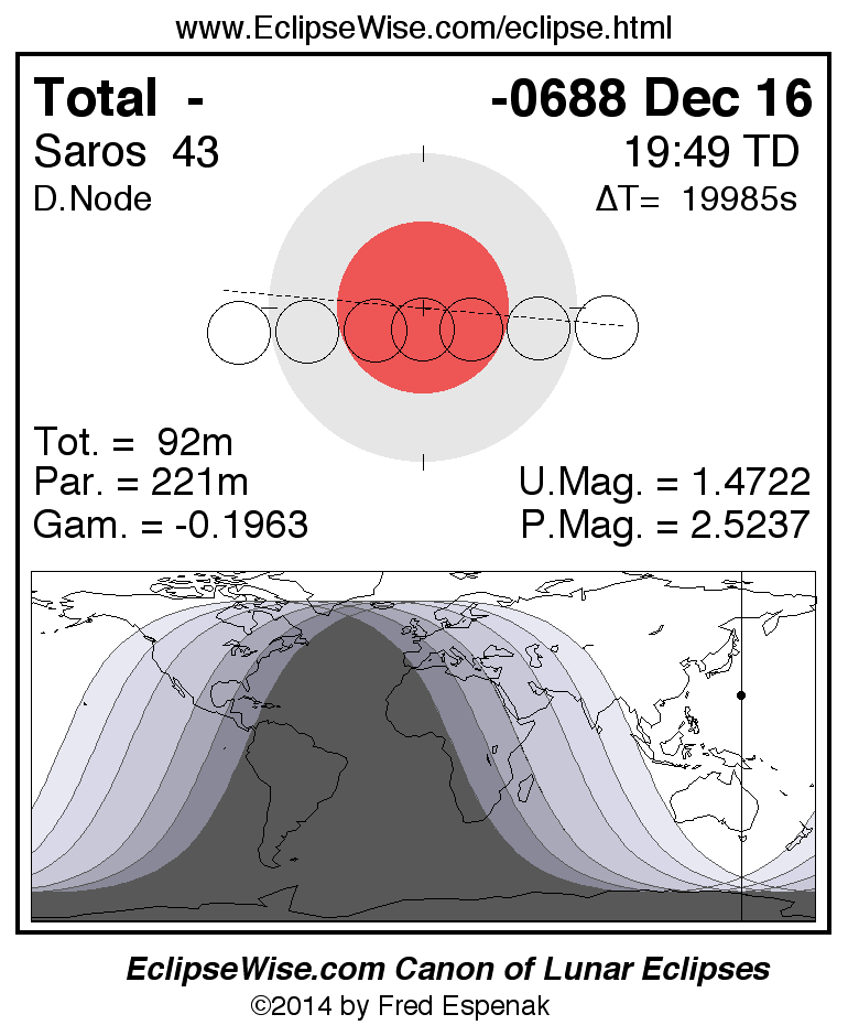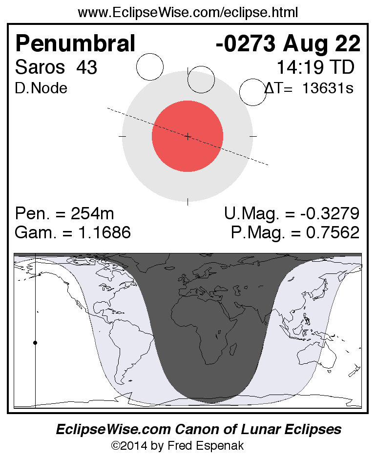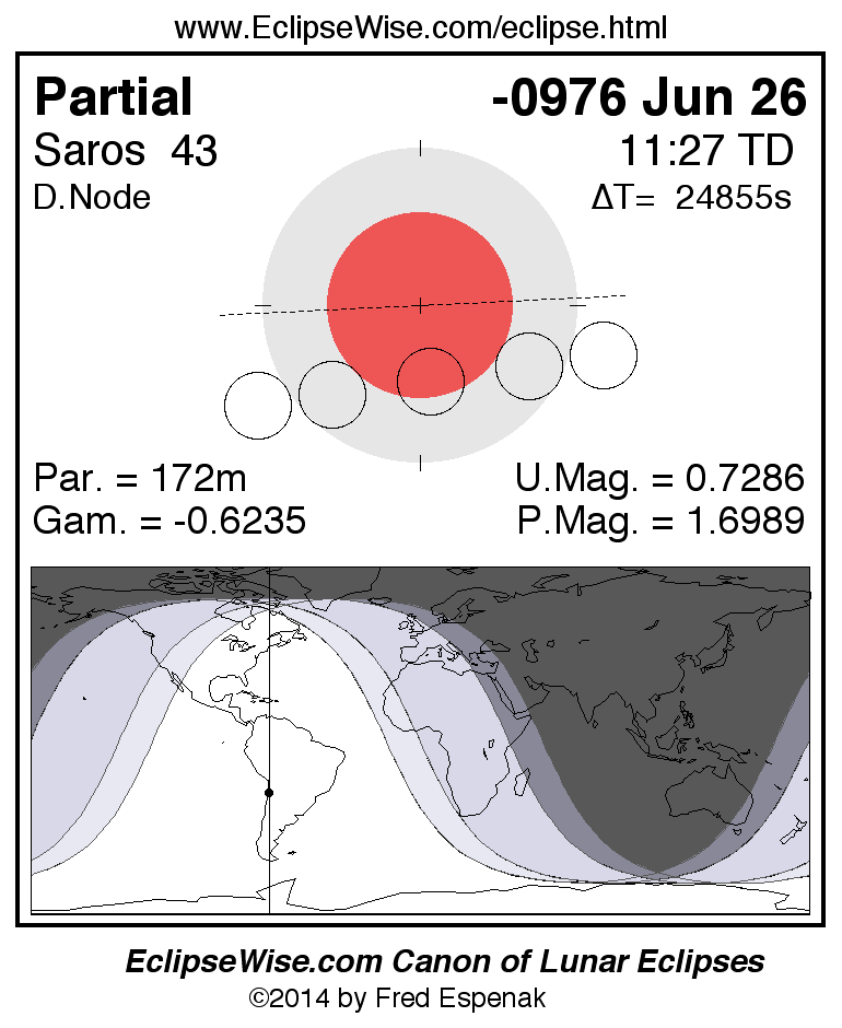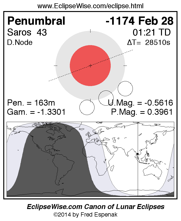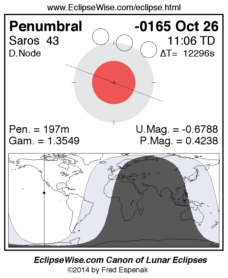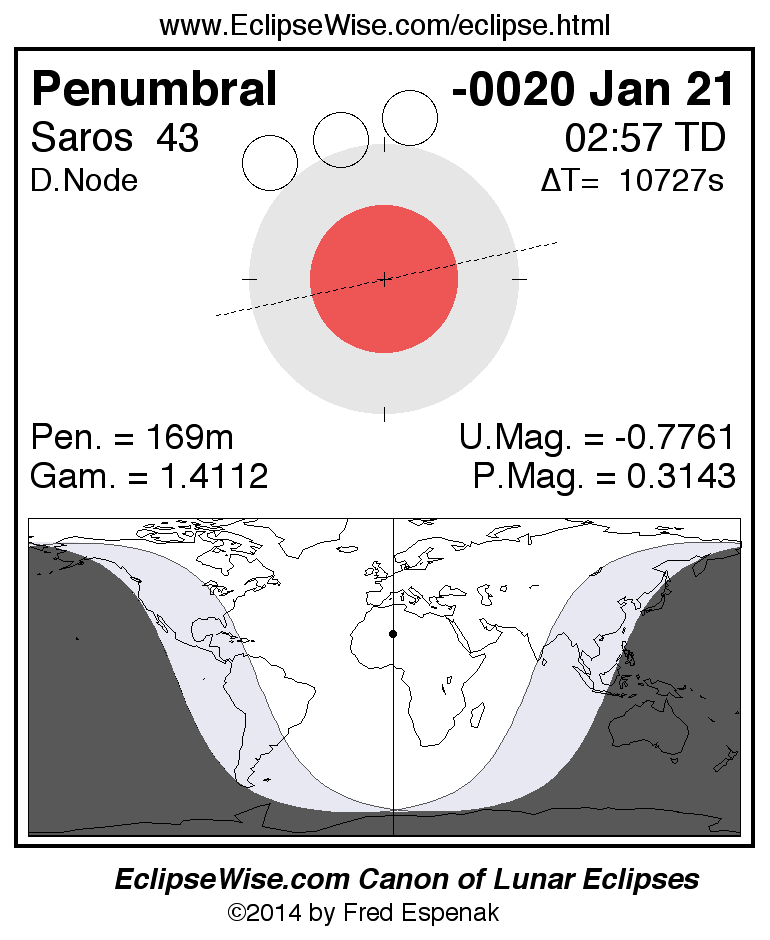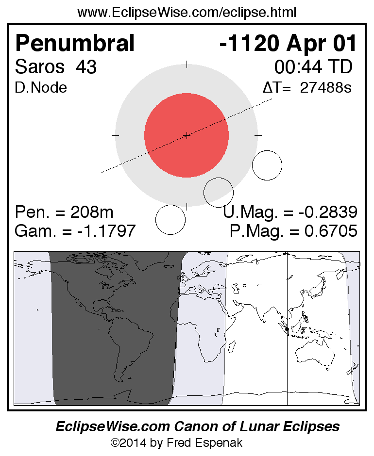 A panorama of all lunar eclipses belonging to Saros 43 is presented here. Each figure shows the Moon's path with respect to Earth's penumbral and umbral shadows. Below the path is a map depicting the geographic region of visibility for the eclipse. The date and time are given for the instant of Greatest Eclipse. Every figure serves as a hyperlink to the EclipseWise Prime page for that eclipse with a larger figure and complete details for the eclipse. Visit the Key to Lunar Eclipse Figures for a detailed explanation of these diagrams. Near the bottom of this page are a series of hyperlinks for more on lunar eclipses.