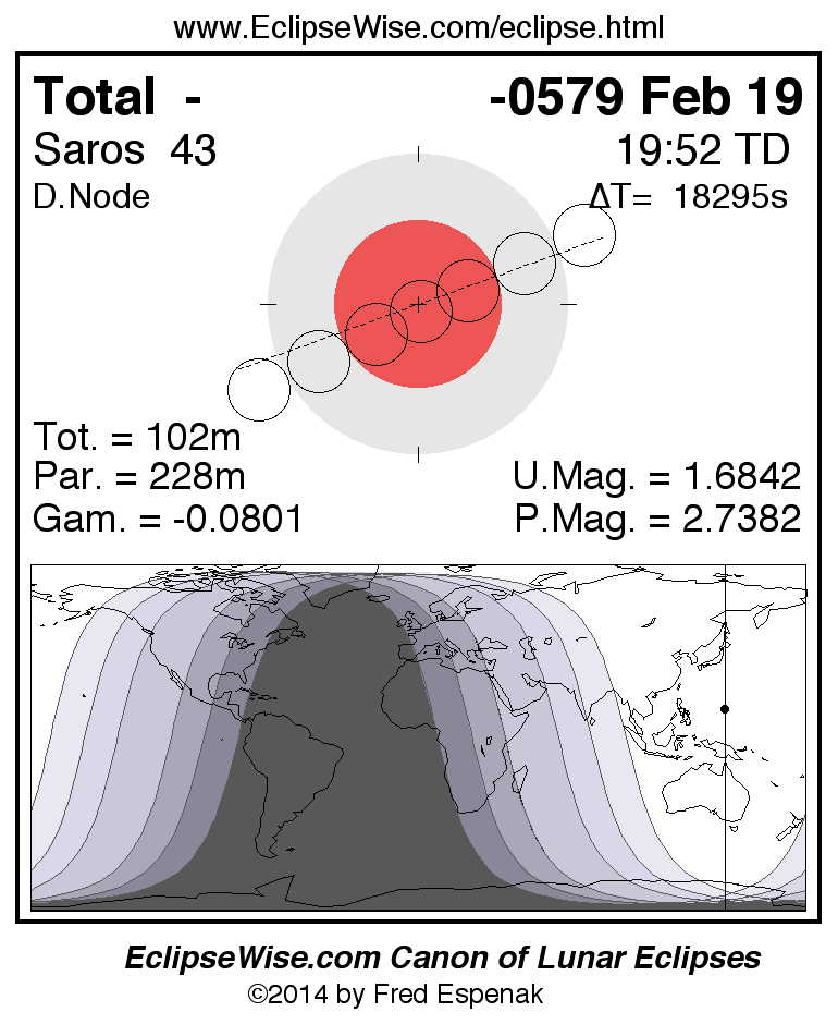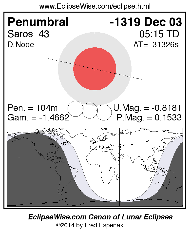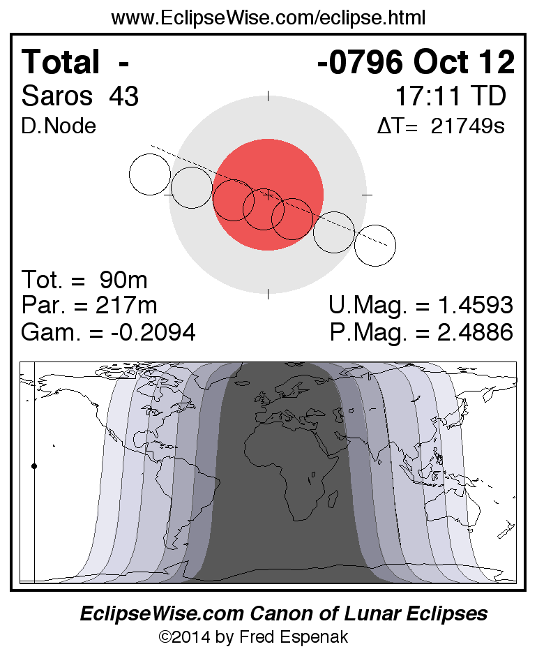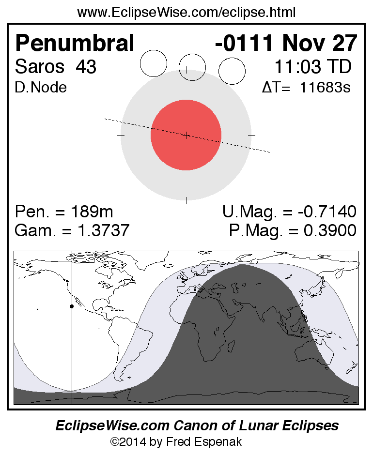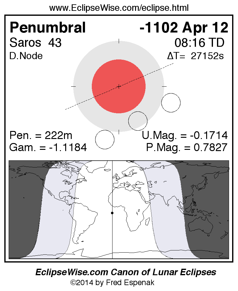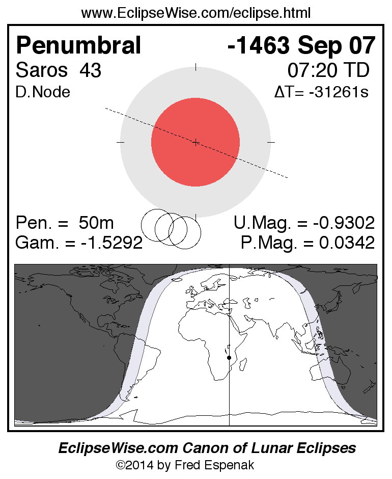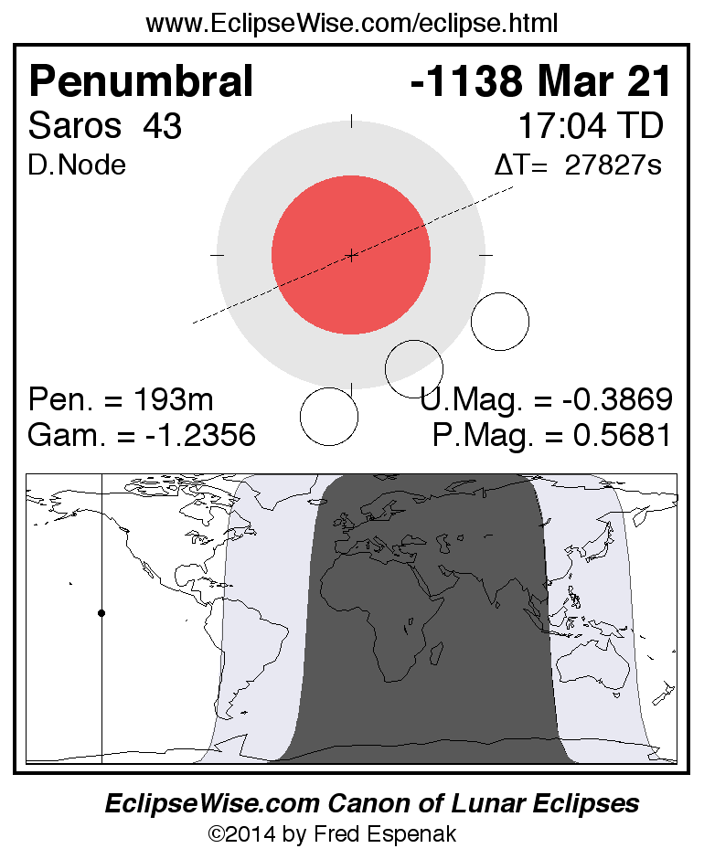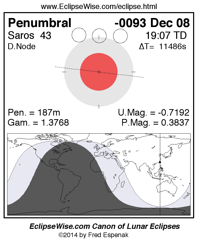 A panorama of all lunar eclipses belonging to Saros 43 is presented here. Each figure shows the Moon's path with respect to Earth's penumbral and umbral shadows. Below the path is a map depicting the geographic region of visibility for the eclipse. The date and time are given for the instant of Greatest Eclipse. Every figure serves as a hyperlink to the EclipseWise Prime page for that eclipse with a larger figure and complete details for the eclipse. Visit the Key to Lunar Eclipse Figures for a detailed explanation of these diagrams. Near the bottom of this page are a series of hyperlinks for more on lunar eclipses.