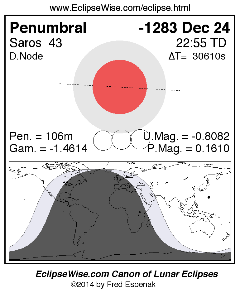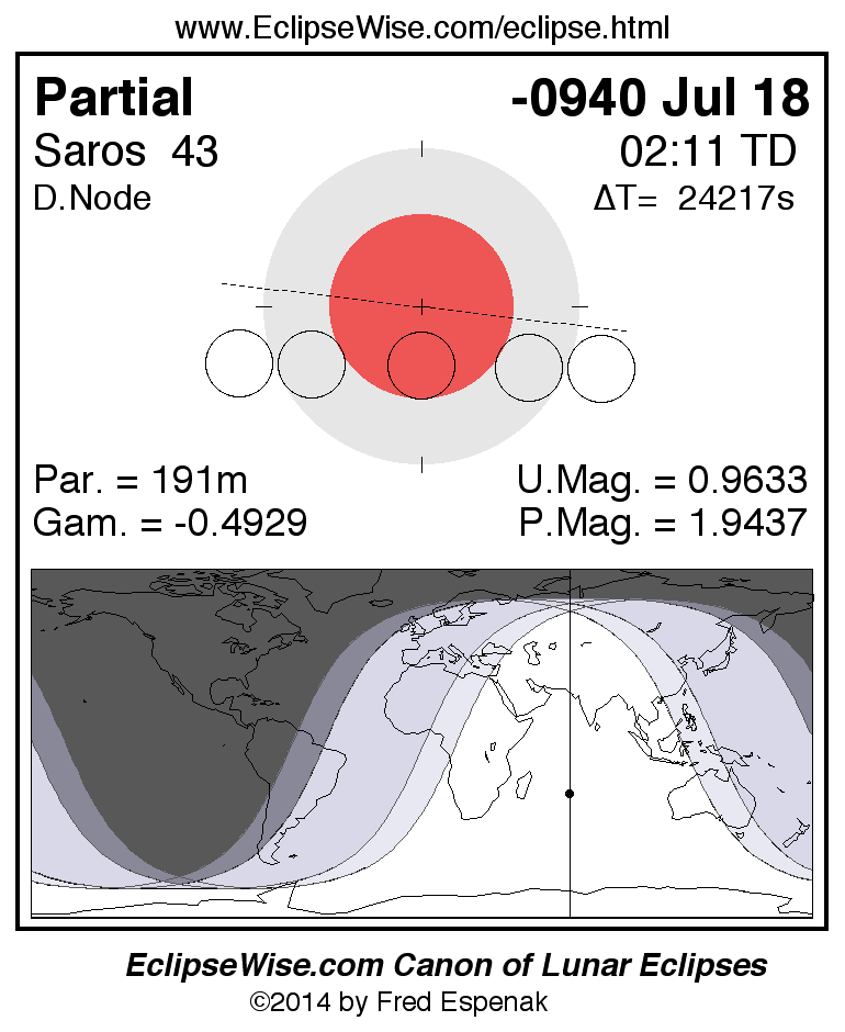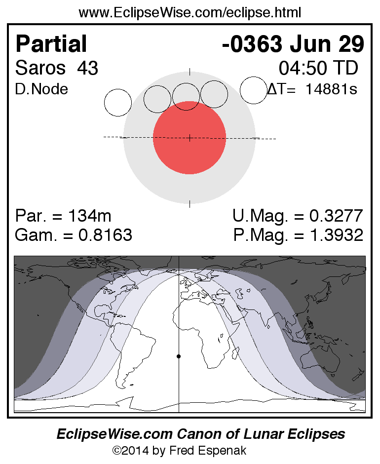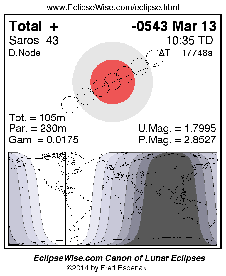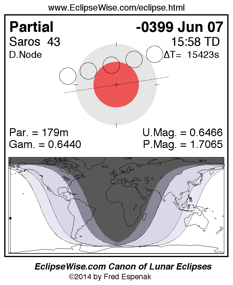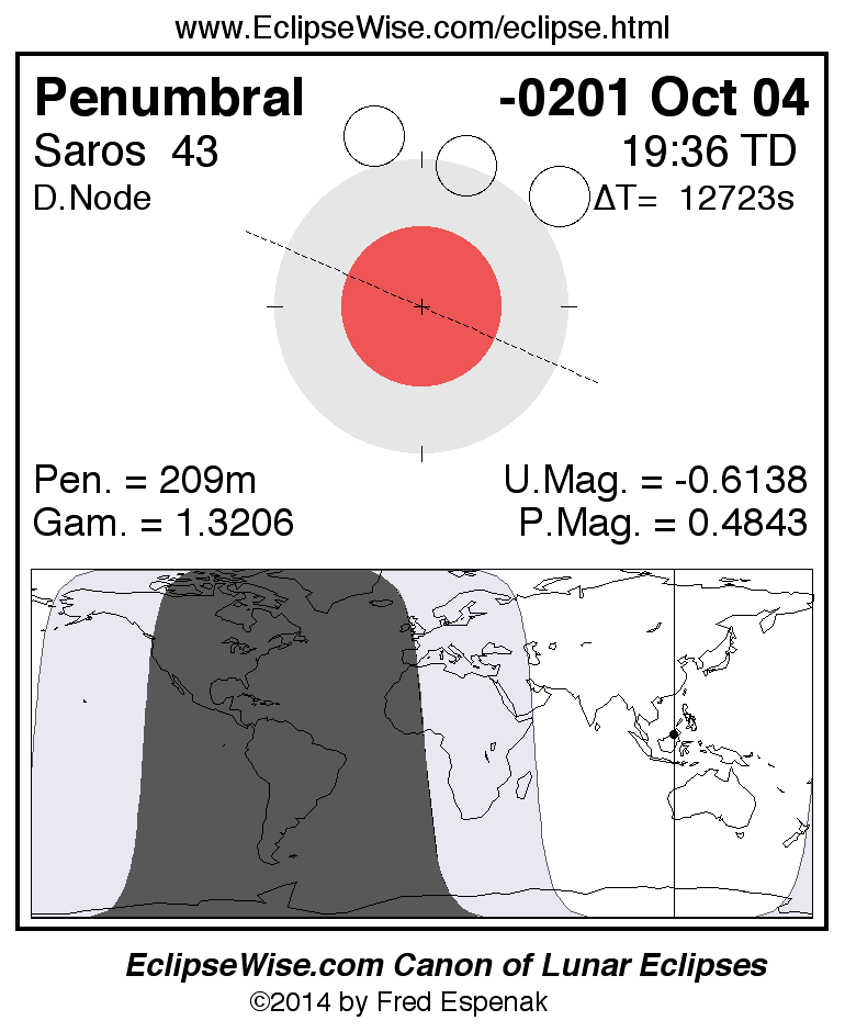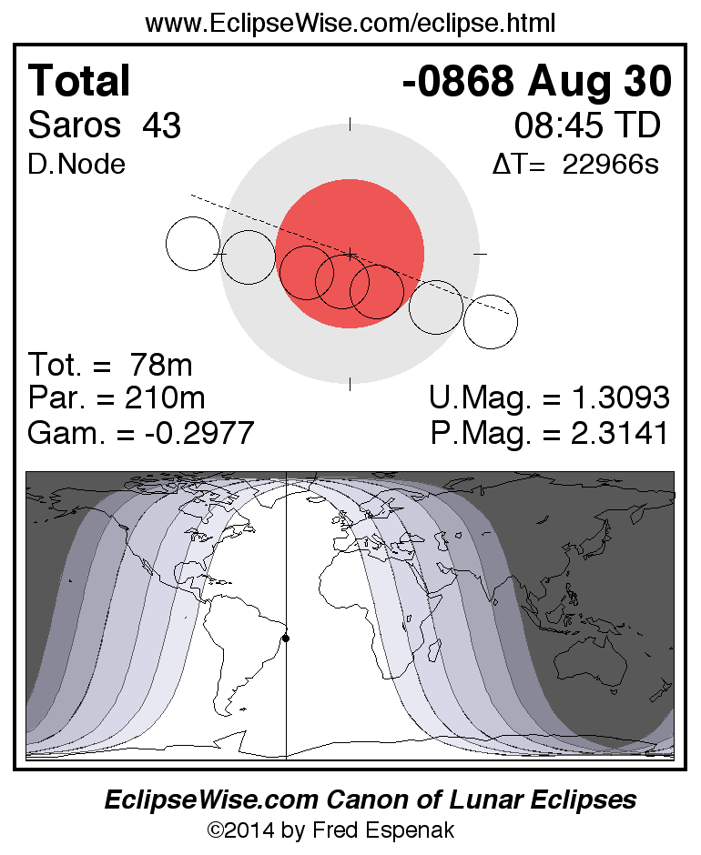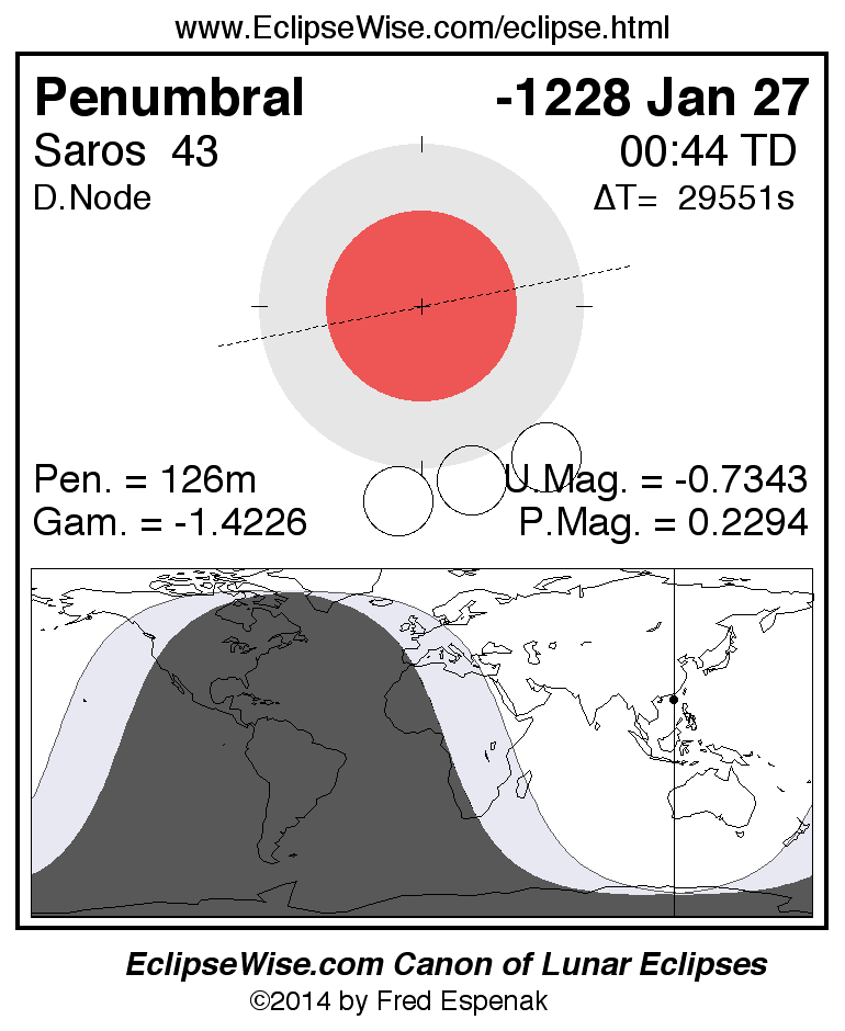 A panorama of all lunar eclipses belonging to Saros 43 is presented here. Each figure shows the Moon's path with respect to Earth's penumbral and umbral shadows. Below the path is a map depicting the geographic region of visibility for the eclipse. The date and time are given for the instant of Greatest Eclipse. Every figure serves as a hyperlink to the EclipseWise Prime page for that eclipse with a larger figure and complete details for the eclipse. Visit the Key to Lunar Eclipse Figures for a detailed explanation of these diagrams. Near the bottom of this page are a series of hyperlinks for more on lunar eclipses.