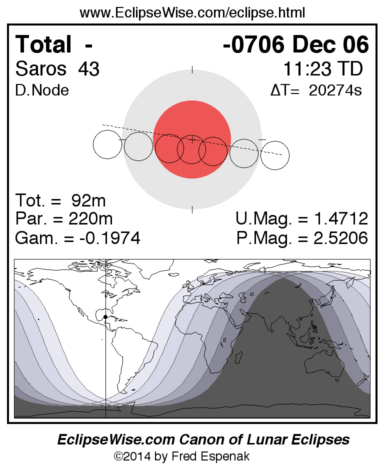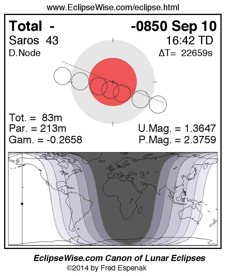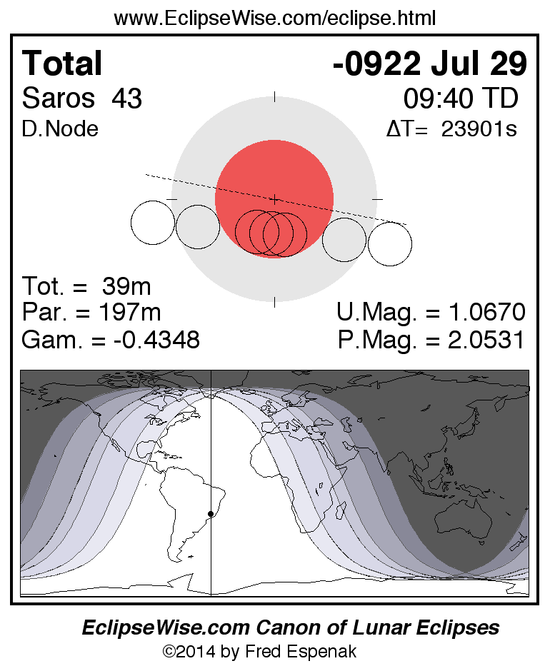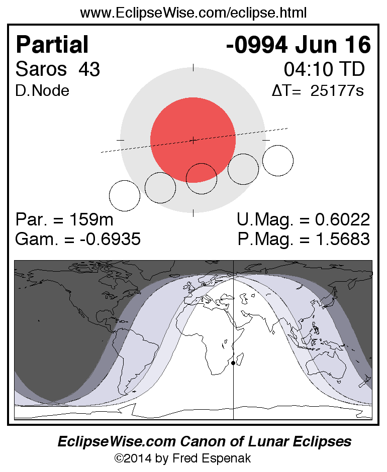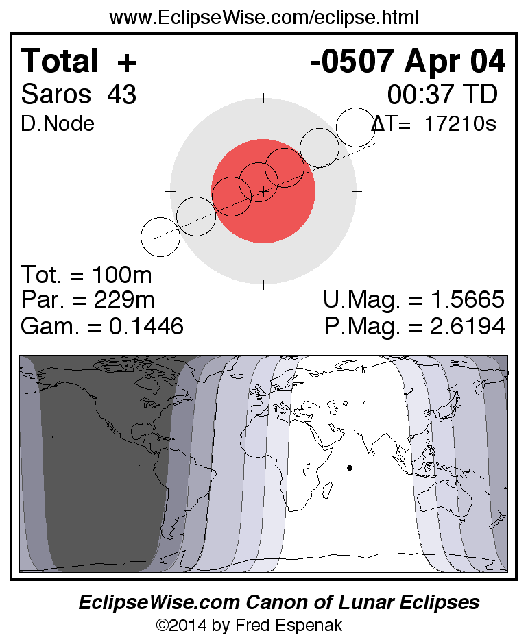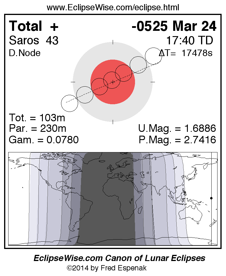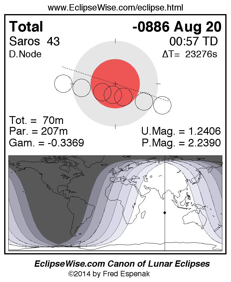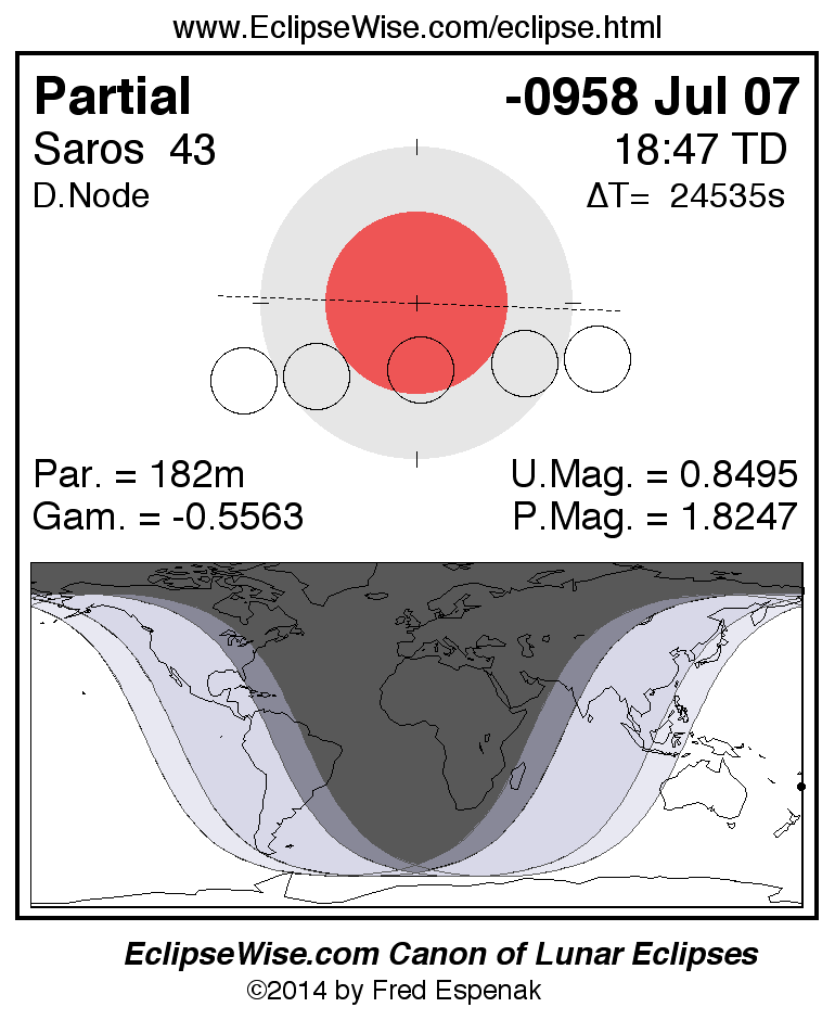 A panorama of all lunar eclipses belonging to Saros 43 is presented here. Each figure shows the Moon's path with respect to Earth's penumbral and umbral shadows. Below the path is a map depicting the geographic region of visibility for the eclipse. The date and time are given for the instant of Greatest Eclipse. Every figure serves as a hyperlink to the EclipseWise Prime page for that eclipse with a larger figure and complete details for the eclipse. Visit the Key to Lunar Eclipse Figures for a detailed explanation of these diagrams. Near the bottom of this page are a series of hyperlinks for more on lunar eclipses.