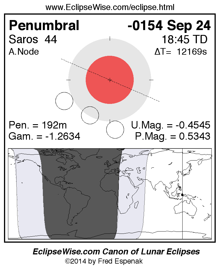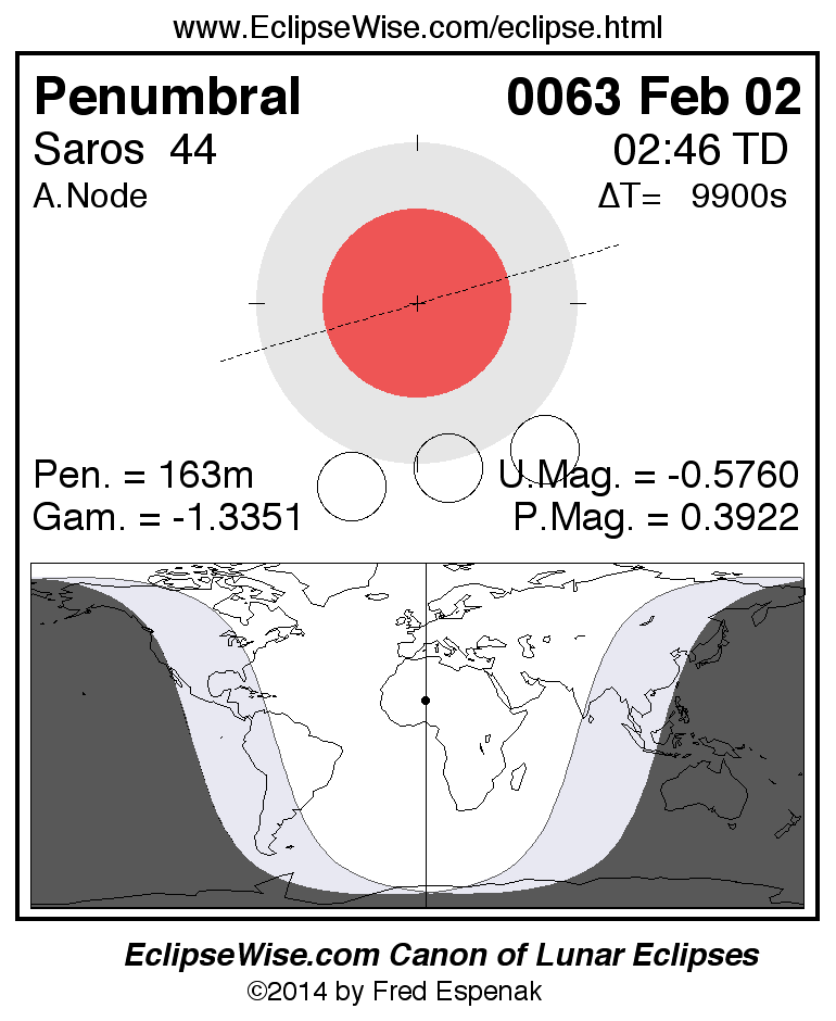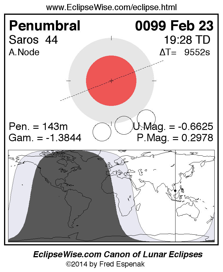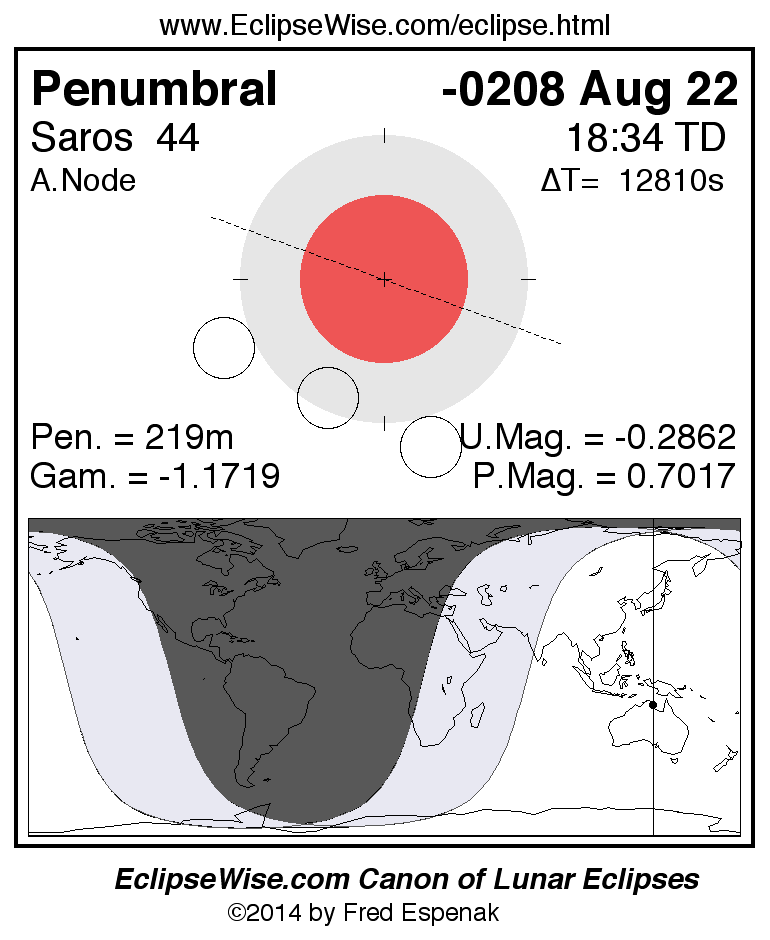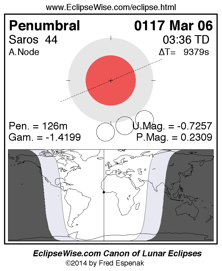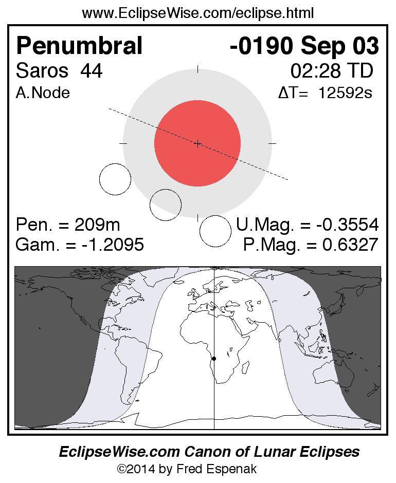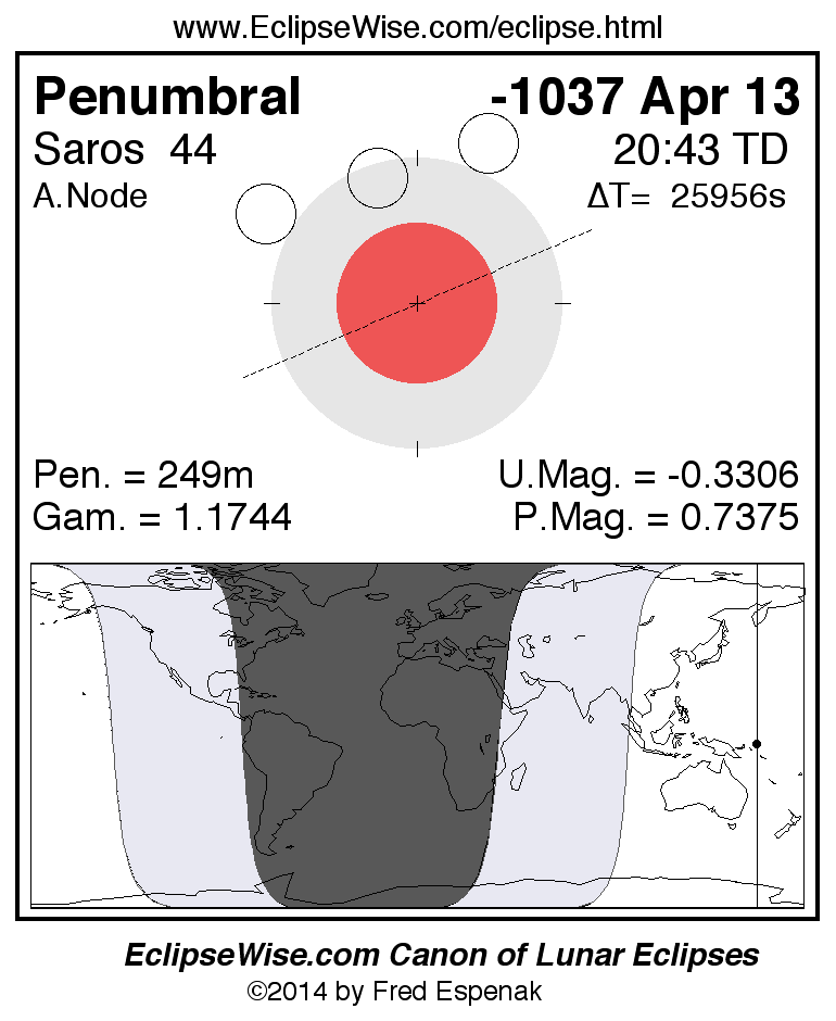 A panorama of all lunar eclipses belonging to Saros 44 is presented here. Each figure shows the Moon's path with respect to Earth's penumbral and umbral shadows. Below the path is a map depicting the geographic region of visibility for the eclipse. The date and time are given for the instant of Greatest Eclipse. Every figure serves as a hyperlink to the EclipseWise Prime page for that eclipse with a larger figure and complete details for the eclipse. Visit the Key to Lunar Eclipse Figures for a detailed explanation of these diagrams. Near the bottom of this page are a series of hyperlinks for more on lunar eclipses.